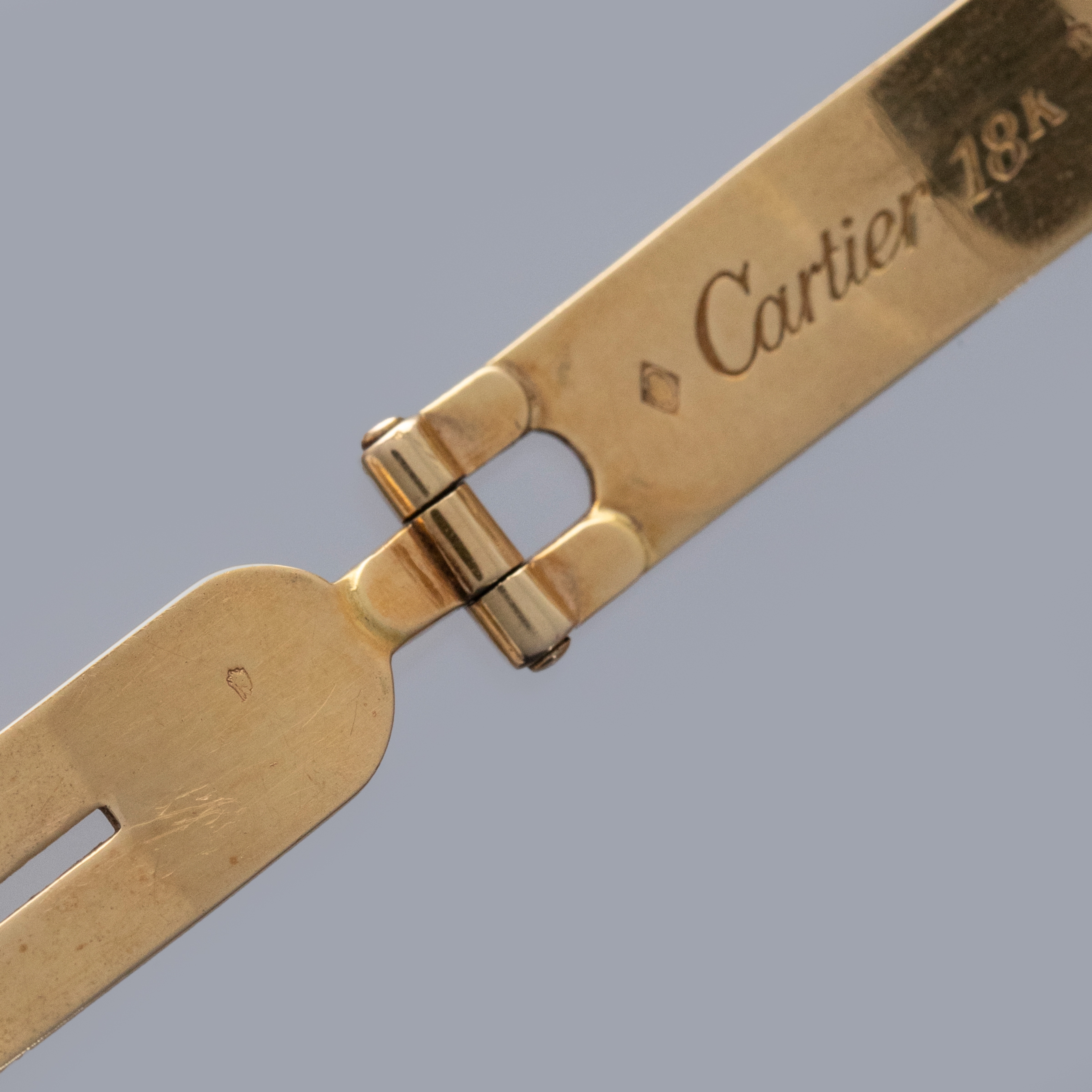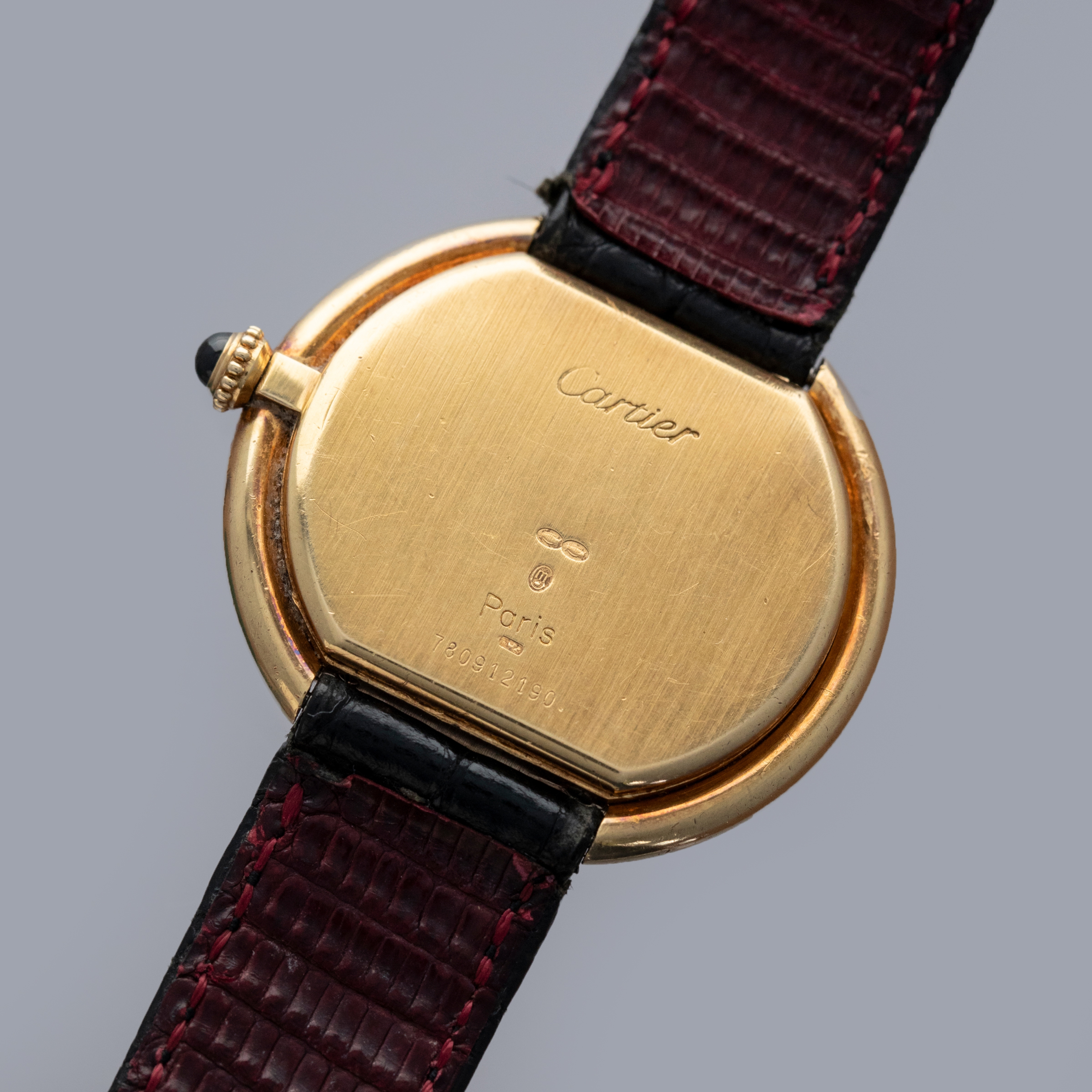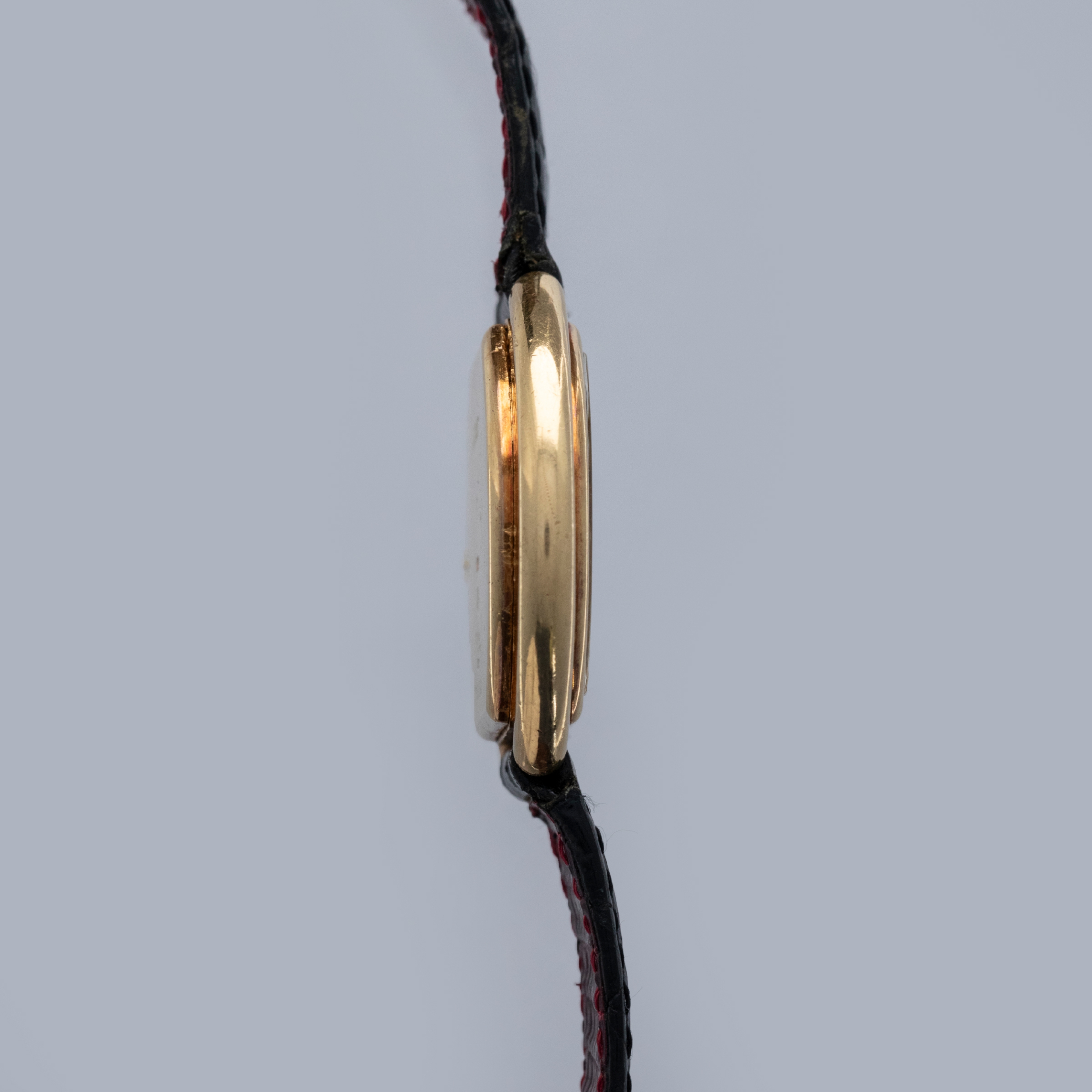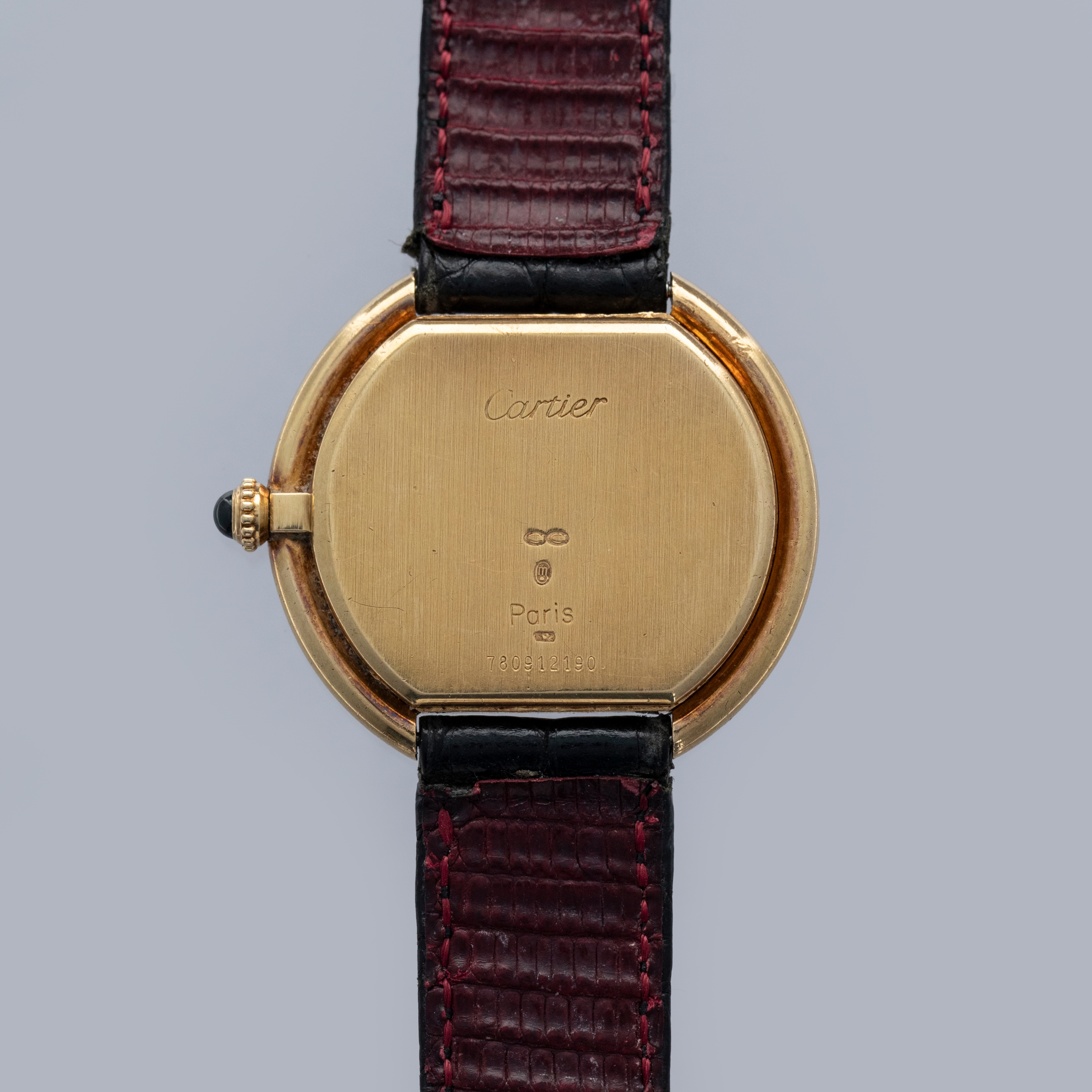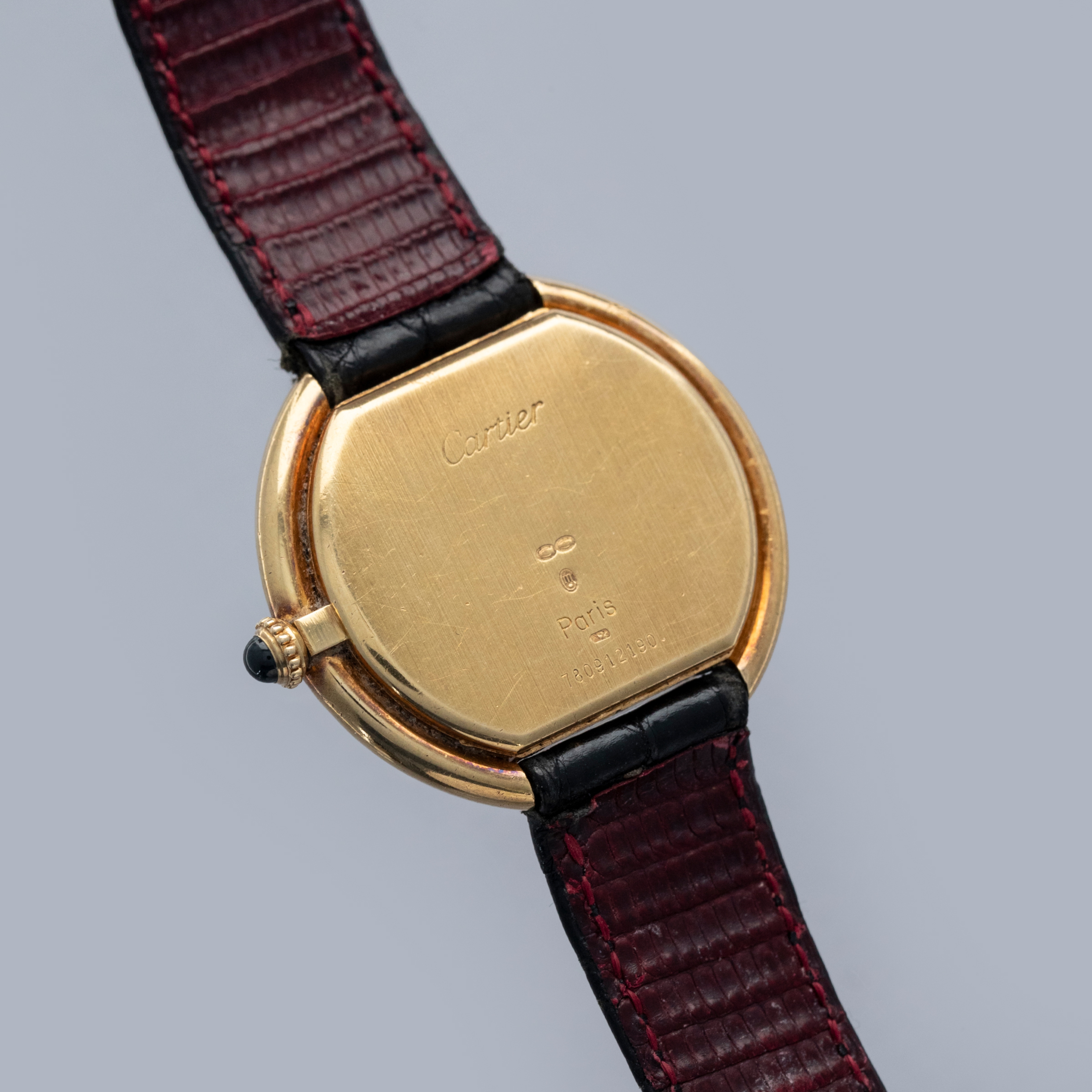 The yellow gold case is in very good condition, with some surface scratches. The case back features well-defined engravings and hallmarks, with some nicks around the edge. The white Paris-signed dial with Roman numerals shows discoloration around the center, with marks and crazing across the surface. A more noticeable crack is present near eleven o’clock. The watch is fitted with a black leather strap and the original yellow gold Cartier deployant clasp.
