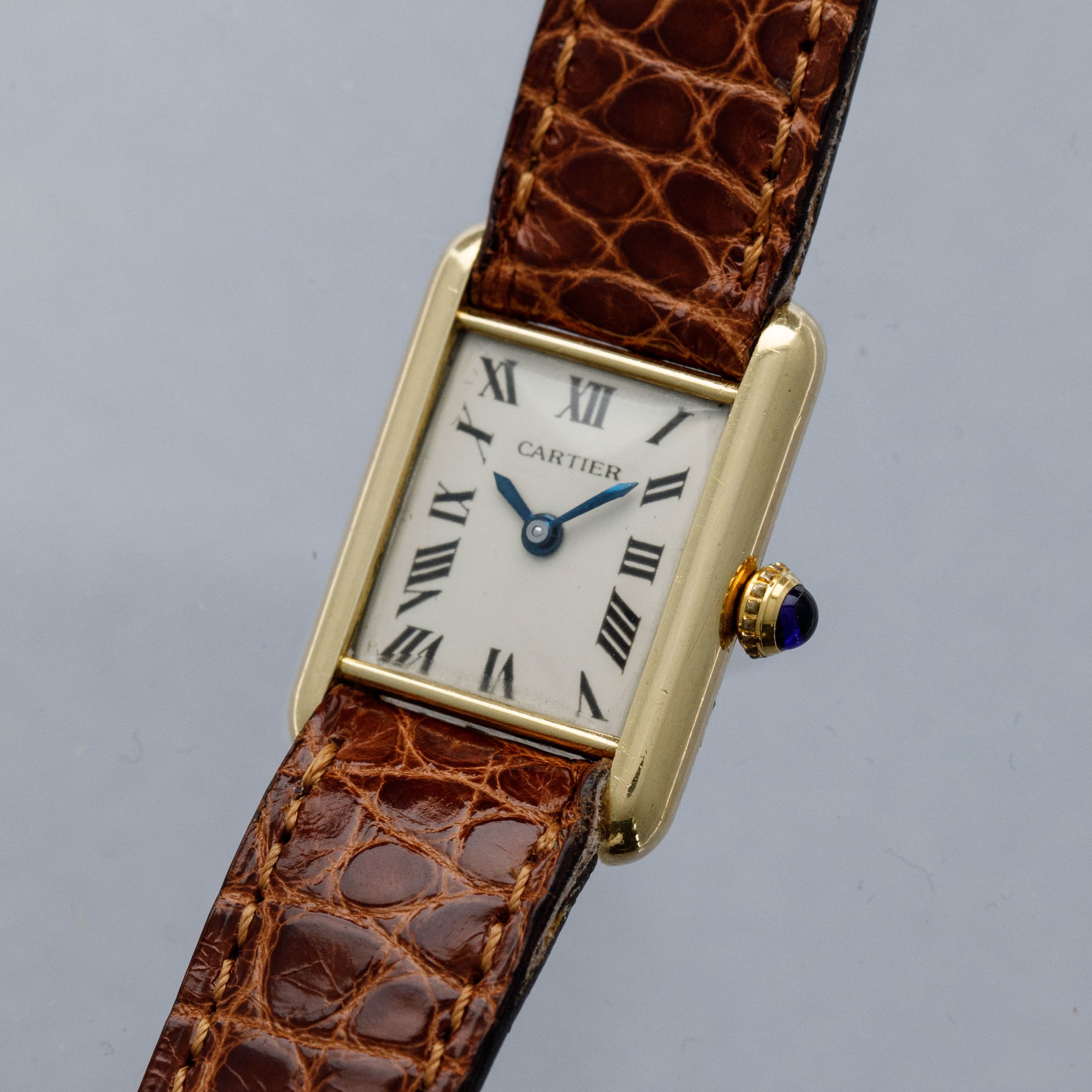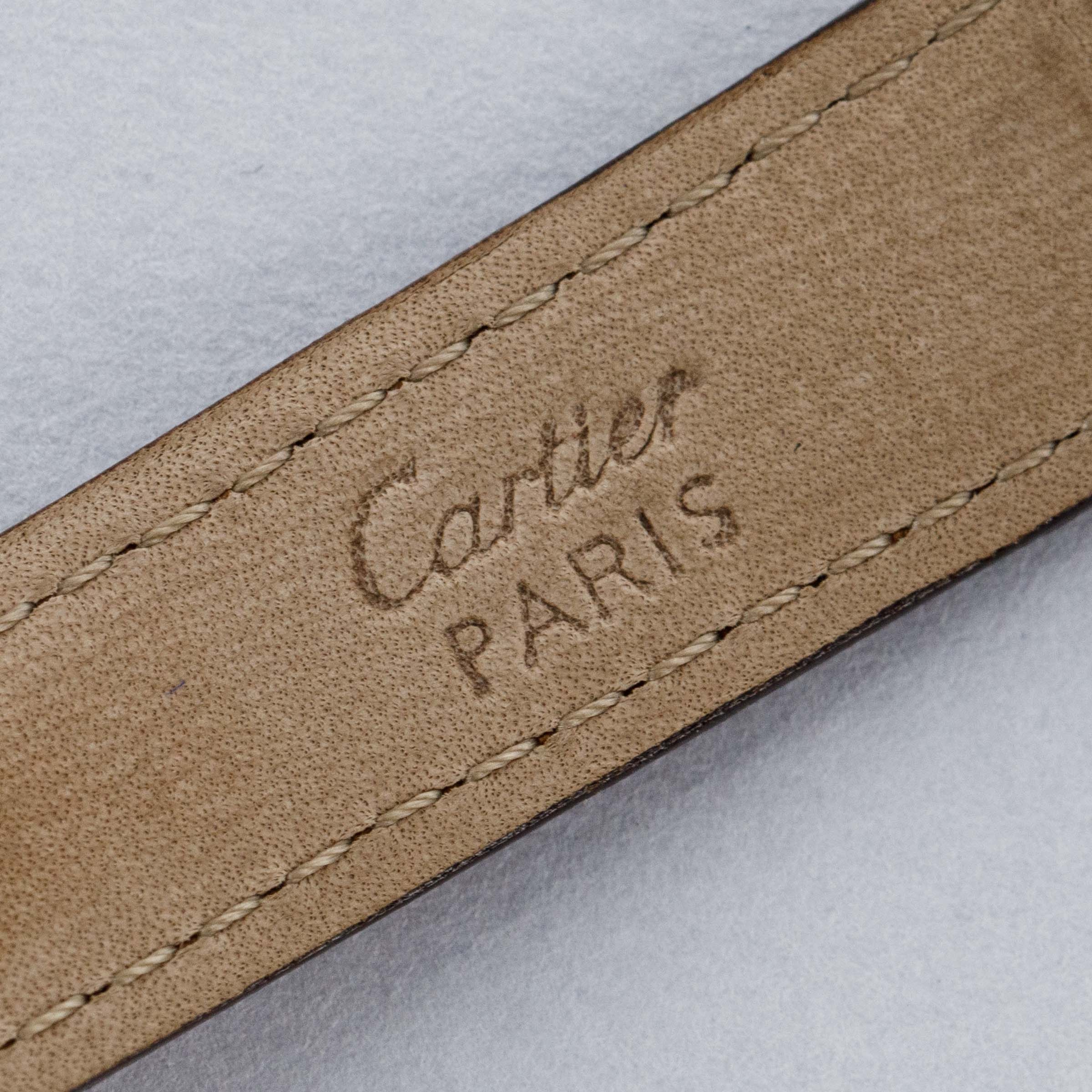 Fitted with Cartier's signature dial, this example sports a cream off-white dial with blued steel hands, and black Roman numerals.