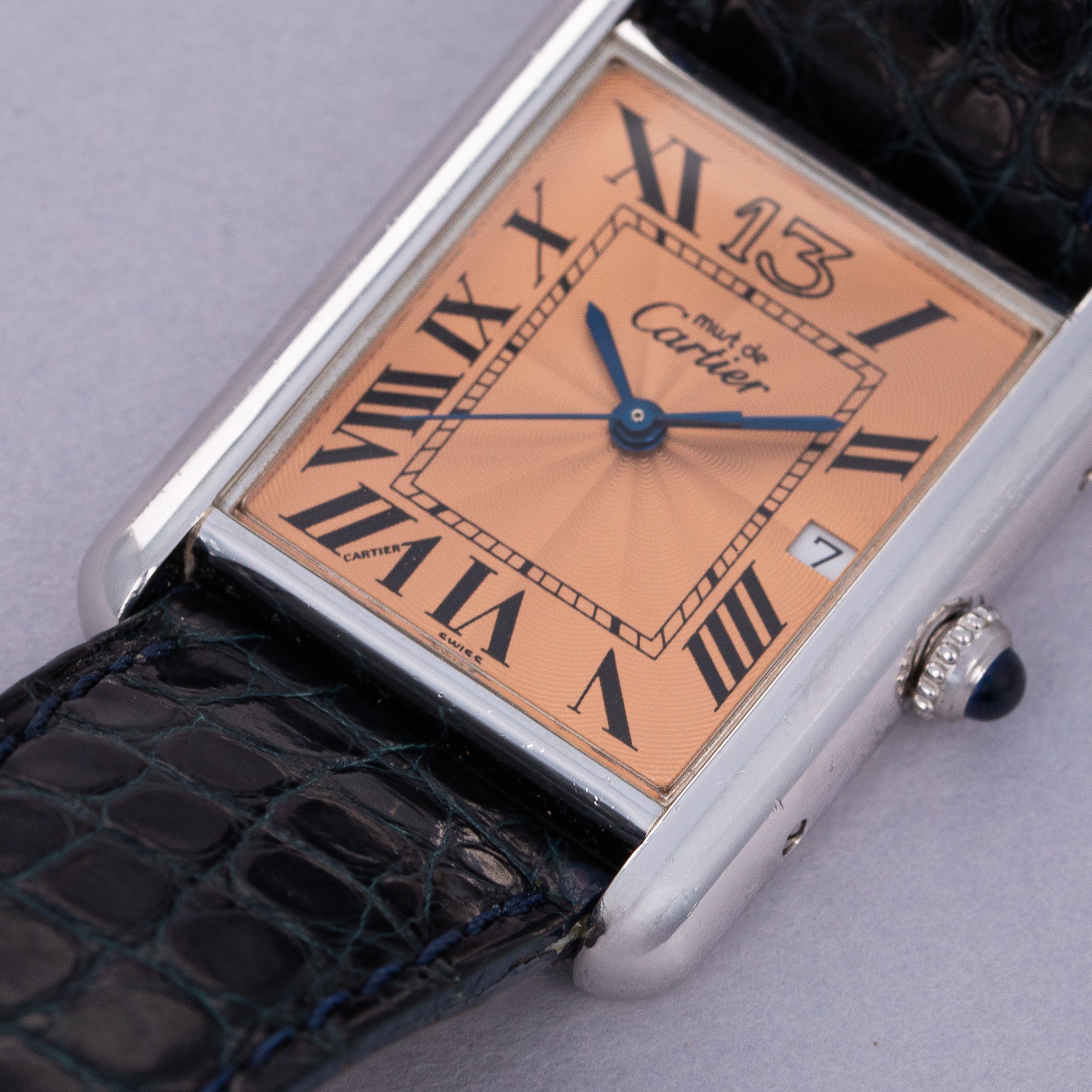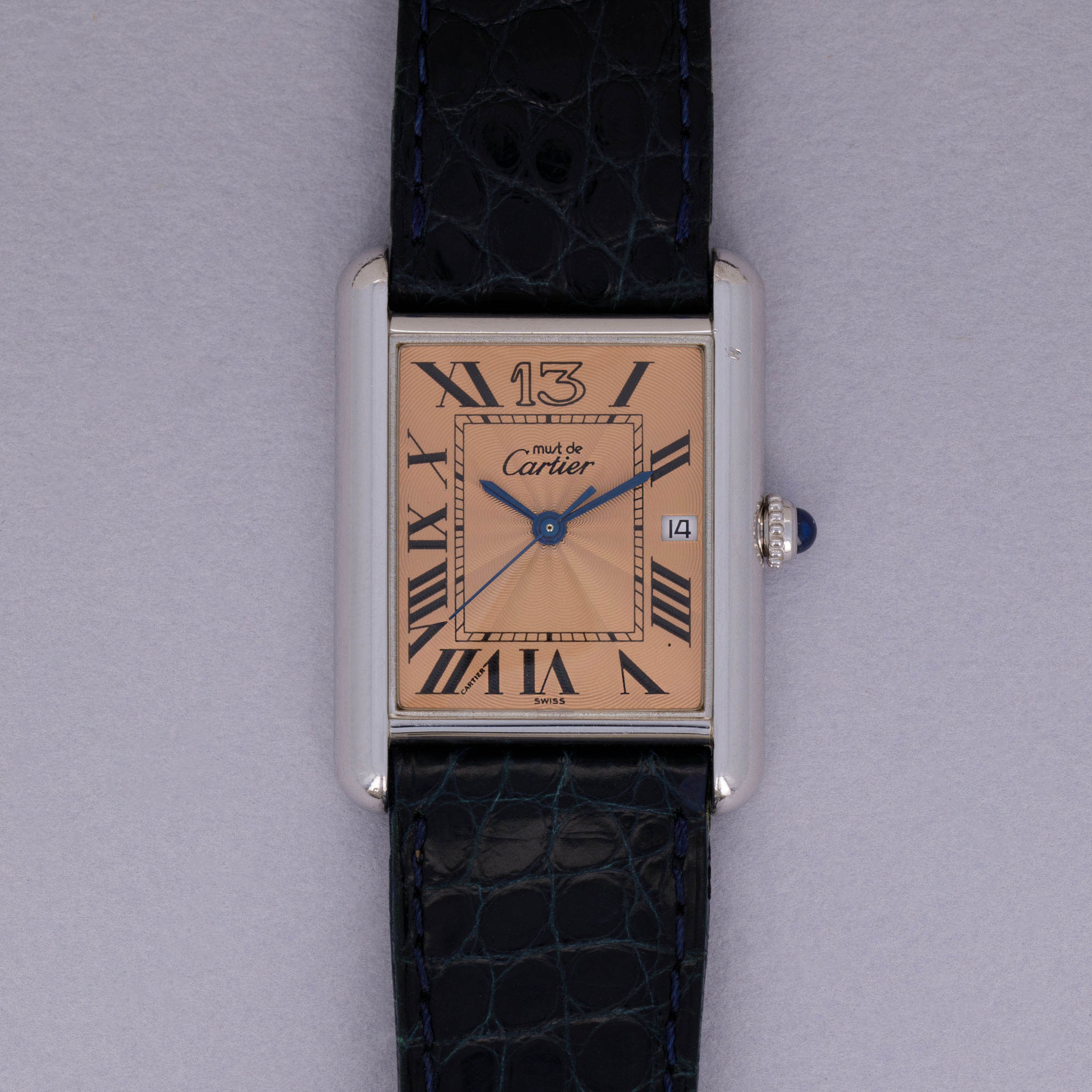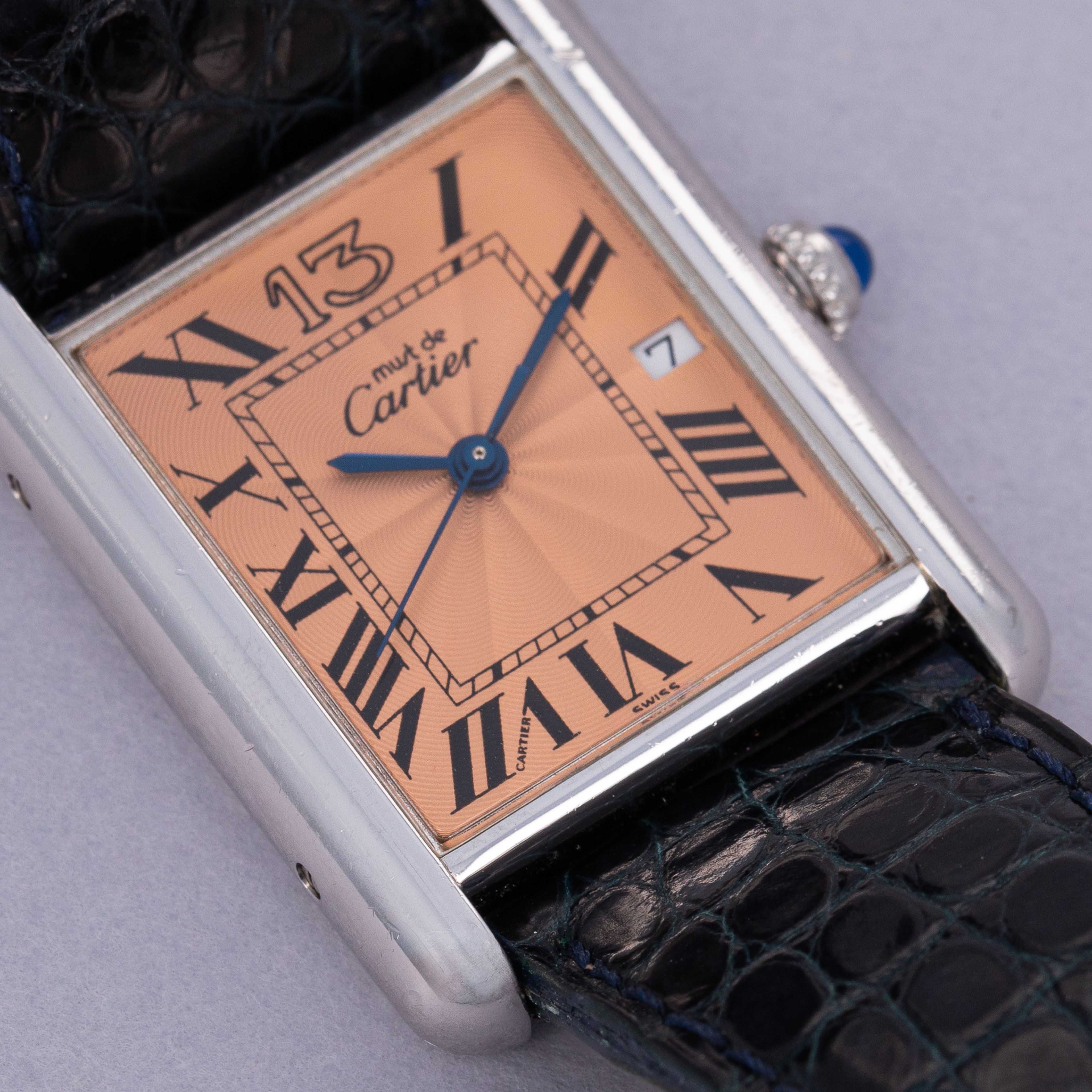 Boasting a stunning salmon dial with a gorgeous guilloche pattern, the ref. 2414 is clearly not a standard variant from the Must de Cartier collection. Indeed, its 13 numeral at 12 o'clock, a reference to 13 Rue de la Paix, highlights this even further.