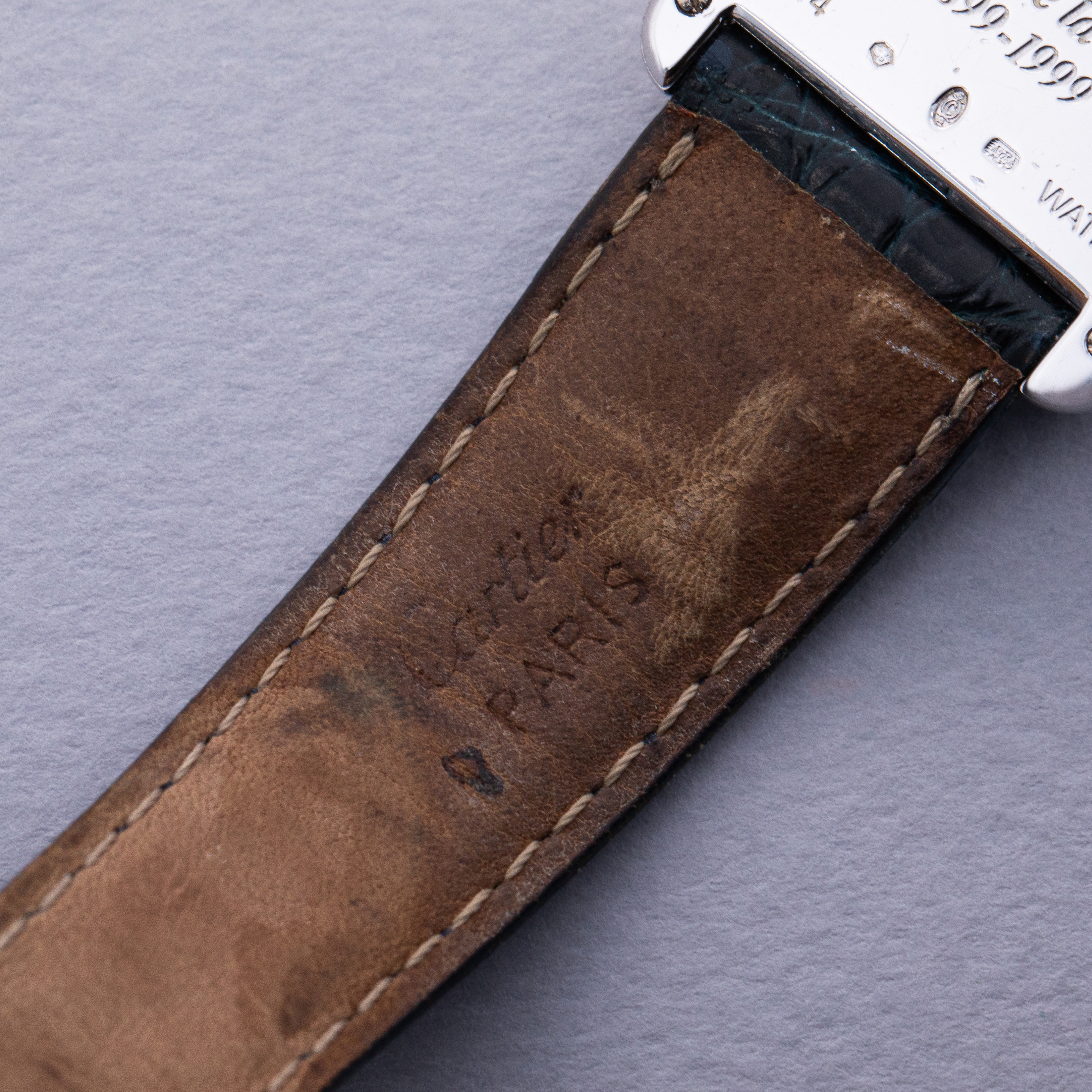 With its dial boasting an obscure reference to its status as a special edition, the ref. 2414 also included an engraved caseback celebrating its anniversary status and 13 Rue de la Paix - Cartier's Parisian flagship location.