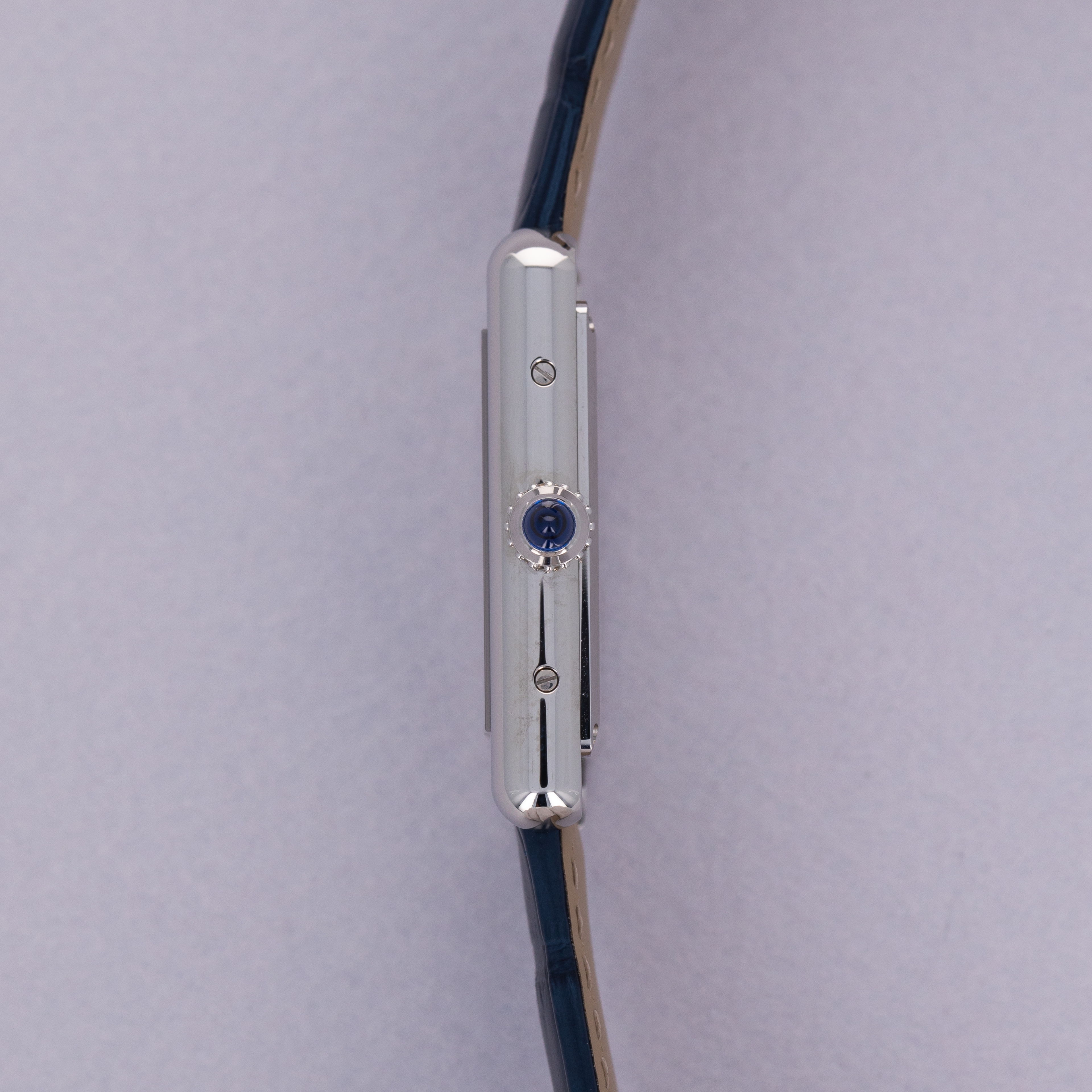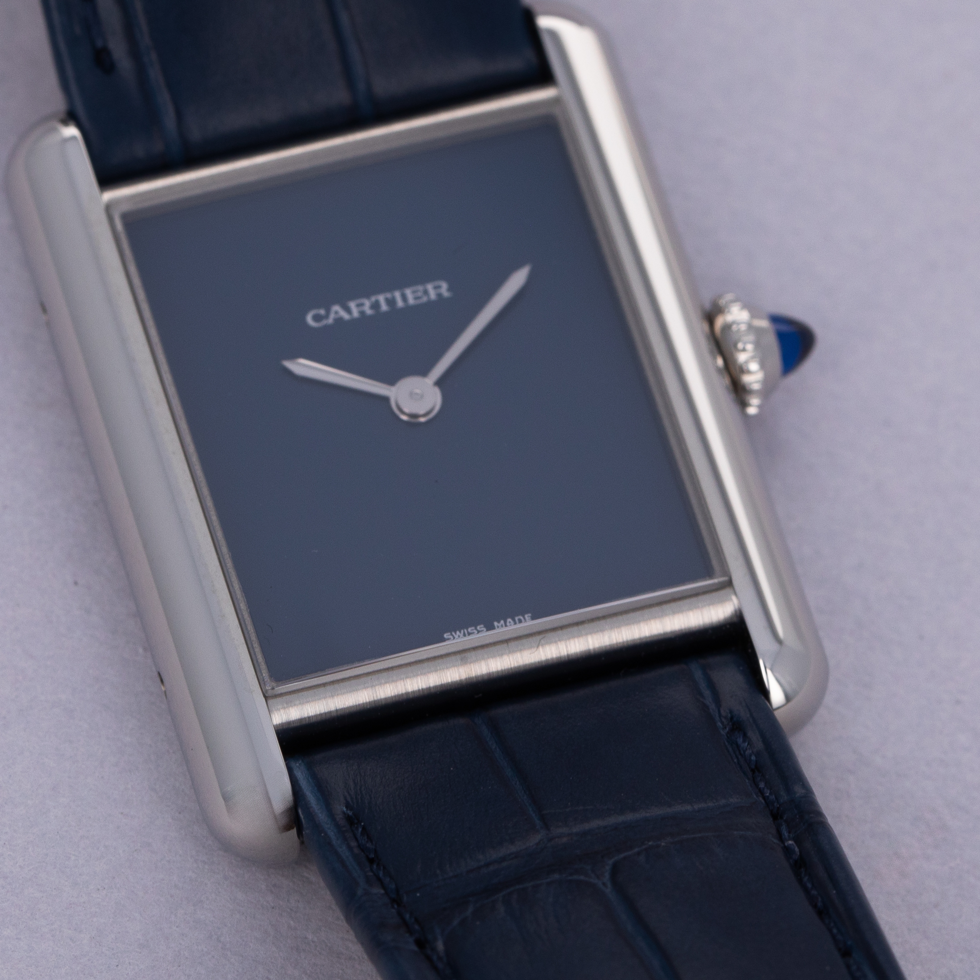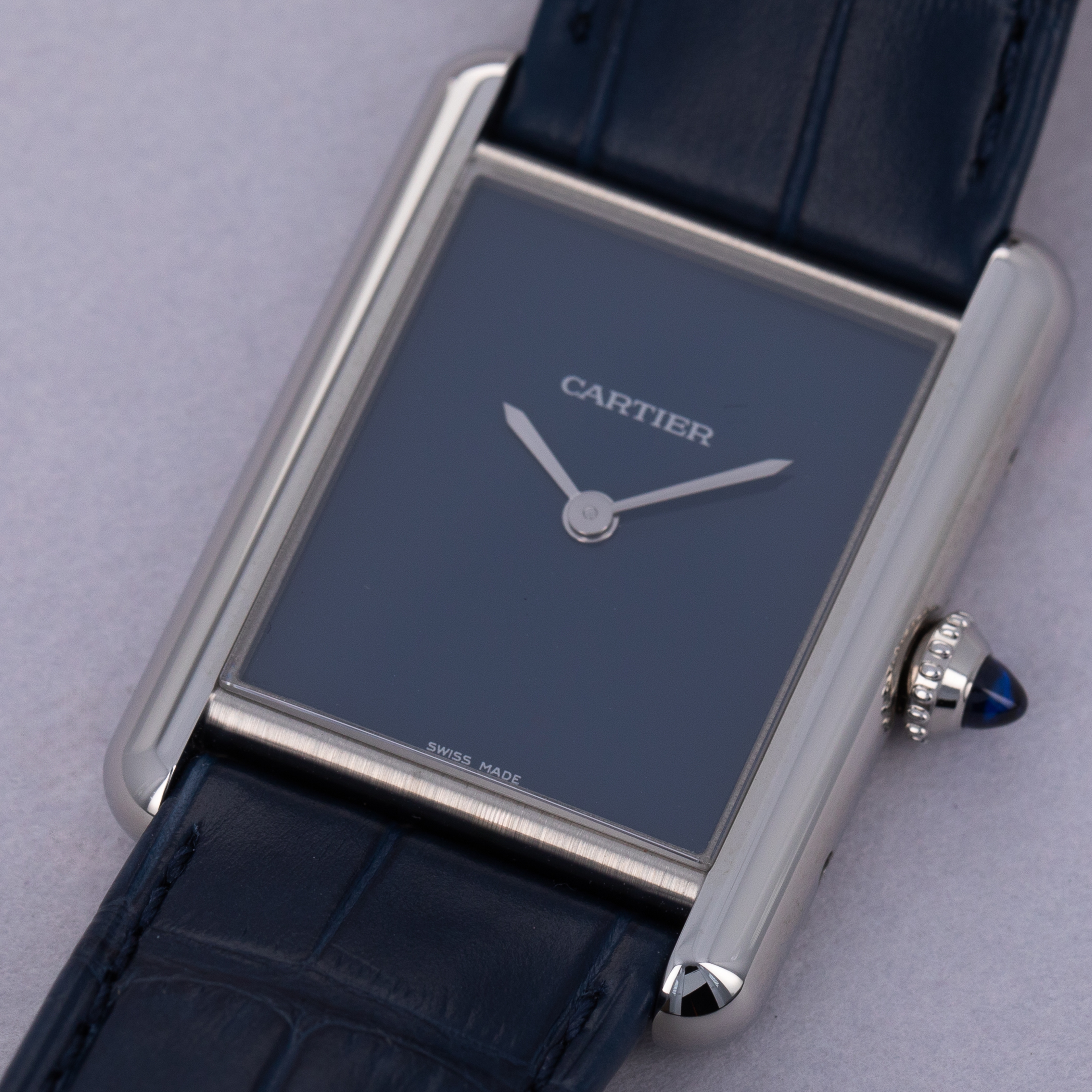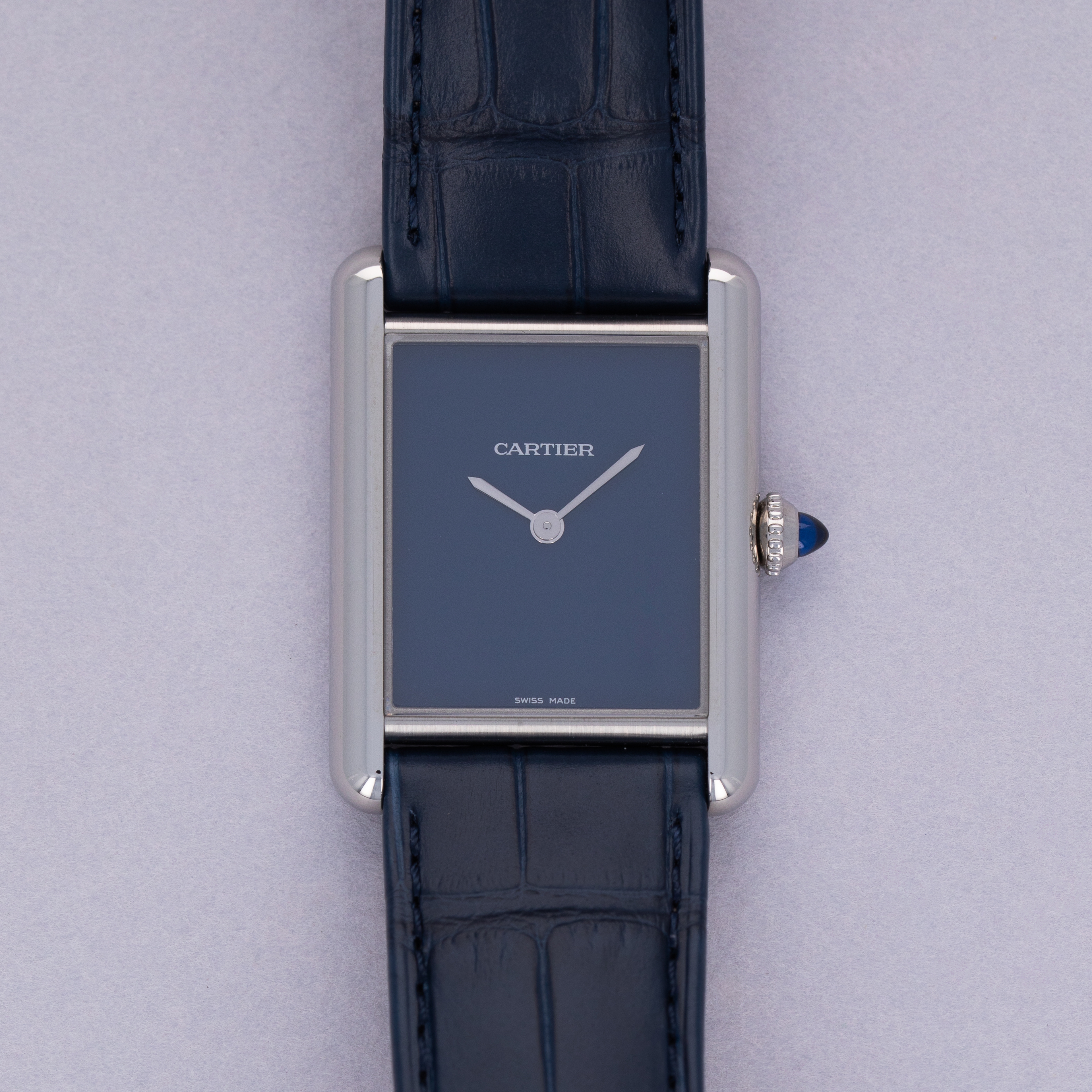 Featuring a blue lacquer dial free from any indices or inscriptions beyond Cartier's name at 12 o'clock, the ref. WSTA0055 is incredibly understated and monochromatic thanks to its dial and strap perfectly matching Cartier's signature sapphire cabochon.