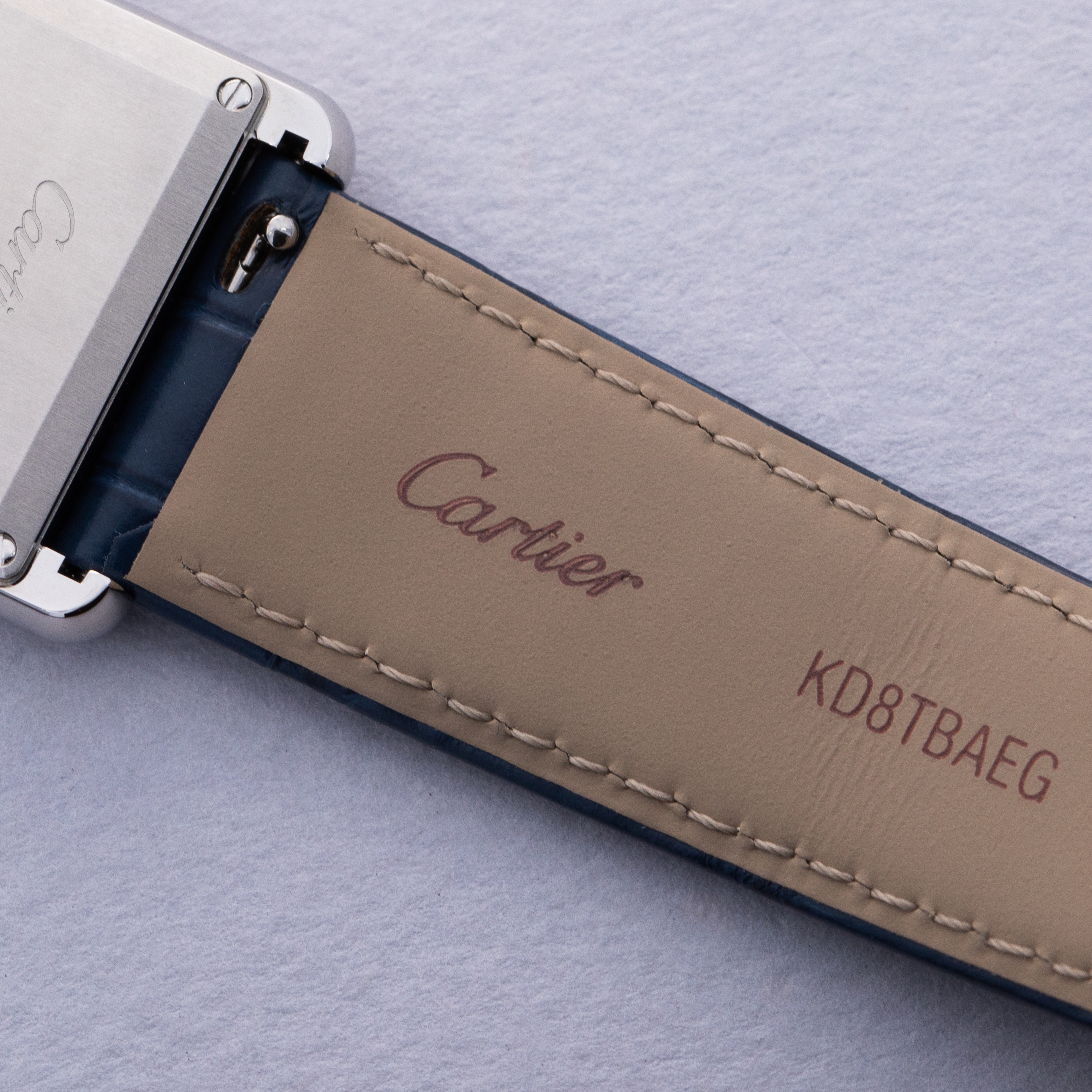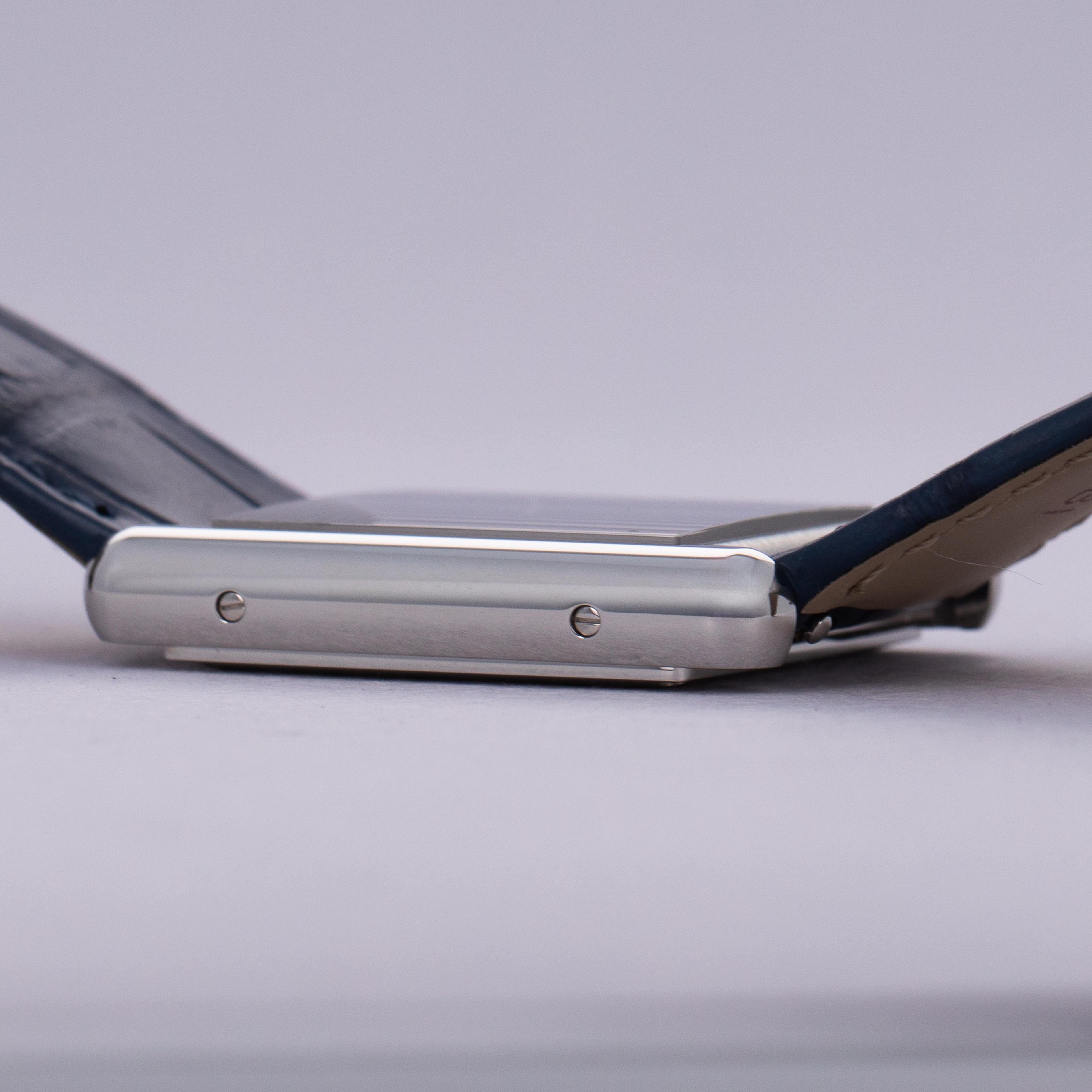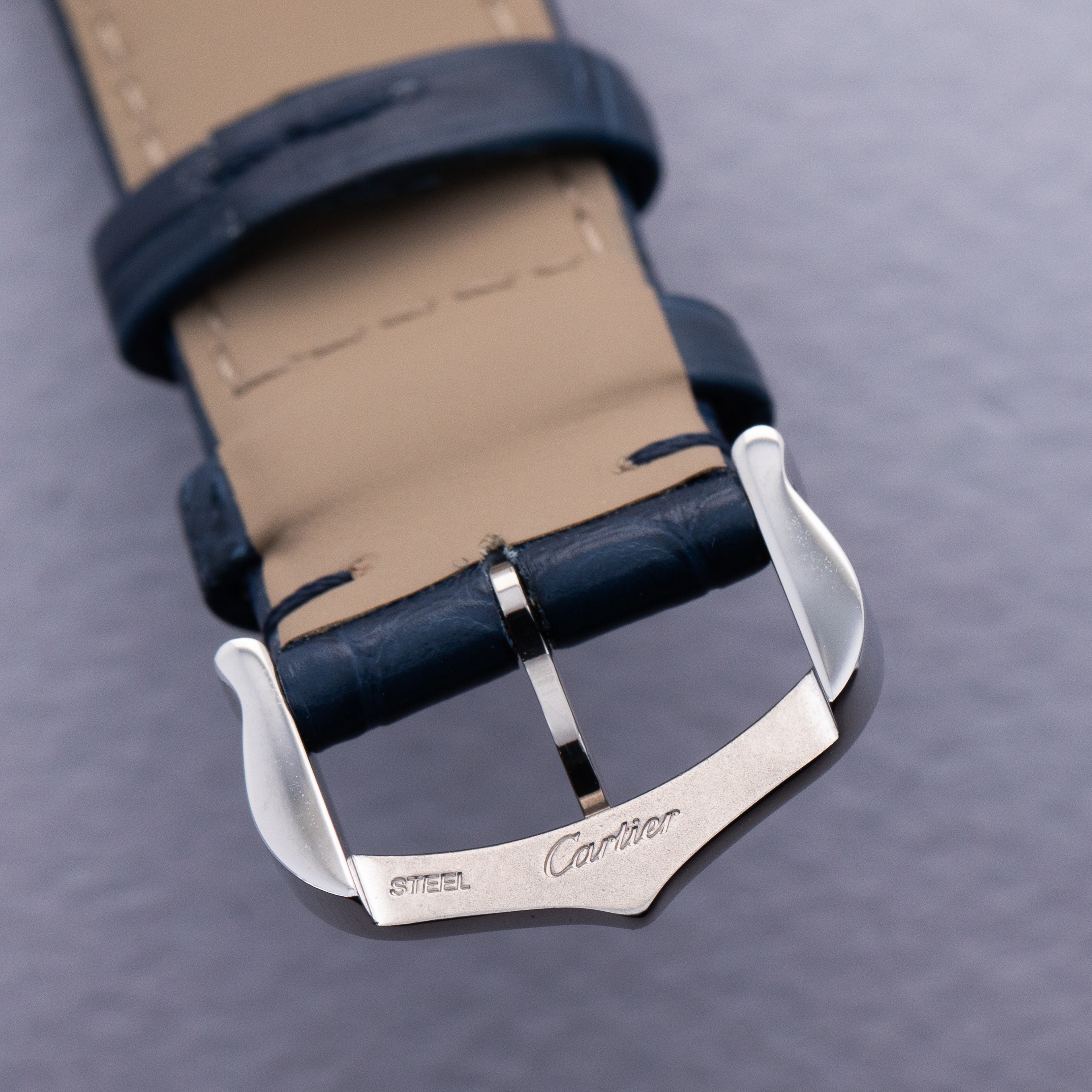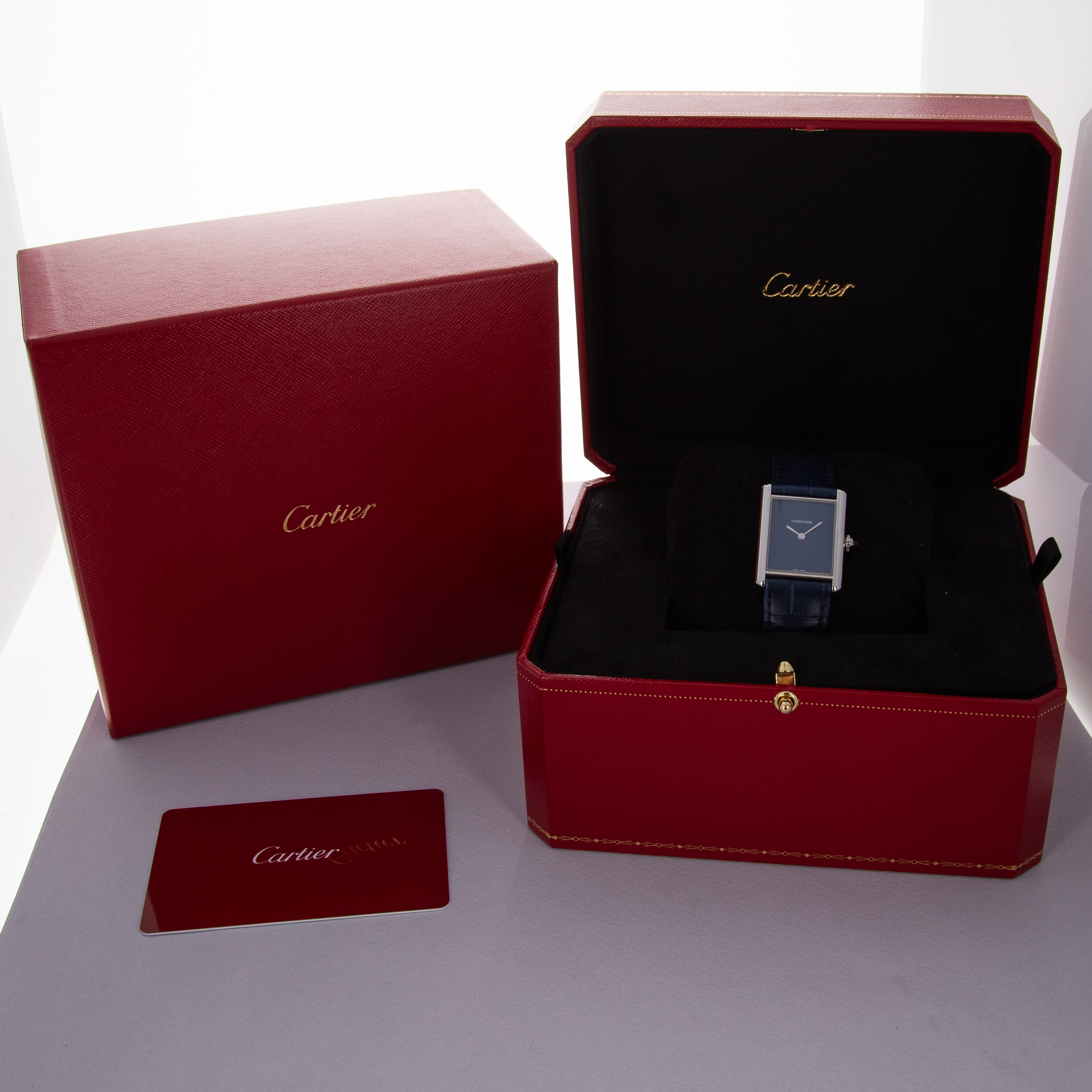 Featuring a blue lacquer dial free from any indices or inscriptions beyond Cartier's name at 12 o'clock, the ref. WSTA0055 is incredibly understated and monochromatic thanks to its dial and strap perfectly matching Cartier's signature sapphire cabochon.