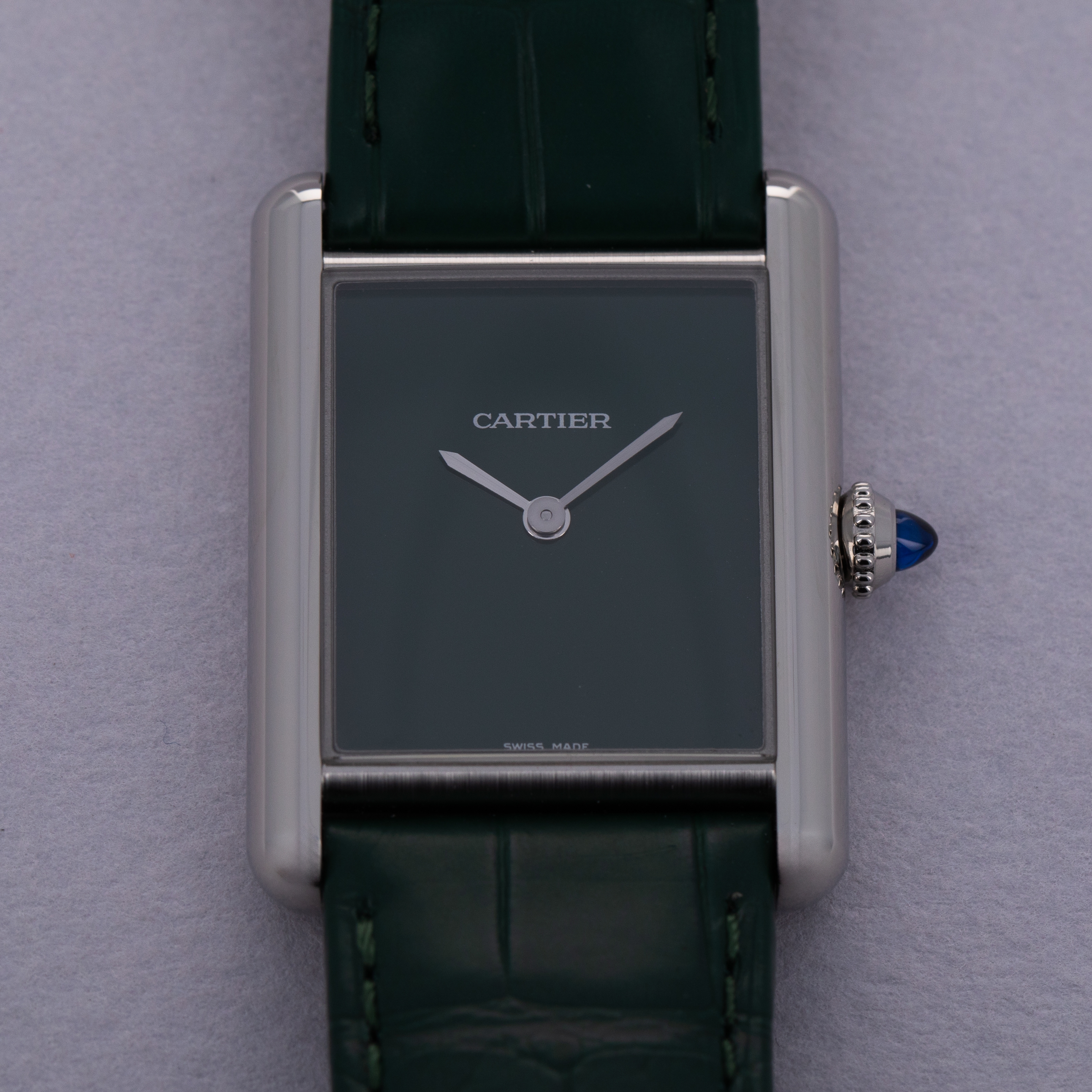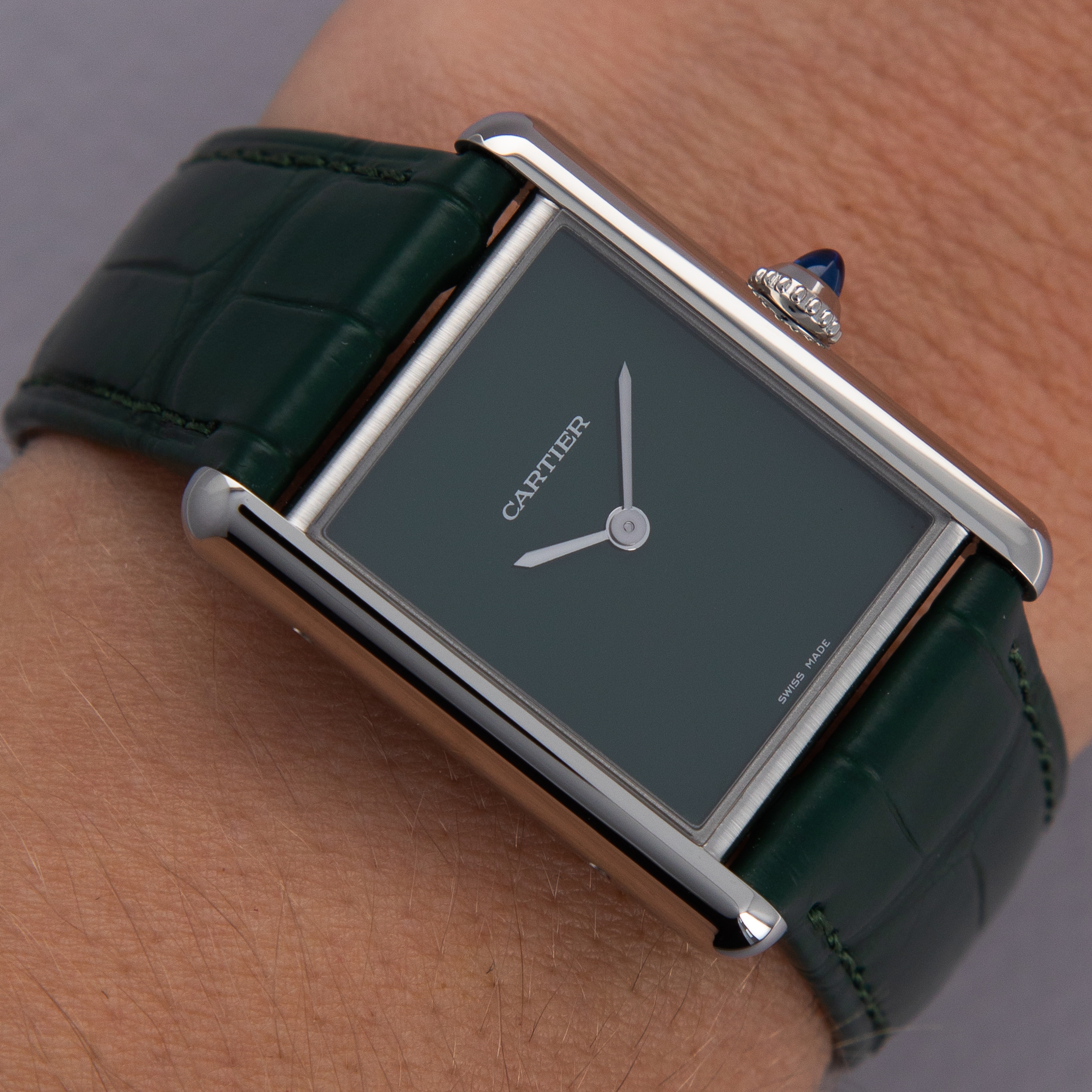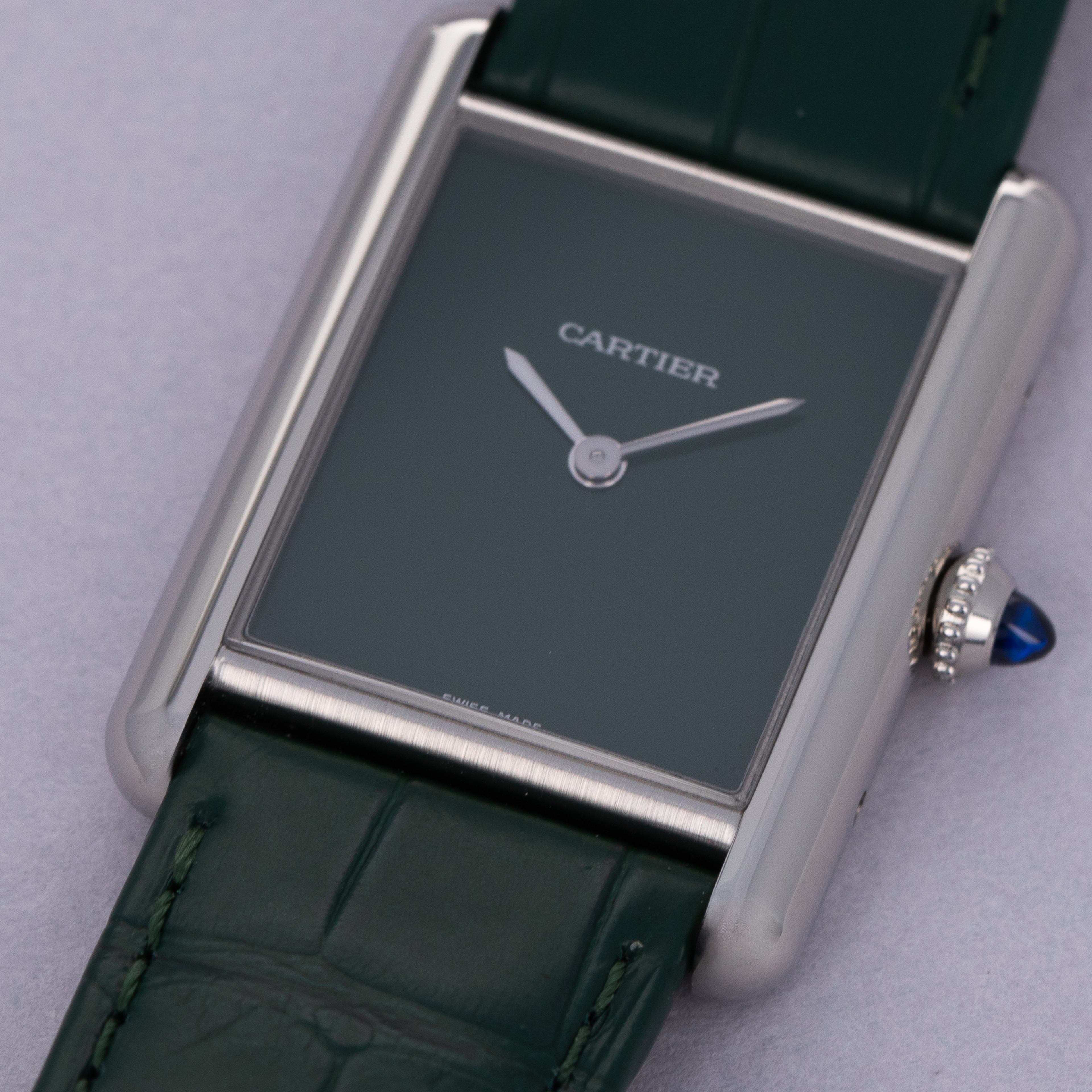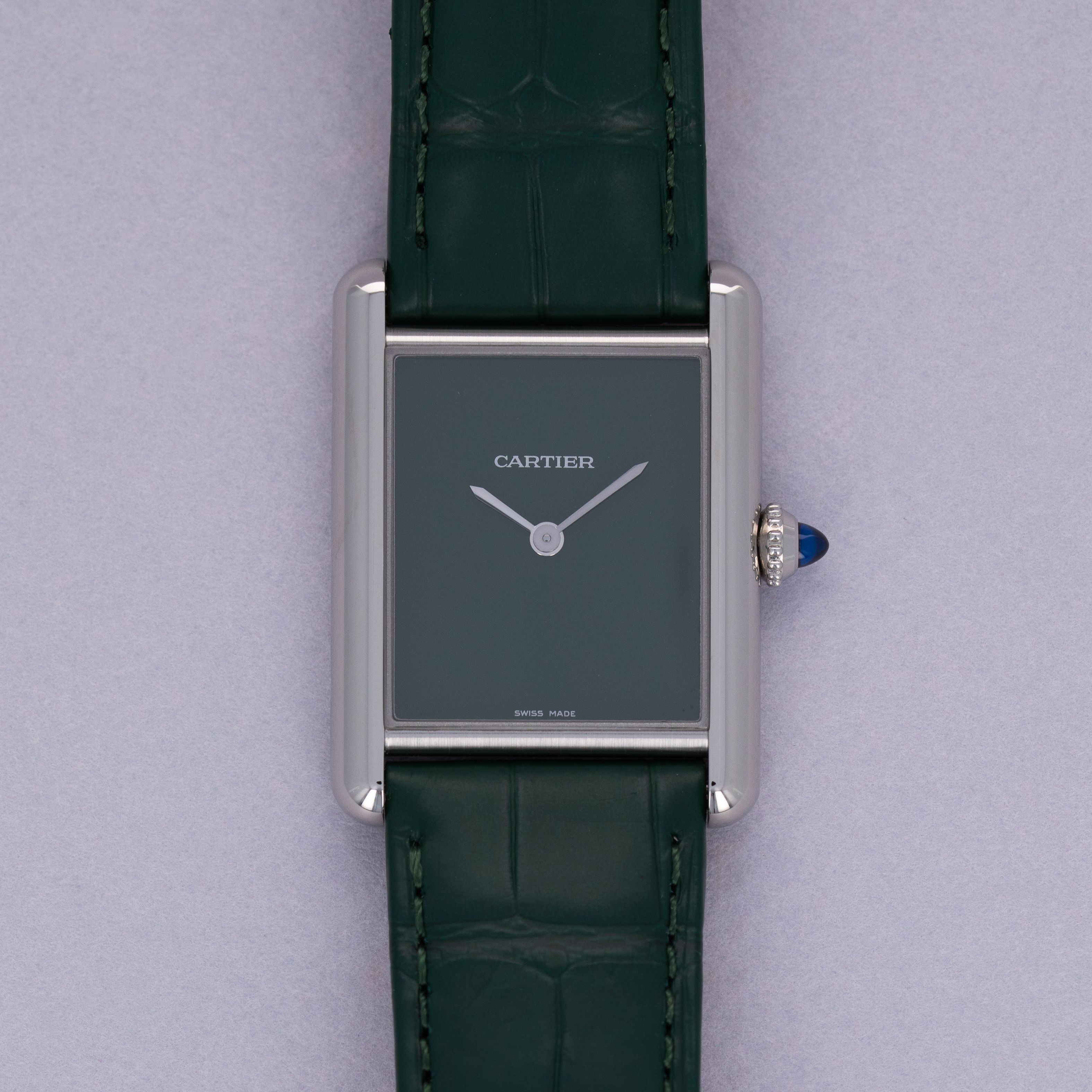 Featuring a green lacquer dial free from any indices or inscriptions beyond Cartier's name at 12 o'clock, the ref. WSTA0056 is incredibly understated.
