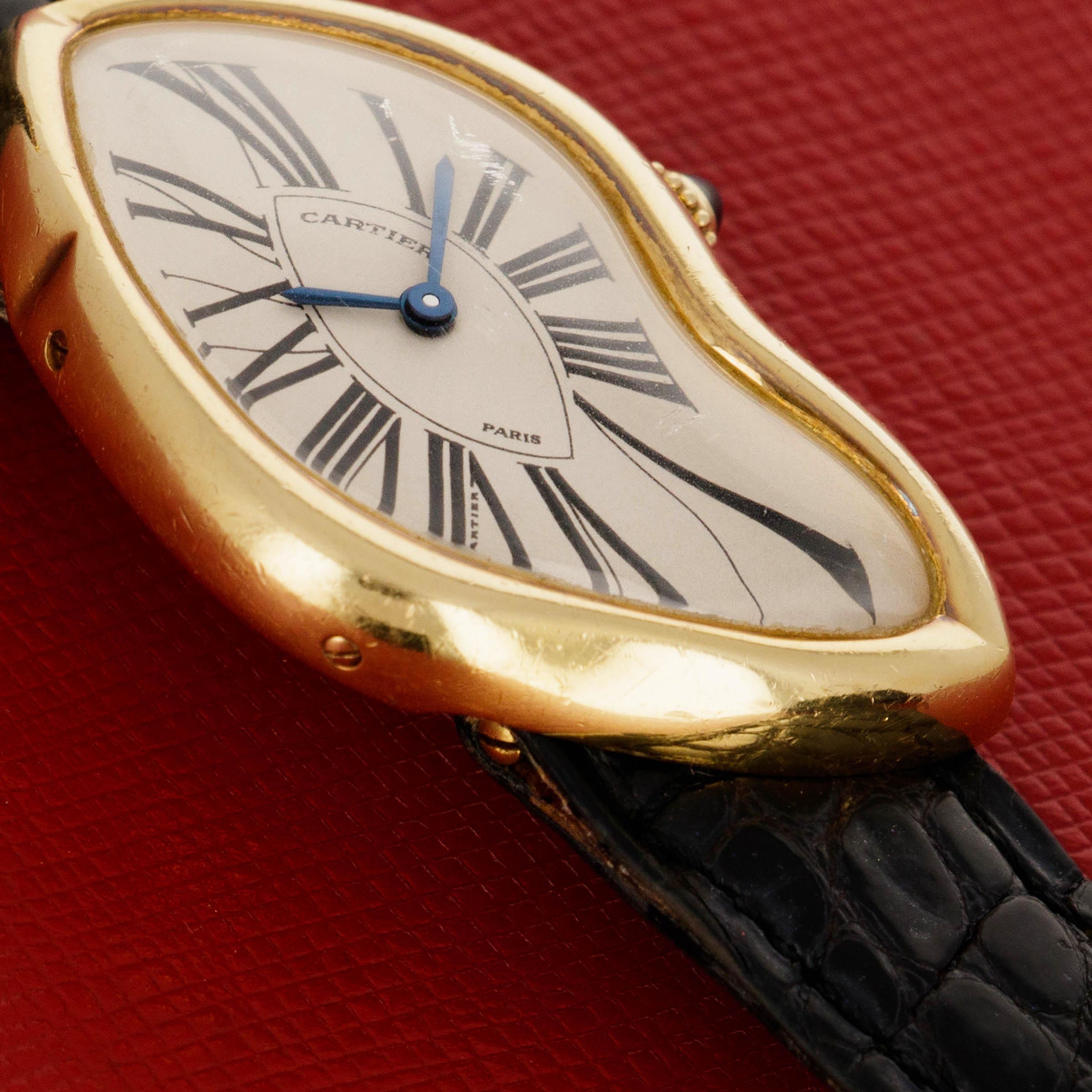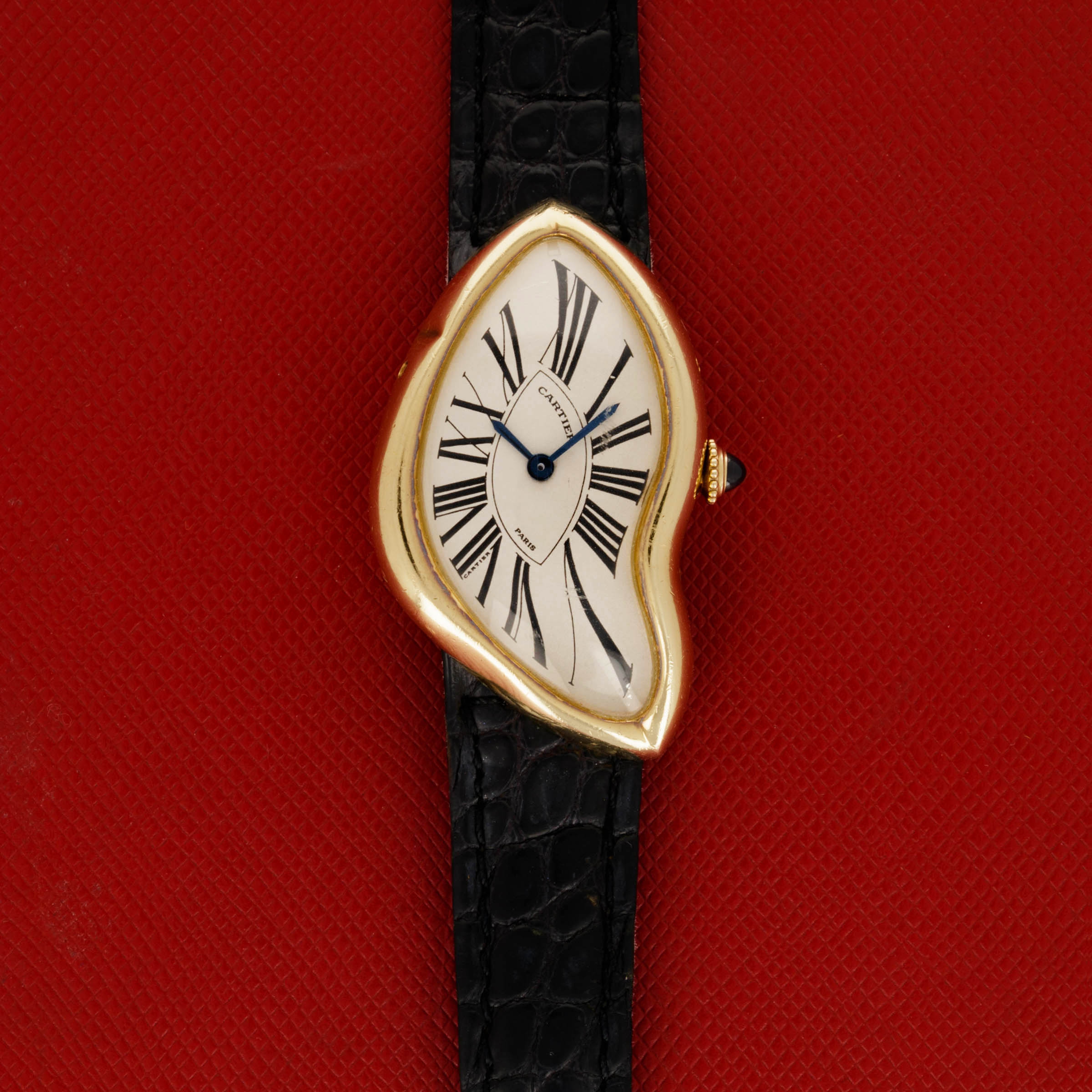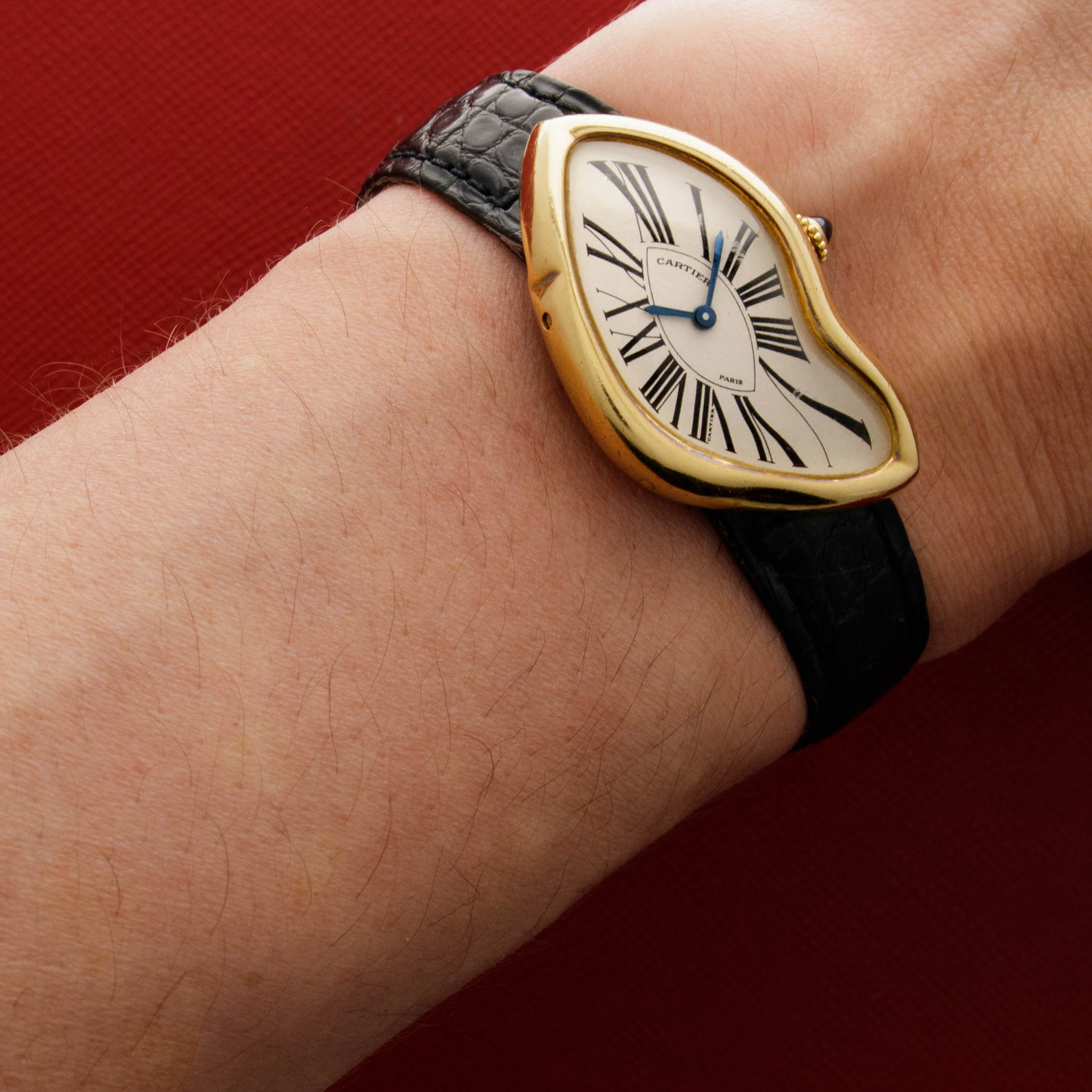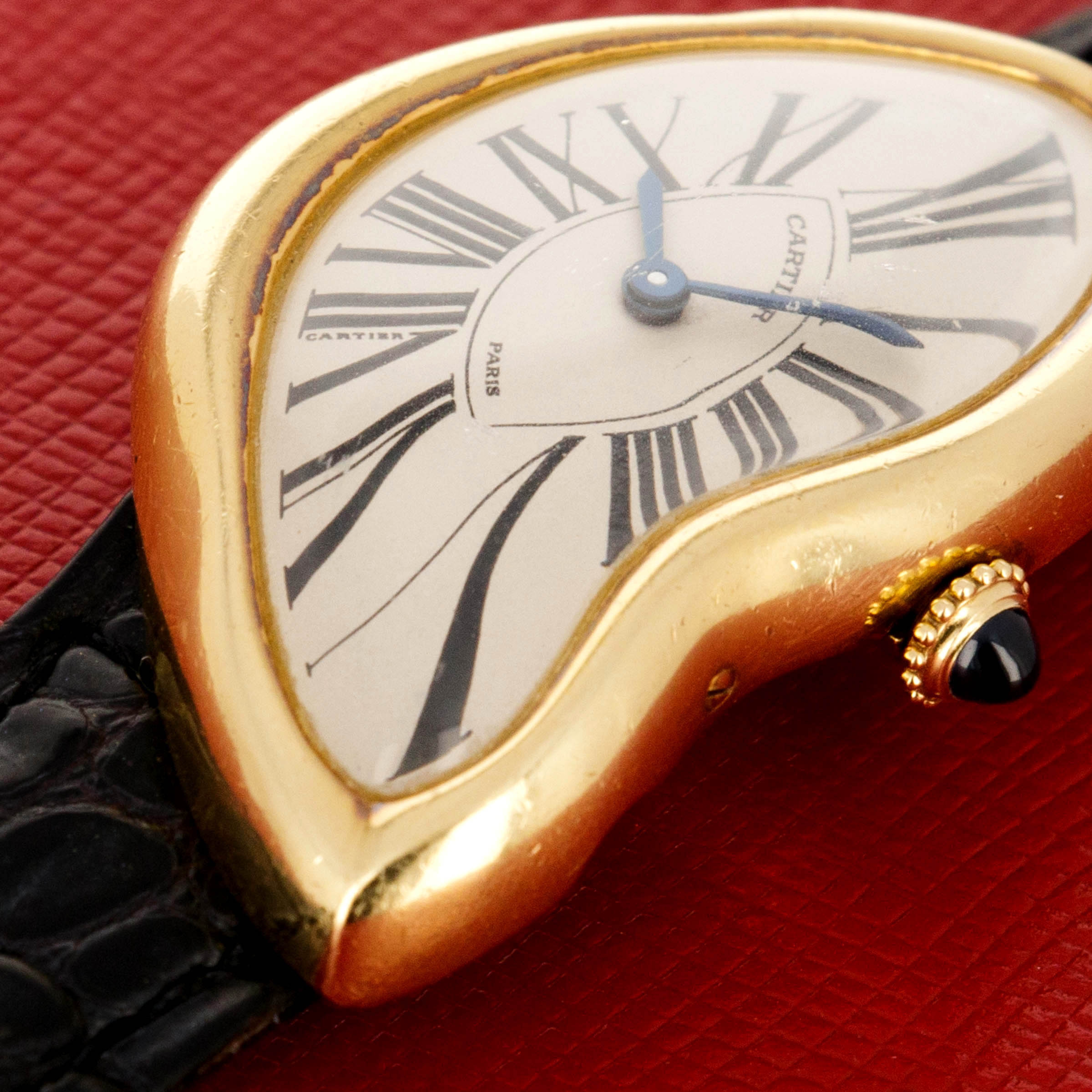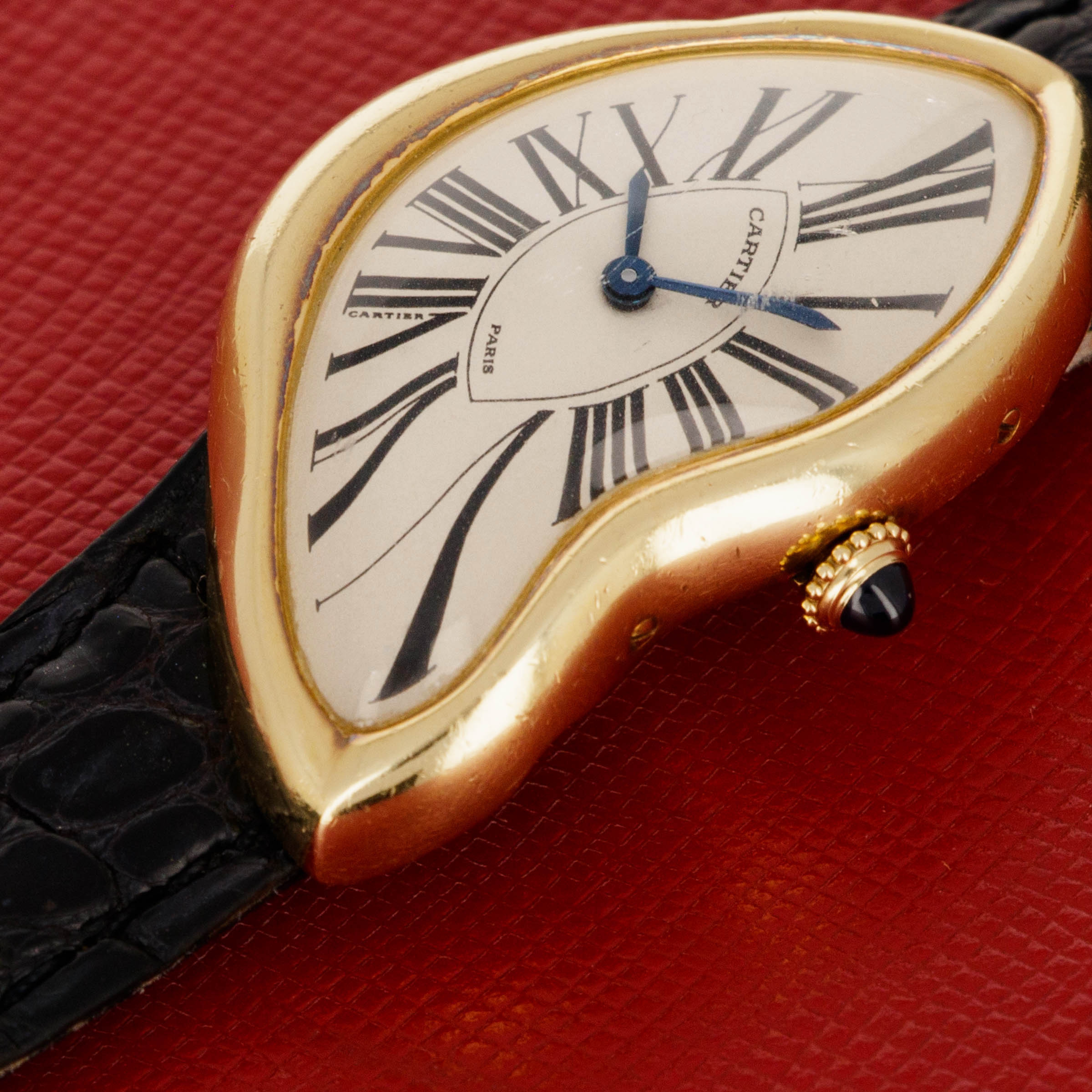 The Cartier Crash is a legendary timepiece with multiple spurious origin stories detailing things from fiery car crashes in central London to spontaneous inspiration following the arrival of a badly damaged watch brought in for service to Cartier’s London location. No matter its origin, the Cartier Crash is wrapped in mystique, and London is widely acknowledged as its spiritual, and literal, home due to its production being the brainchild of Jean-Jacques Cartier, the head of Cartier London at the time, and famed designer Rupert Emmerson. Jean-Jacques had decided in the mid-60s that it was time for Cartier London to create their own watches, and so Crash was born and first produced there. Designed by Cartier and Emmerson to reflect the surrealist design culture that was popular during the '60s, the Crash is entirely recognizable by its unconventional case shape reminiscent of Salvador Dali's melting clocks in his 1931 painting 'The Persistence of Memory' and its warped dial layout. The design was conceived as a Cartier Oval with "twisted ends". Constructed of 18kt yellow gold with Cartier's famed, and a collector favorite, Paris-signed Cartier dial in white featuring black exploded Roman numerals and blued steel hands, this timepiece is a beautiful example of the Crash in all of its wonderful glory. Produced in 1991, this example was part of the limited edition run of 400 pieces that Cartier's Paris boutique released in that same year and is individually numbered 316 on its caseback.