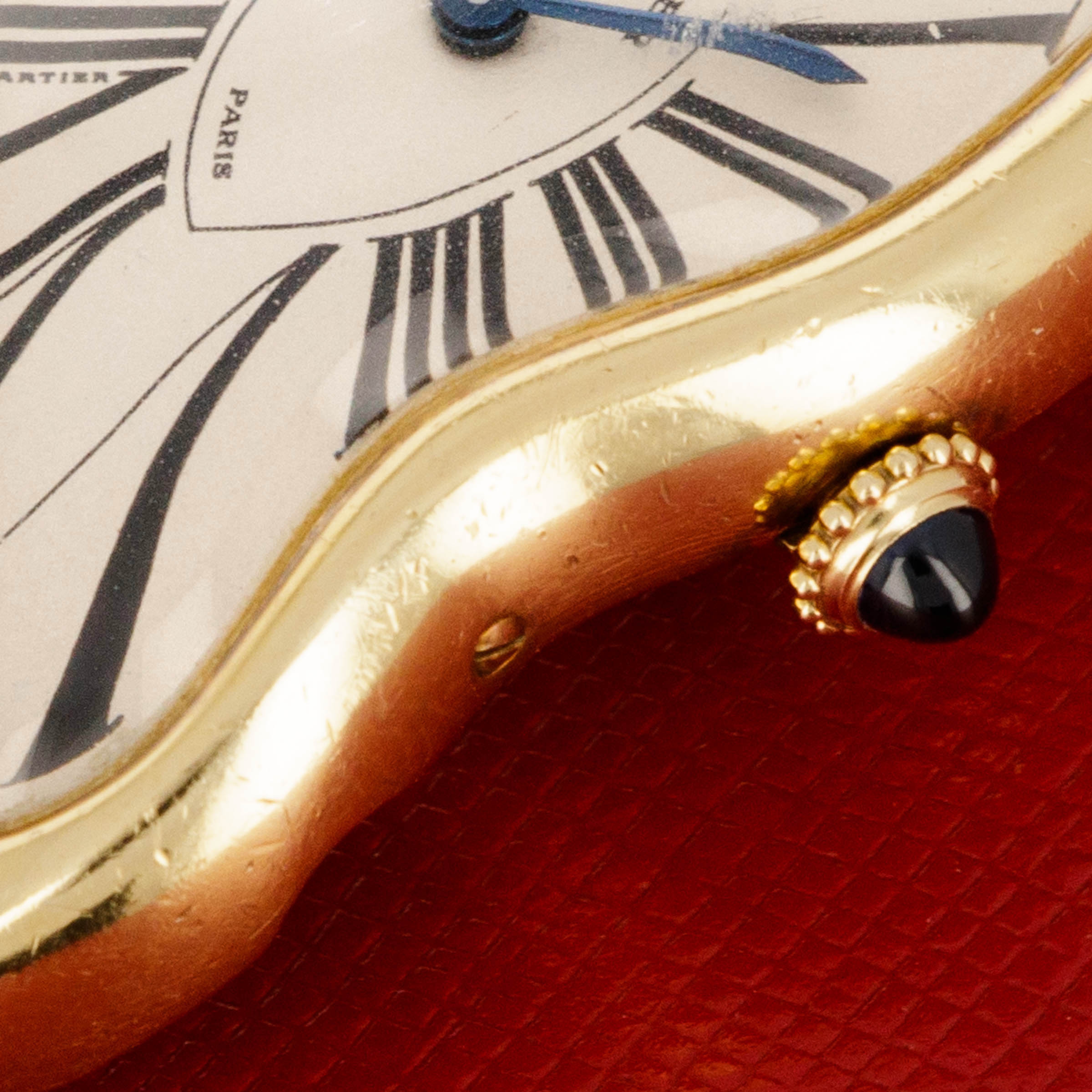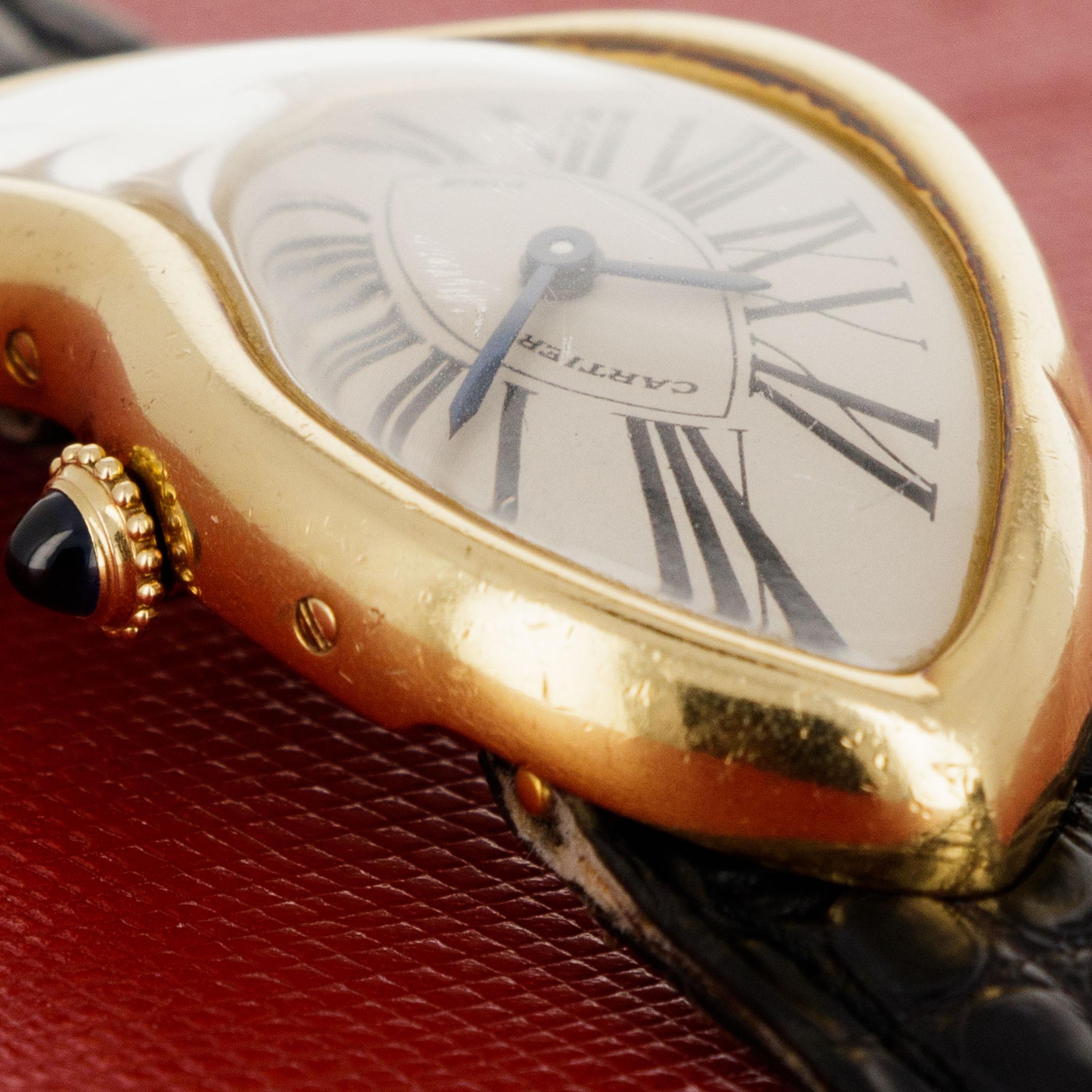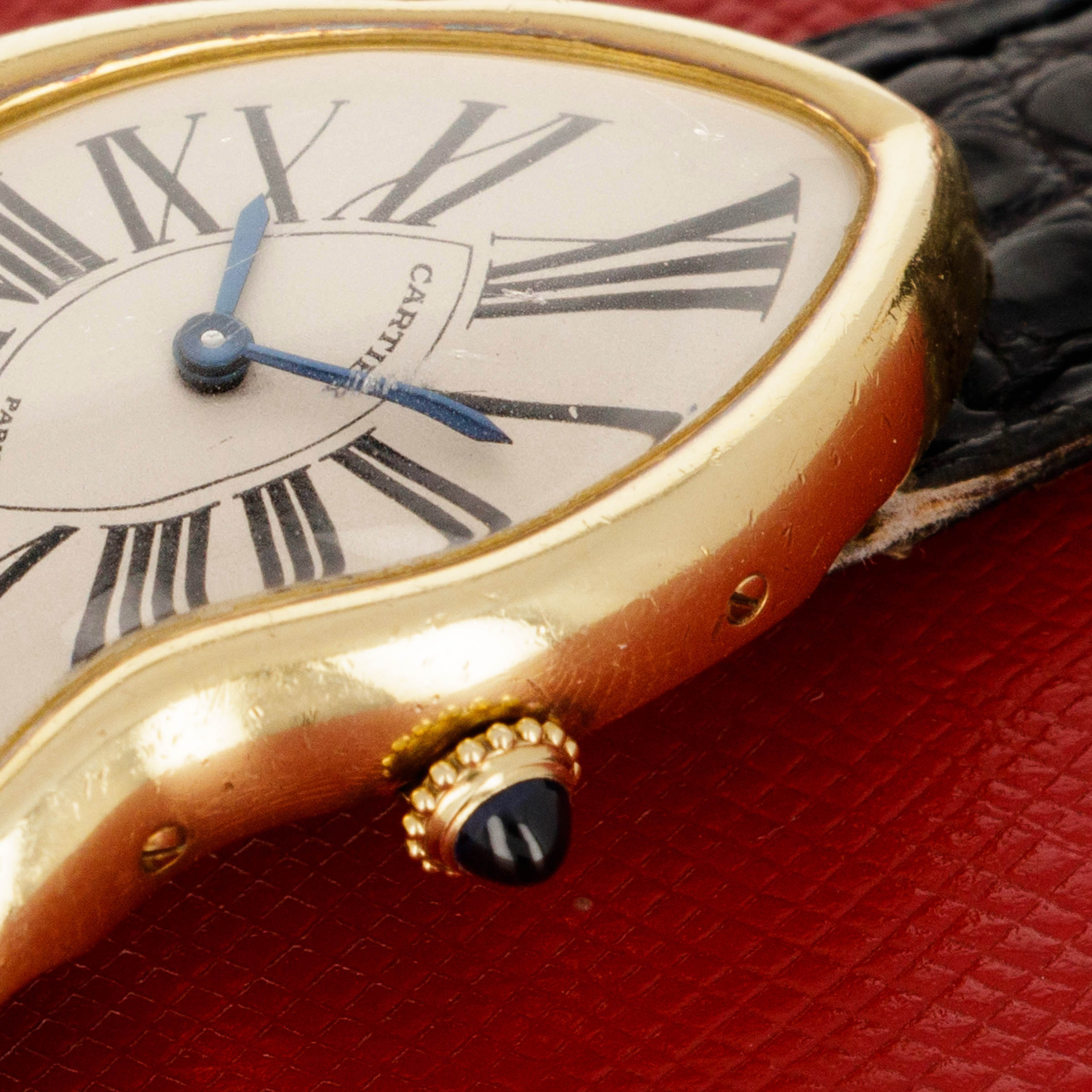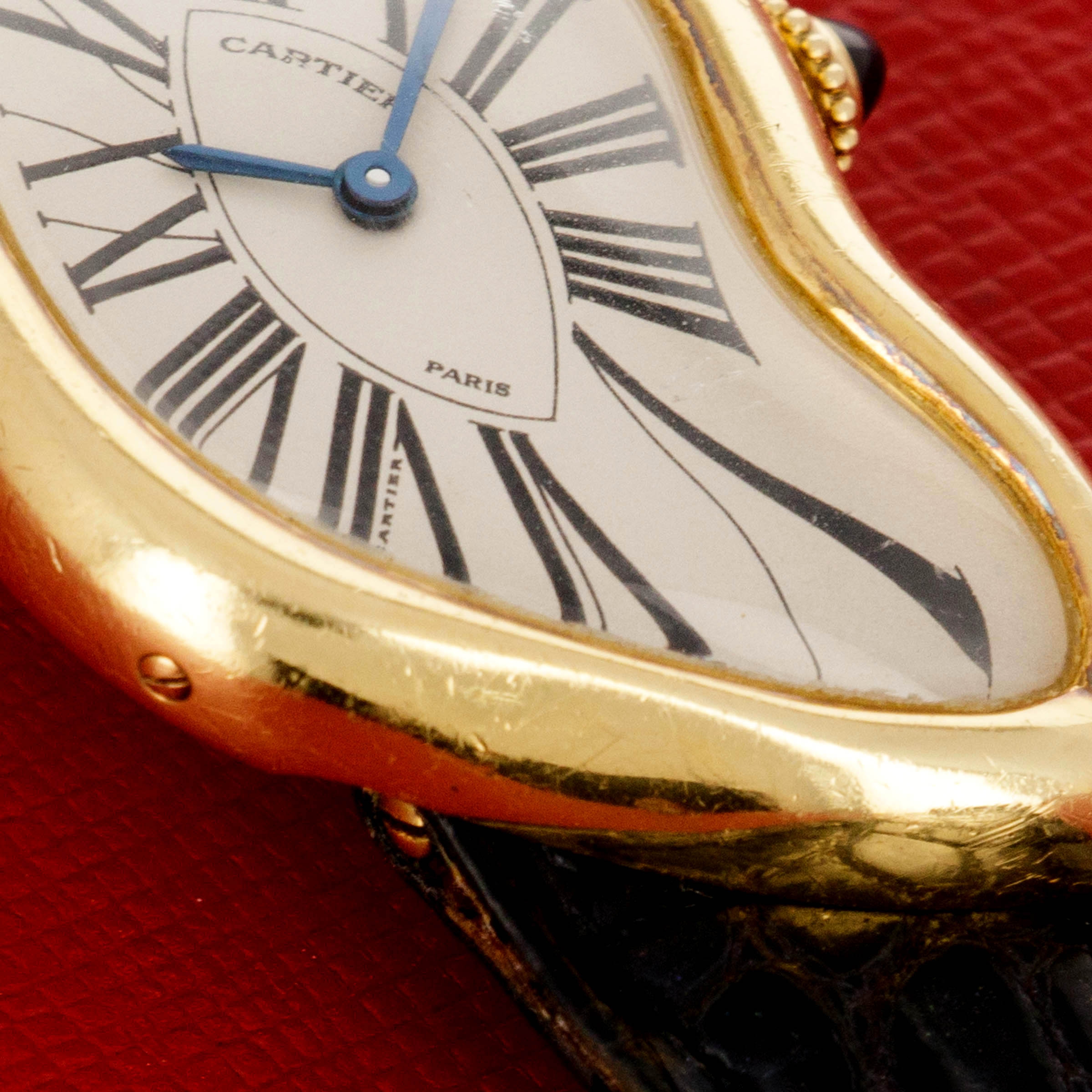 The Cartier Crash is a legendary timepiece with multiple spurious origin stories detailing things from fiery car crashes in central London to spontaneous inspiration following the arrival of a badly damaged watch brought in for service to Cartier’s London location. No matter its origin, the Cartier Crash is wrapped in mystique, and London is widely acknowledged as its spiritual, and literal, home due to its production being the brainchild of Jean-Jacques Cartier, the head of Cartier London at the time, and famed designer Rupert Emmerson. Jean-Jacques had decided in the mid-60s that it was time for Cartier London to create their own watches, and so Crash was born and first produced there. Designed by Cartier and Emmerson to reflect the surrealist design culture that was popular during the '60s, the Crash is entirely recognizable by its unconventional case shape reminiscent of Salvador Dali's melting clocks in his 1931 painting 'The Persistence of Memory' and its warped dial layout. The design was conceived as a Cartier Oval with "twisted ends". Constructed of 18kt yellow gold with Cartier's famed, and a collector favorite, Paris-signed Cartier dial in white featuring black exploded Roman numerals and blued steel hands, this timepiece is a beautiful example of the Crash in all of its wonderful glory. Produced in 1991, this example was part of the limited edition run of 400 pieces that Cartier's Paris boutique released in that same year and is individually numbered 316 on its caseback.