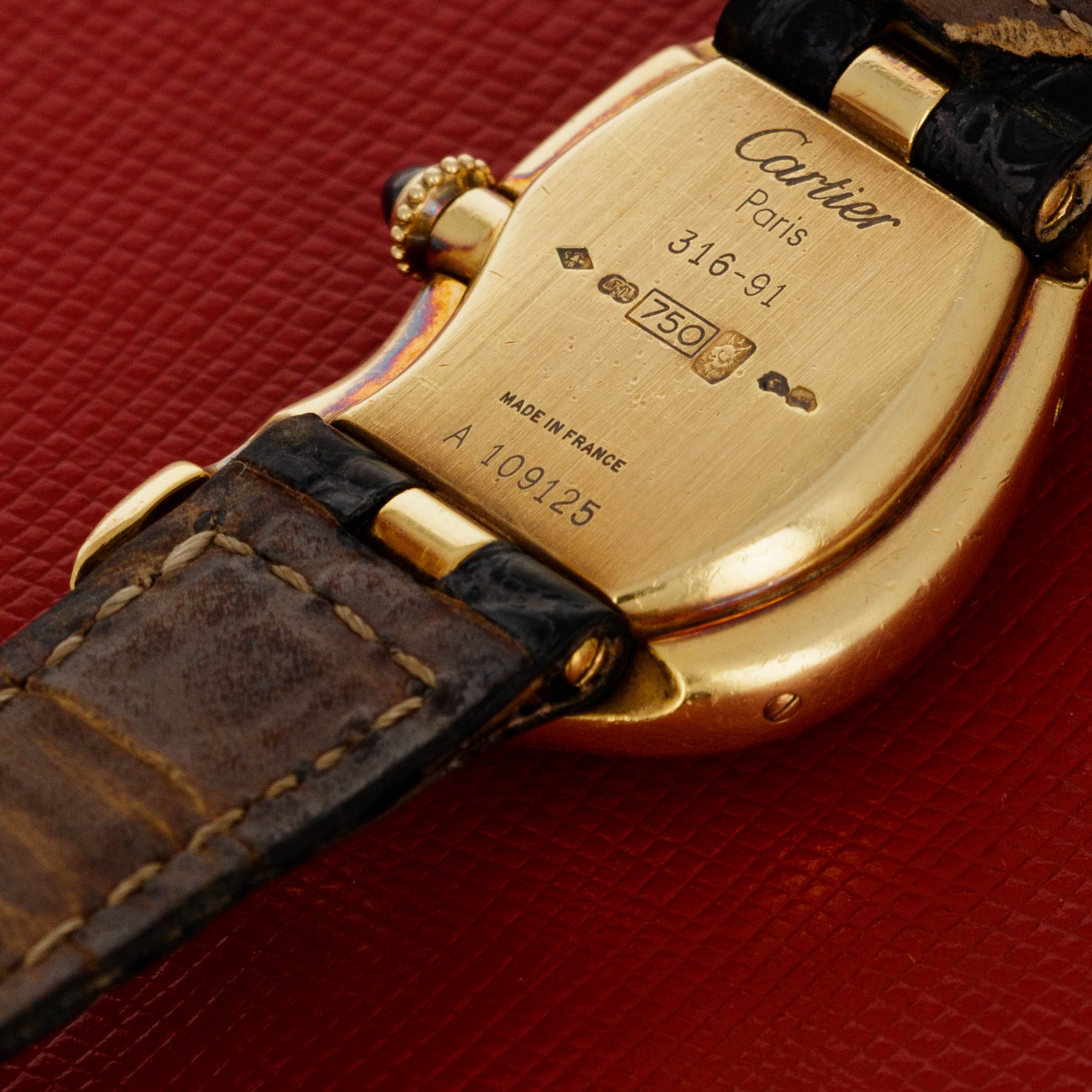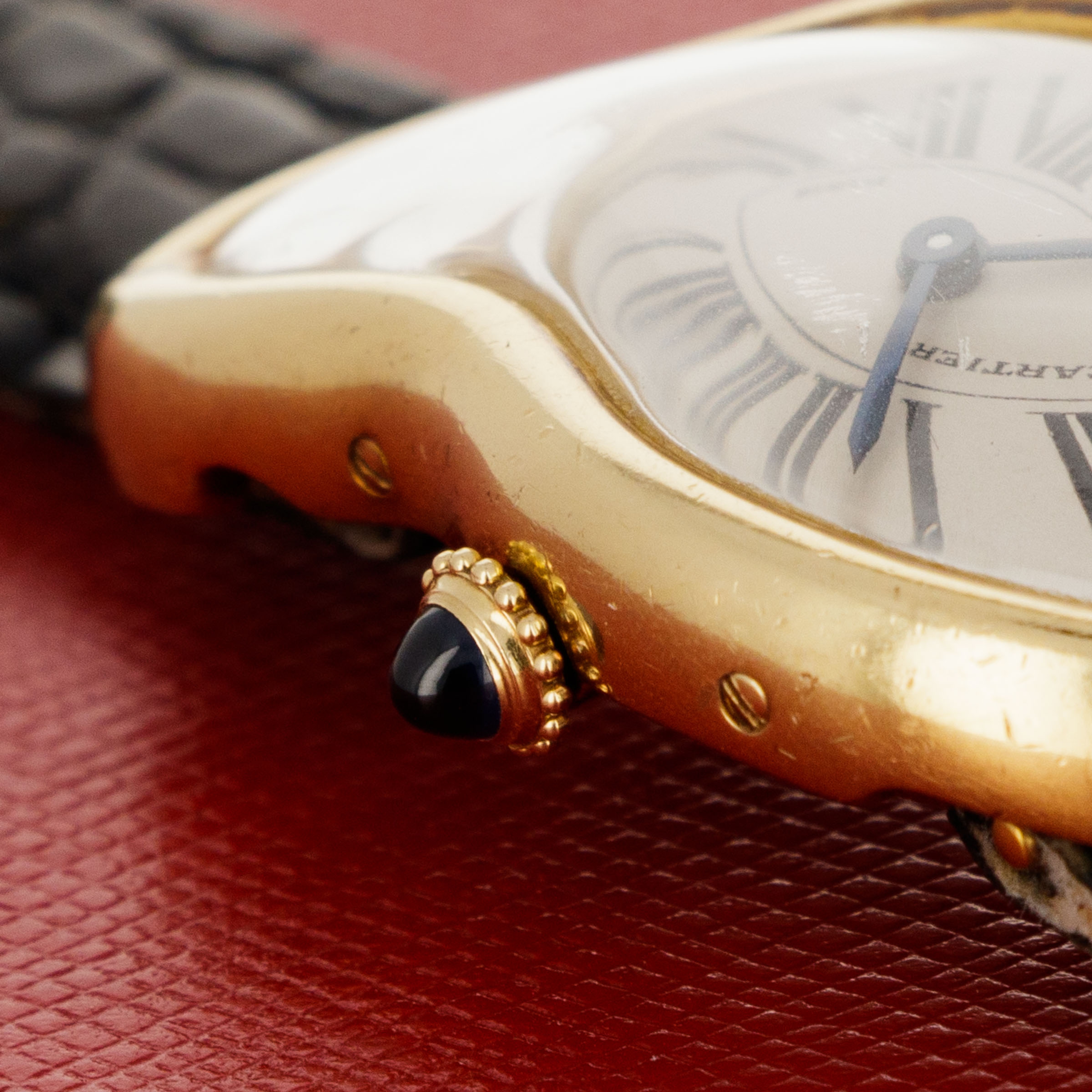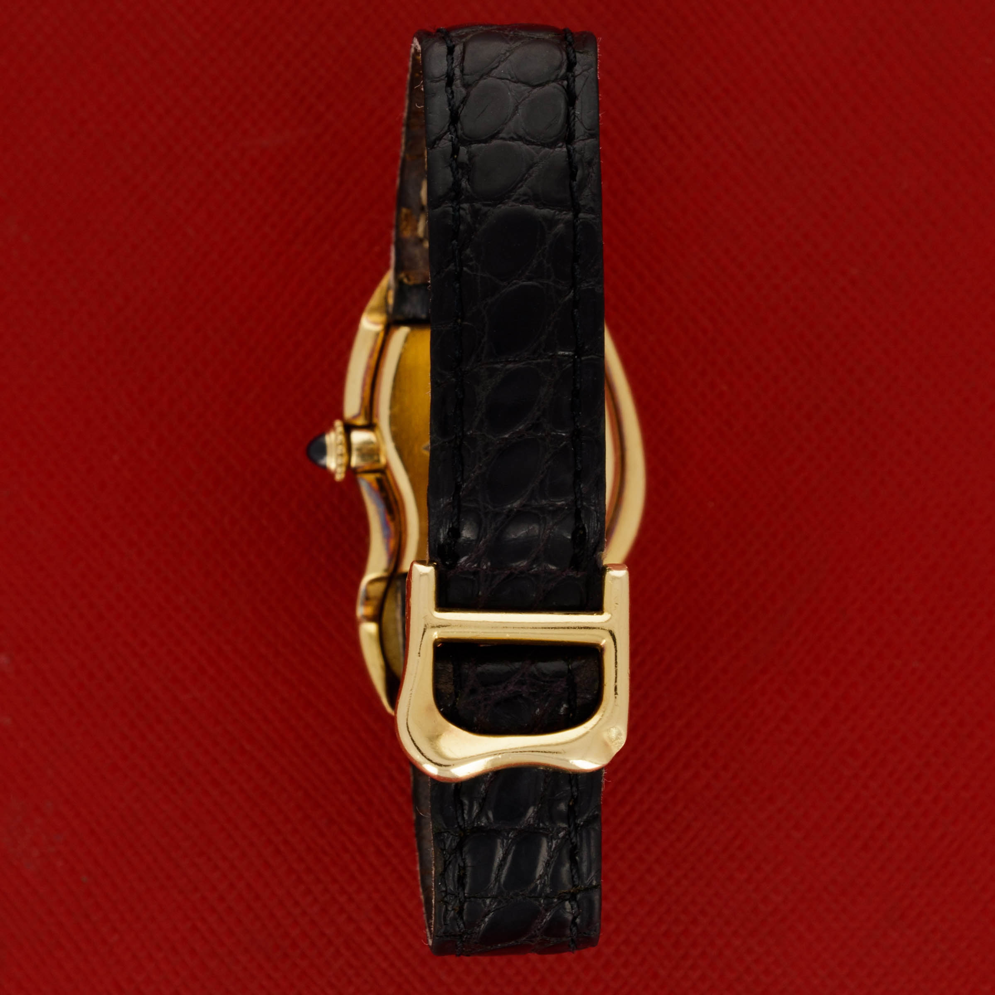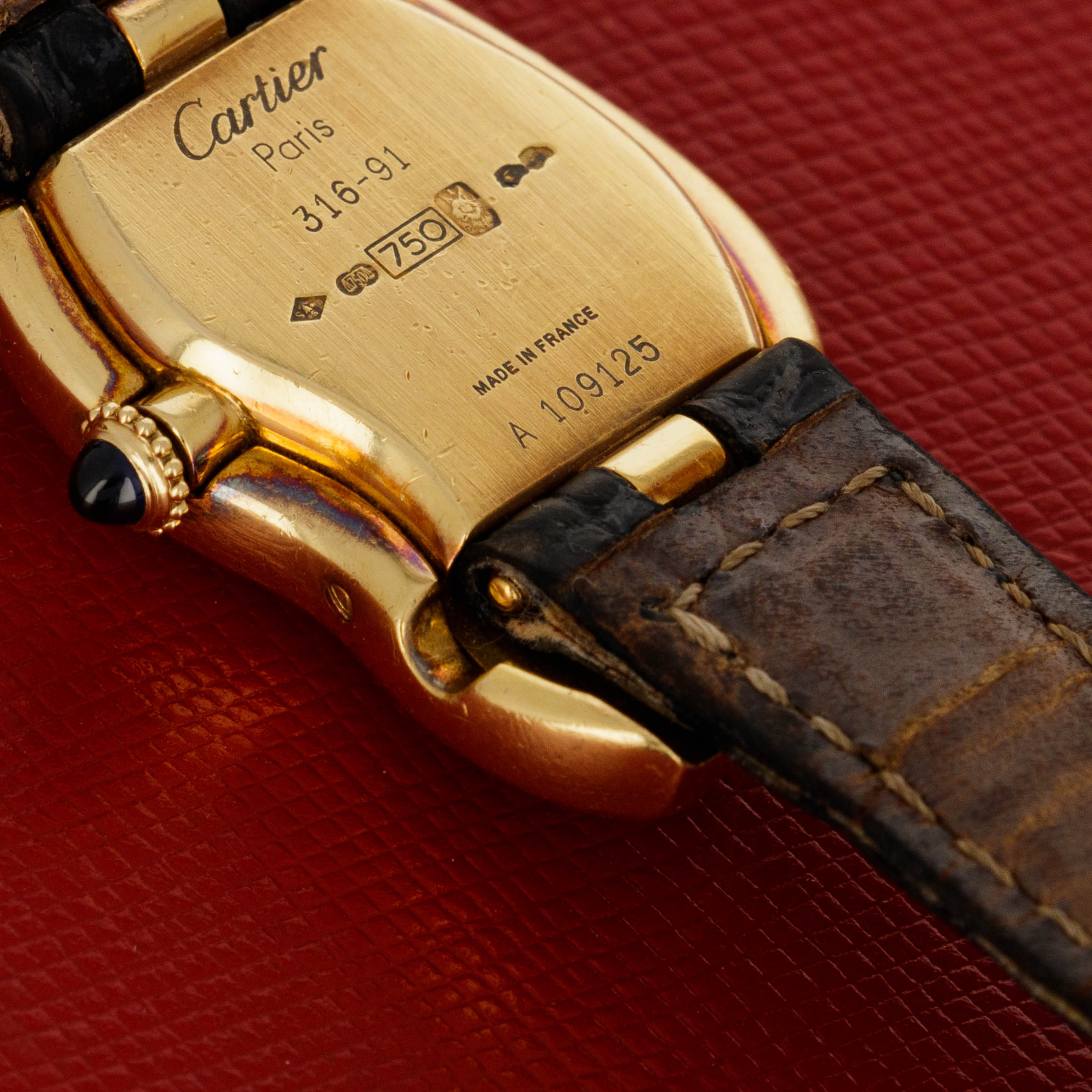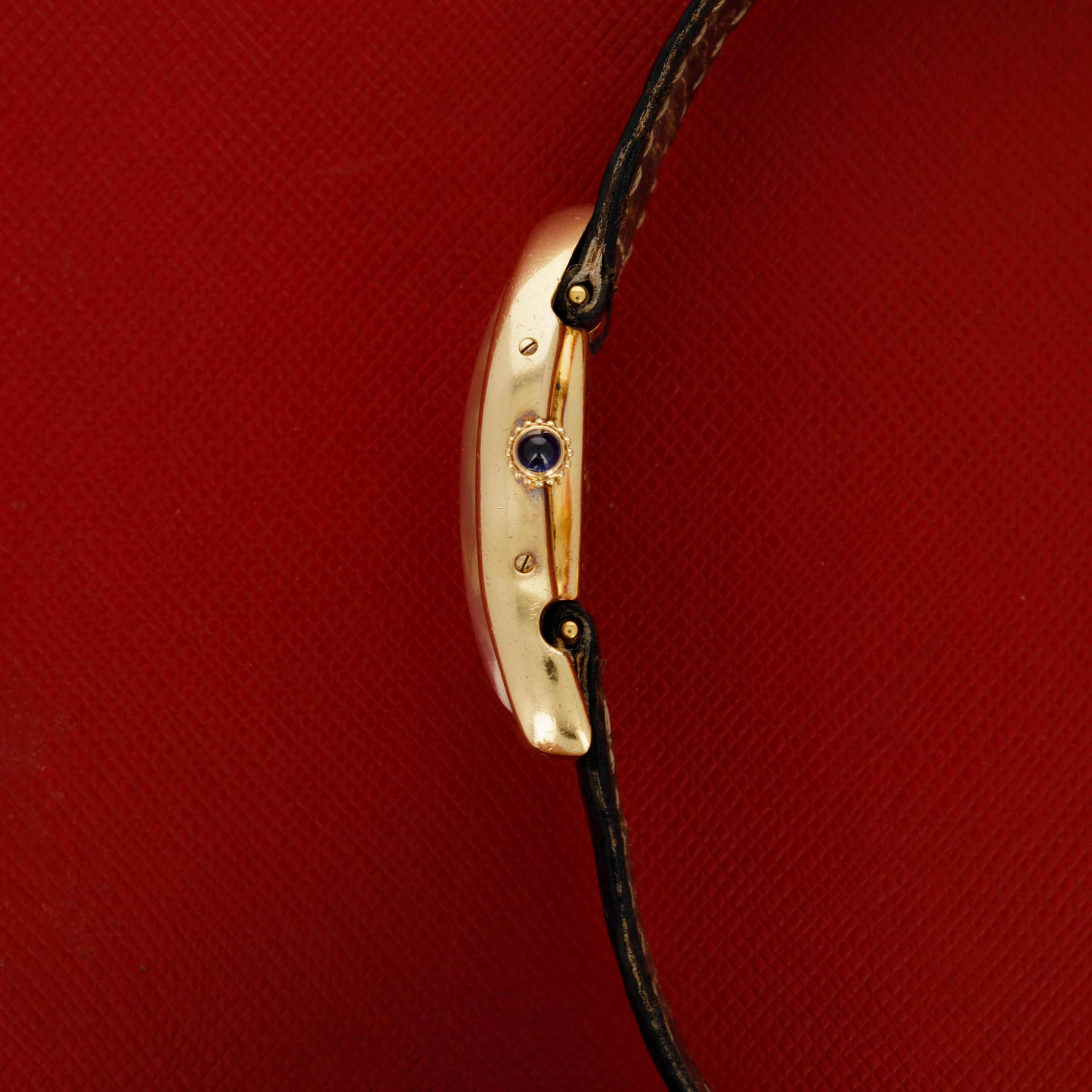The Cartier Crash is a legendary timepiece with multiple spurious origin stories detailing things from fiery car crashes in central London to spontaneous inspiration following the arrival of a badly damaged watch brought in for service to Cartier’s London location. No matter its origin, the Cartier Crash is wrapped in mystique, and London is widely acknowledged as its spiritual, and literal, home due to its production being the brainchild of Jean-Jacques Cartier, the head of Cartier London at the time, and famed designer Rupert Emmerson. Jean-Jacques had decided in the mid-60s that it was time for Cartier London to create their own watches, and so Crash was born and first produced there. Designed by Cartier and Emmerson to reflect the surrealist design culture that was popular during the '60s, the Crash is entirely recognizable by its unconventional case shape reminiscent of Salvador Dali's melting clocks in his 1931 painting 'The Persistence of Memory' and its warped dial layout. The design was conceived as a Cartier Oval with "twisted ends". Constructed of 18kt yellow gold with Cartier's famed, and a collector favorite, Paris-signed Cartier dial in white featuring black exploded Roman numerals and blued steel hands, this timepiece is a beautiful example of the Crash in all of its wonderful glory. Produced in 1991, this example was part of the limited edition run of 400 pieces that Cartier's Paris boutique released in that same year and is individually numbered 316 on its caseback.