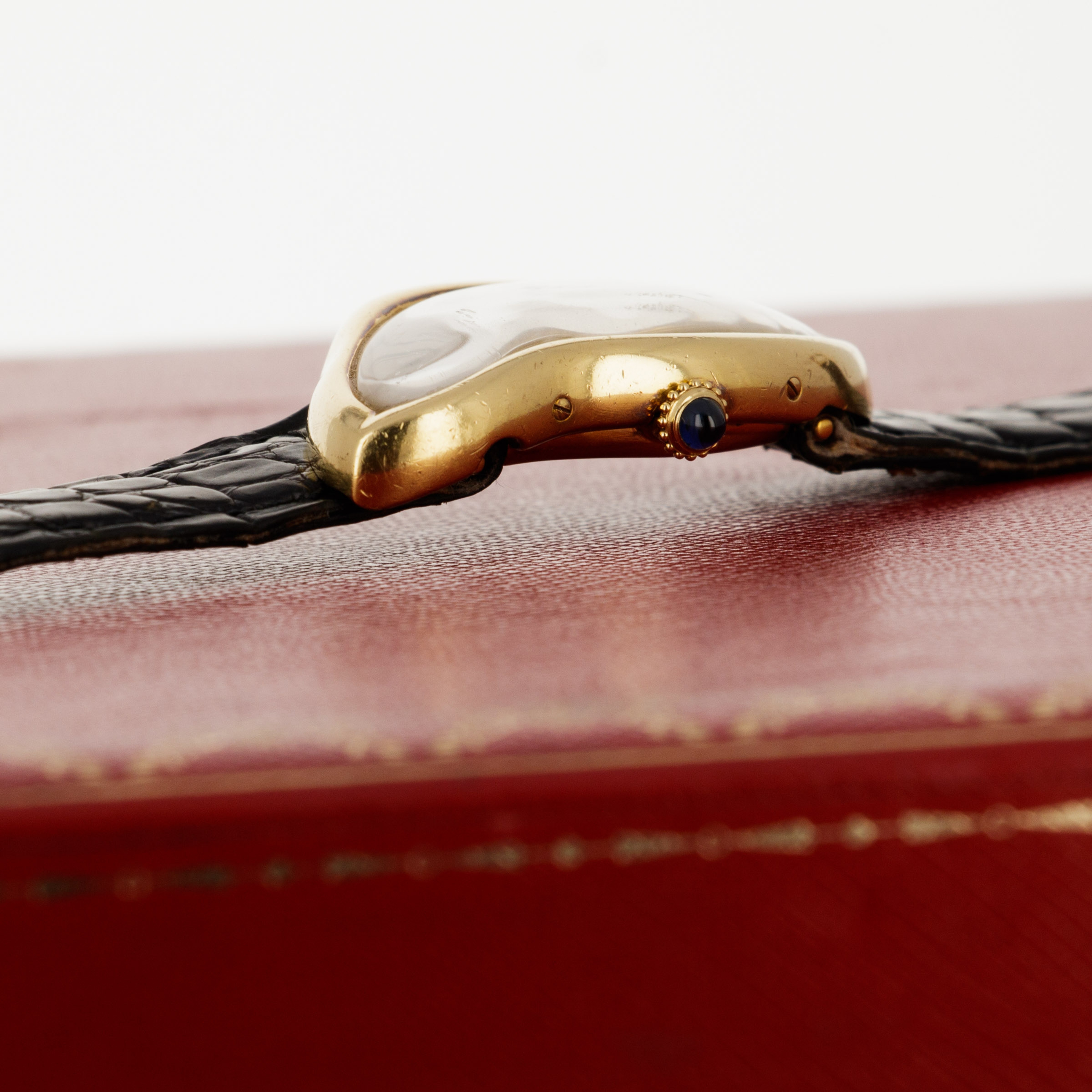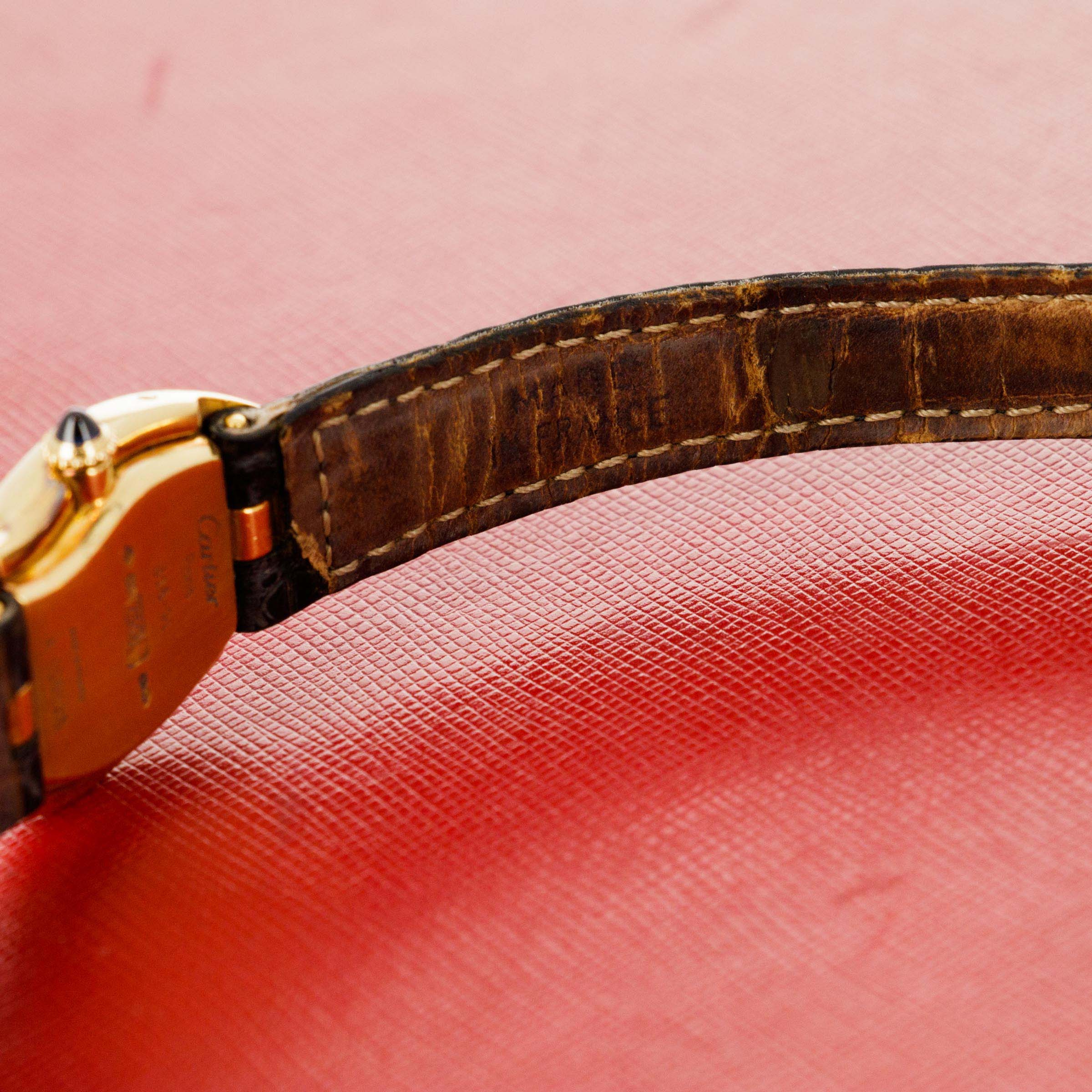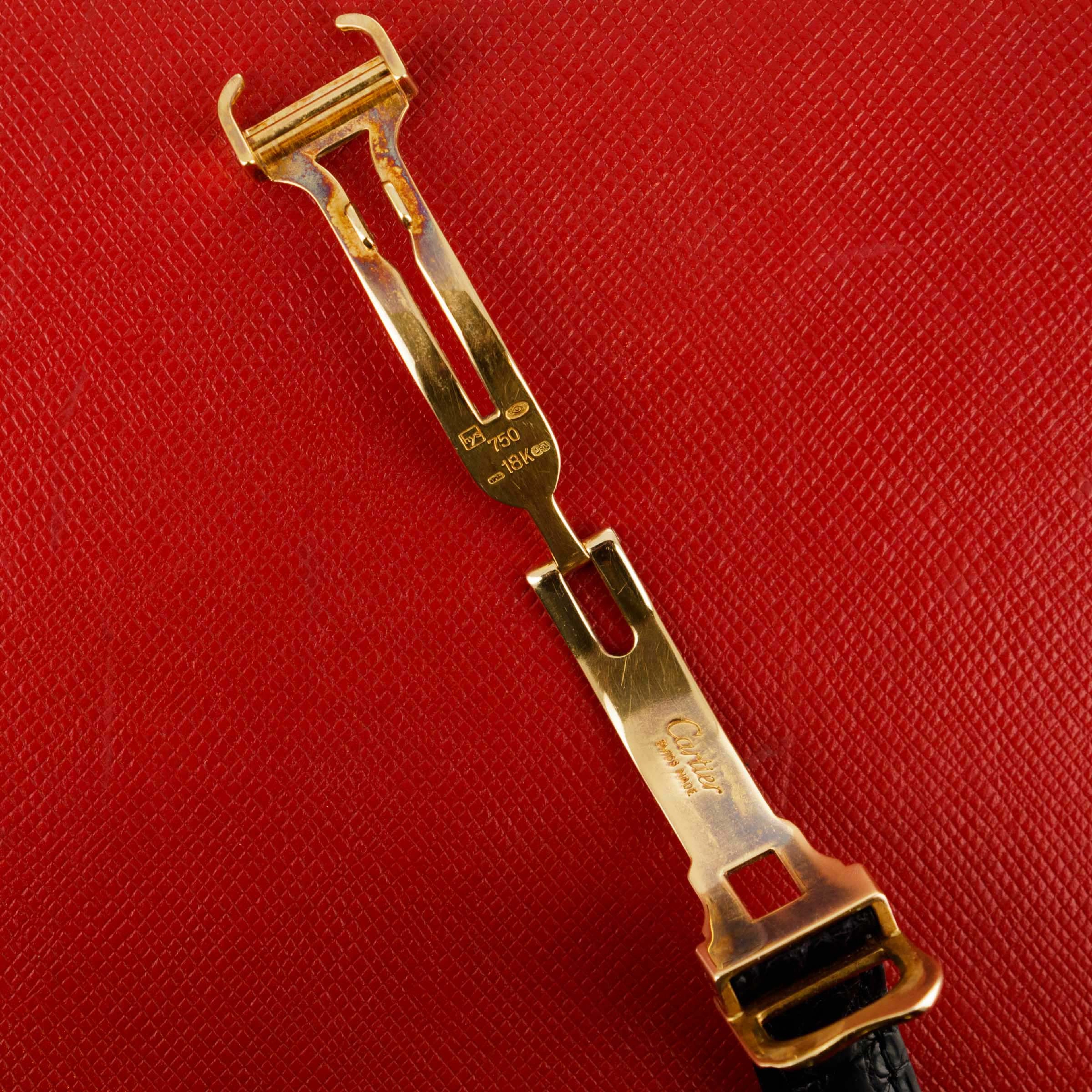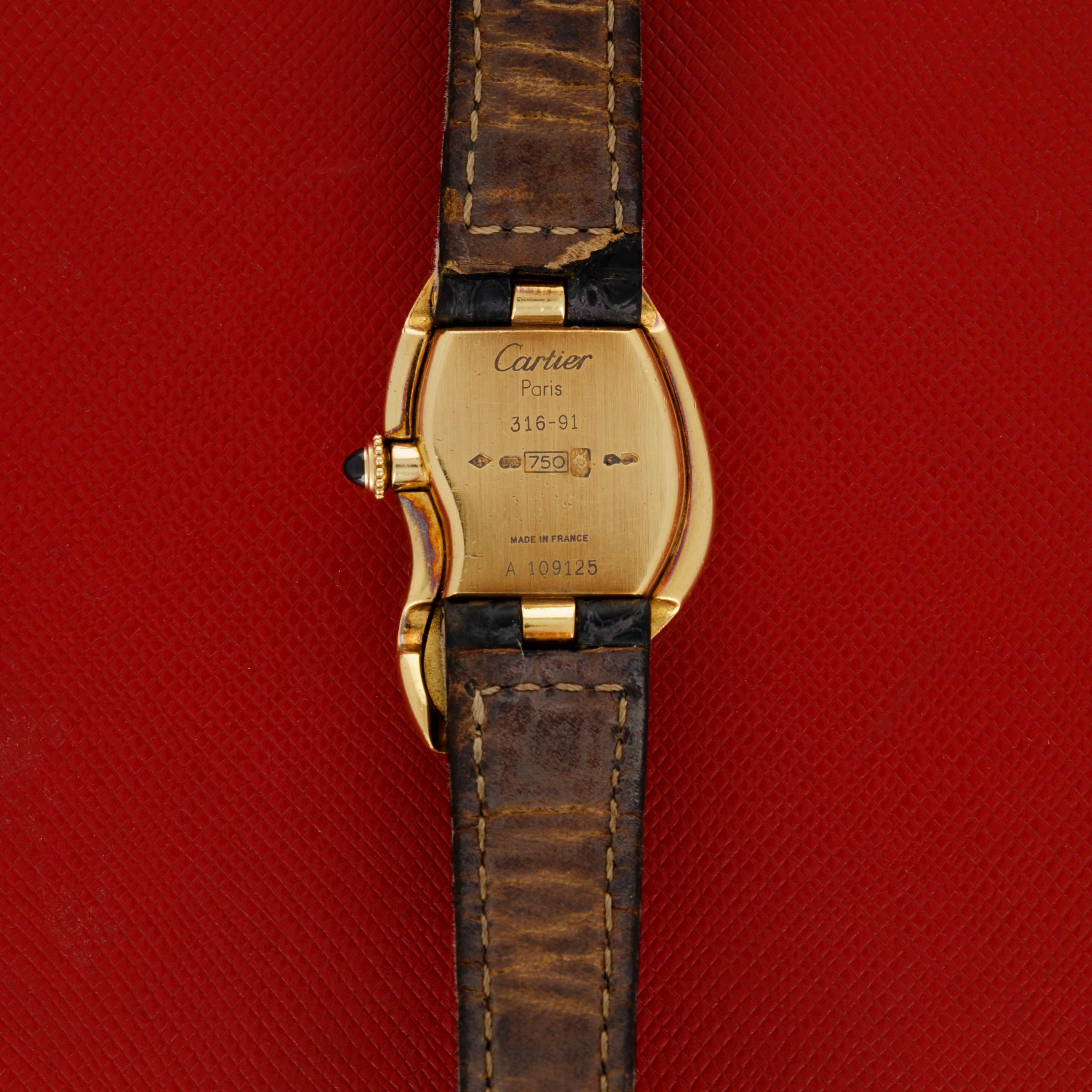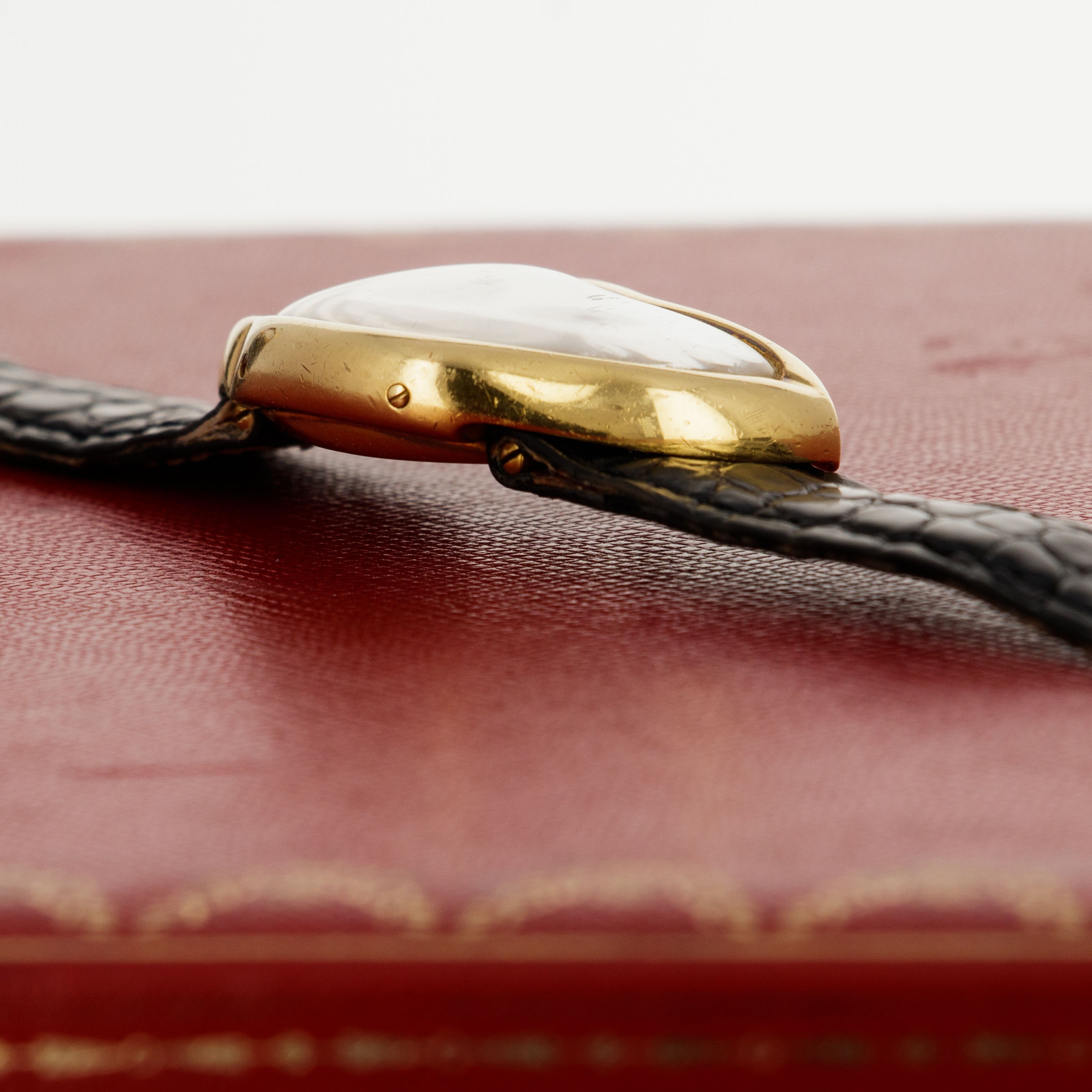 The Cartier Crash is a legendary timepiece with multiple spurious origin stories detailing things from fiery car crashes in central London to spontaneous inspiration following the arrival of a badly damaged watch brought in for service to Cartier’s London location. No matter its origin, the Cartier Crash is wrapped in mystique, and London is widely acknowledged as its spiritual, and literal, home due to its production being the brainchild of Jean-Jacques Cartier, the head of Cartier London at the time, and famed designer Rupert Emmerson. Jean-Jacques had decided in the mid-60s that it was time for Cartier London to create their own watches, and so Crash was born and first produced there. Designed by Cartier and Emmerson to reflect the surrealist design culture that was popular during the '60s, the Crash is entirely recognizable by its unconventional case shape reminiscent of Salvador Dali's melting clocks in his 1931 painting 'The Persistence of Memory' and its warped dial layout. The design was conceived as a Cartier Oval with "twisted ends". Constructed of 18kt yellow gold with Cartier's famed, and a collector favorite, Paris-signed Cartier dial in white featuring black exploded Roman numerals and blued steel hands, this timepiece is a beautiful example of the Crash in all of its wonderful glory. Produced in 1991, this example was part of the limited edition run of 400 pieces that Cartier's Paris boutique released in that same year and is individually numbered 316 on its caseback.