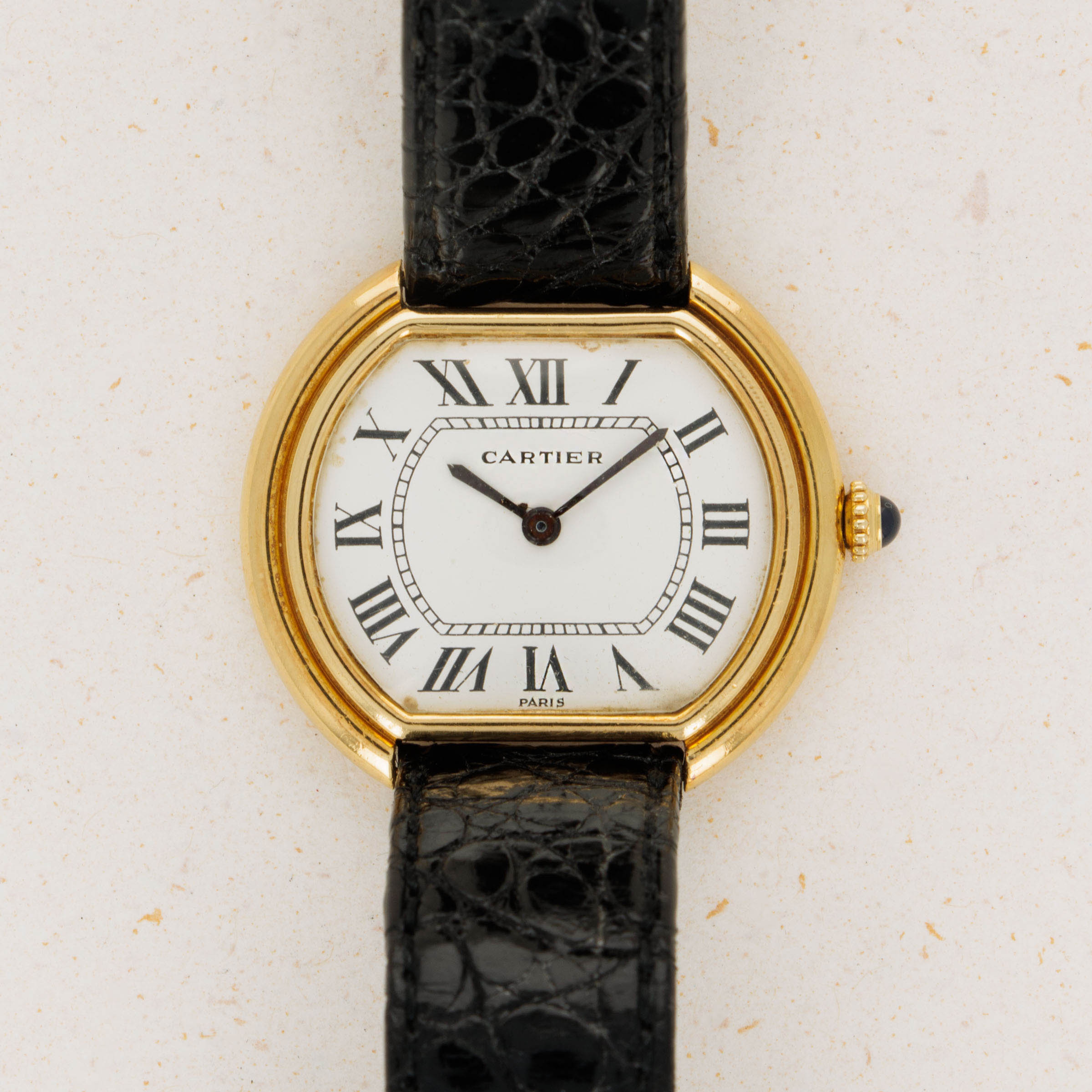 Featuring all of Cartier's core design tenets, the Ellipse boasts a bright white dial with black Roman numerals and a railroad minute track alongside Cartier's sought-after "Paris" inscription at 6 o'clock.