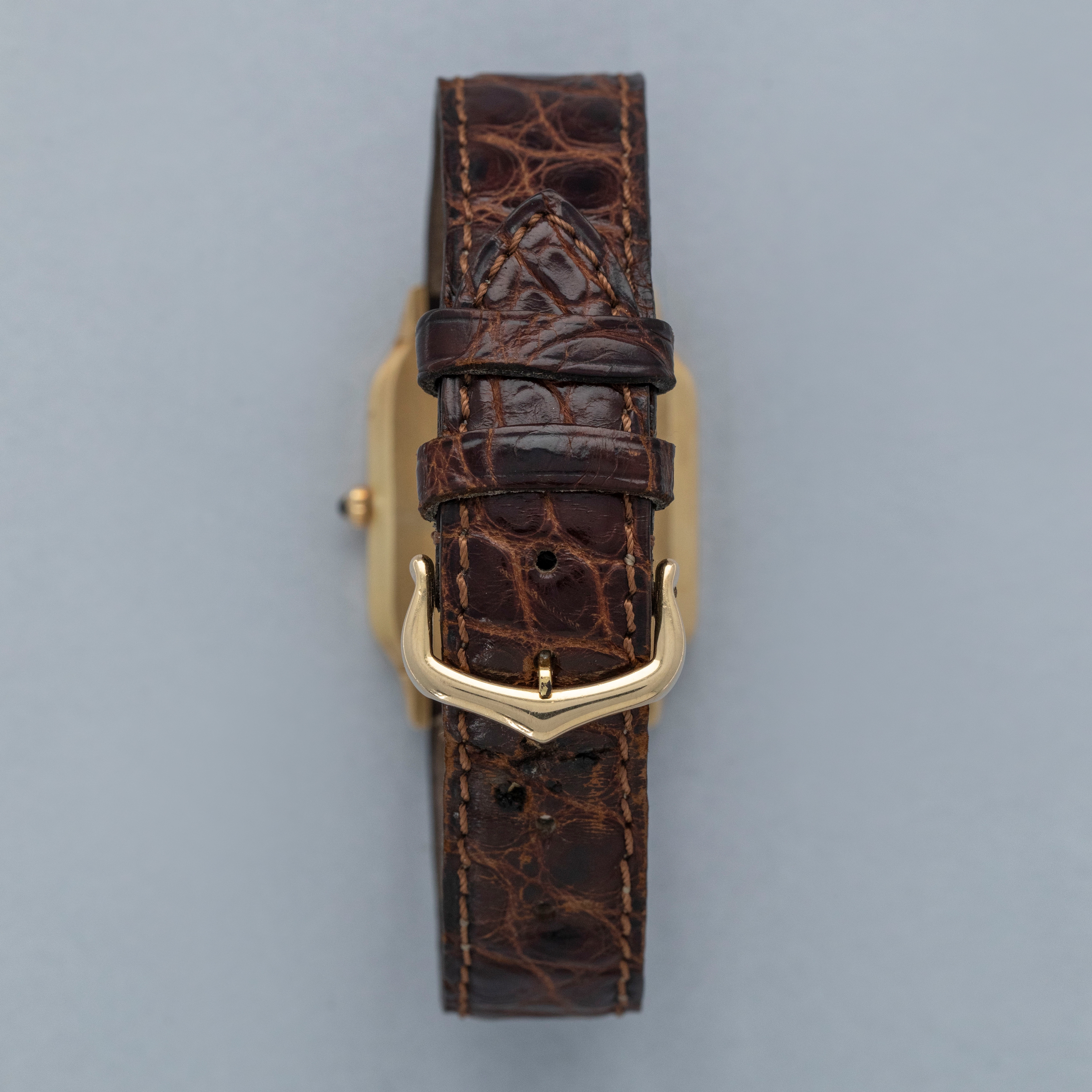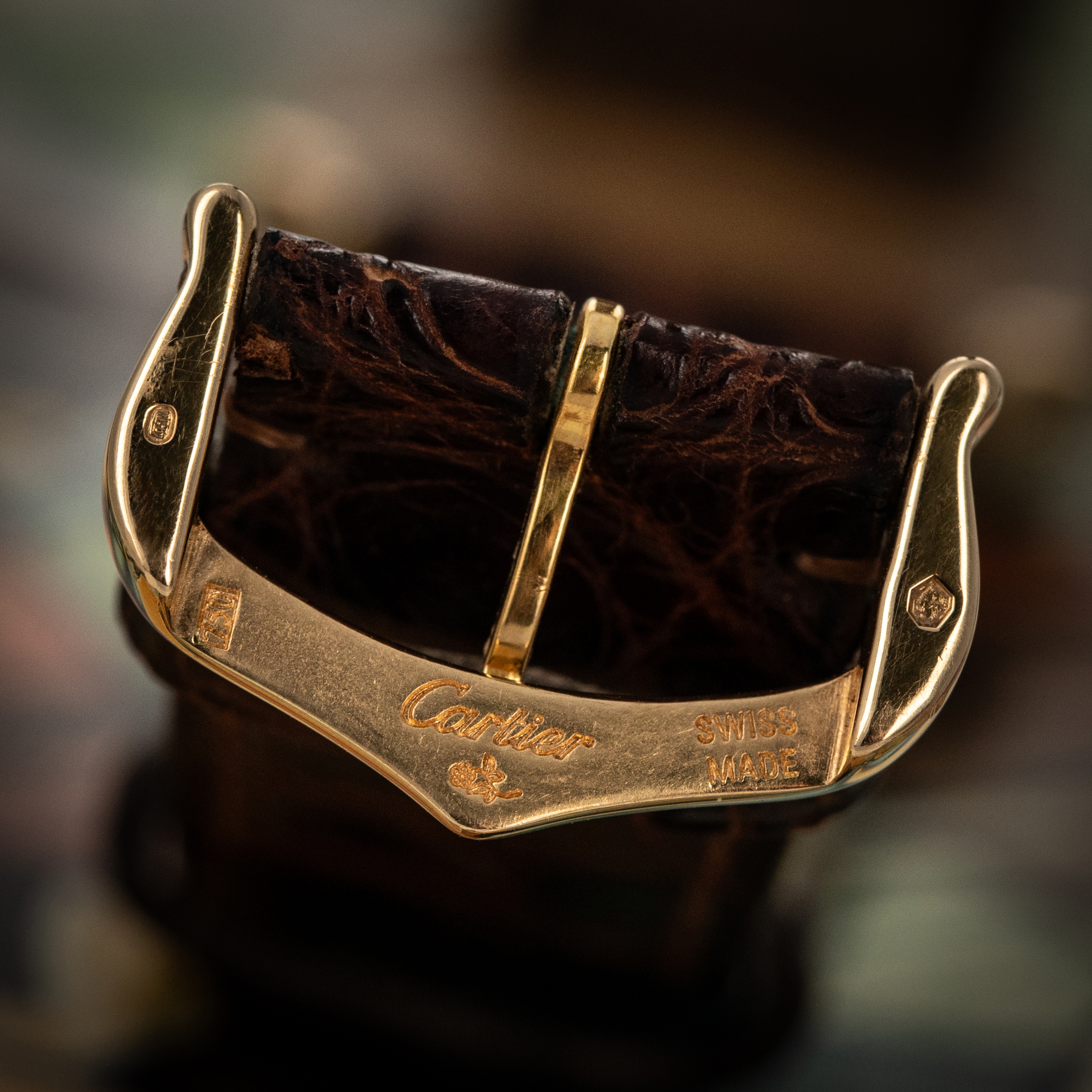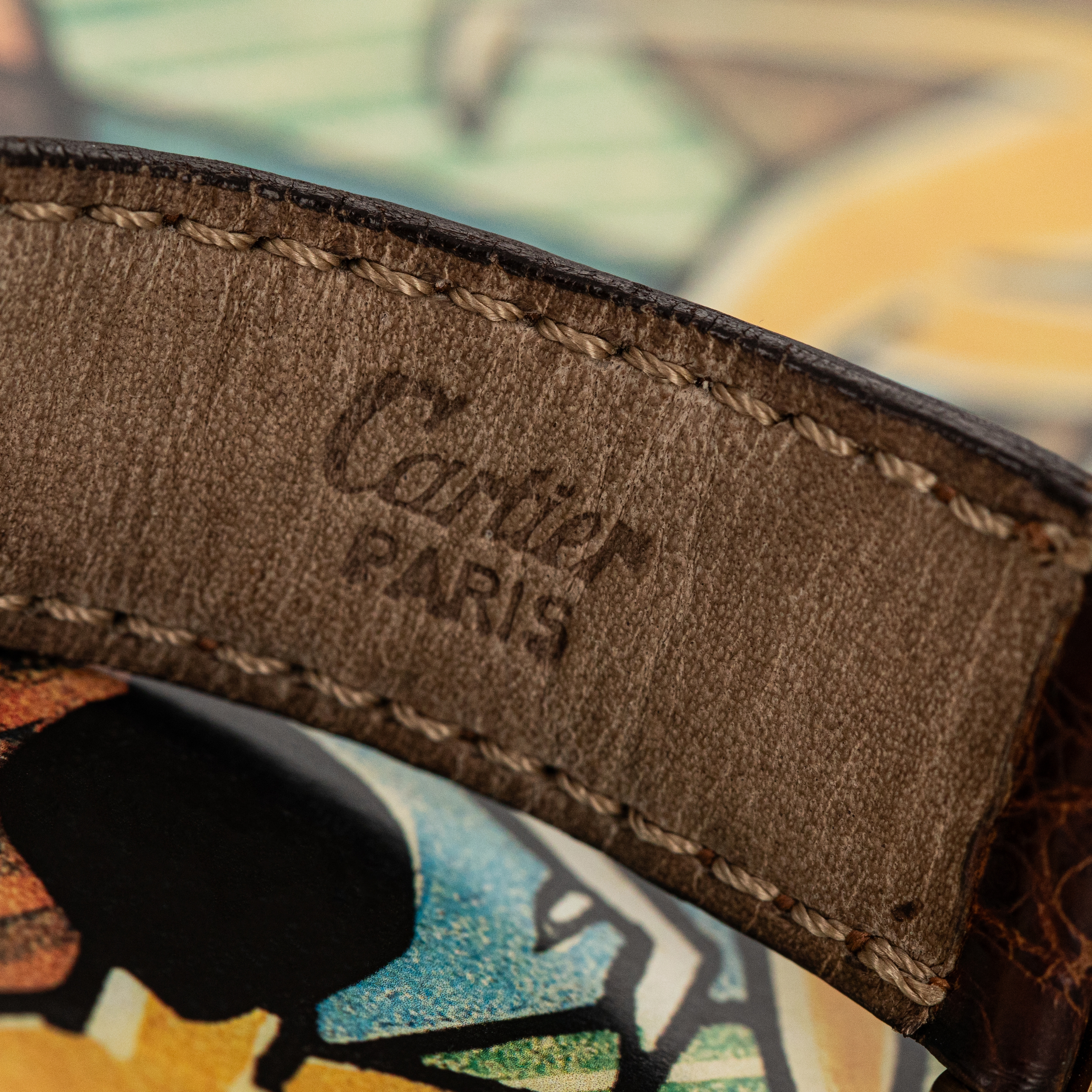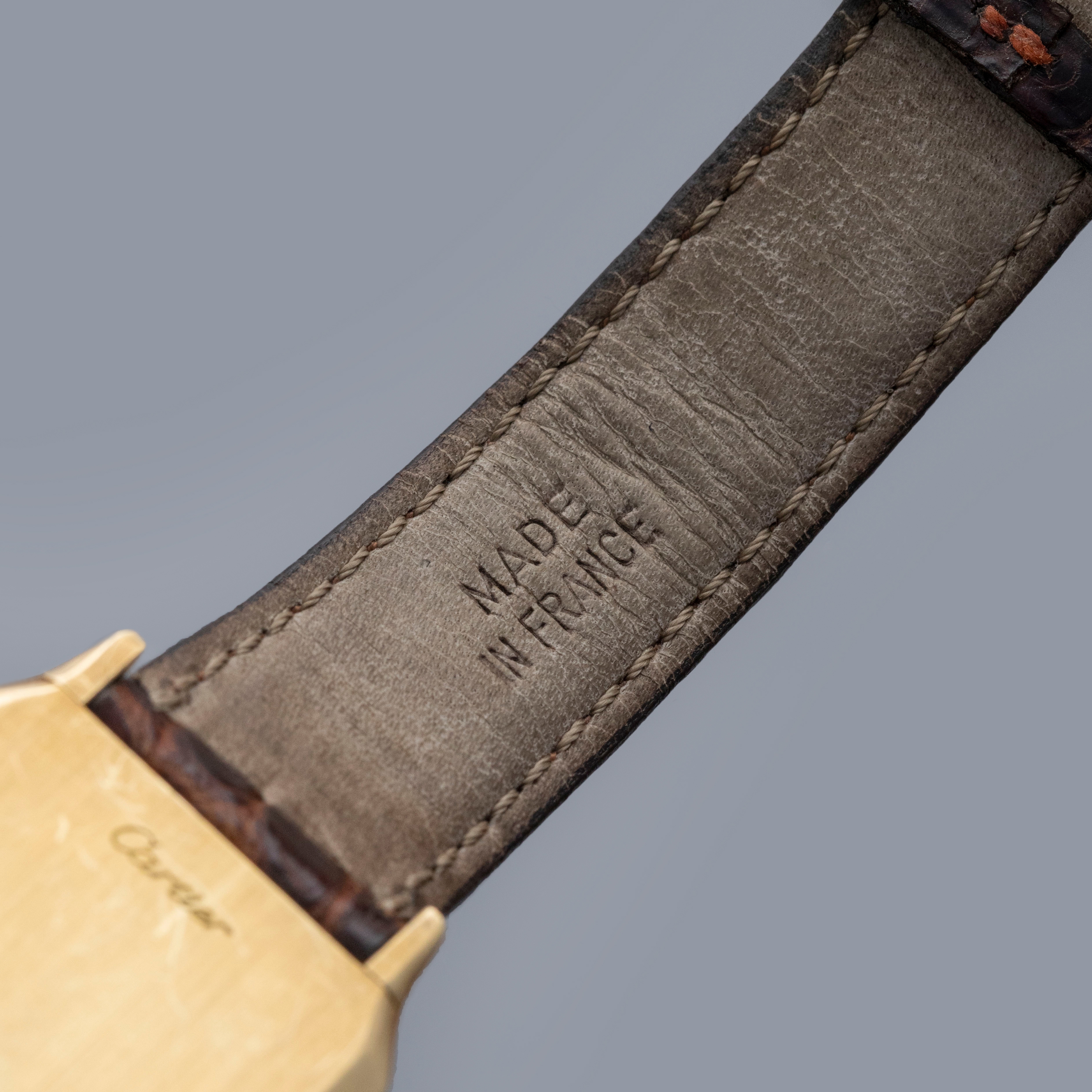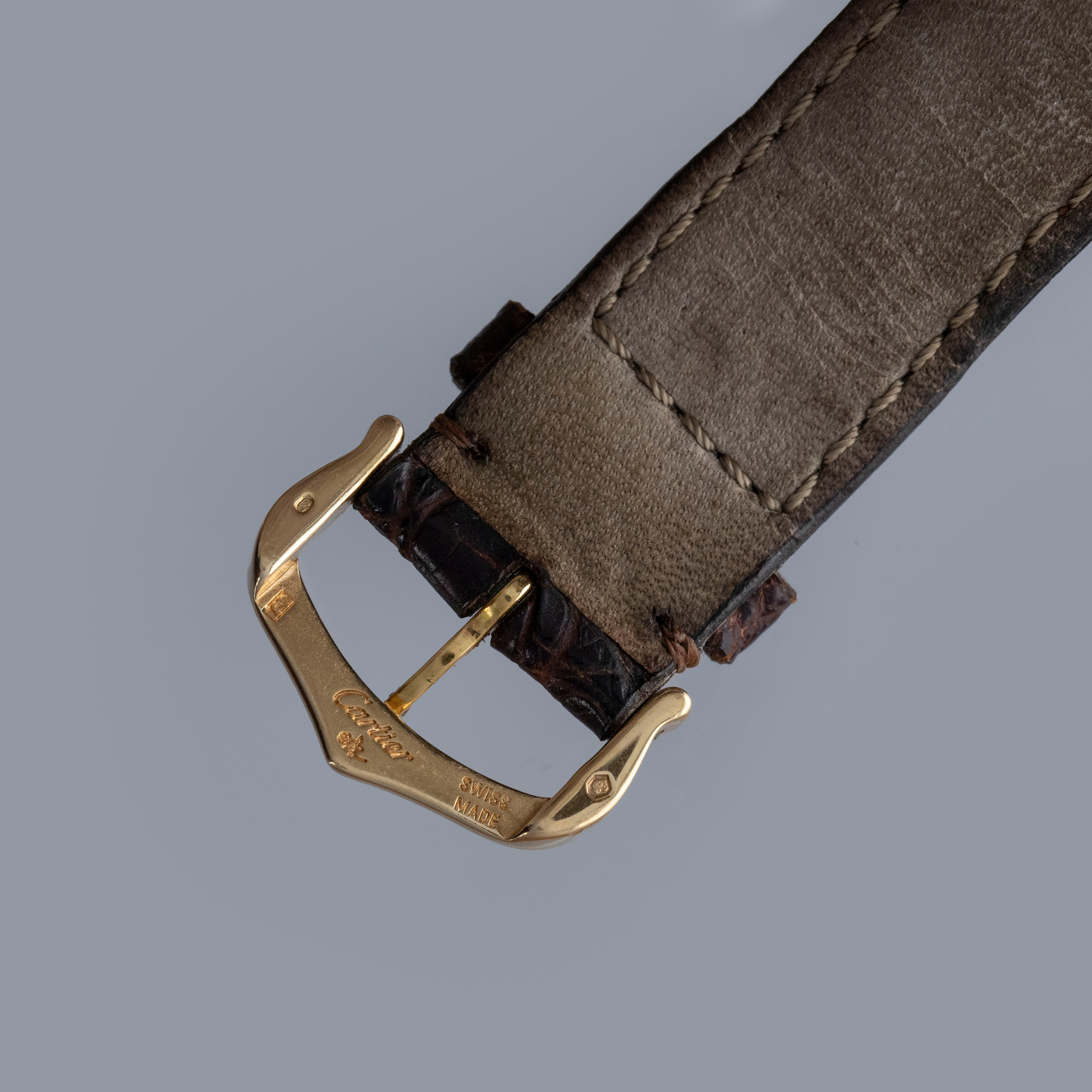 The watch is in overall excellent condition. The yellow gold case has a number of scratches and nicks, particularly on the bezel edge and on the case side near the winding crown. The case back shows a number of scratches but retains well-defined engravings and hallmarks. The Paris signed dial has some crazing and discoloration to the finish, particularly around the edges and between nine and ten o’clock. The watch is fitted with a brown alligator Cartier strap and a yellow gold Cartier pin buckle in excellent condition. Please note that the watch ticks at time of cataloging, but timekeeping is poor and a service is recommended.