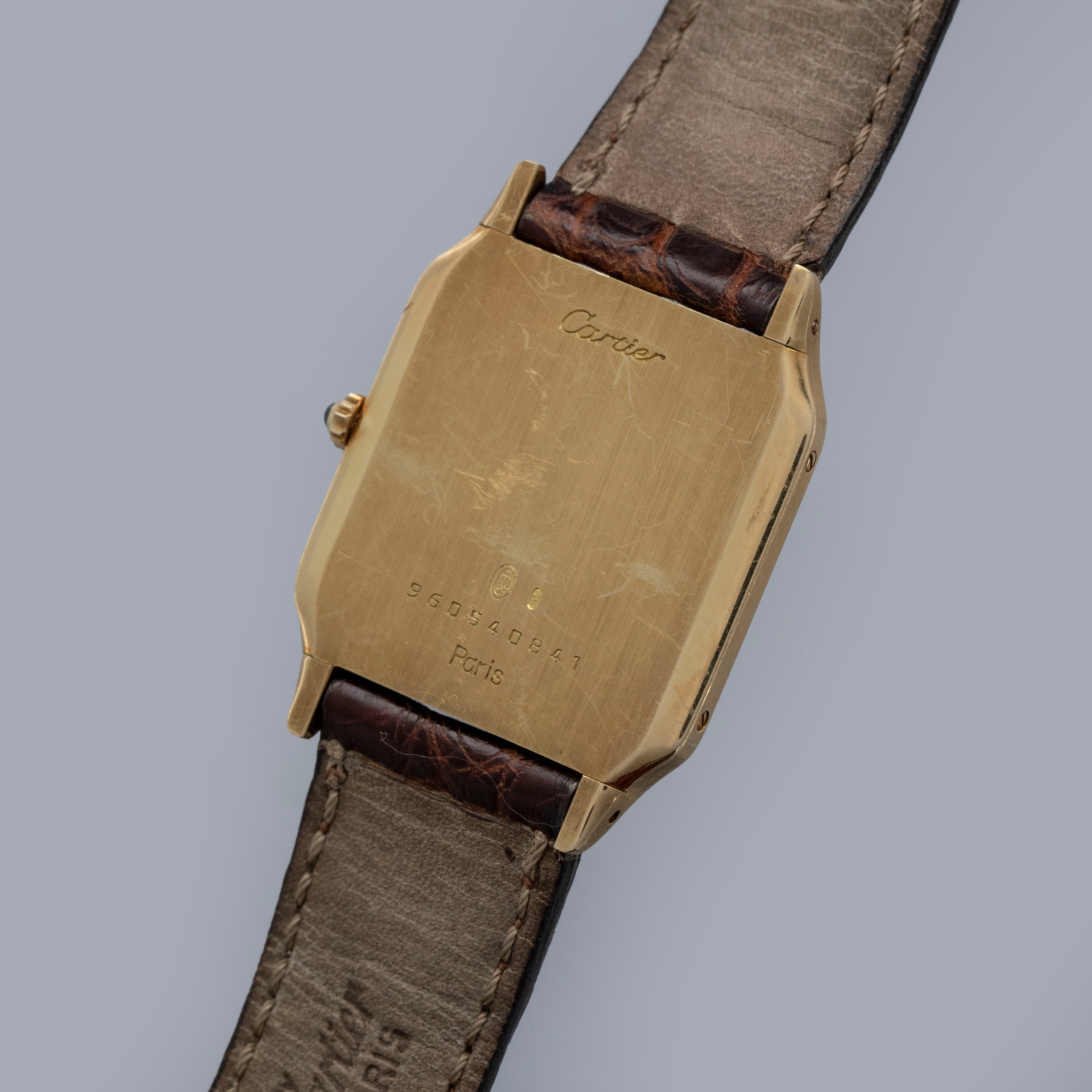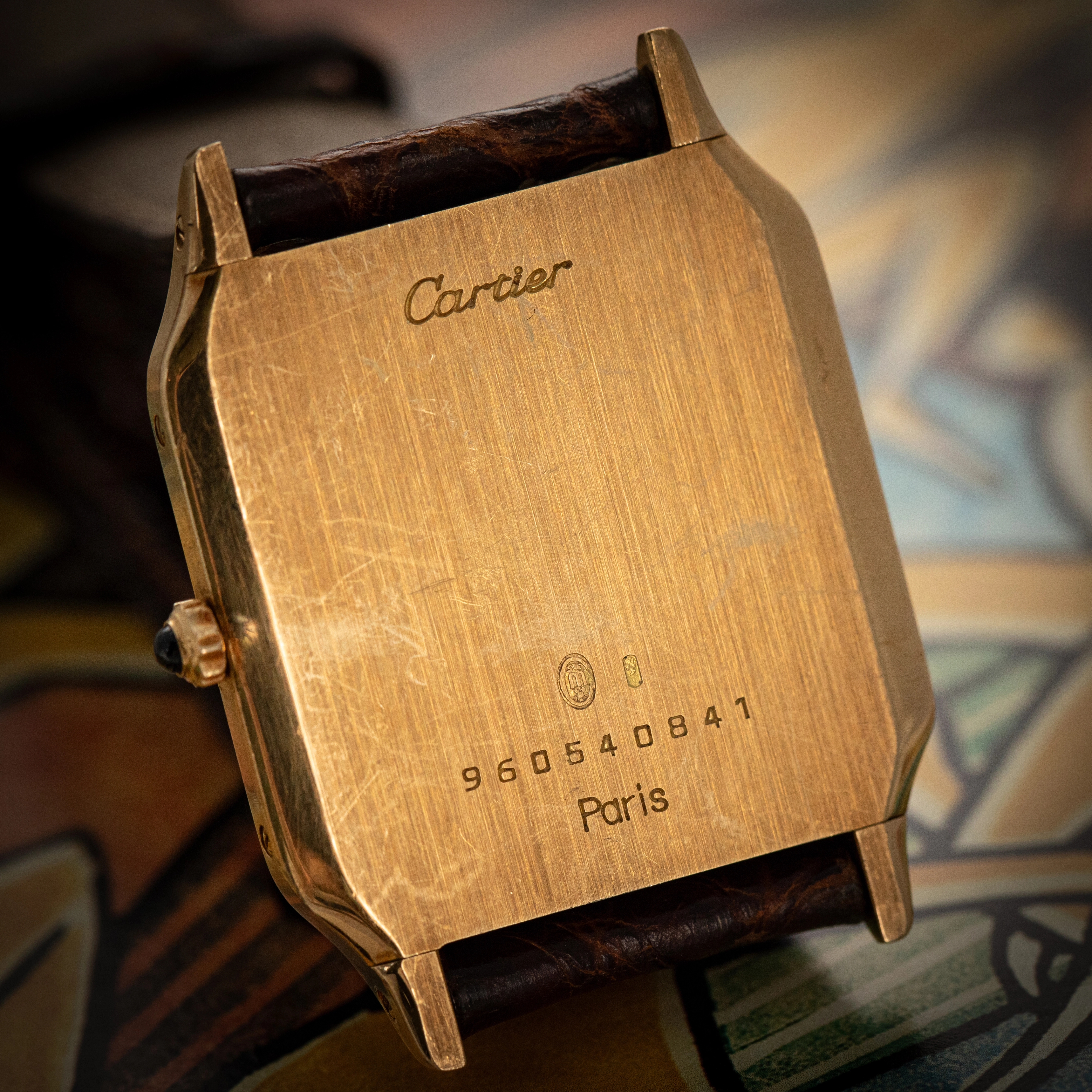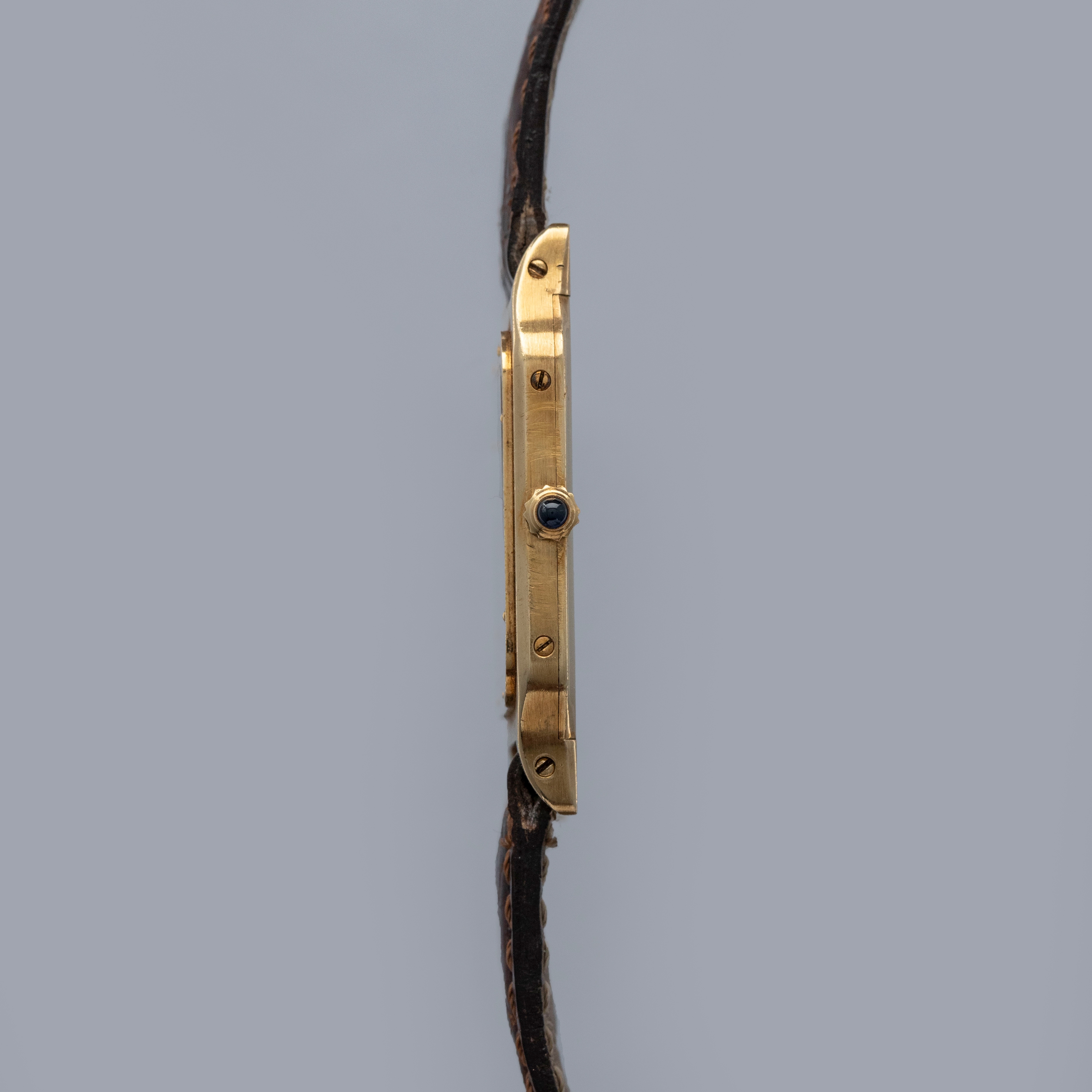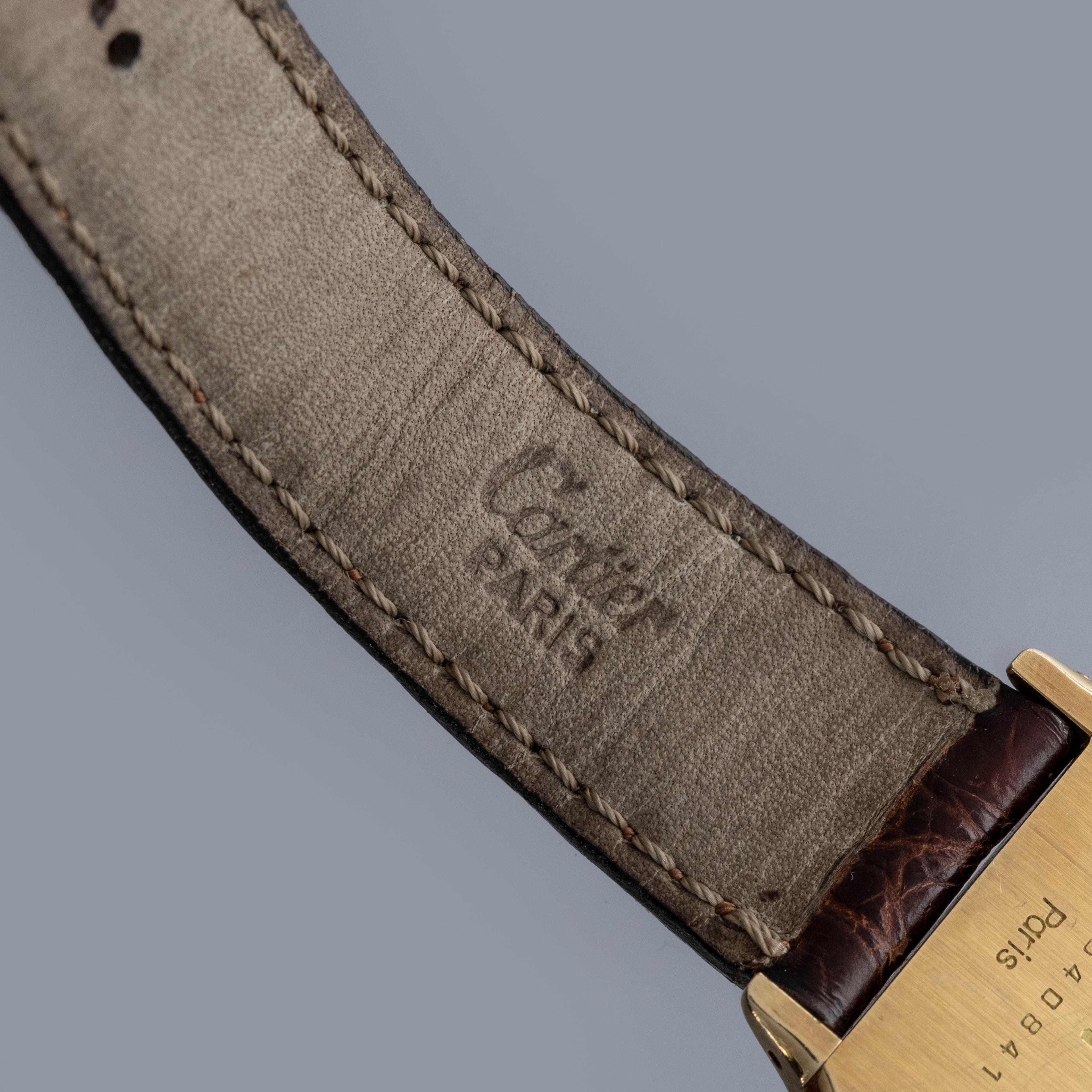 The watch is in overall excellent condition. The yellow gold case has a number of scratches and nicks, particularly on the bezel edge and on the case side near the winding crown. The case back shows a number of scratches but retains well-defined engravings and hallmarks. The Paris signed dial has some crazing and discoloration to the finish, particularly around the edges and between nine and ten o’clock. The watch is fitted with a brown alligator Cartier strap and a yellow gold Cartier pin buckle in excellent condition. Please note that the watch ticks at time of cataloging, but timekeeping is poor and a service is recommended.