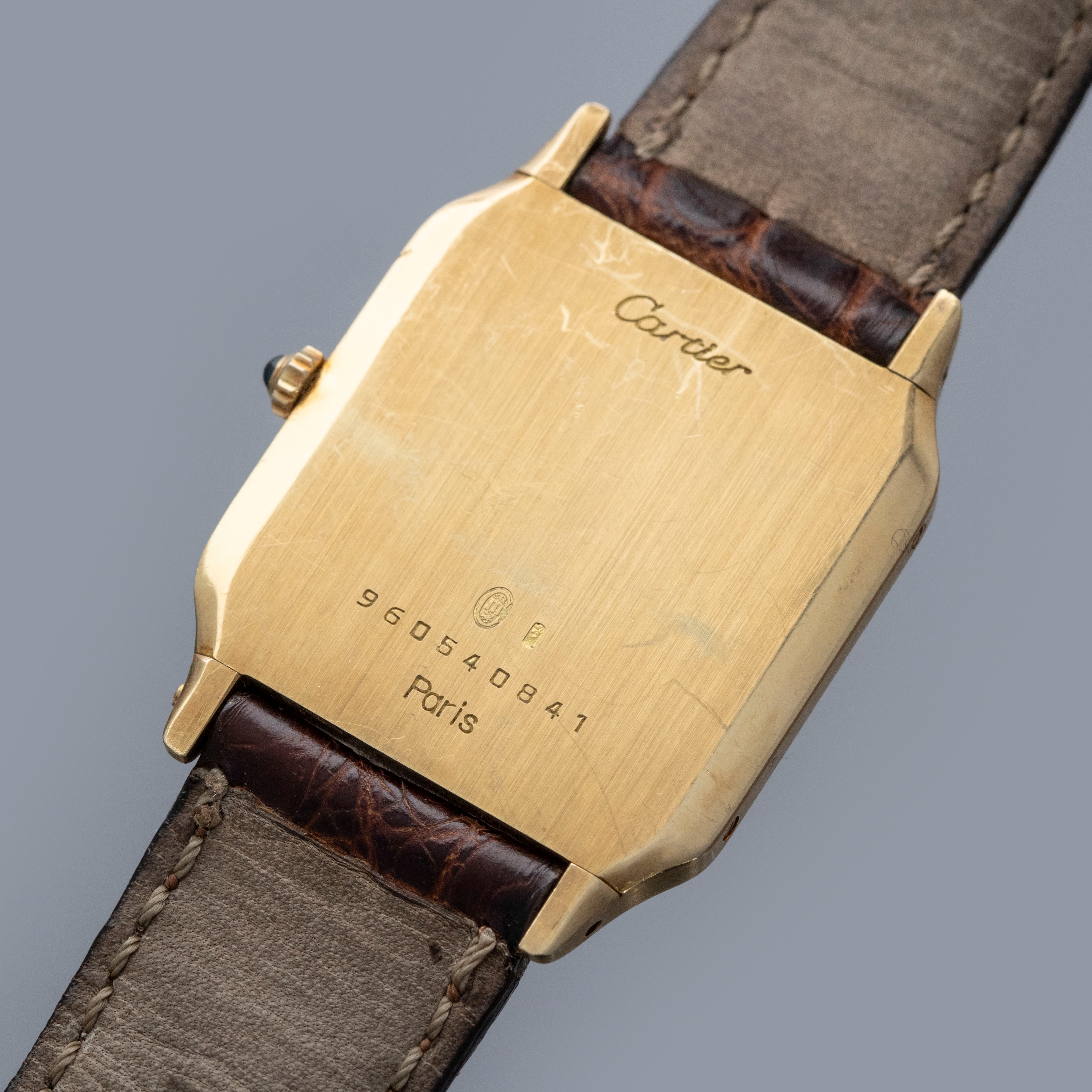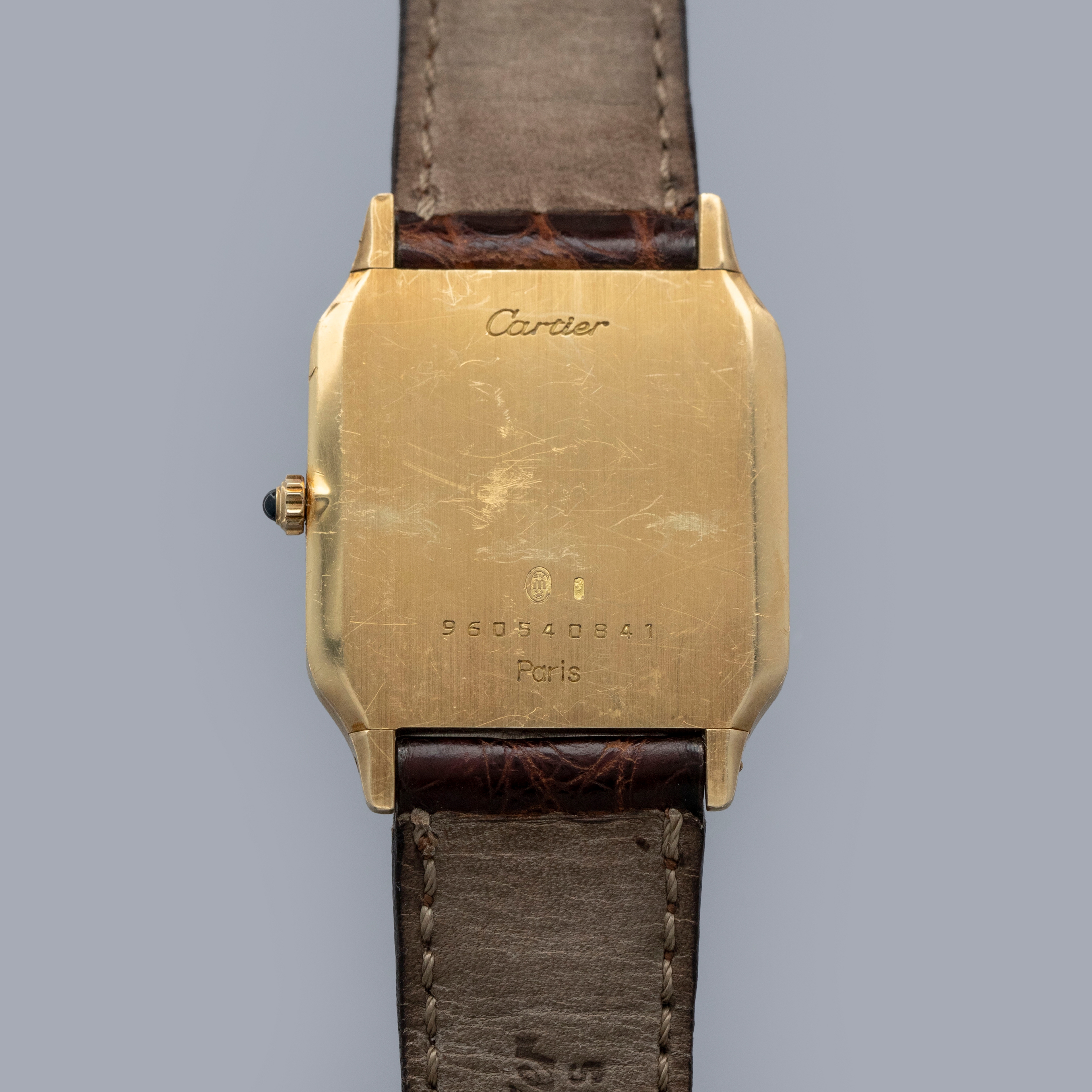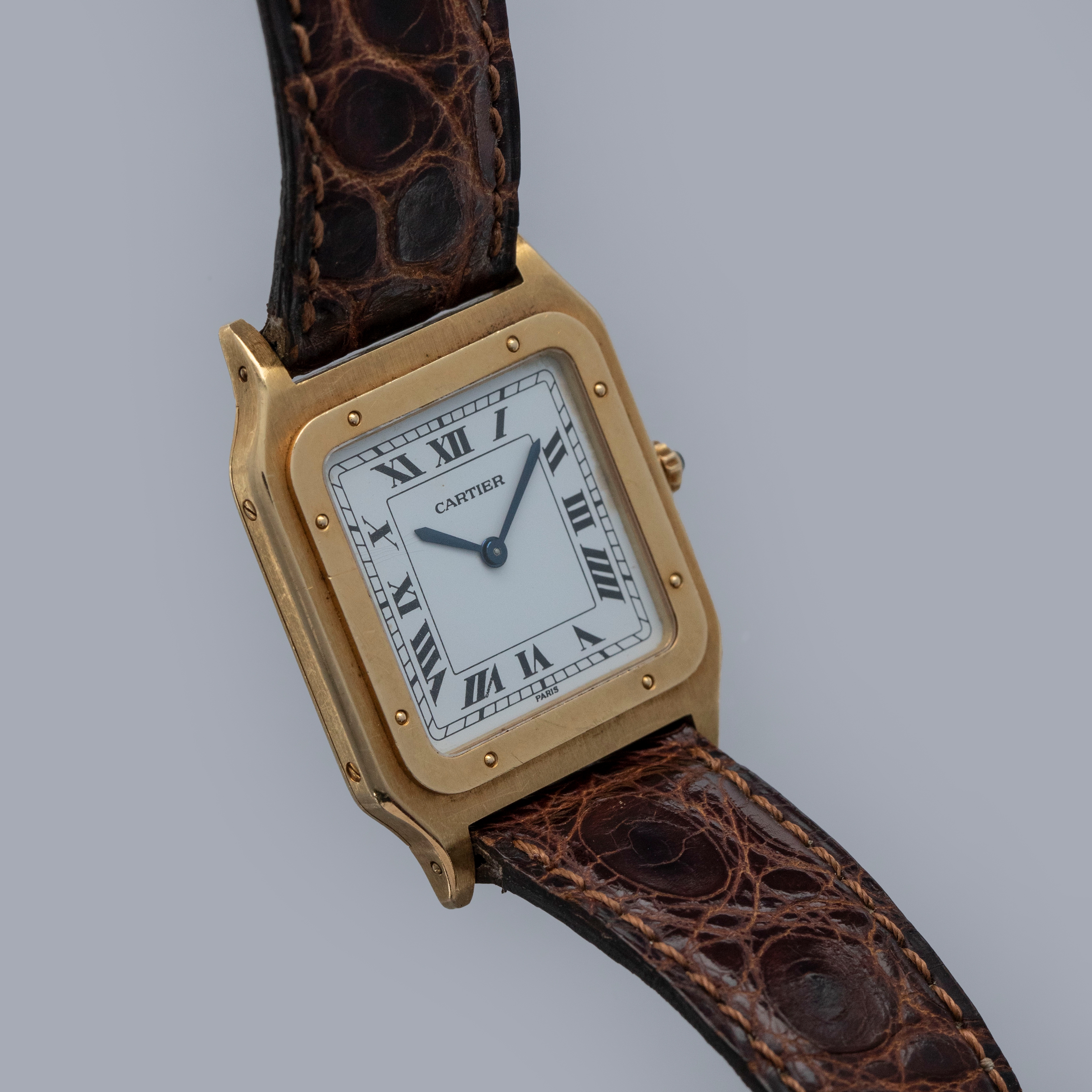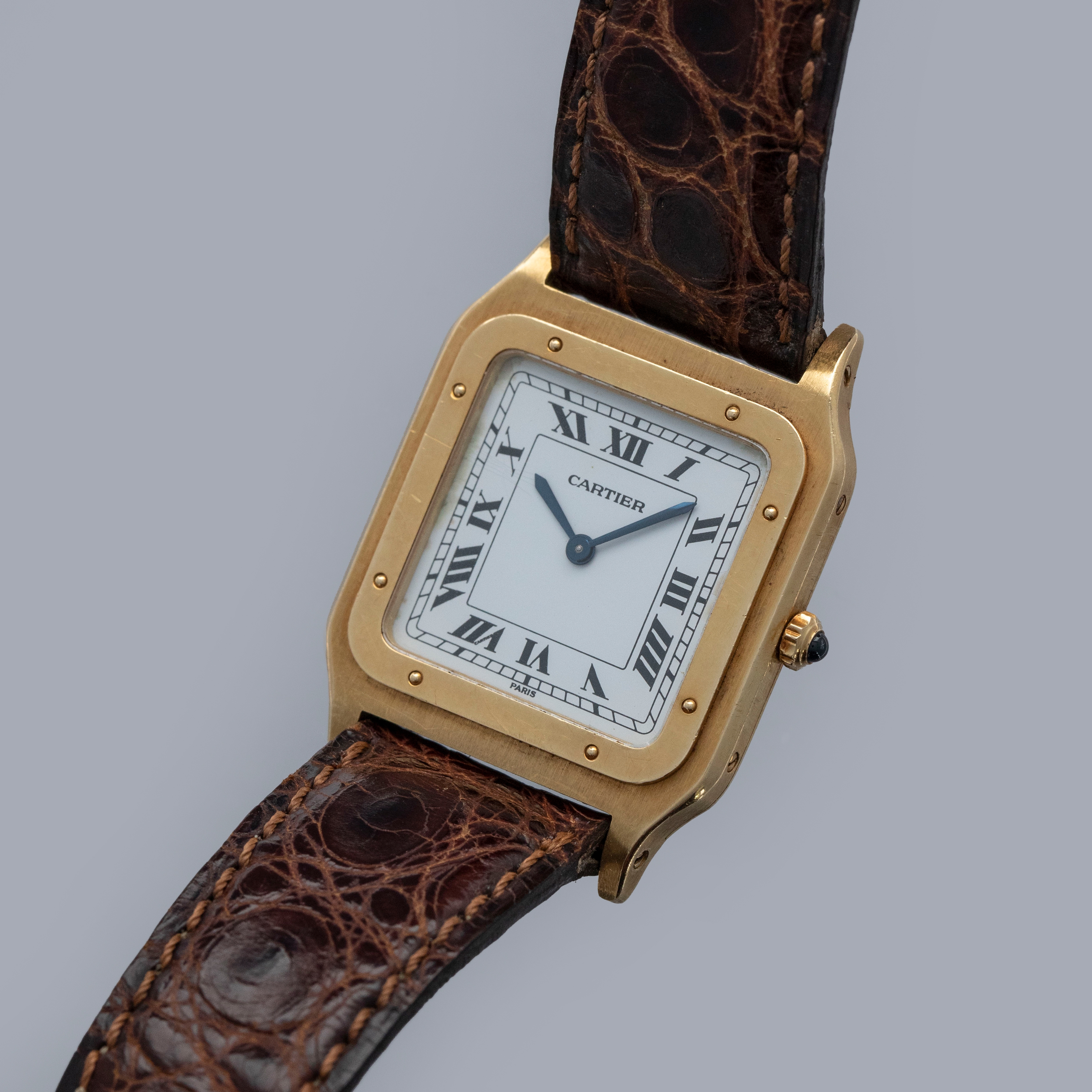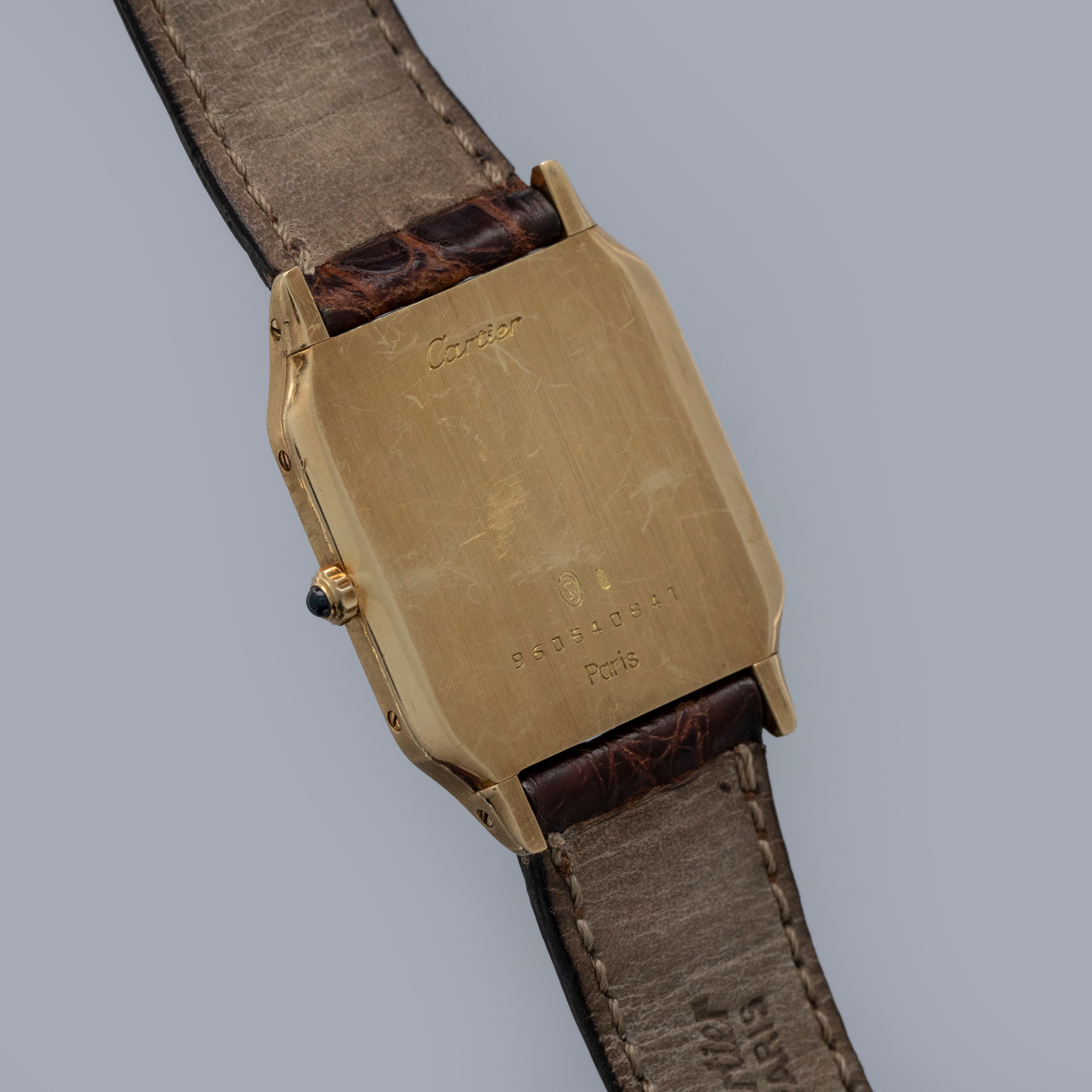 The watch is in overall excellent condition. The yellow gold case has a number of scratches and nicks, particularly on the bezel edge and on the case side near the winding crown. The case back shows a number of scratches but retains well-defined engravings and hallmarks. The Paris signed dial has some crazing and discoloration to the finish, particularly around the edges and between nine and ten o’clock. The watch is fitted with a brown alligator Cartier strap and a yellow gold Cartier pin buckle in excellent condition. Please note that the watch ticks at time of cataloging, but timekeeping is poor and a service is recommended.