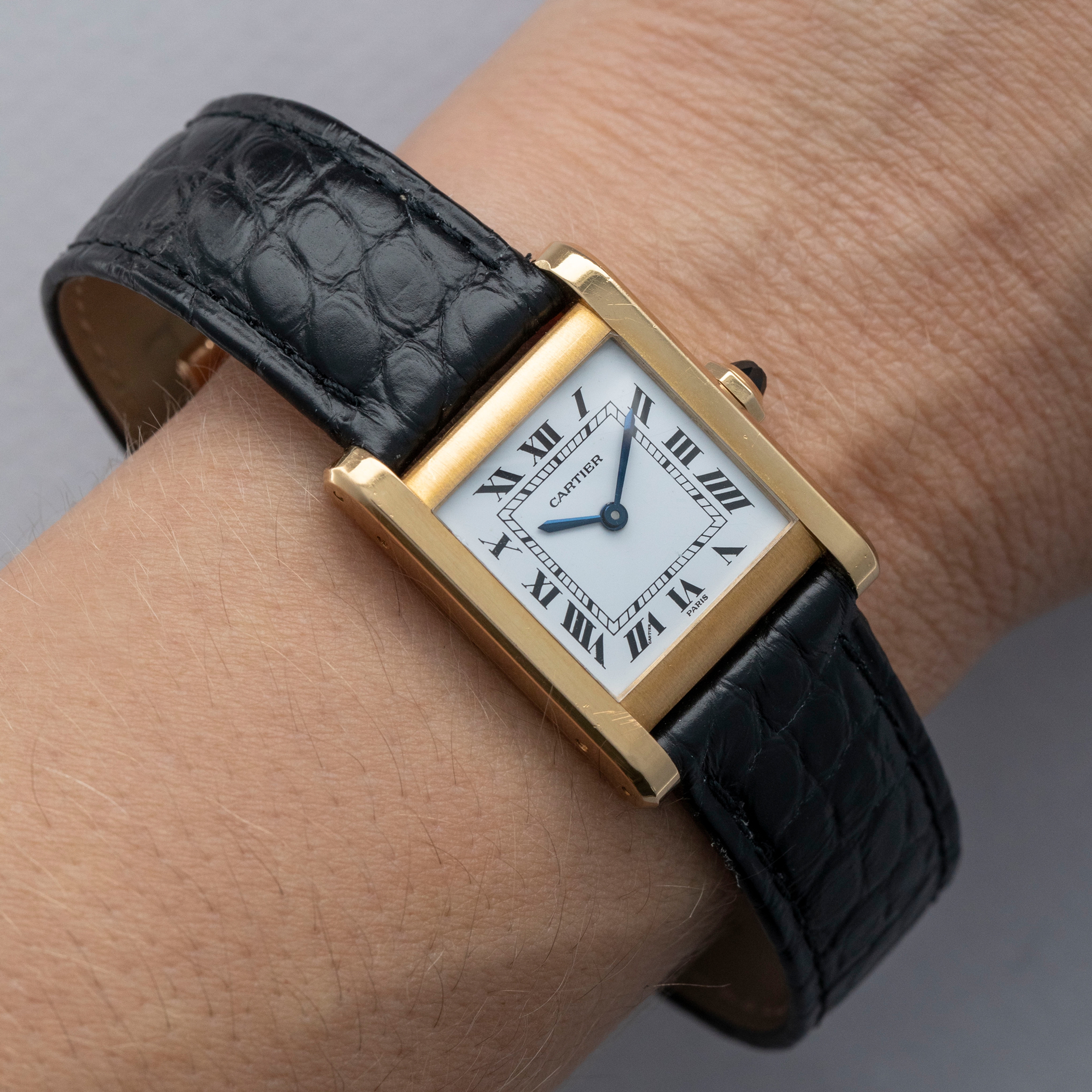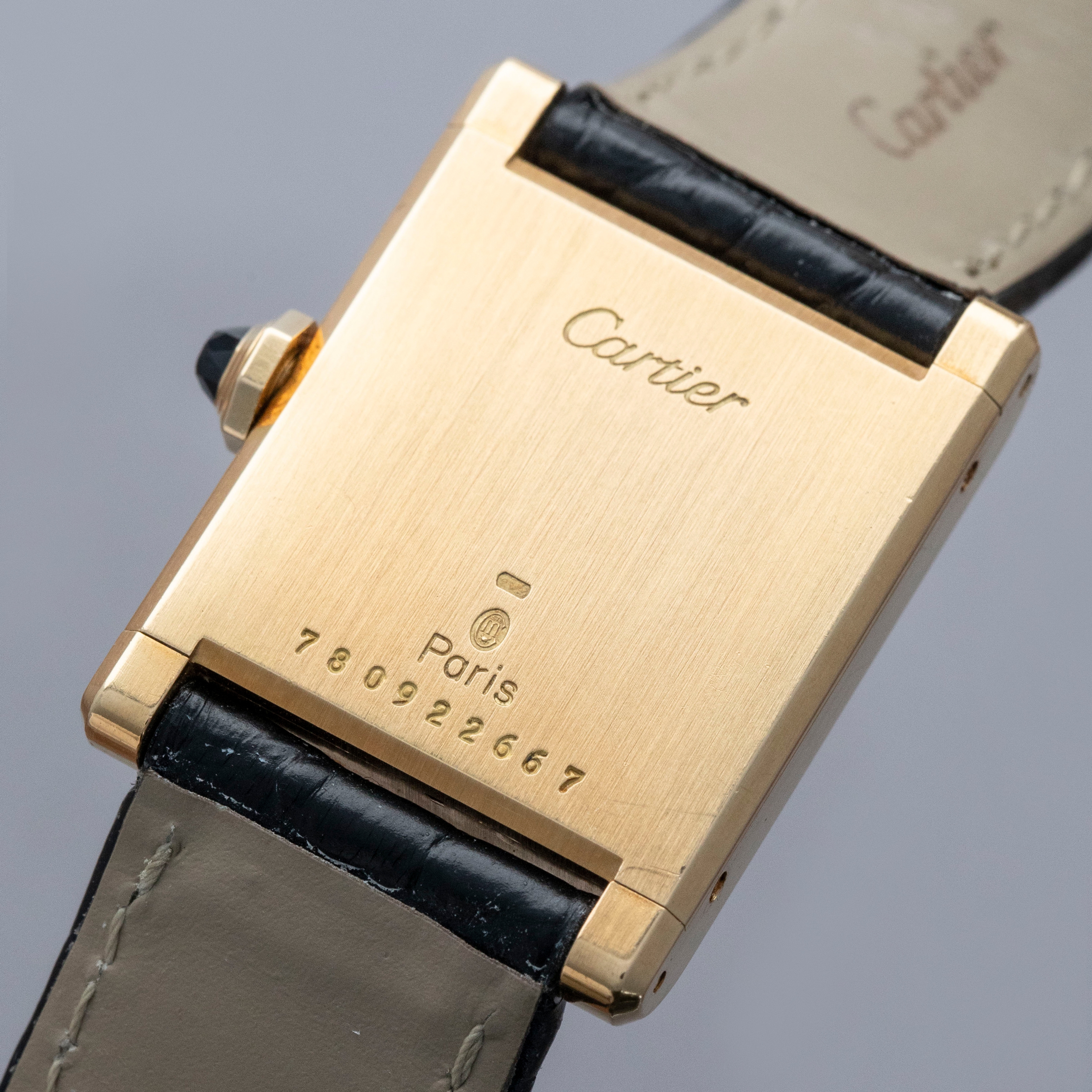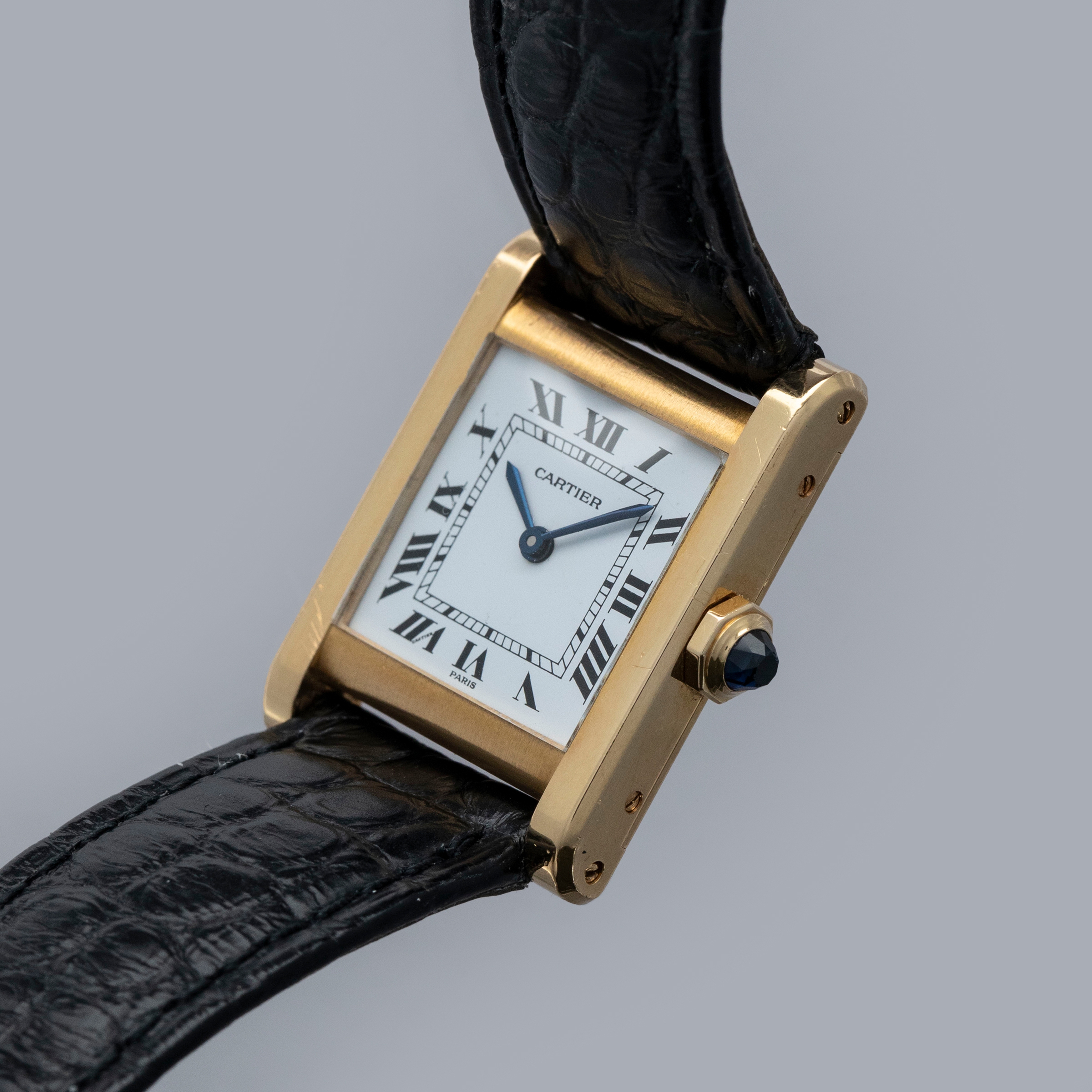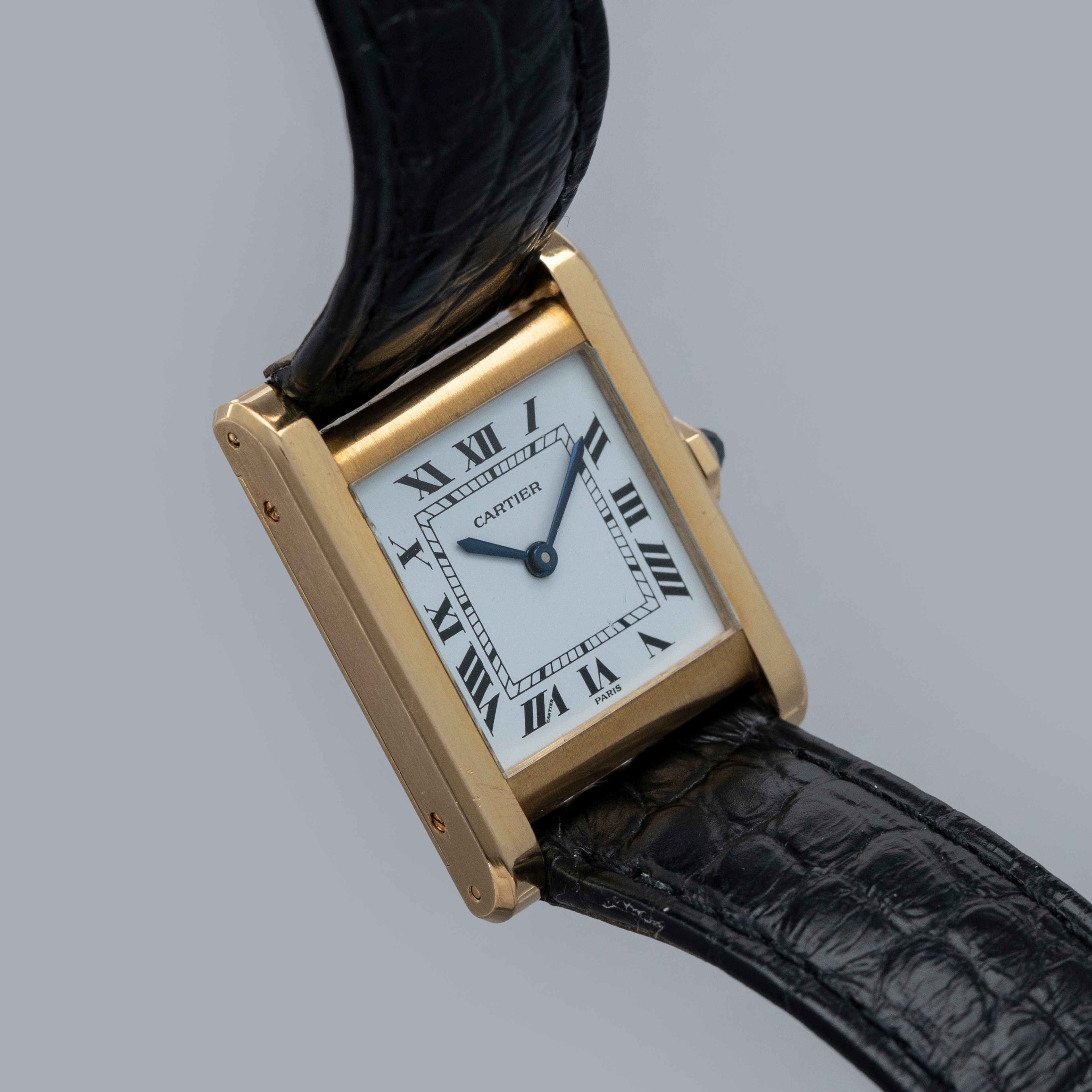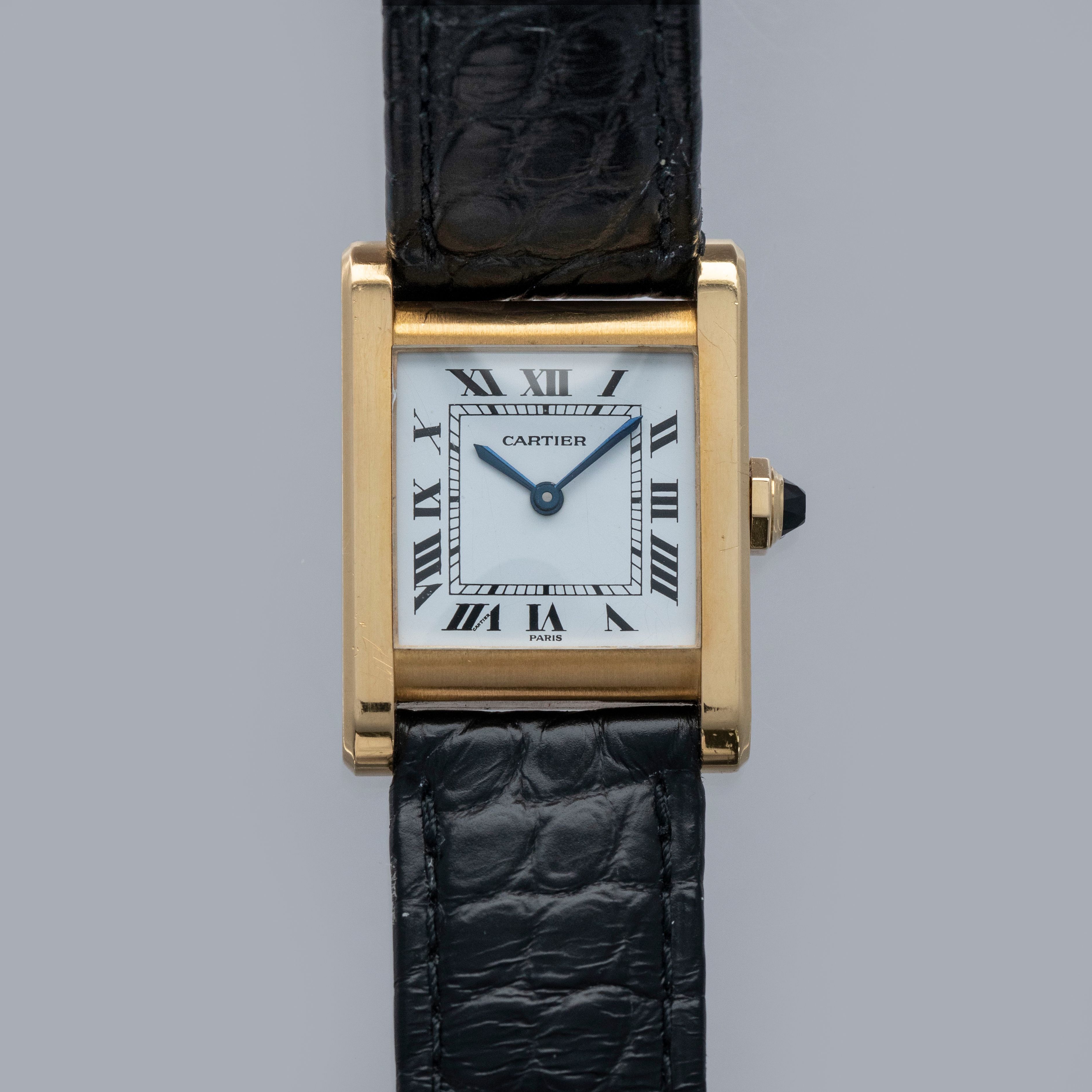The watch is in overall excellent condition. The yellow gold case is well defined, with some scratches and very light marks. There is some wear to the screw heads, particularly those for the strap bars. The case back has very crisp engravings and hallmarks. The white Paris-signed dial is excellent, complemented by clean blued hands. The crystal shows light scratches and small chips at the edge. The watch is fitted with a Cartier black alligator strap with a yellow gold deployant clasp, both in excellent condition.