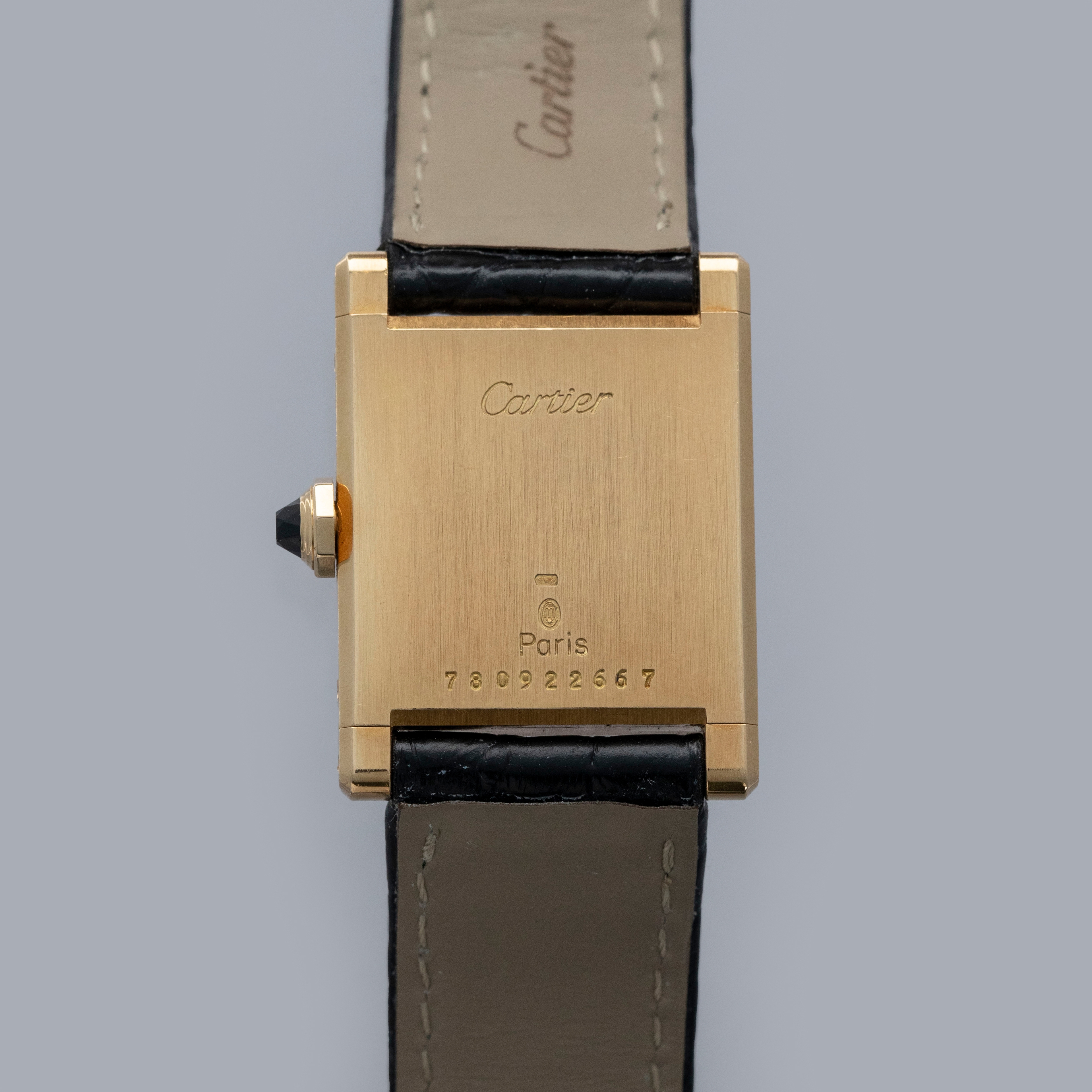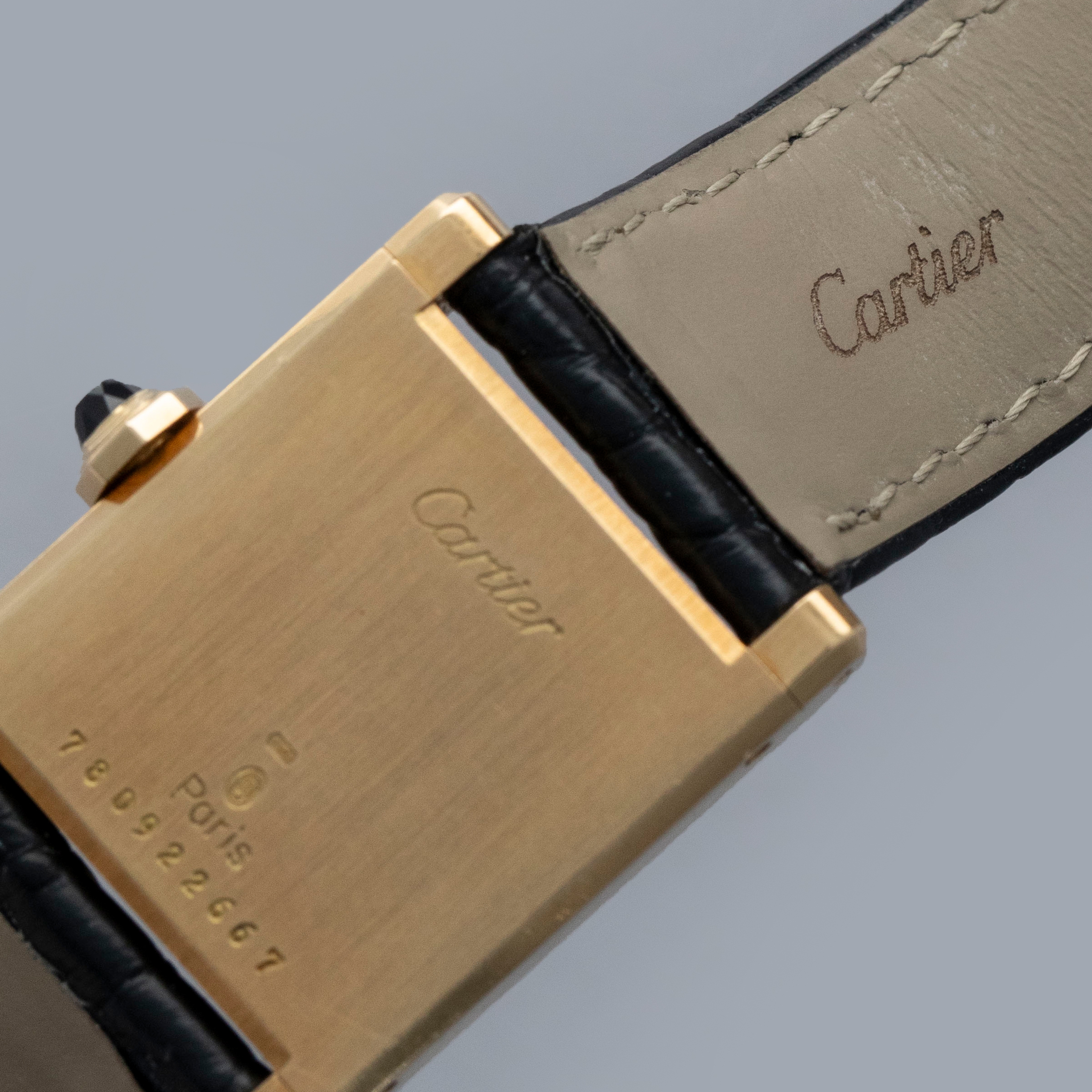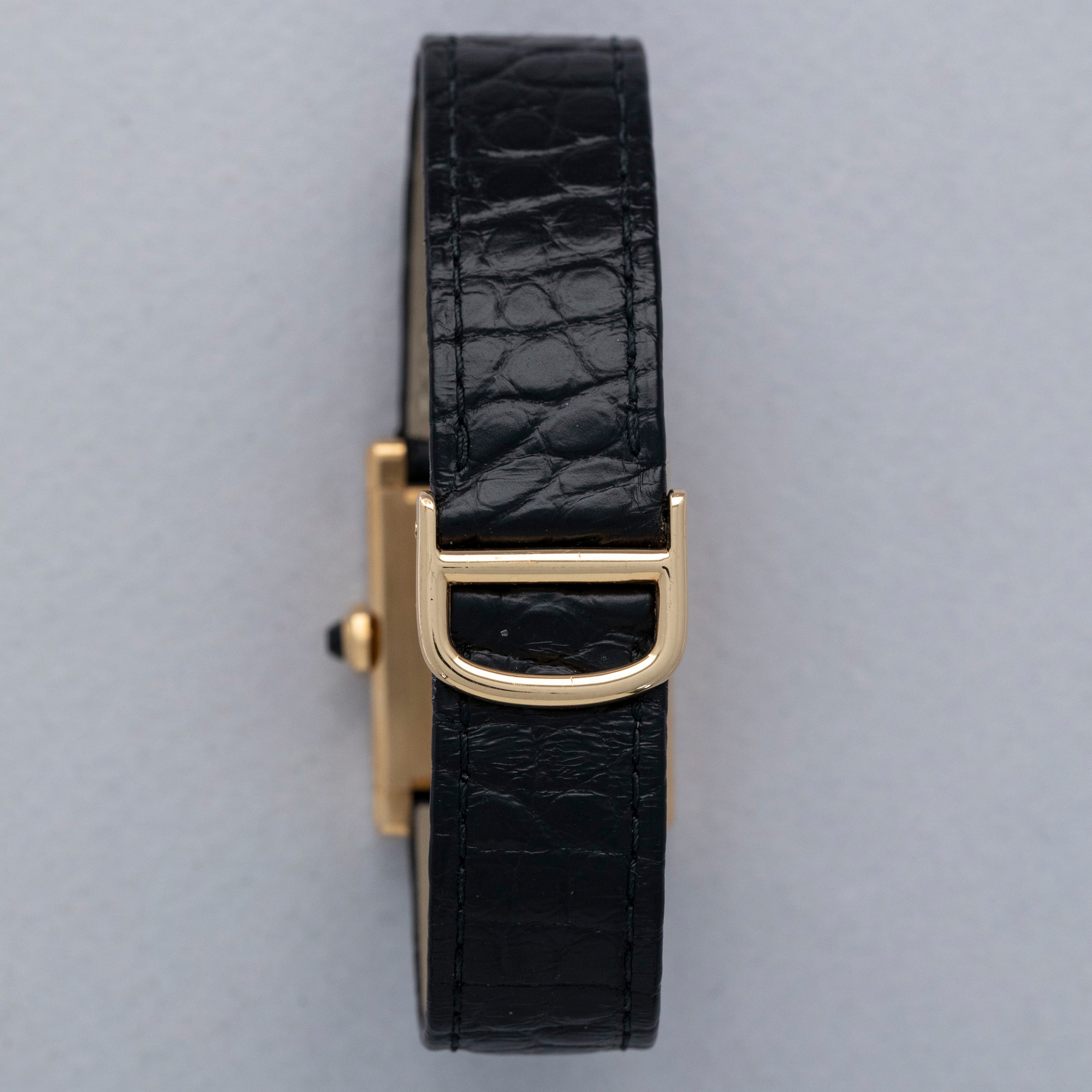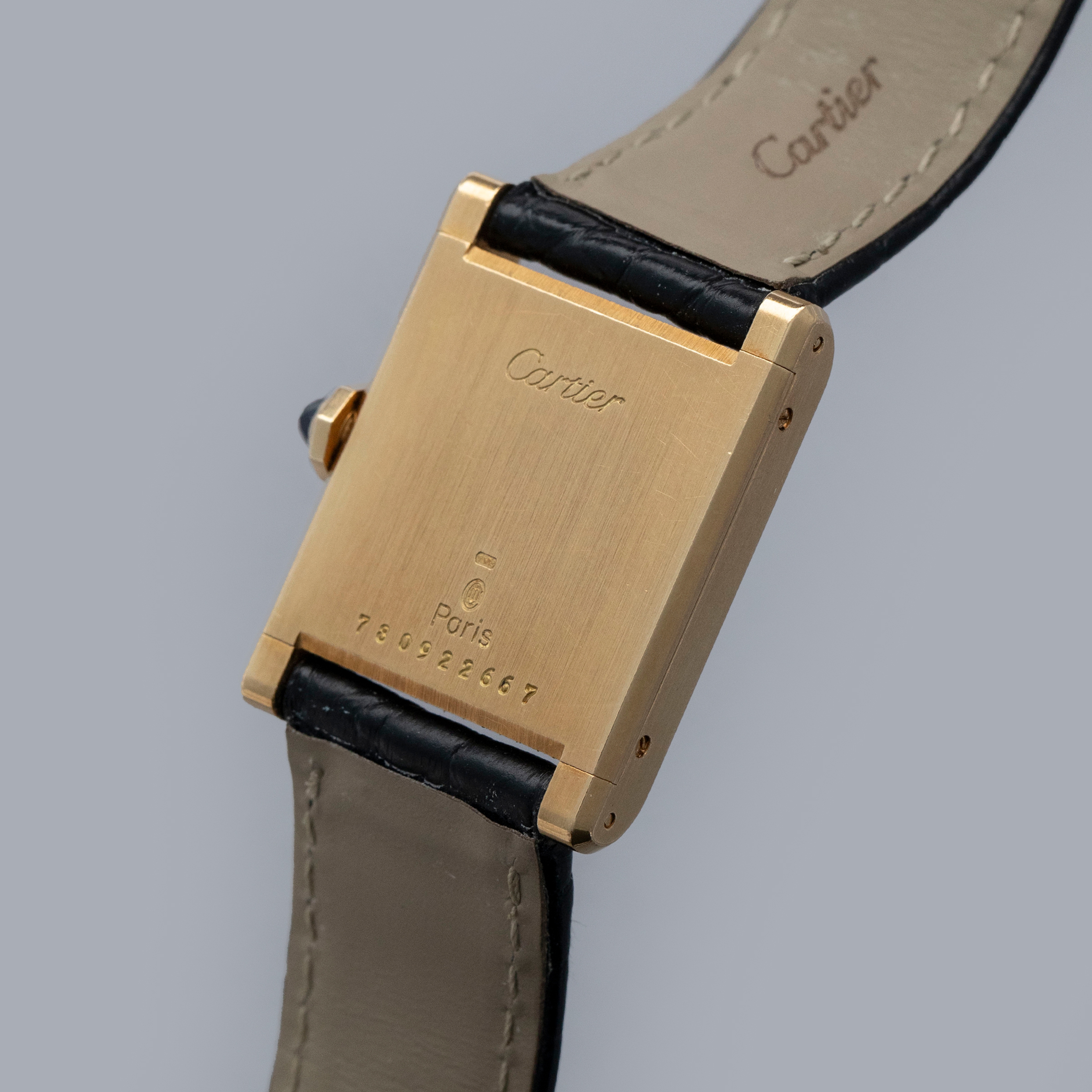 The watch is in overall excellent condition. The yellow gold case is well defined, with some scratches and very light marks. There is some wear to the screw heads, particularly those for the strap bars. The case back has very crisp engravings and hallmarks. The white Paris-signed dial is excellent, complemented by clean blued hands. The crystal shows light scratches and small chips at the edge. The watch is fitted with a Cartier black alligator strap with a yellow gold deployant clasp, both in excellent condition.