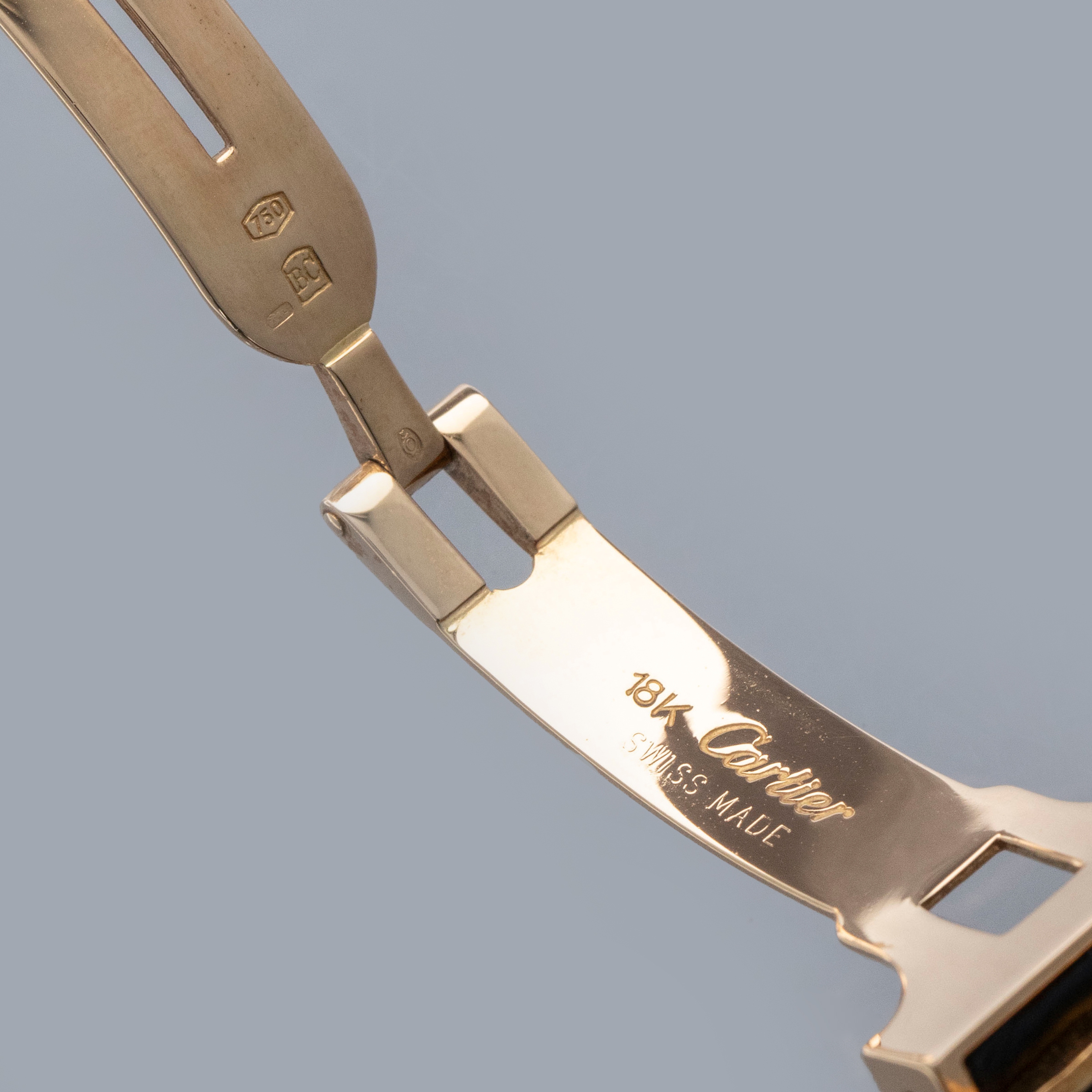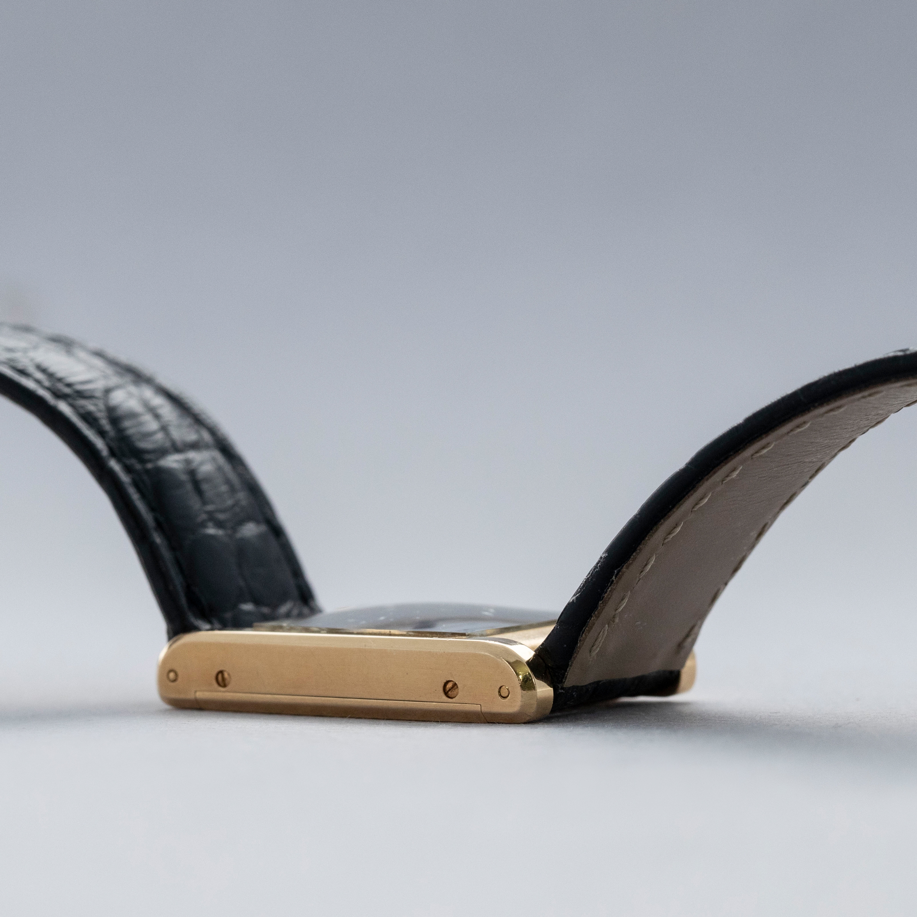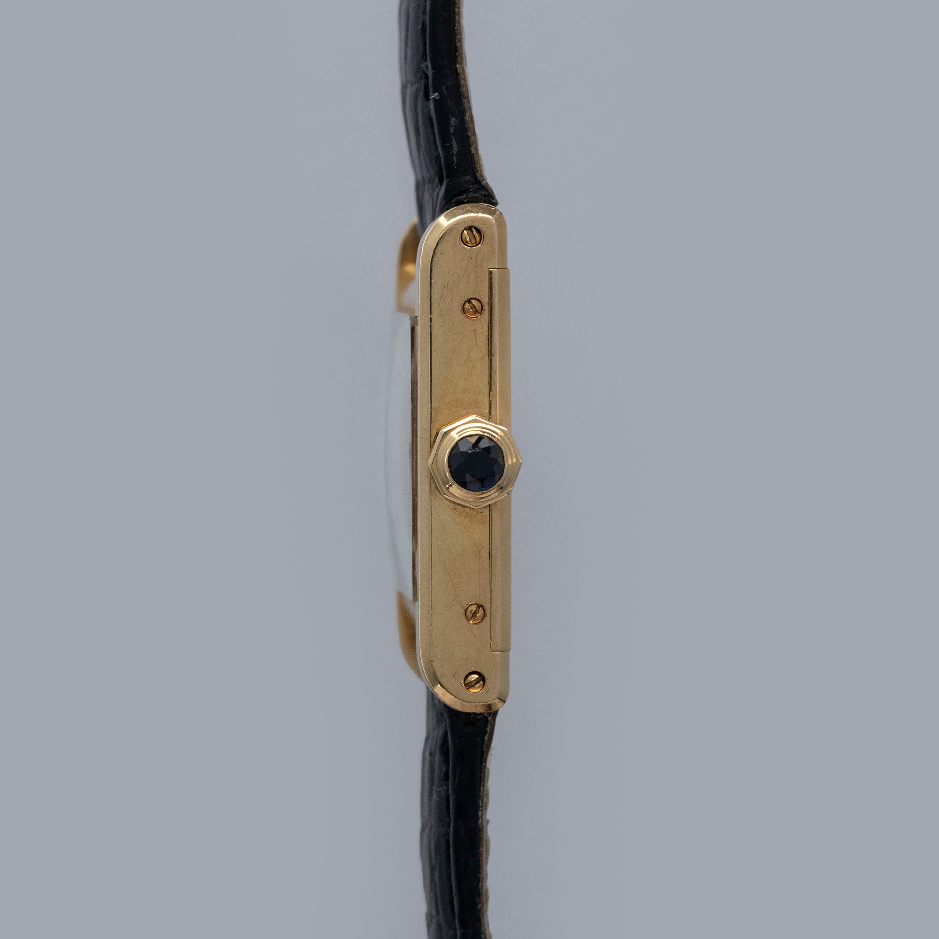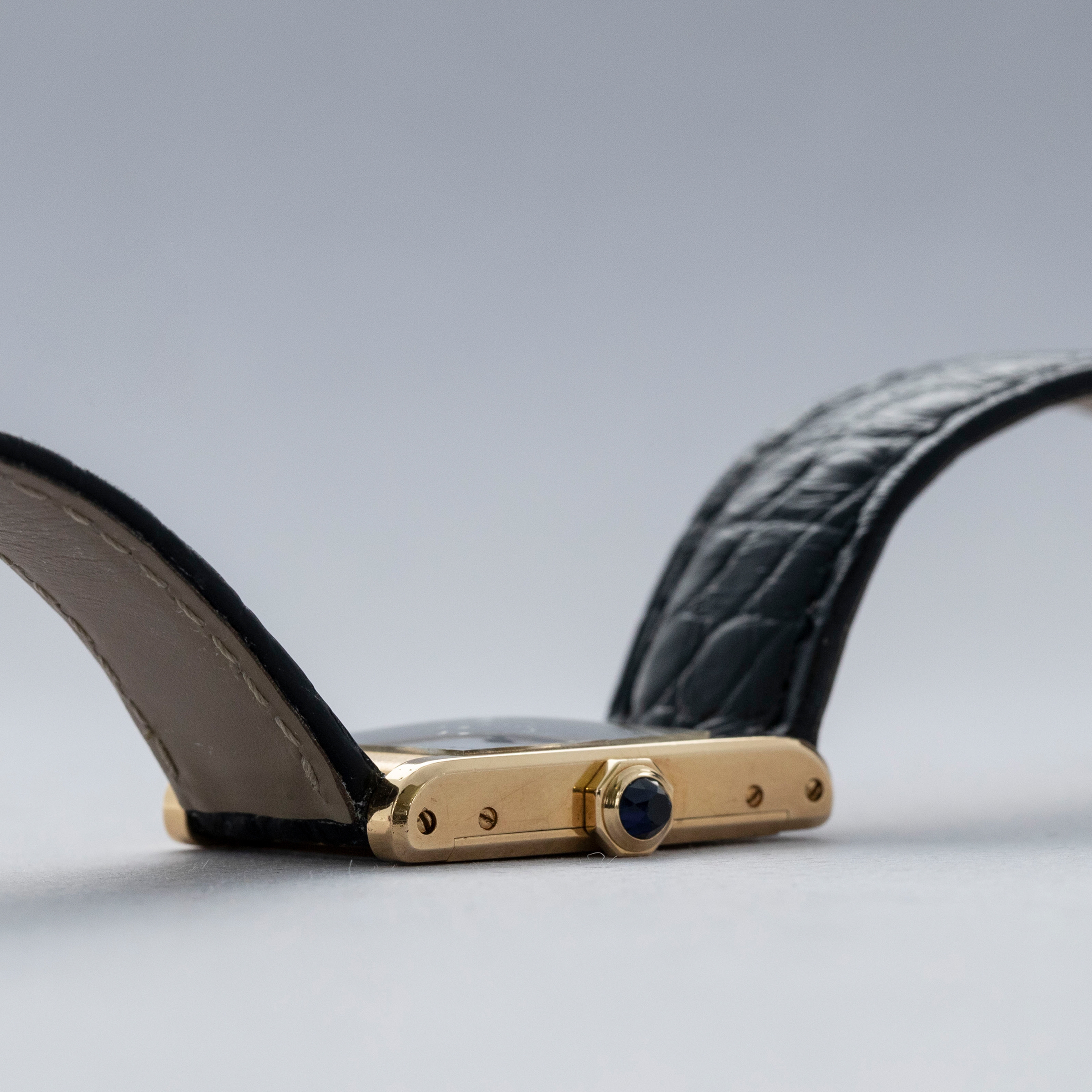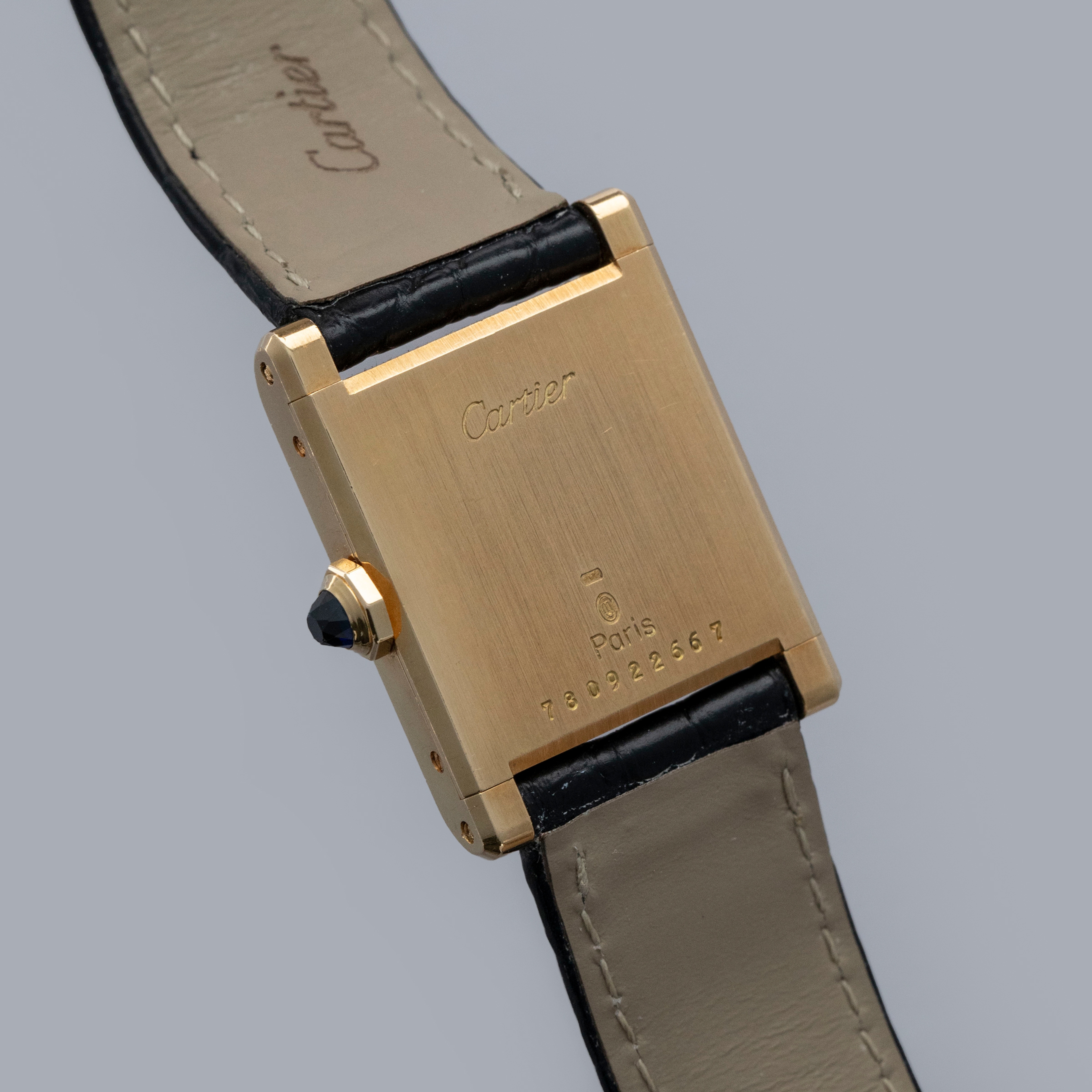 The watch is in overall excellent condition. The yellow gold case is well defined, with some scratches and very light marks. There is some wear to the screw heads, particularly those for the strap bars. The case back has very crisp engravings and hallmarks. The white Paris-signed dial is excellent, complemented by clean blued hands. The crystal shows light scratches and small chips at the edge. The watch is fitted with a Cartier black alligator strap with a yellow gold deployant clasp, both in excellent condition.