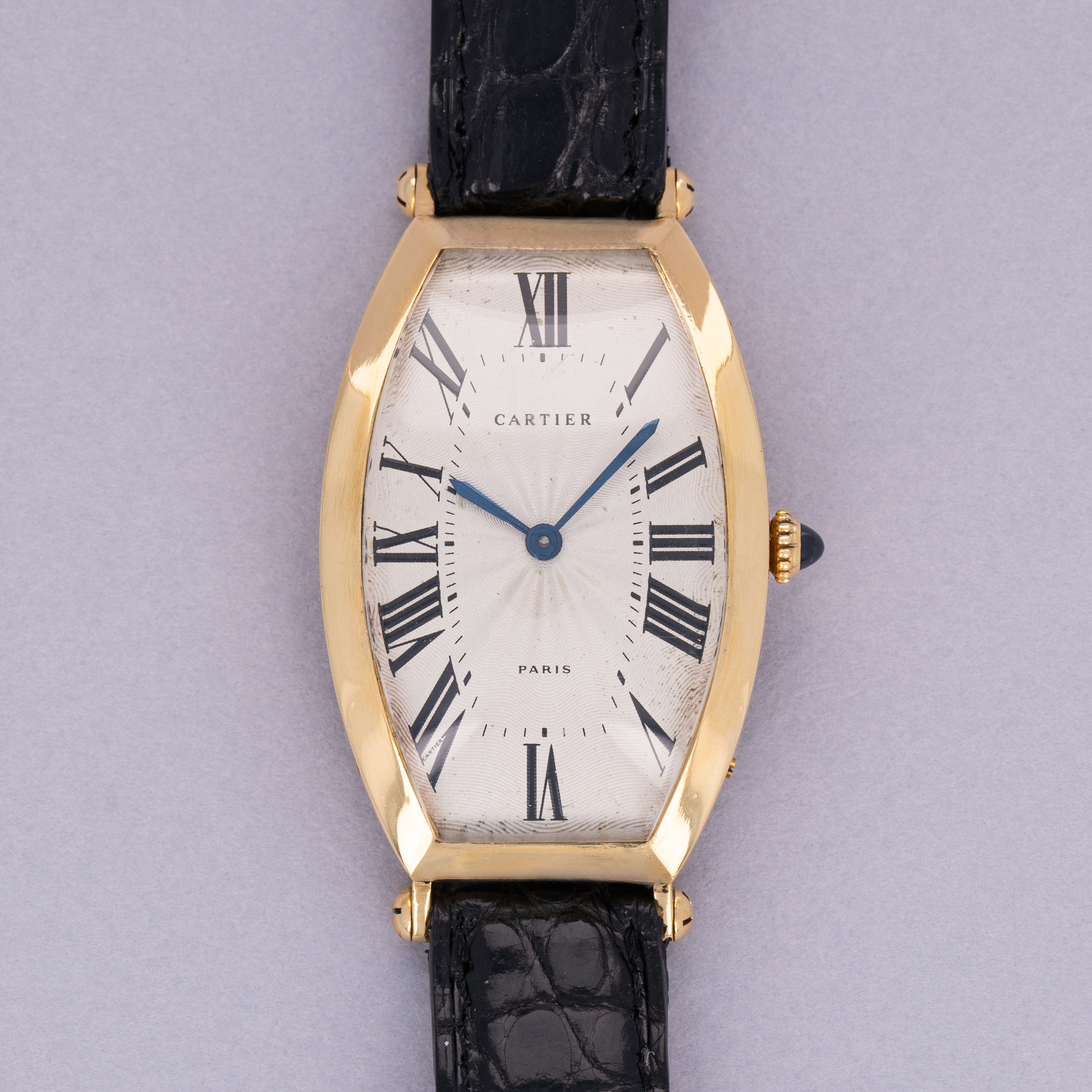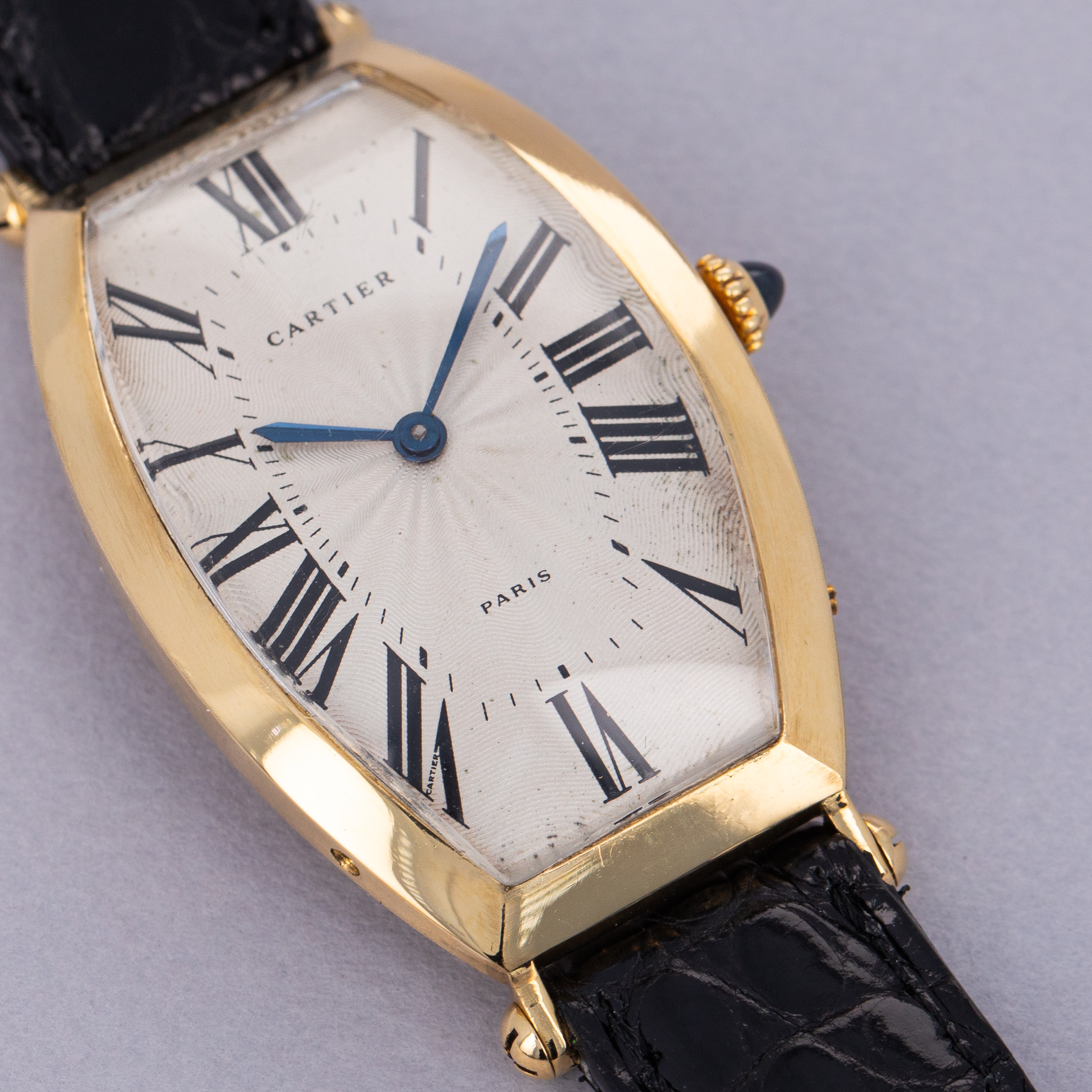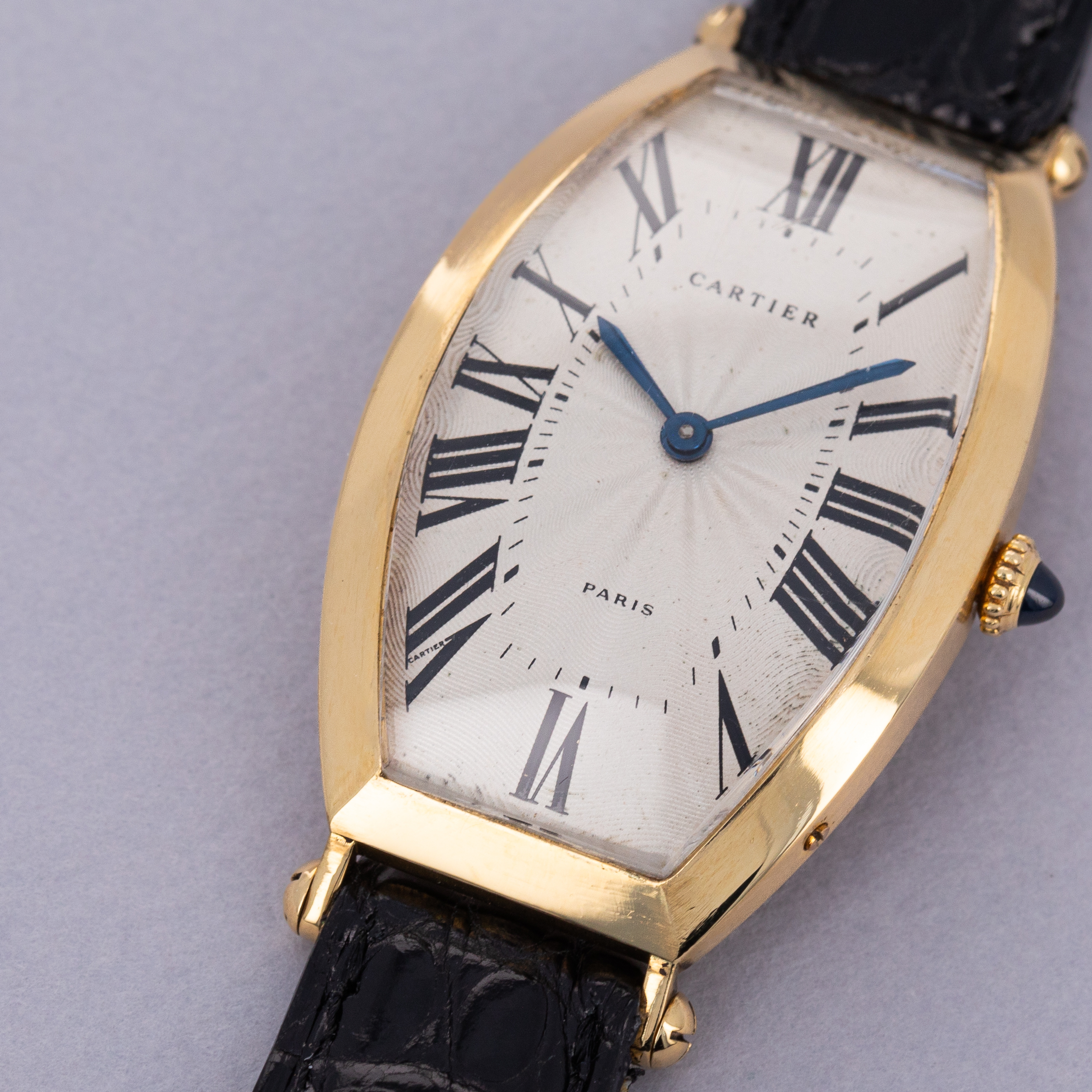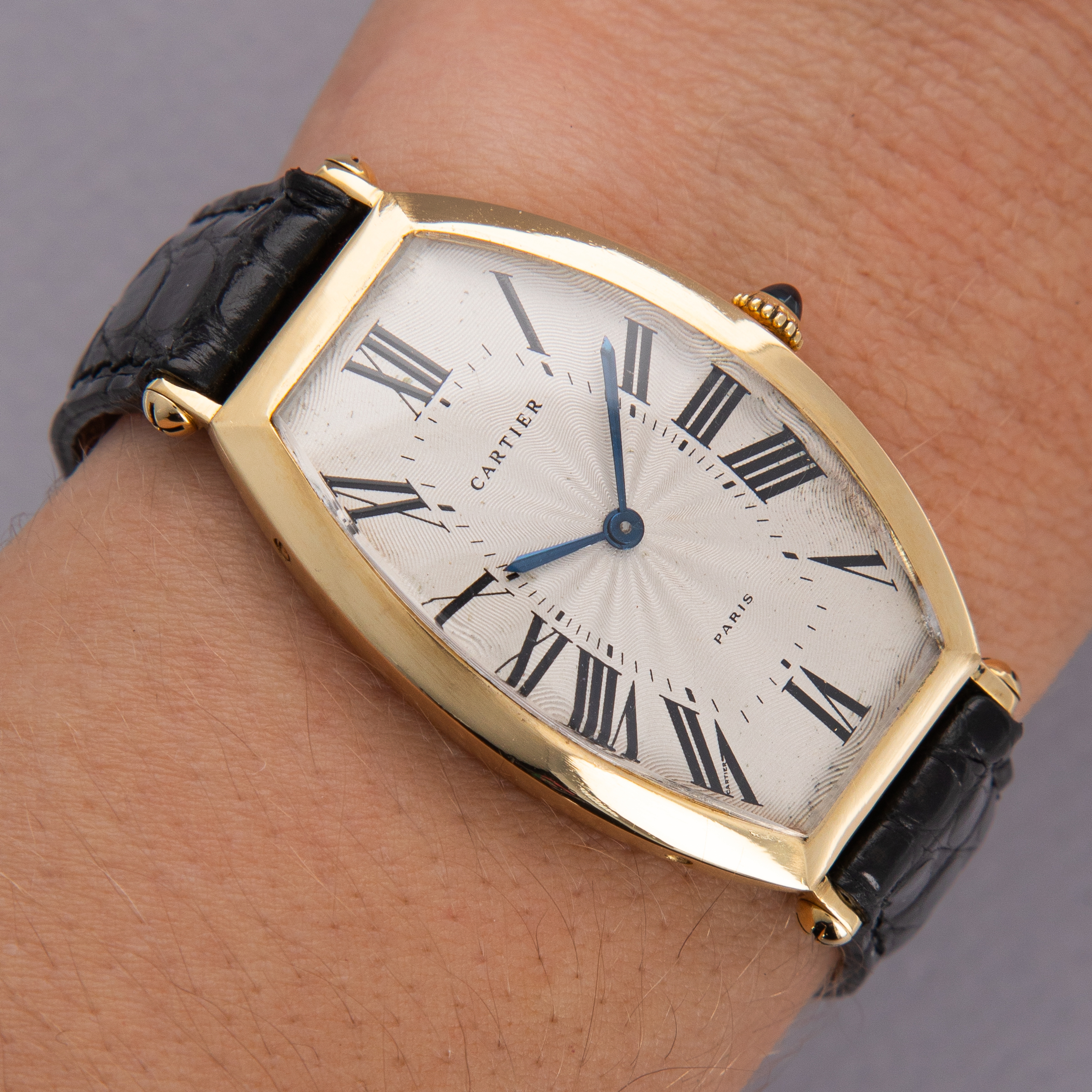 With its subtle guilloche-engraved pattern, blued steel hands, large black exploded Roman numerals and coveted Paris signature, this Tonneau's dial aesthetic is unmistakably Cartier.