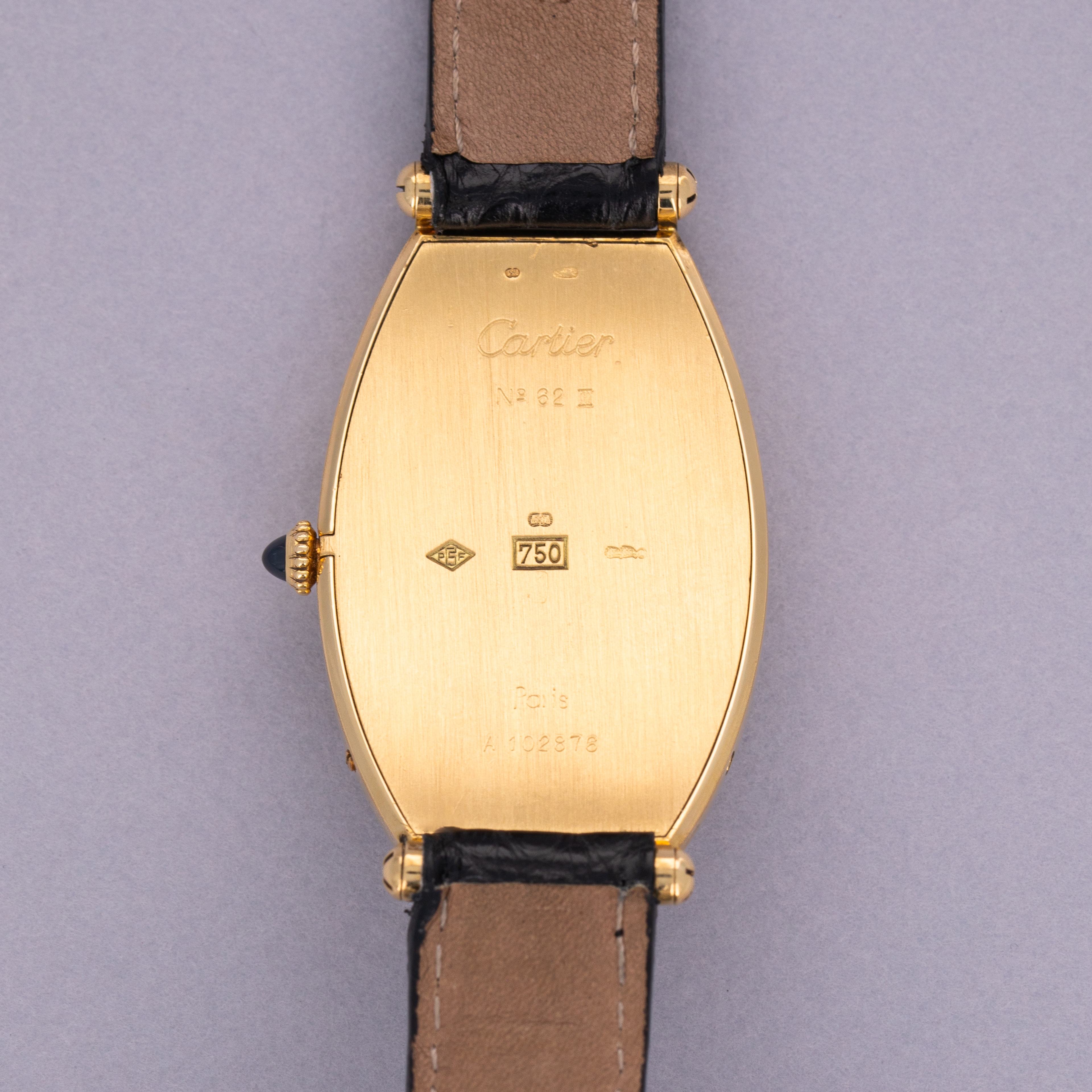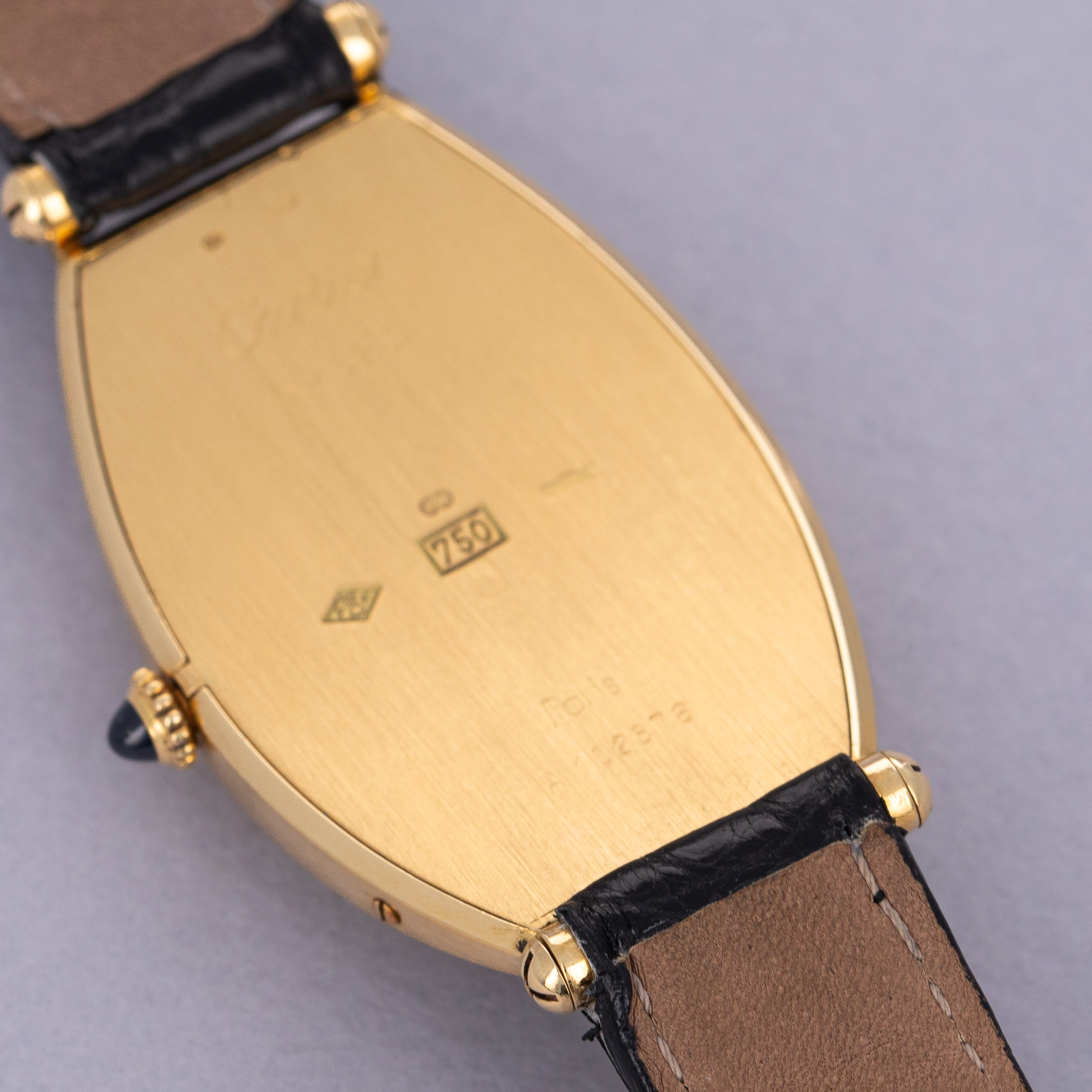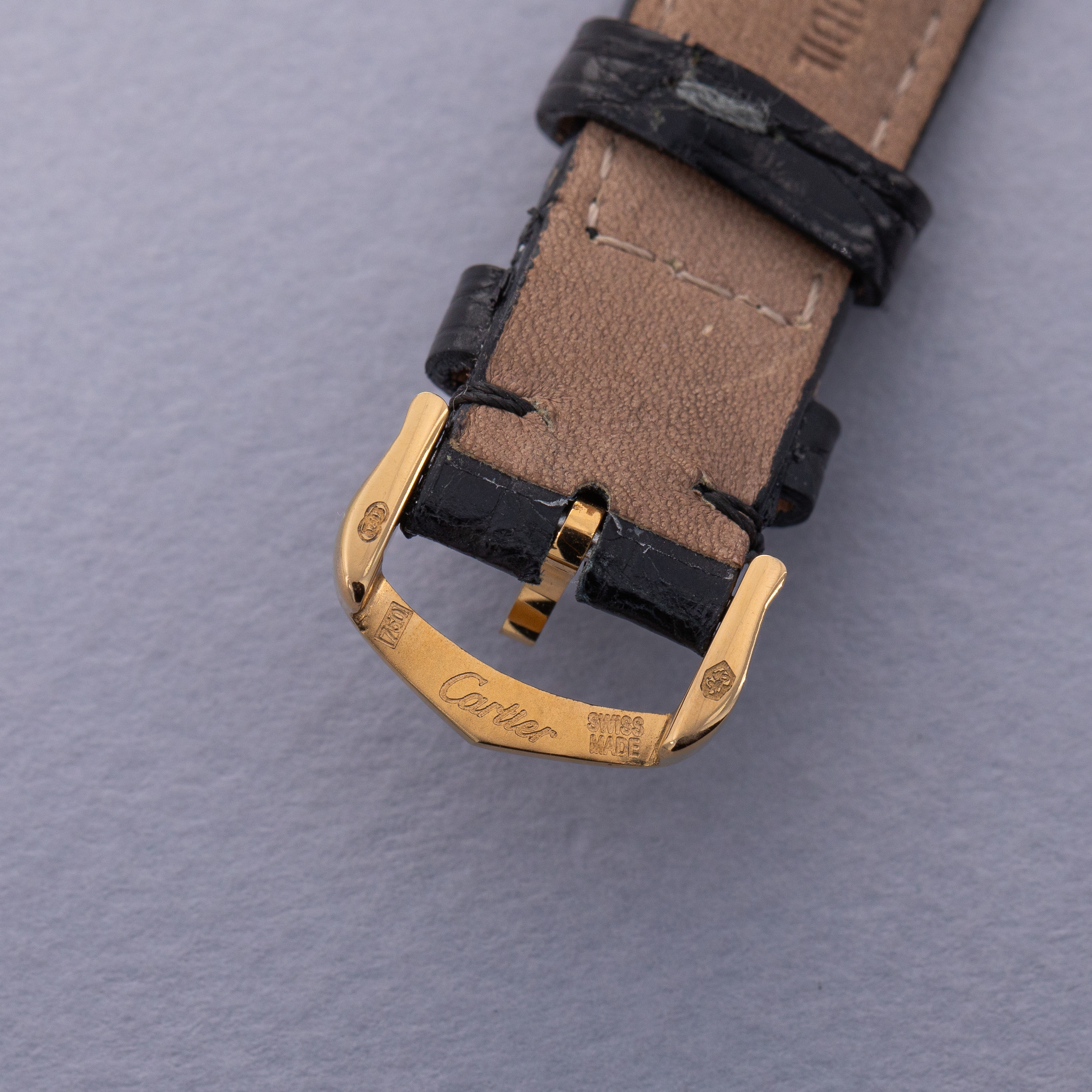 Watch is in very good overall condition. Case shows signs of wear with some scratches and marks, the most visible being on the top side of the caseback edge. Caseback hallmarks and engravings are crisp and fully legible. The mid-case is missing one of the side screws as seen in the images. The dial is in very good condition with some oxidation visible on the guilloche surface. Watch comes with a Cartier signed 18k tang buckle. Watch comes with a paper from Cartier for a strap change in 2023.