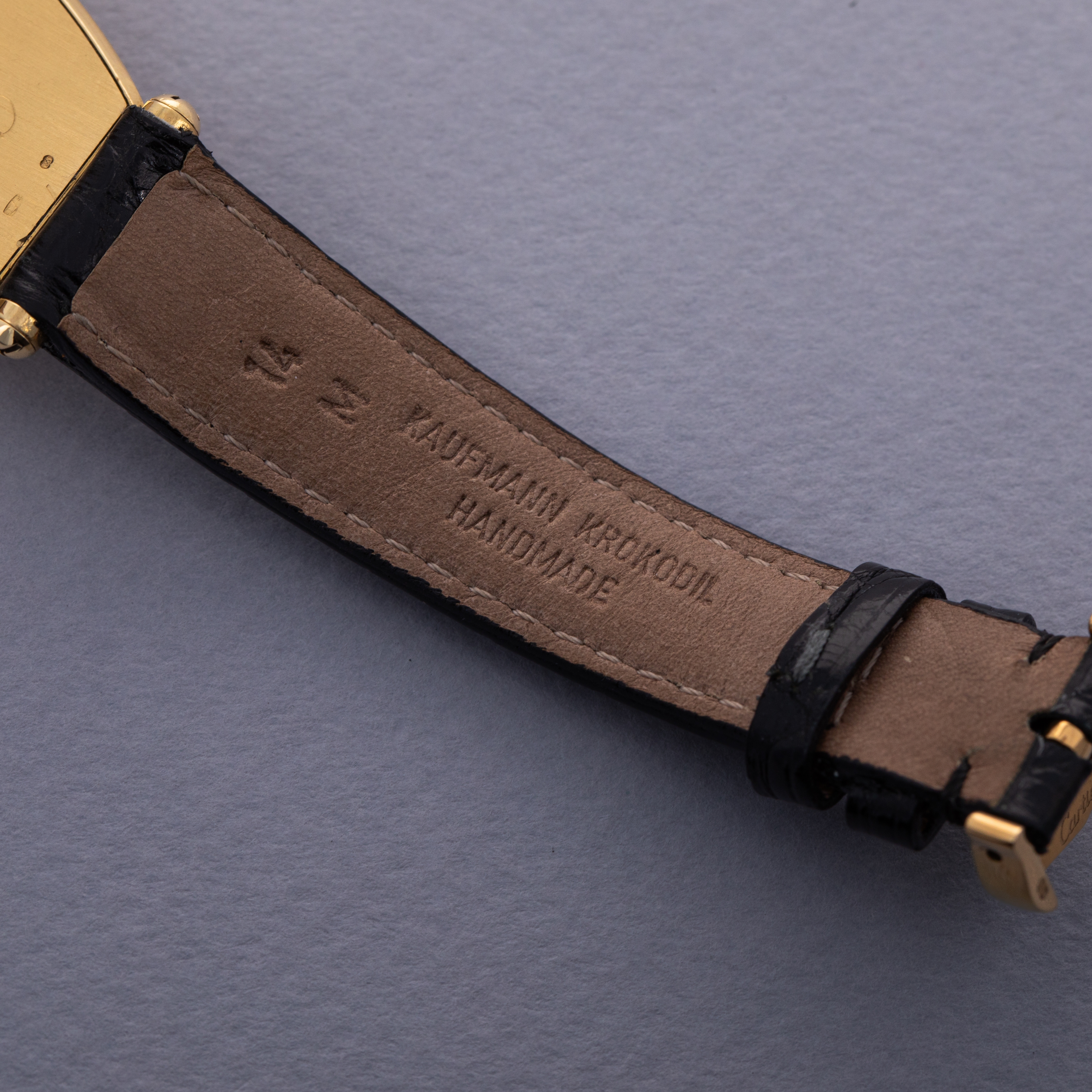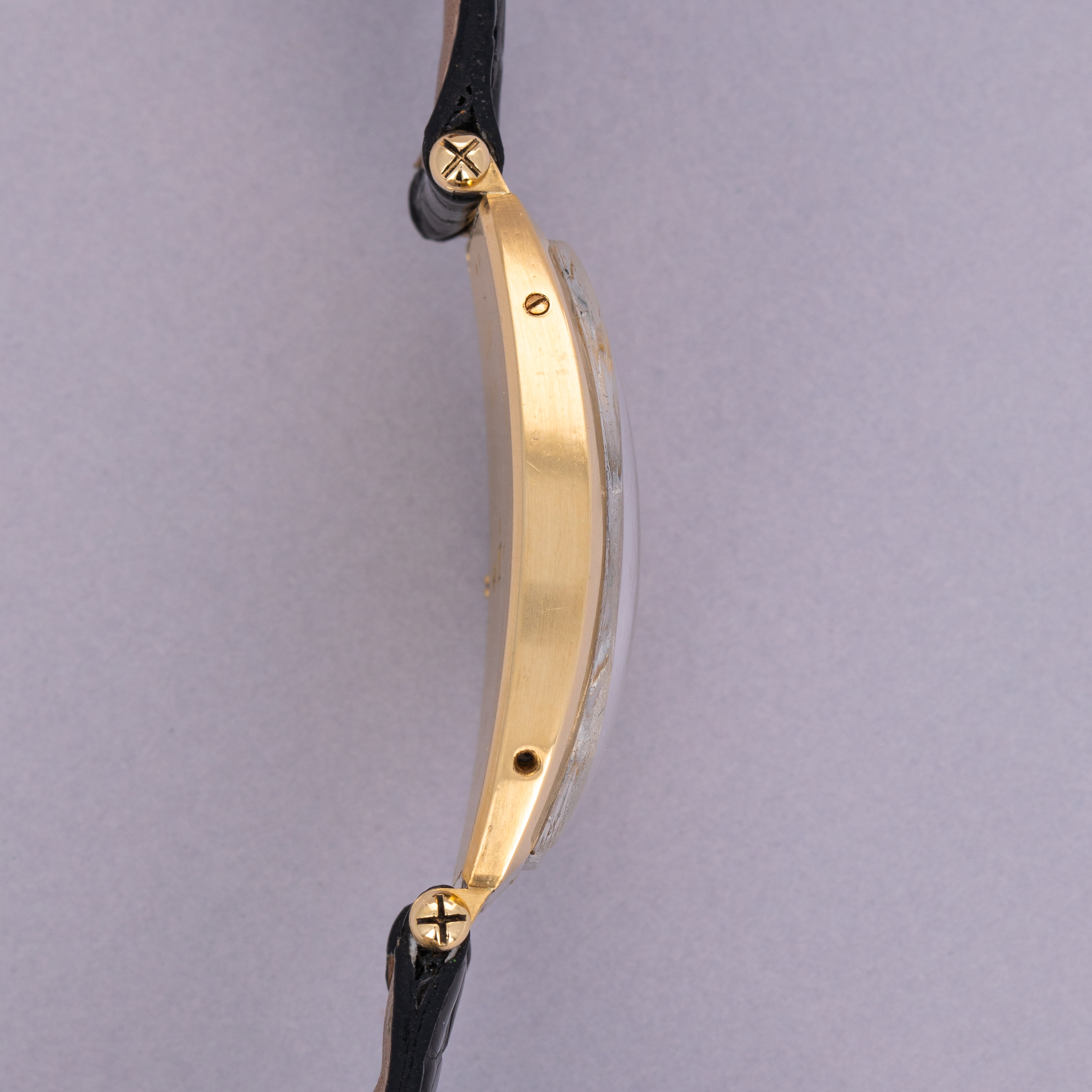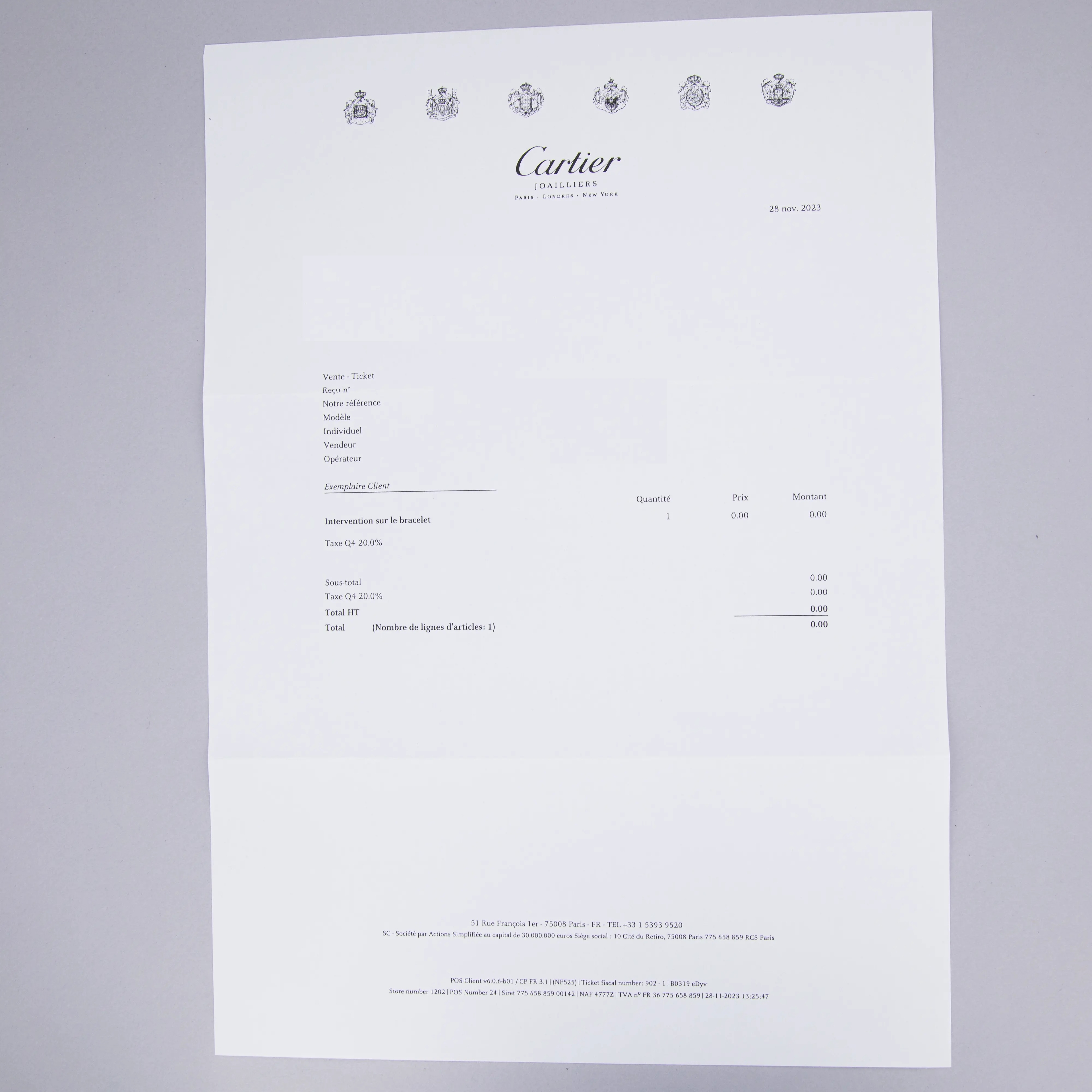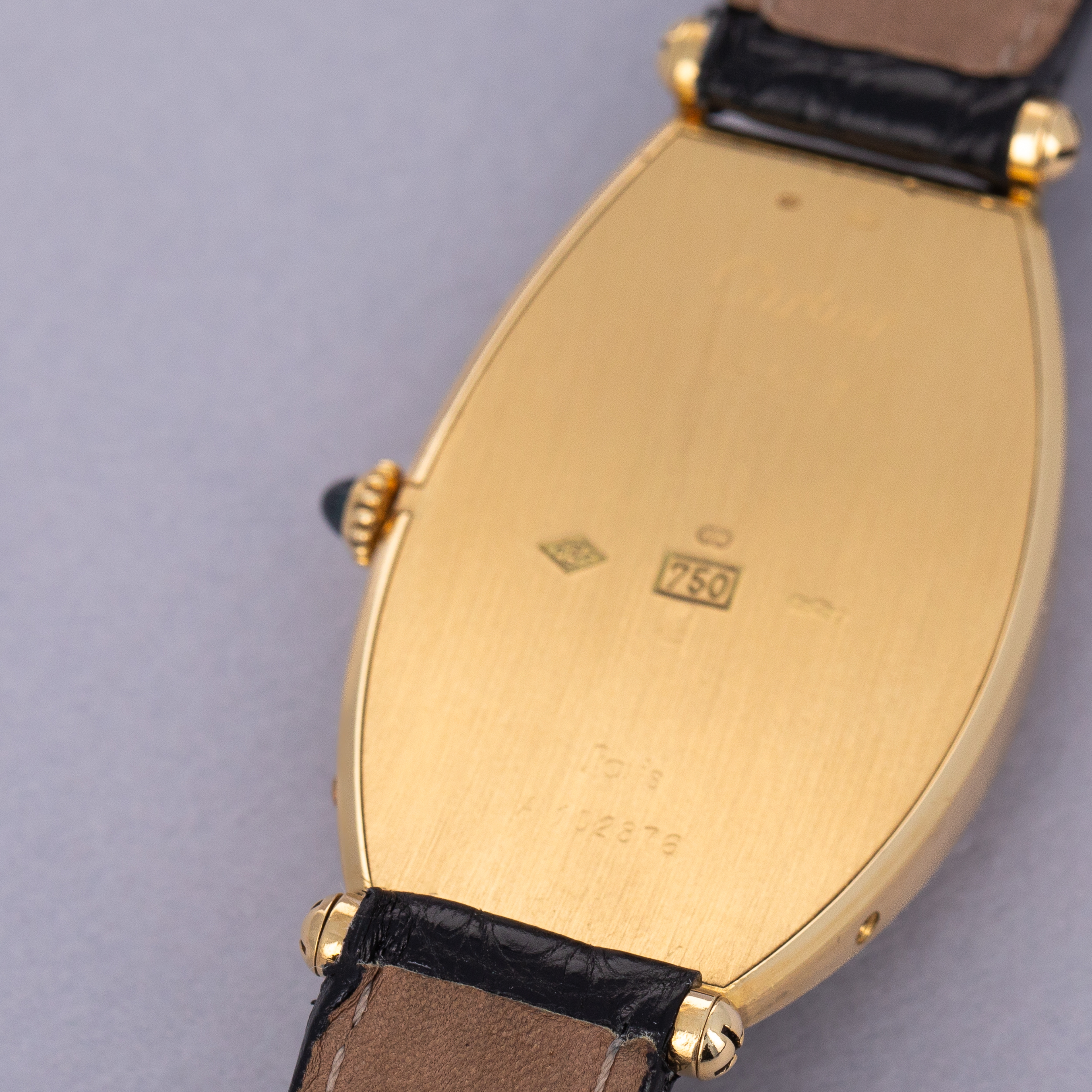 Watch is in very good overall condition. Case shows signs of wear with some scratches and marks, the most visible being on the top side of the caseback edge. Caseback hallmarks and engravings are crisp and fully legible. The mid-case is missing one of the side screws as seen in the images. The dial is in very good condition with some oxidation visible on the guilloche surface. Watch comes with a Cartier signed 18k tang buckle. Watch comes with a paper from Cartier for a strap change in 2023.