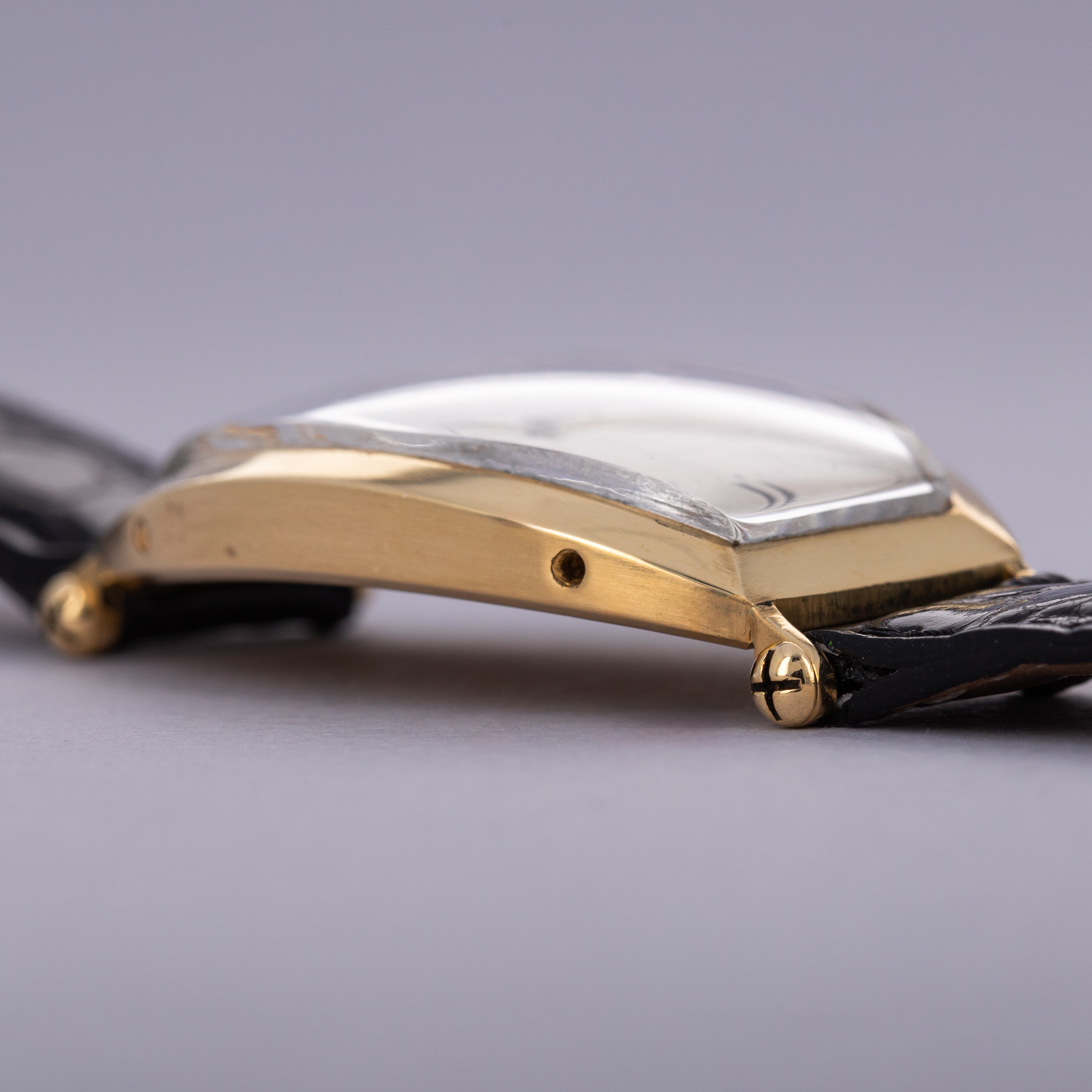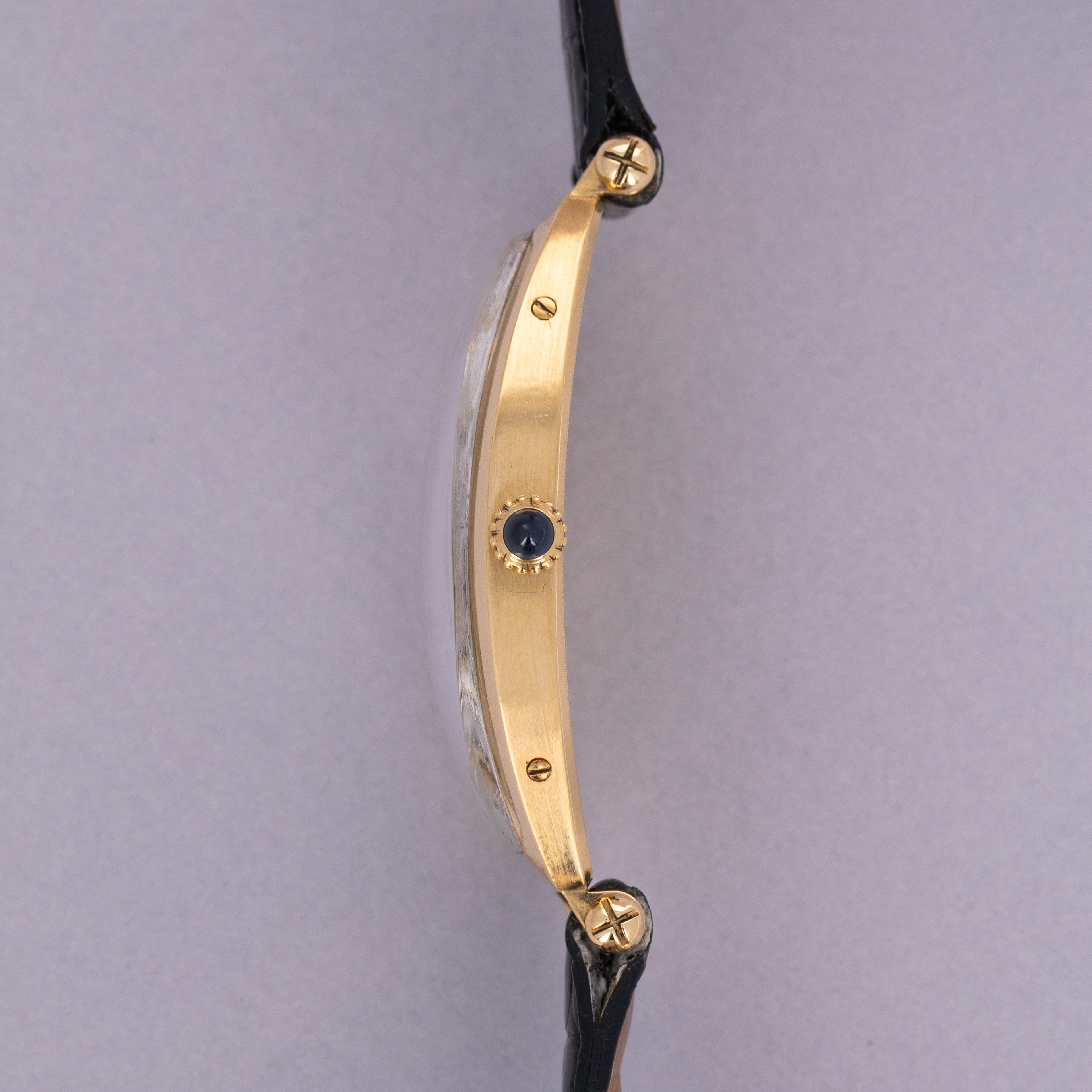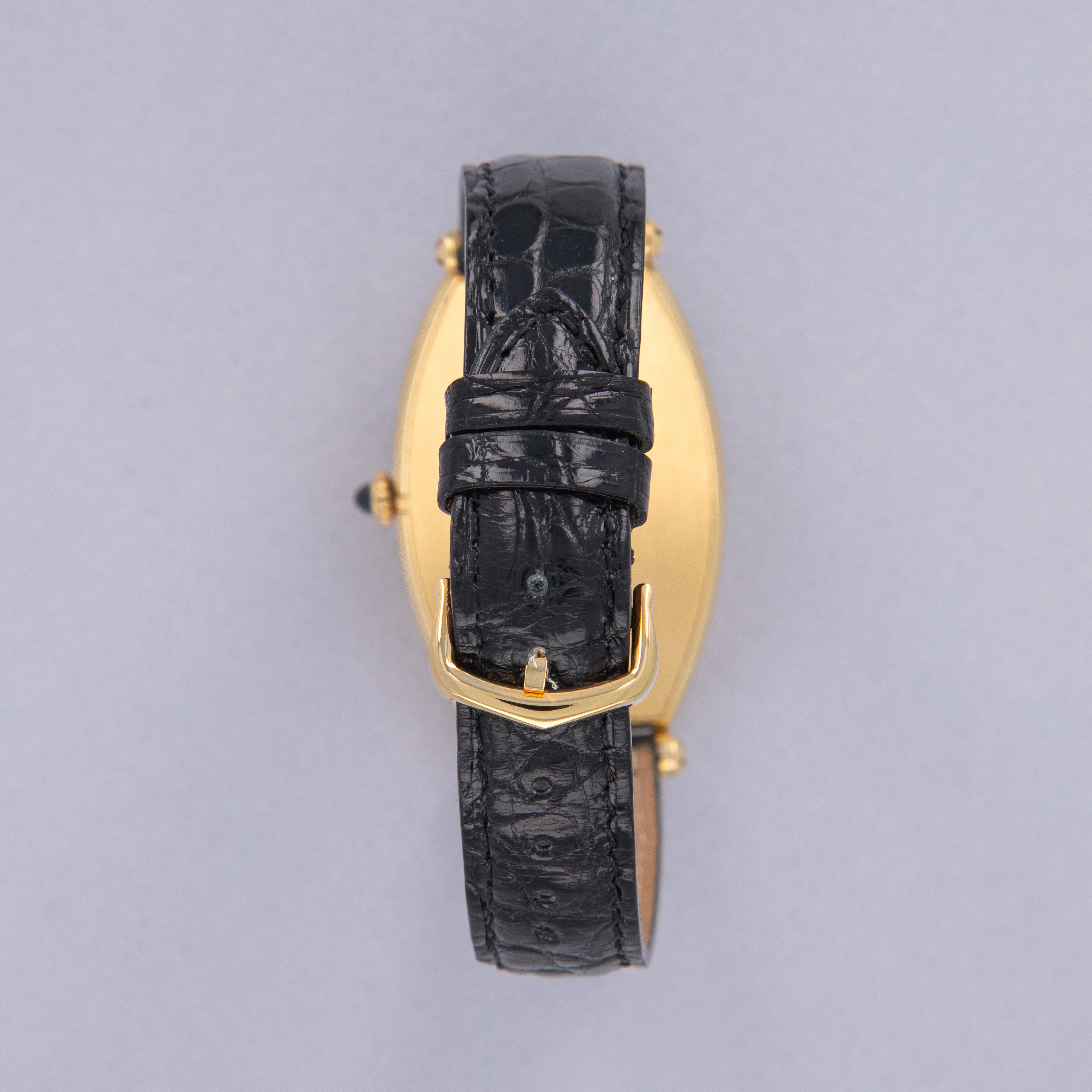 Launched in 1906, just a short two years after their Santos model, the Cartier Tonneau is a stunning barrel-shaped timepiece that draws direct inspiration from the Art Deco movement. Named “Tonneau,” meaning “Barrell” in French, the Tonneau’s gently curved mid-case swoops out from its narrow lugs in a rather gorgeous manner. Constructed of 18k yellow gold, this 1980s example conforms to the wrist with its curved profile resulting in a wonderfully comfortable wearing experience. Containing perhaps one of Cartier’s most iconic design elements, this example features a white guilloche-engraved dial with large black Roman numerals and Cartier's sought-after “Paris” signature at 6 o’clock that indicates that this example was retailed in Cartier's flagship boutique in Place Vendôme, Paris. Additionally, with its blue sapphire cabochon, blued steel hands and manual-wind movement, this wonderful watch retains the unparalleled essence of Cartier’s rich horological heritage in total abundance.
