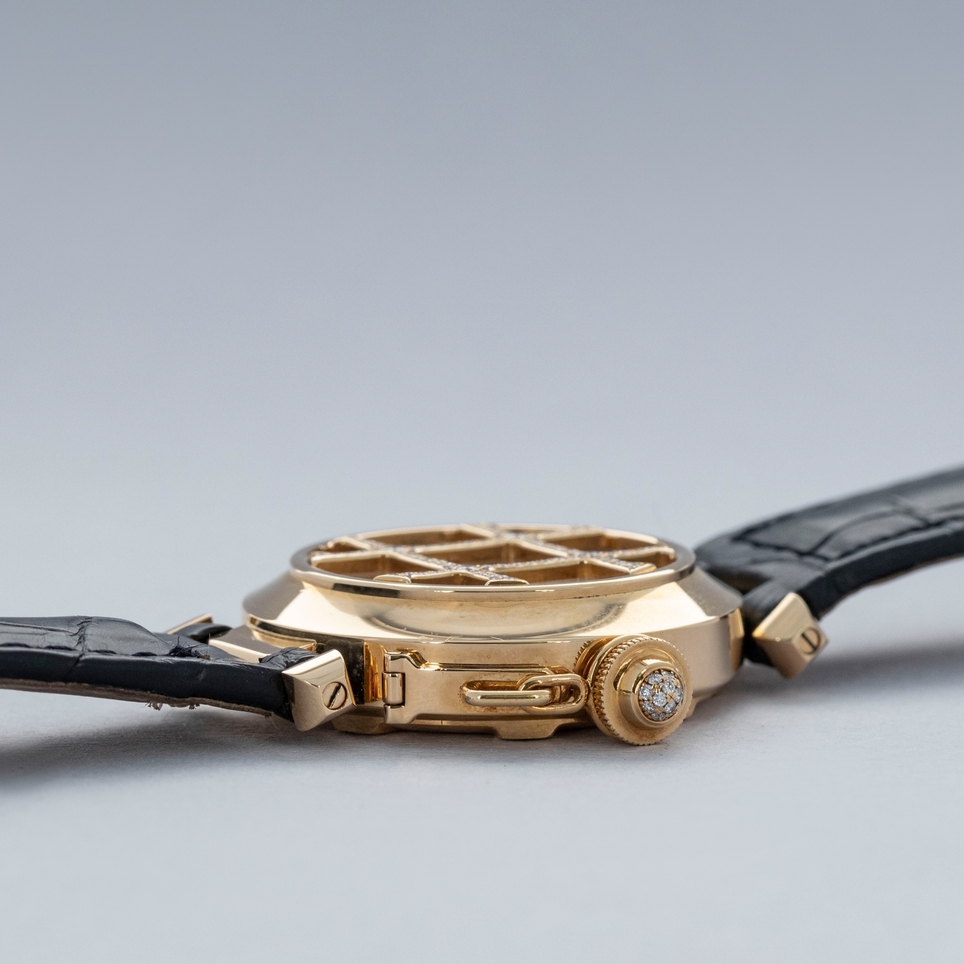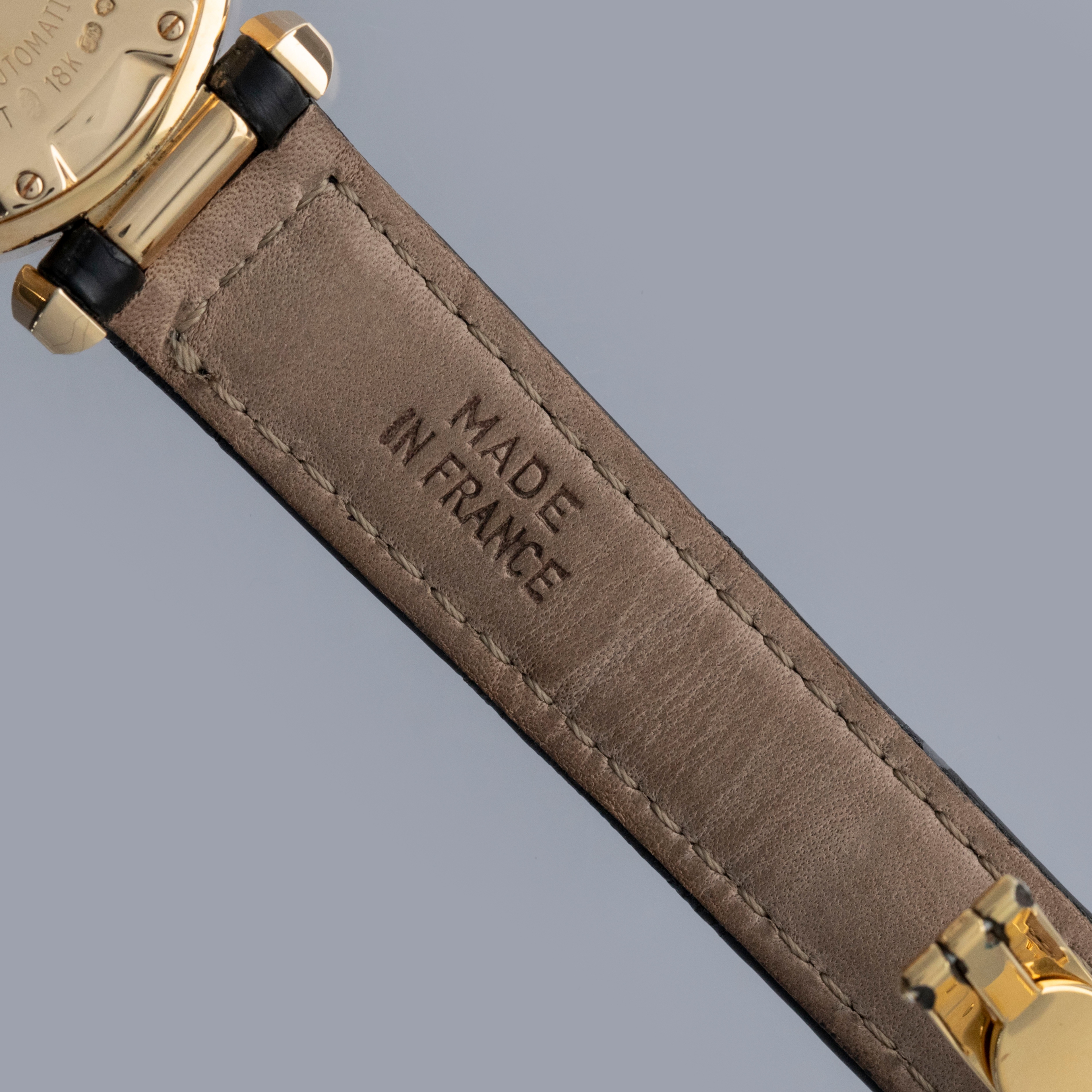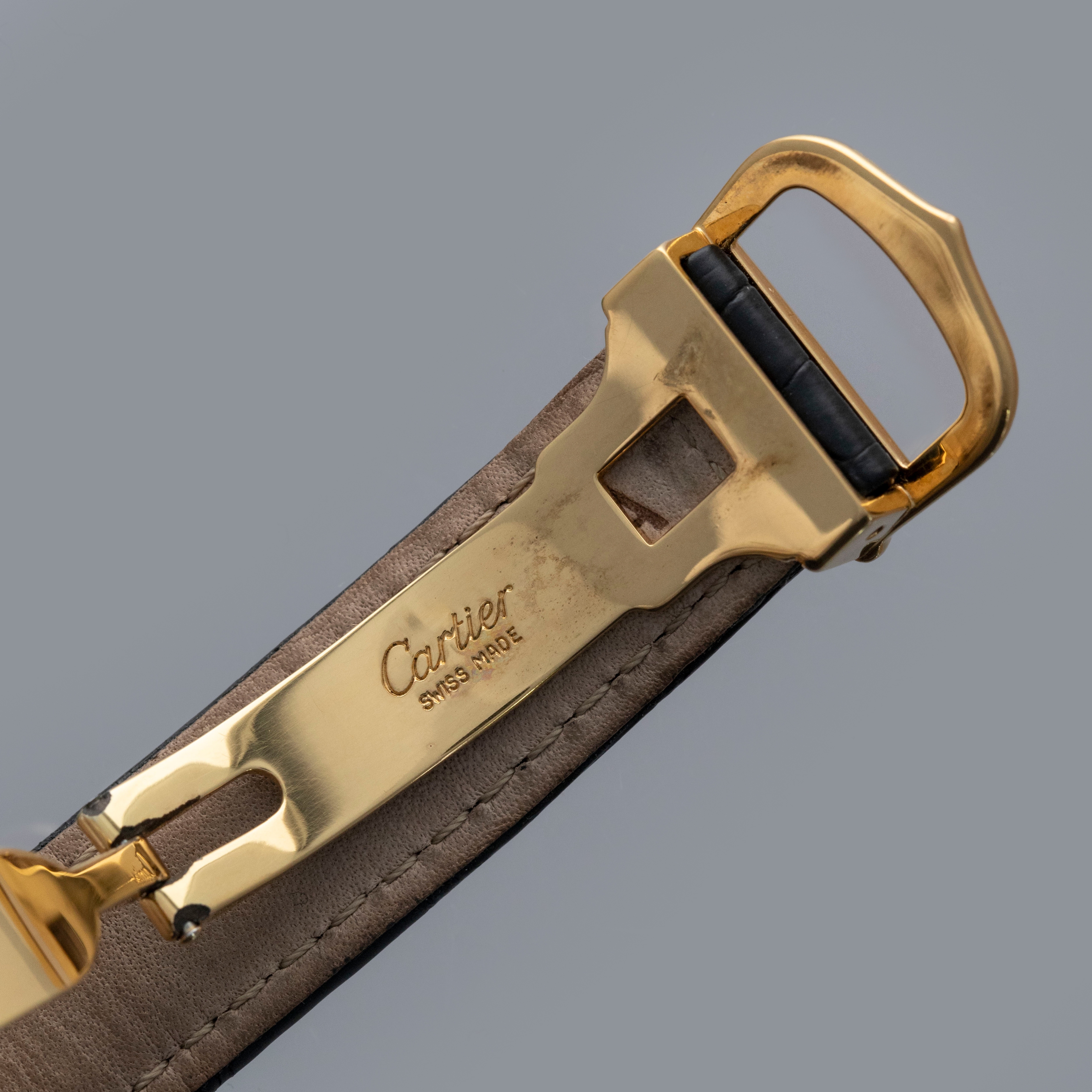 Watch is in overall excellent condition. The yellow gold case shows surface scratches and small marks, with some gentle rubbing visible to the engravings and hallmarks on the case back. There is some tarnishing to the chain holder on the case side, while the diamond-set crown remains excellent. The diamonds and settings on the front grill are all excellent. It is fitted with a Cartier alligator leather strap in very good condition and a gold-plated deployant clasp showing wear to the finish, particularly on the outer clasp.