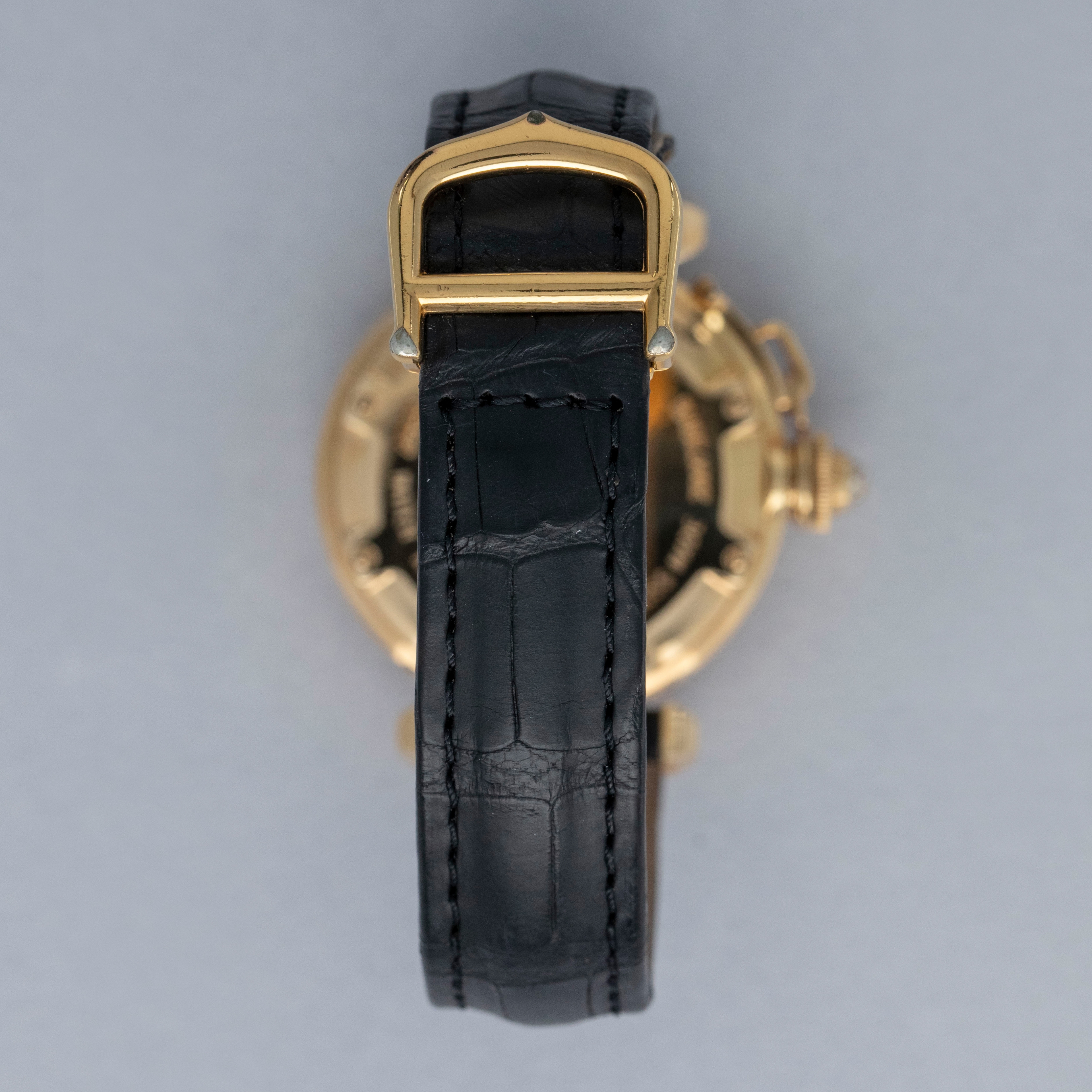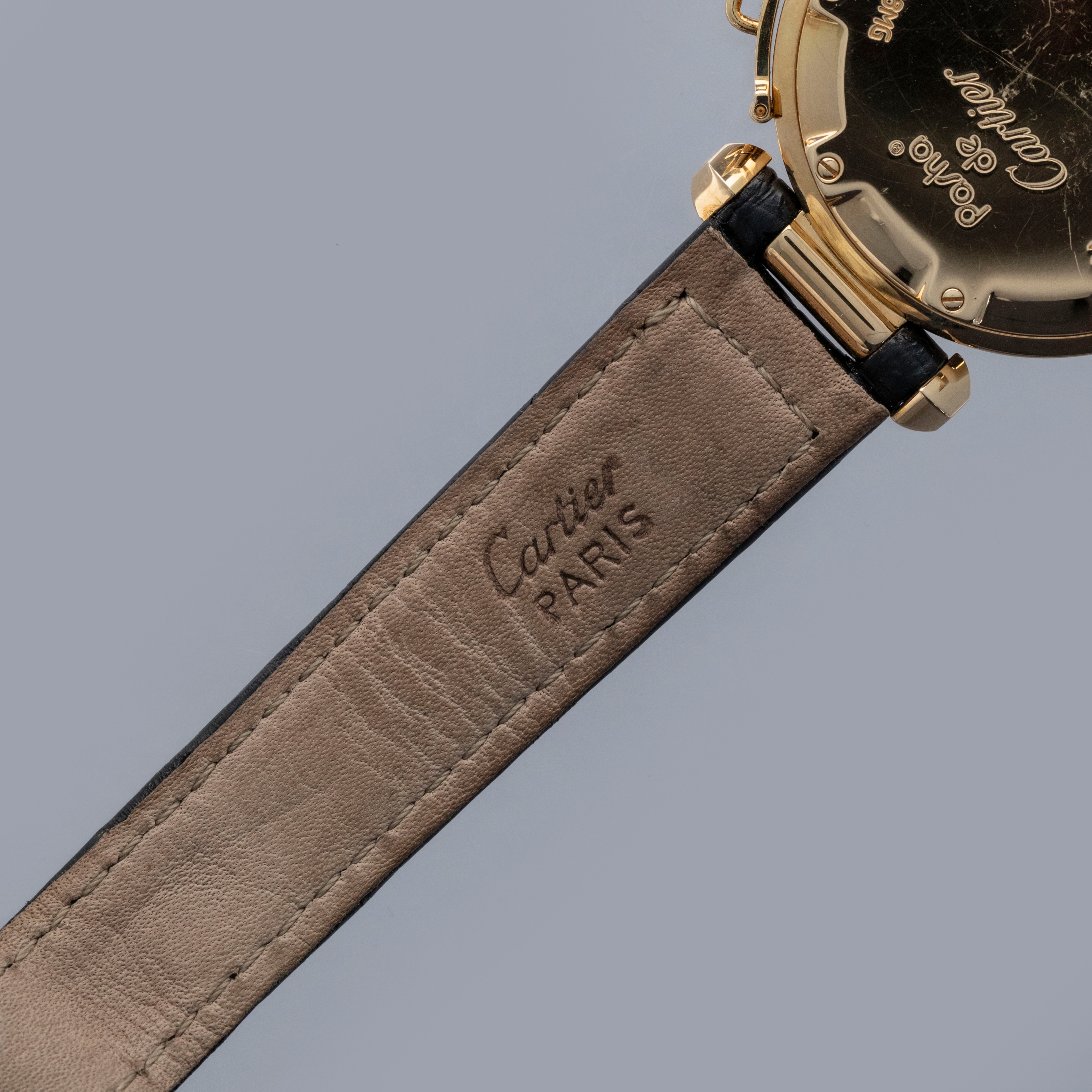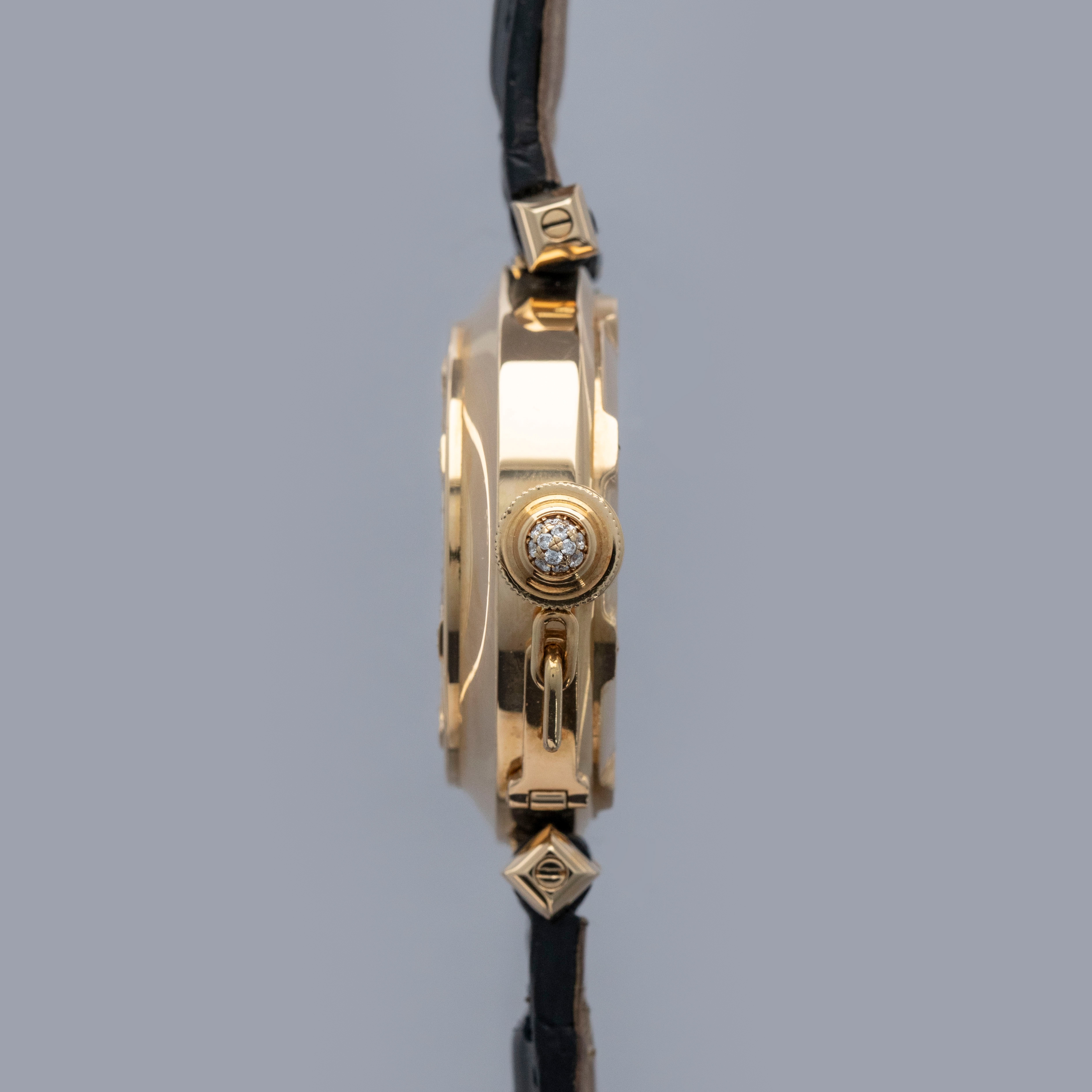Watch is in overall excellent condition. The yellow gold case shows surface scratches and small marks, with some gentle rubbing visible to the engravings and hallmarks on the case back. There is some tarnishing to the chain holder on the case side, while the diamond-set crown remains excellent. The diamonds and settings on the front grill are all excellent. It is fitted with a Cartier alligator leather strap in very good condition and a gold-plated deployant clasp showing wear to the finish, particularly on the outer clasp.