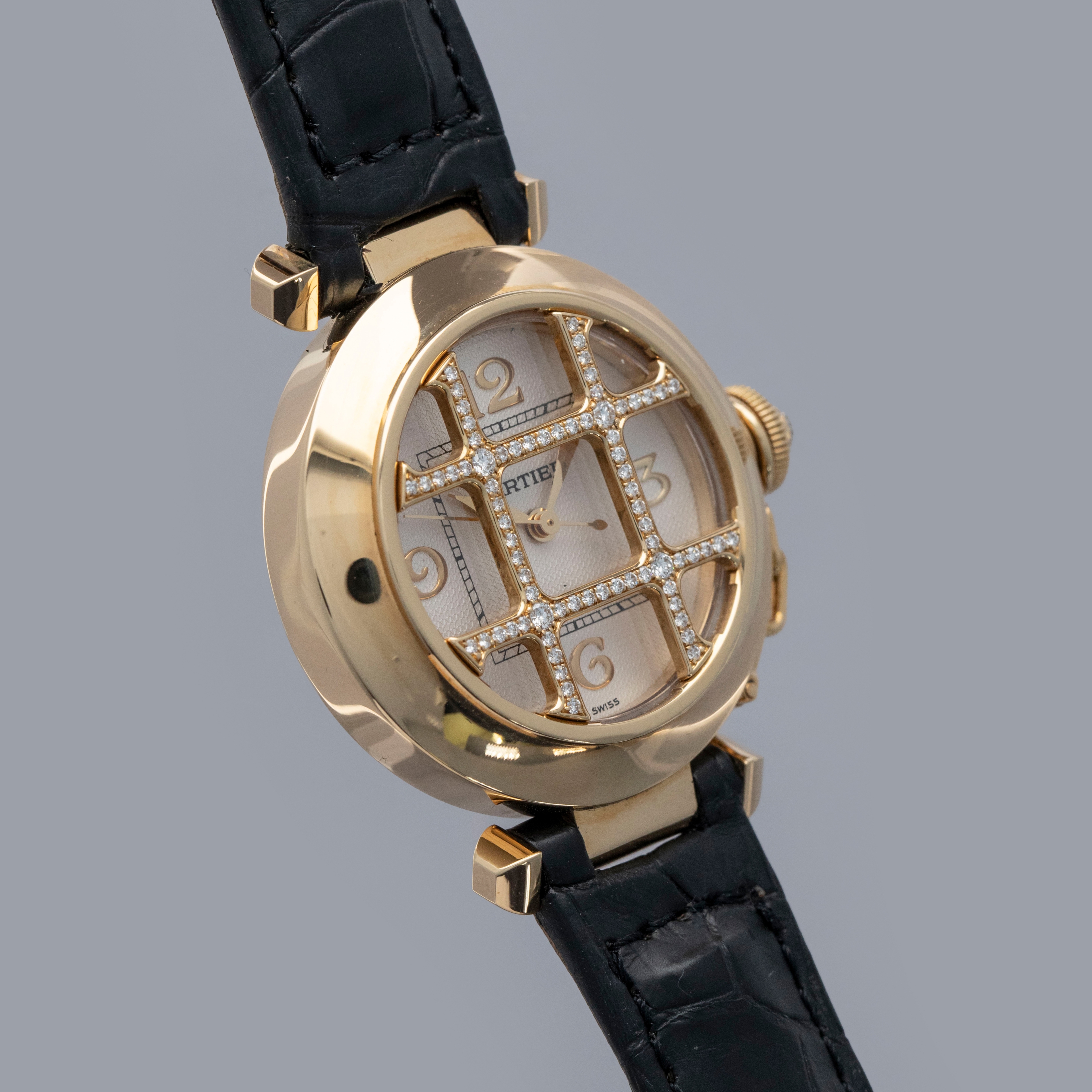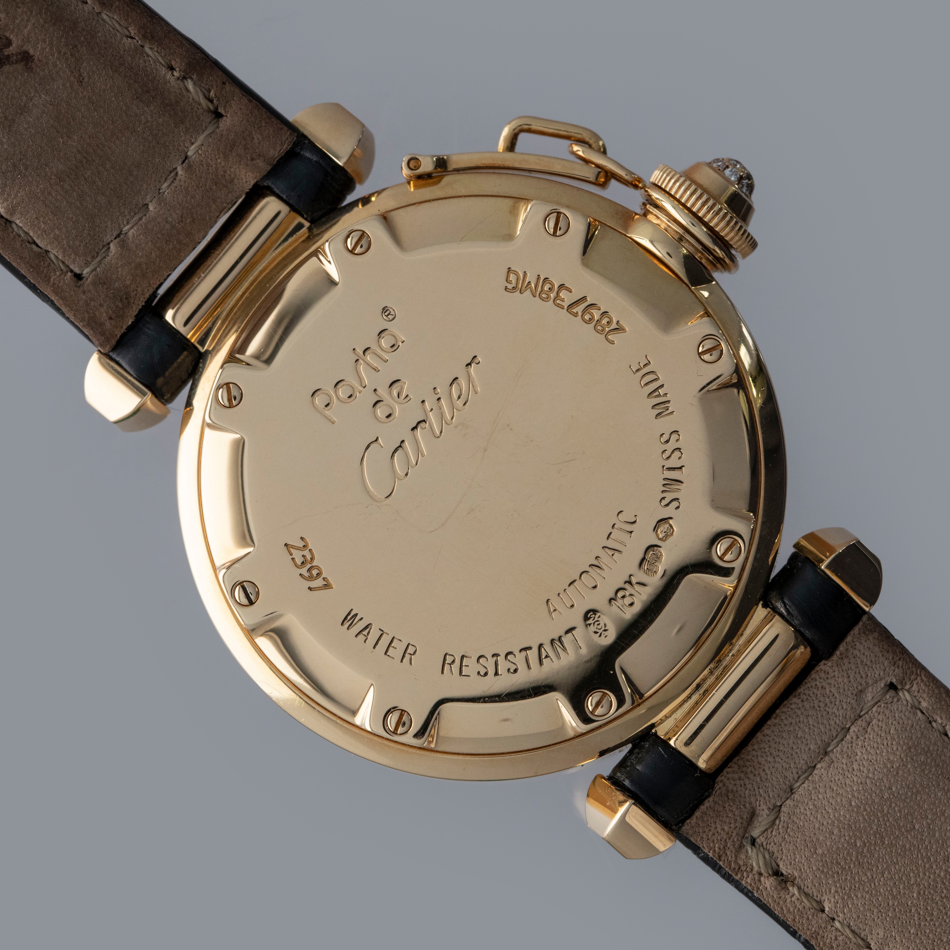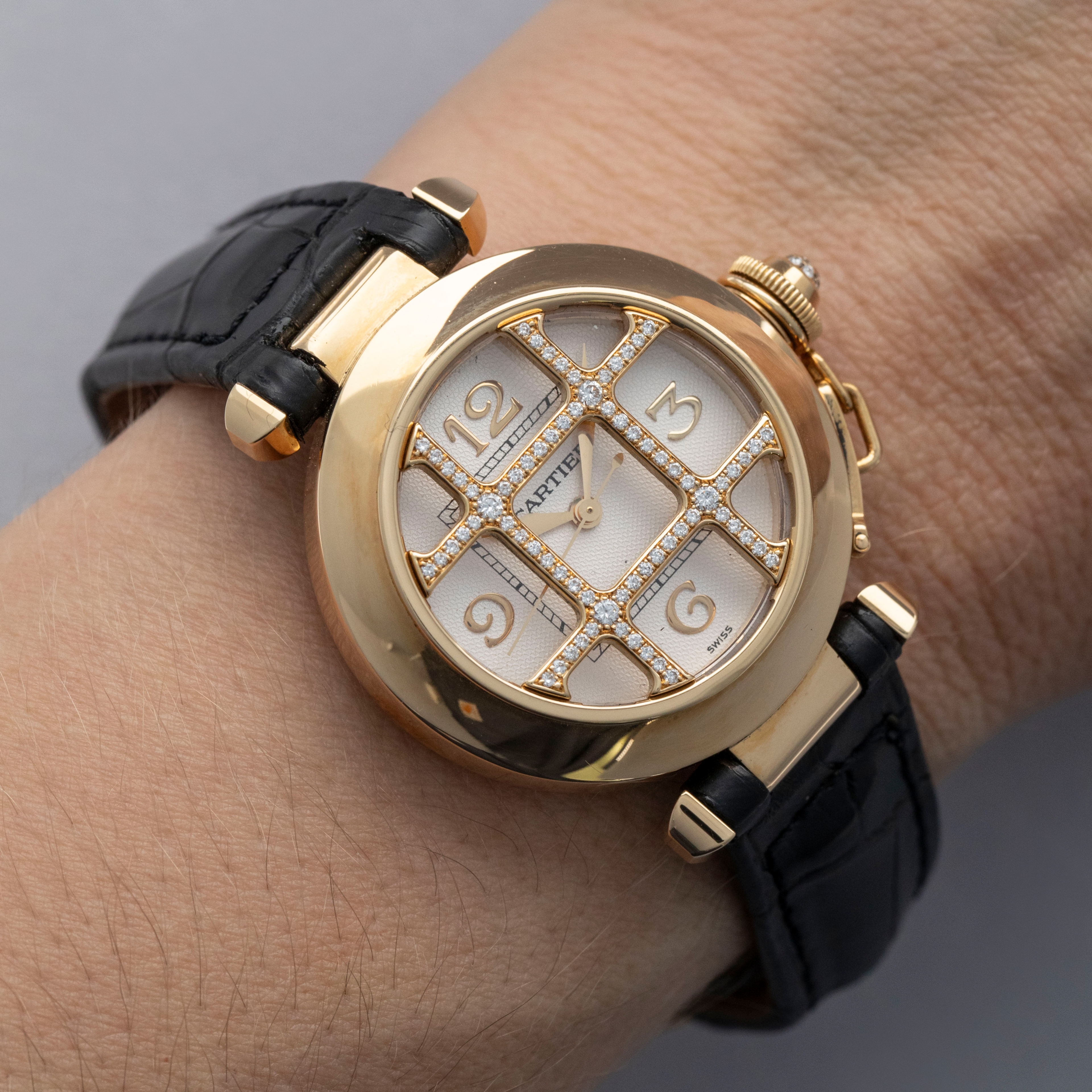An exceptional combination of Cartier's design prowess, the Pasha's history, and Cartier's general capacity as a fine watchmaker and jeweler, the ref. 2397's diamond-set grill and 18kt yellow gold construction combine to create a true feast for the eyes.