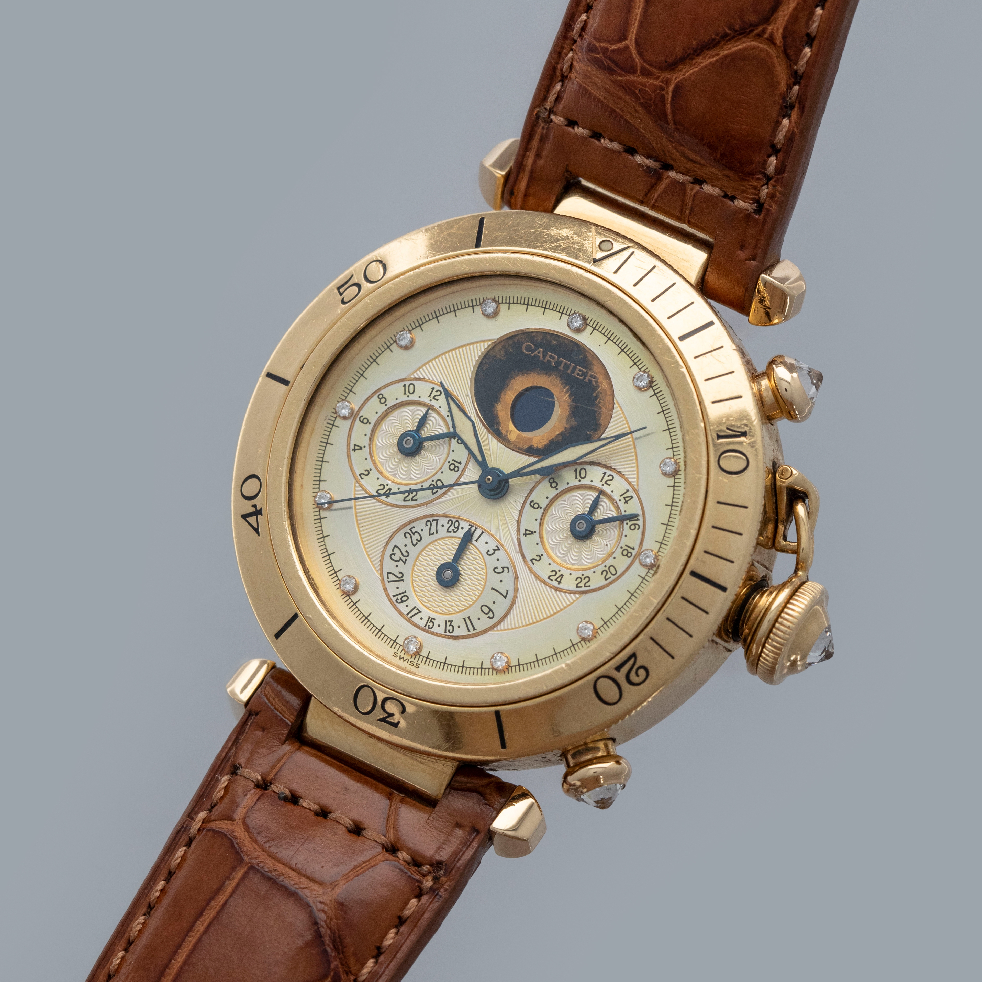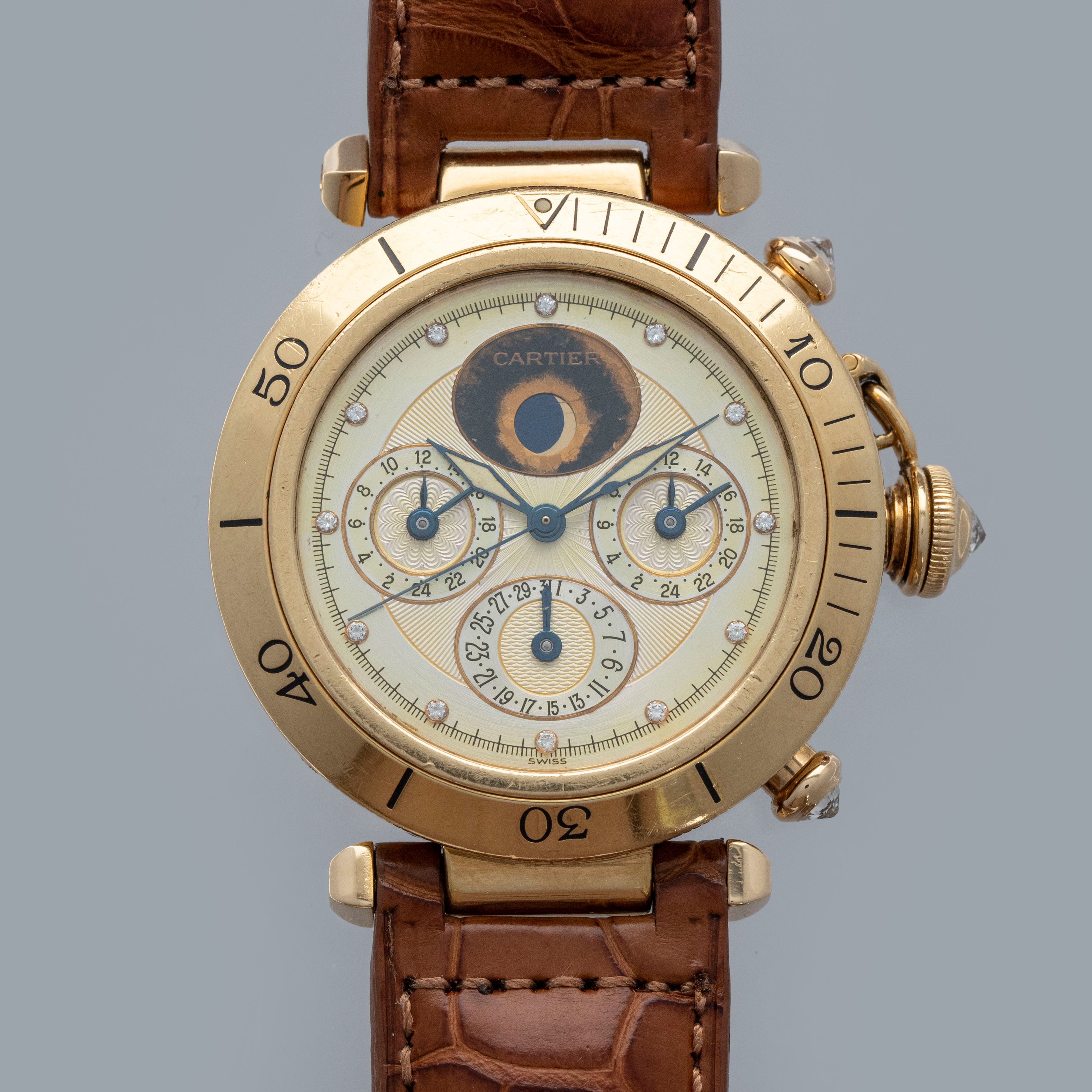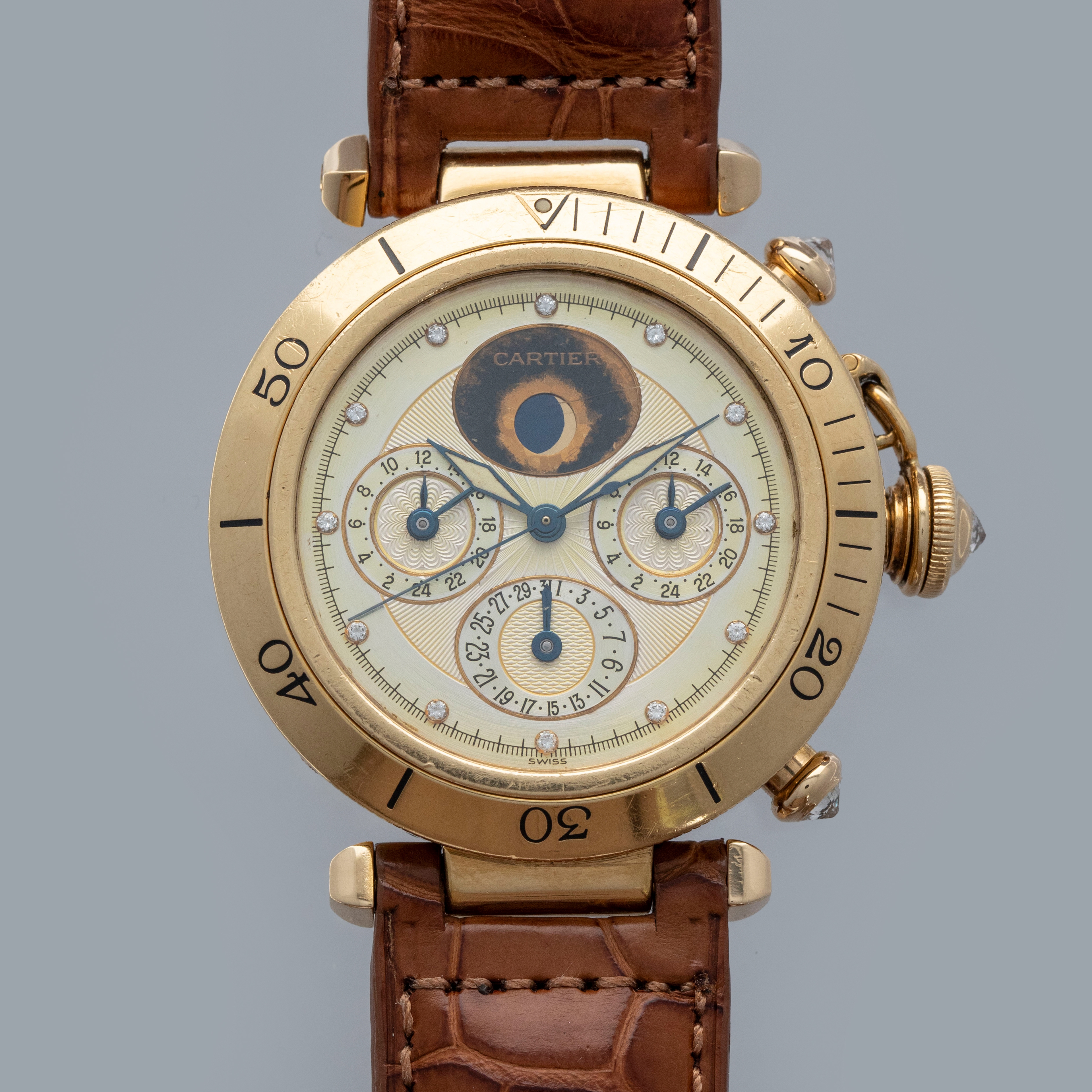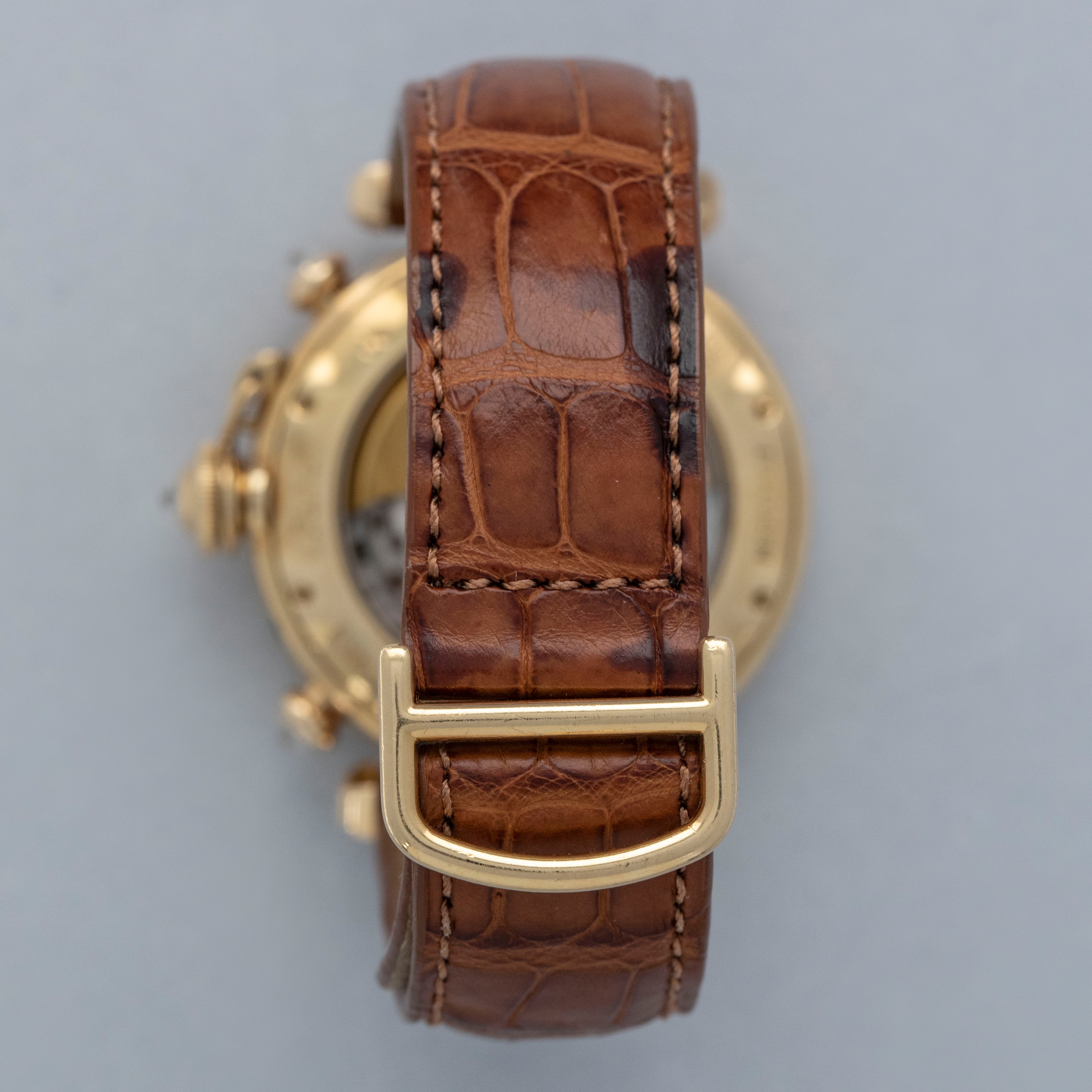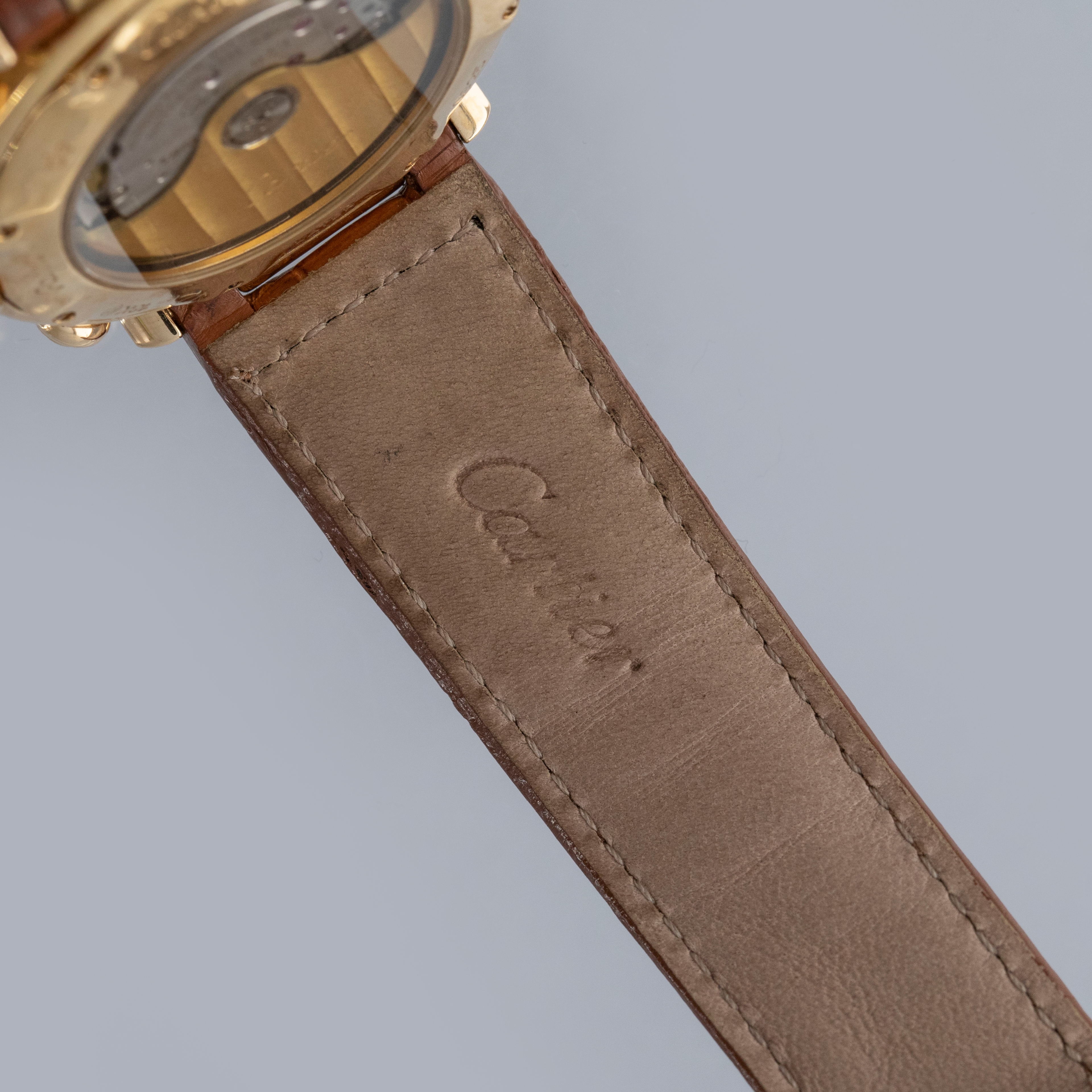 The watch is in overall very good condition. The yellow gold case has scratches and small nicks, particularly noticeable on the bezel. The display case back shows some wear to the stamps and hallmarks. The diamond-topped crown and pushers have surface marks. The dial has visible discoloration across the white outer chapter ring and sub dials, along with light surface marks. Crystal has some visible surface scratches. The guilloché sections also show some discoloration, and the moonphase aperture exhibits signs of degradation. The blued hands have some oxidation. It is fitted with a brown alligator Cartier strap with yellow gold deployant clasp in excellent condition.