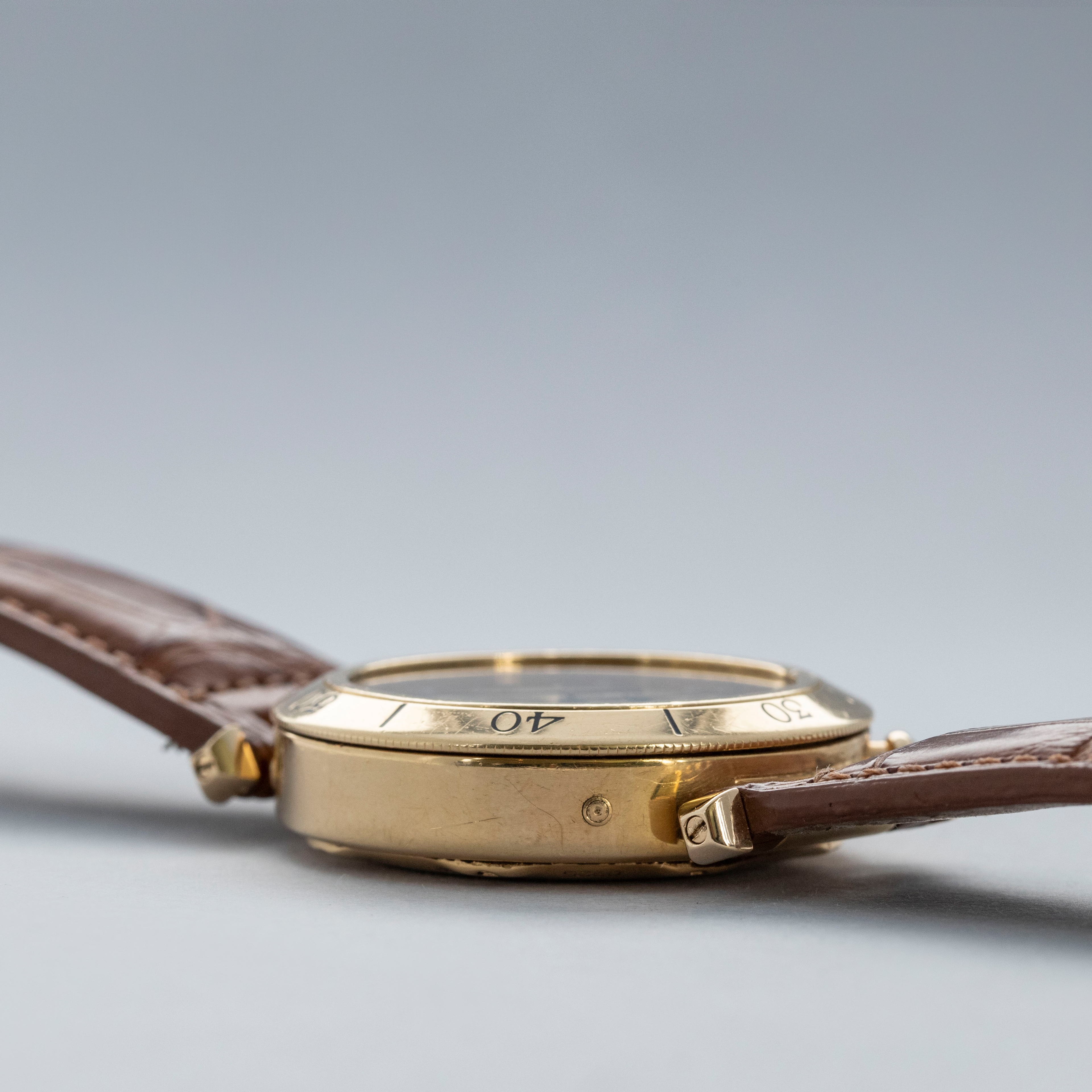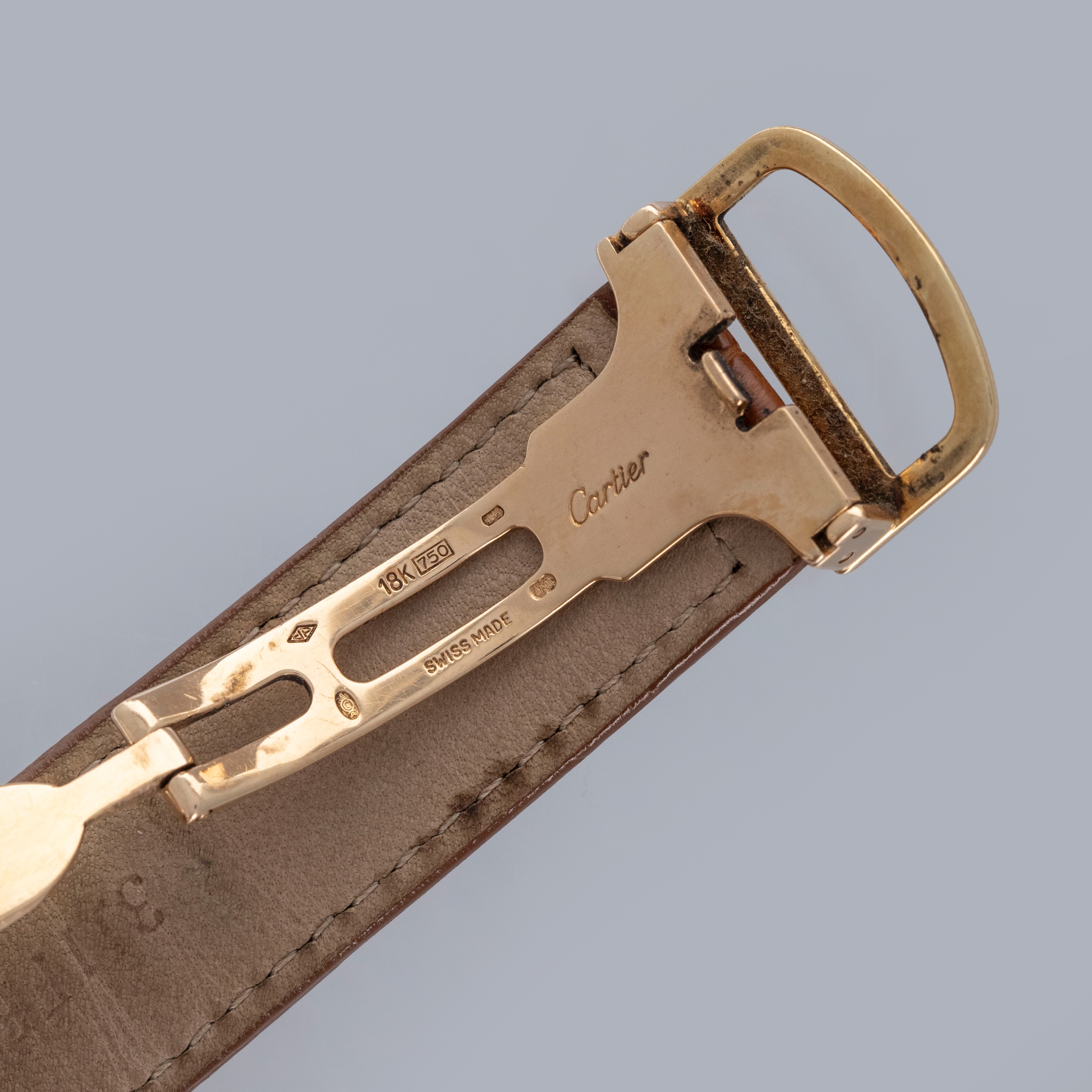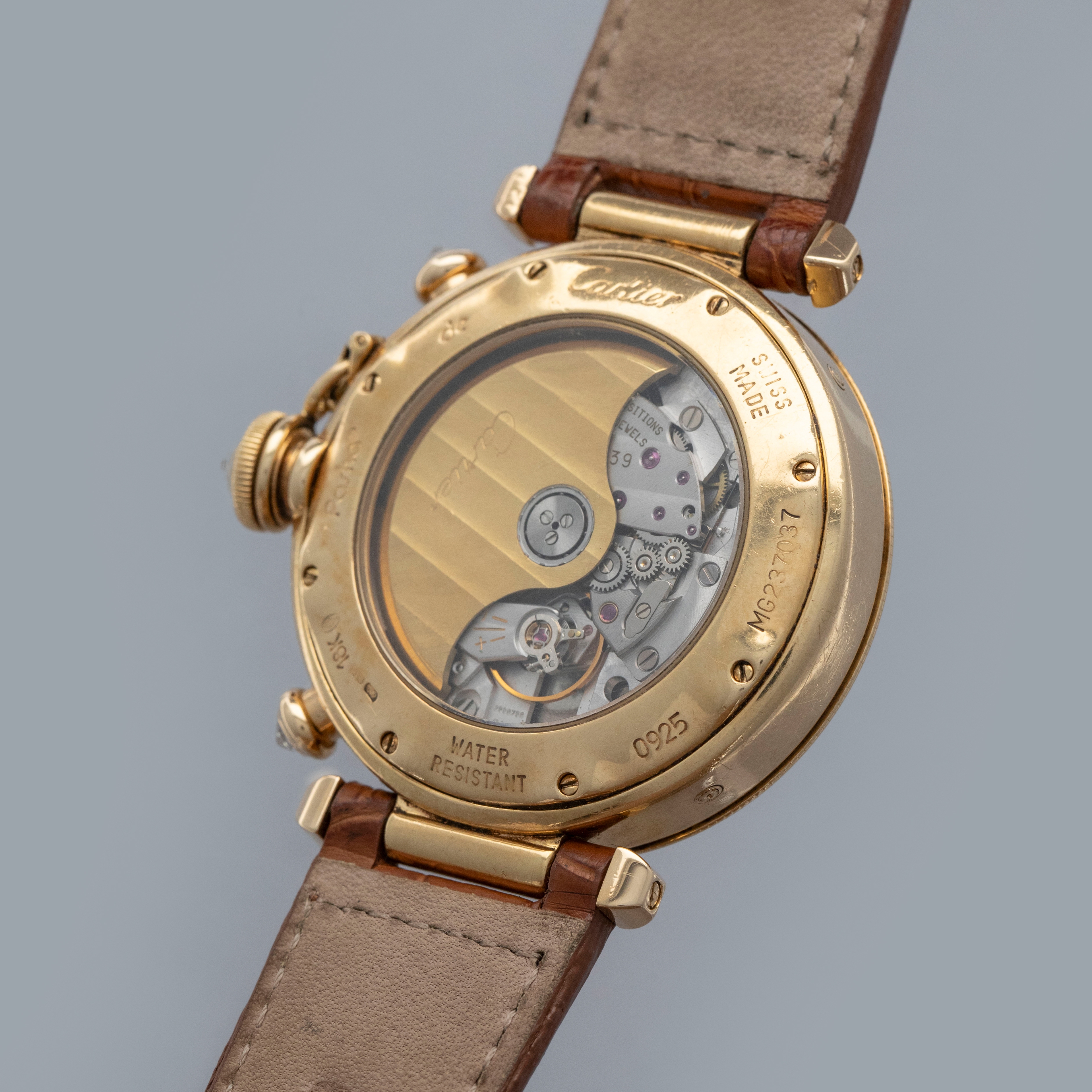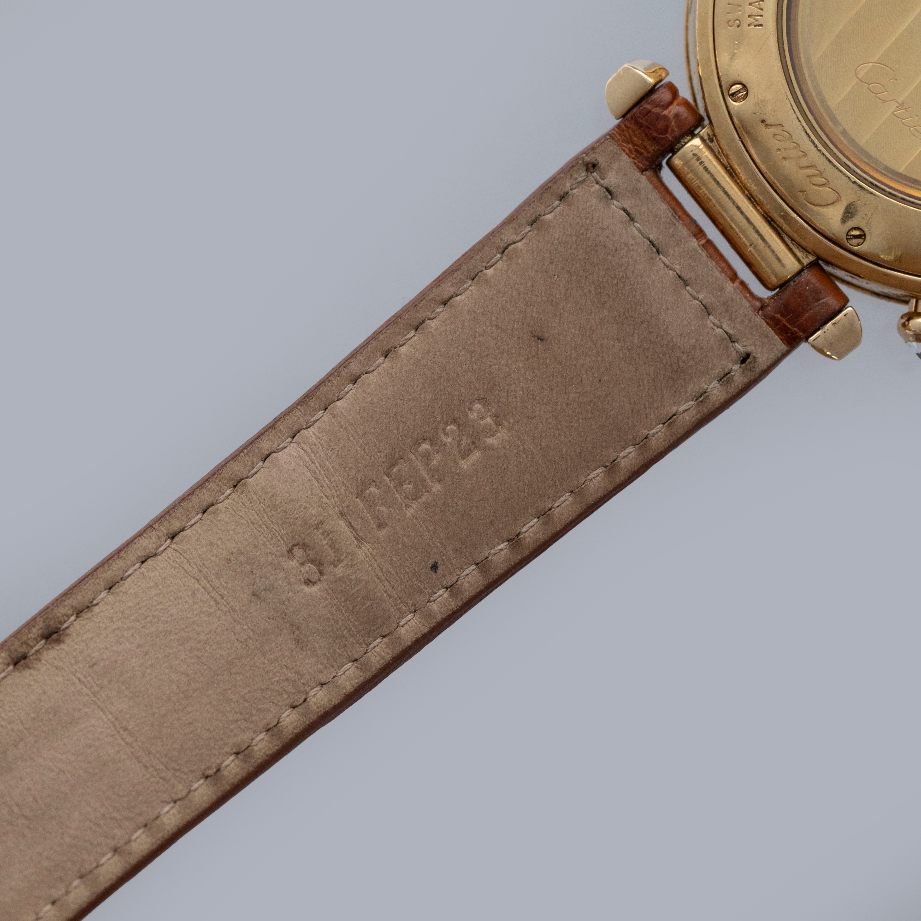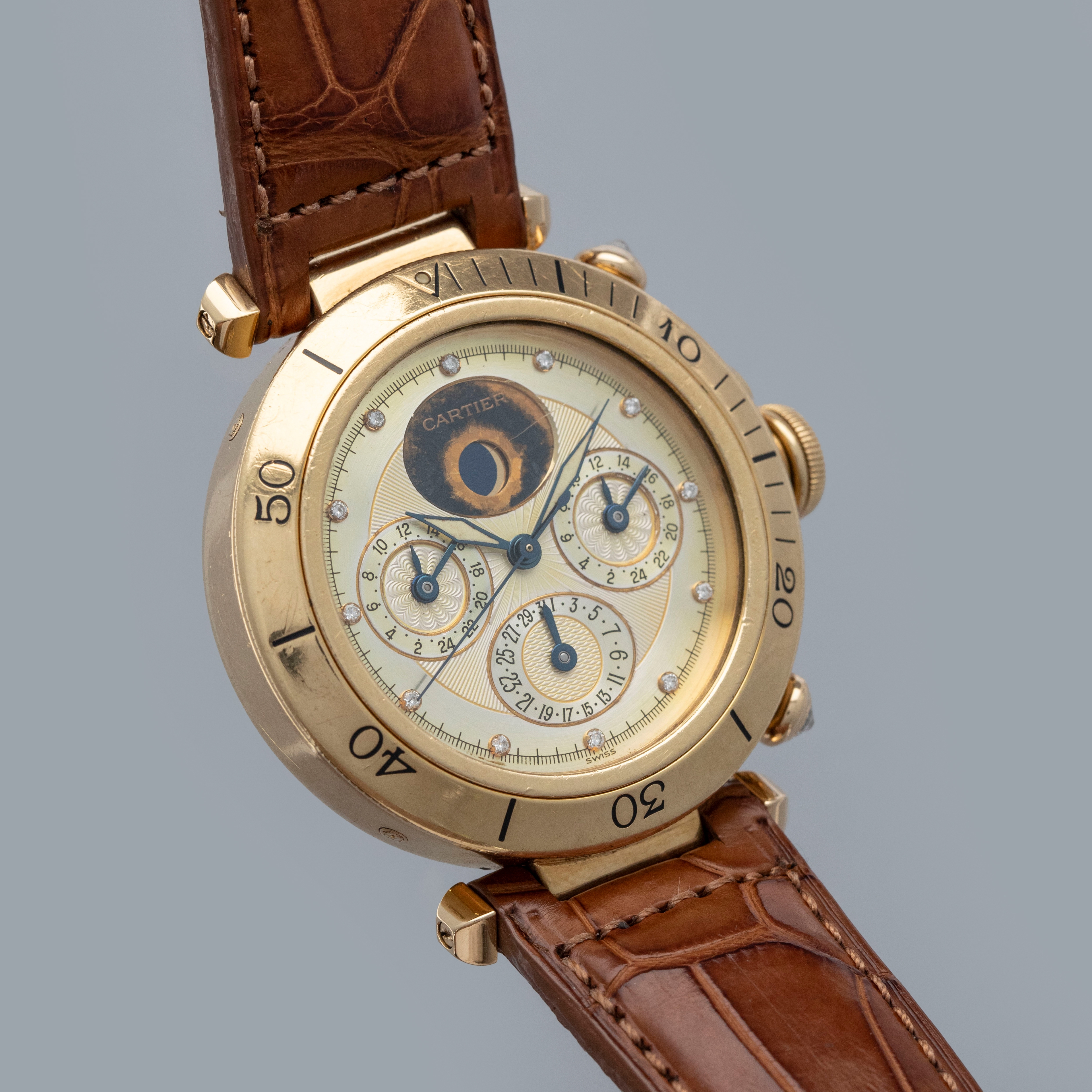 The watch is in overall very good condition. The yellow gold case has scratches and small nicks, particularly noticeable on the bezel. The display case back shows some wear to the stamps and hallmarks. The diamond-topped crown and pushers have surface marks. The dial has visible discoloration across the white outer chapter ring and sub dials, along with light surface marks. Crystal has some visible surface scratches. The guilloché sections also show some discoloration, and the moonphase aperture exhibits signs of degradation. The blued hands have some oxidation. It is fitted with a brown alligator Cartier strap with yellow gold deployant clasp in excellent condition.