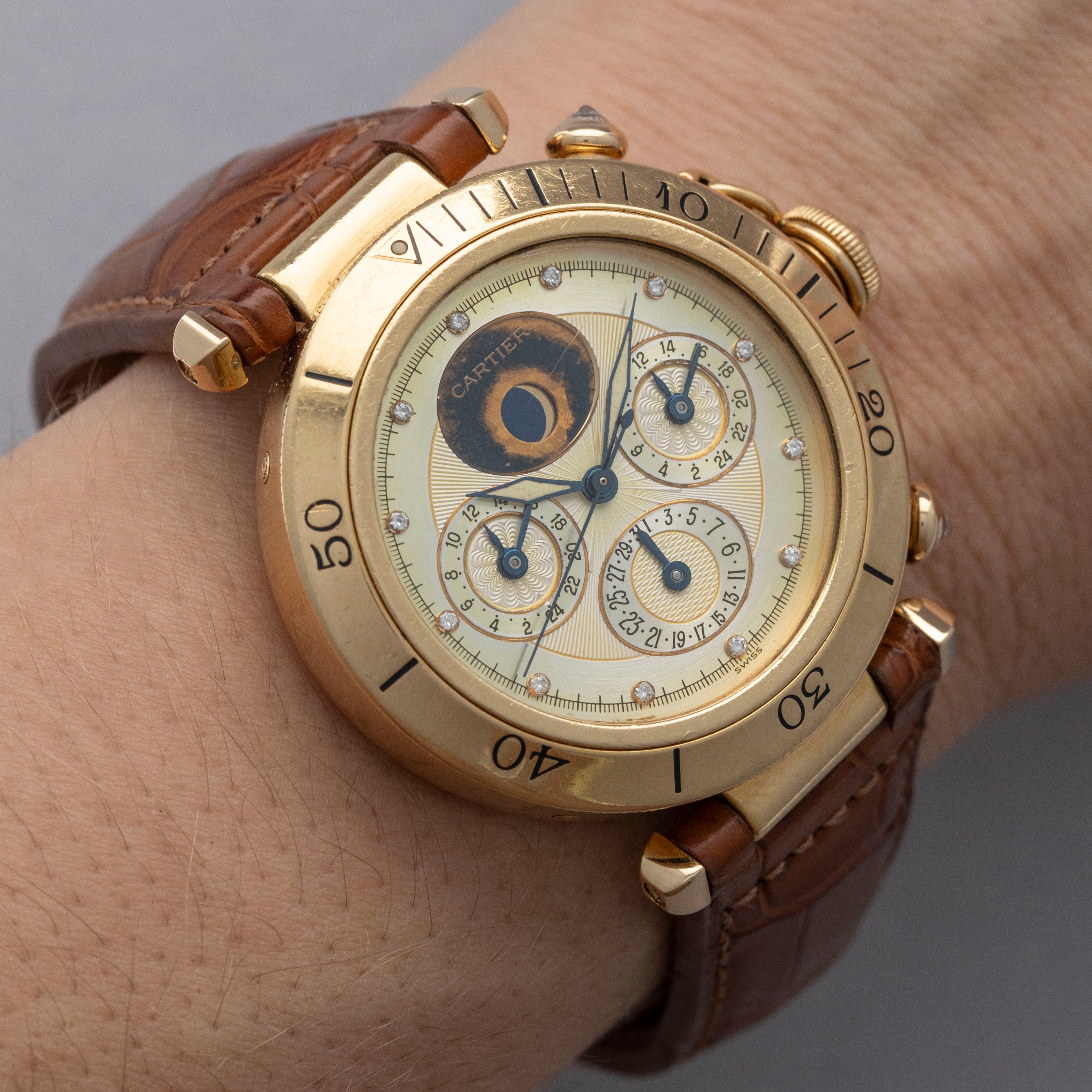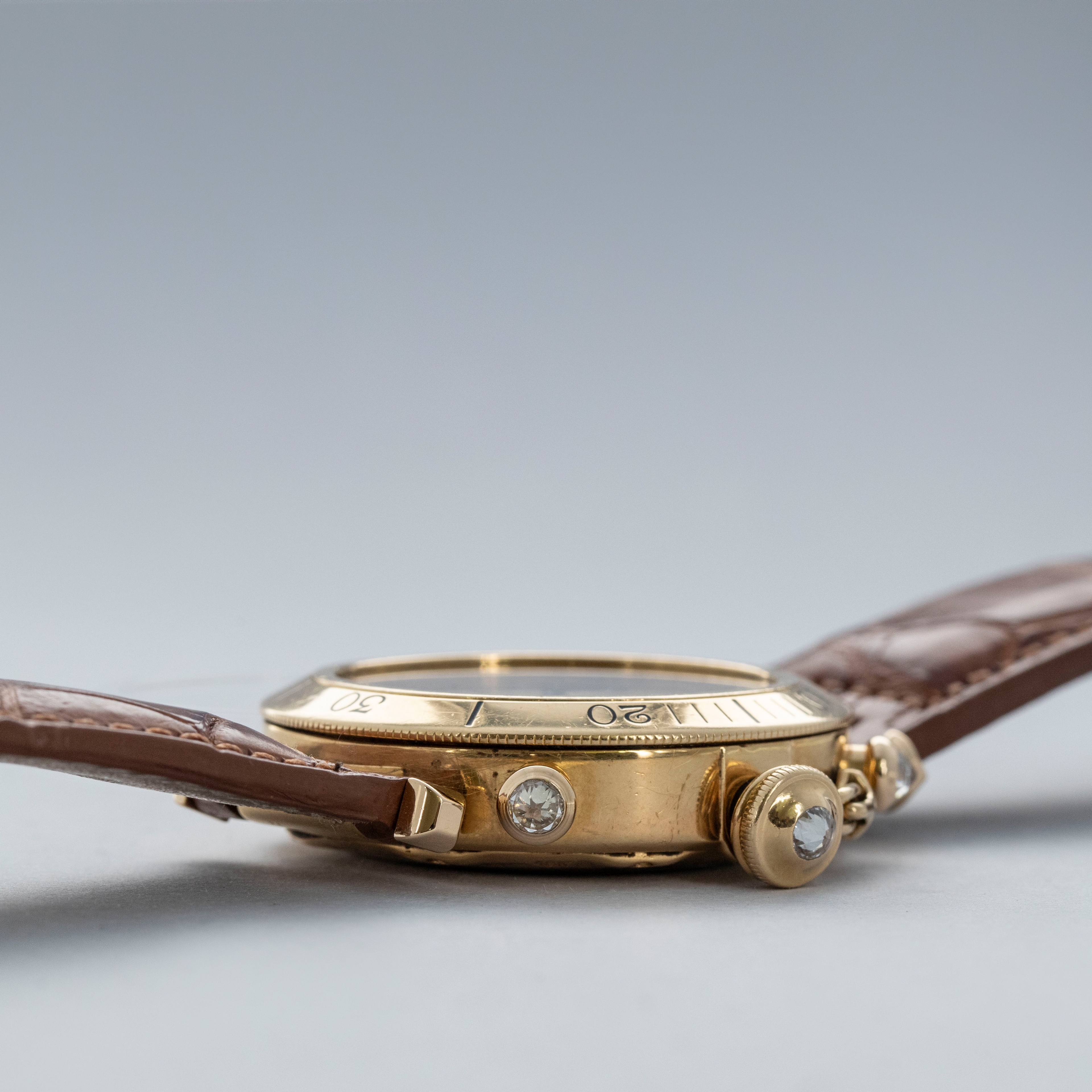 A wonderfully attractive watch that pulls on the heartstrings of Cartier collectors, the Pasha breaks from aesthetic norms and celebrates Cartier's willingness to do new things. Furthermore, with its practical complications, this example perfectly fits the Pasha's original design brief from The Pasha of Marrakesh, Thami El Glaoui, as a practical watch that could do anything he needed it to.