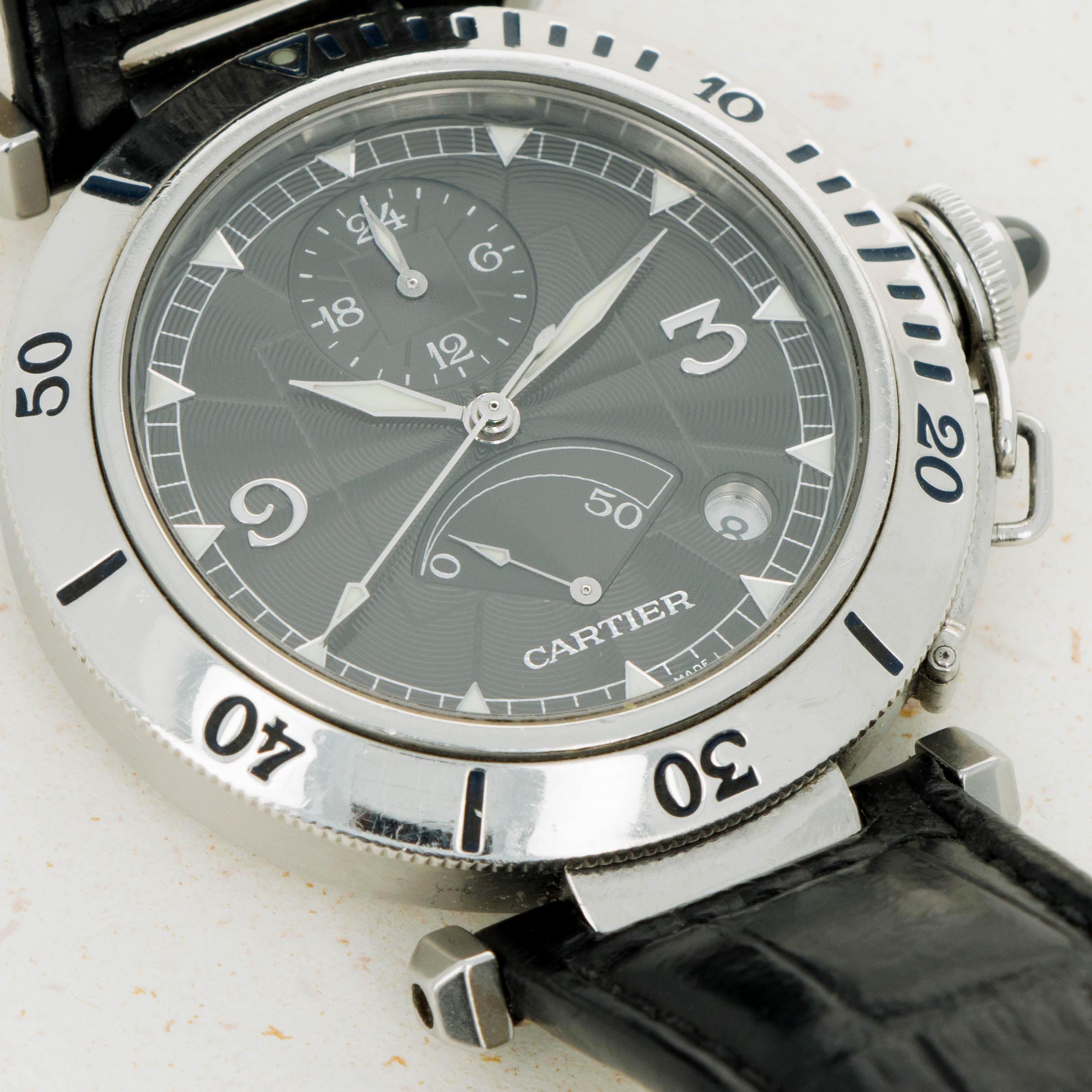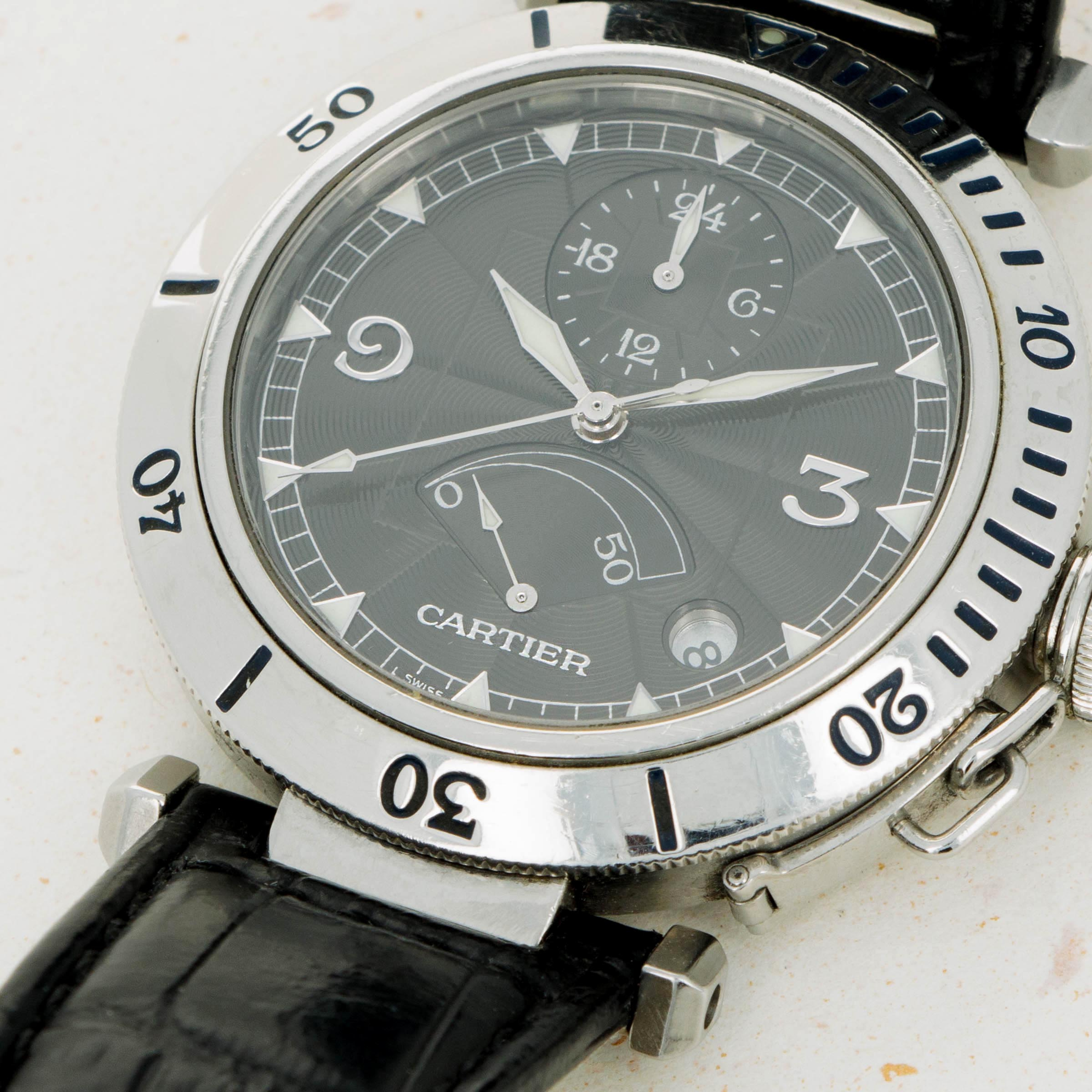 Much like a lot of Cartier’s catalog, the Cartier Pasha has a long and storied history. According to legend, the Pasha was supposedly conceived by Louis Cartier for The Pasha of Marrakesh, Thami El Glaoui, in the early 1930s. As the story goes, The Pasha ordered a one-of-a-kind gold watch that could keep pace with his active lifestyle and boasted a level of water resistance that was uncommon at the time. Cartier’s answer was the Pasha; a large timepiece with a screw-down crown cover and metal grid that protected its dial. During the Quartz Crisis, Cartier reached out to Gerald Genta in 1985, of Royal Oak and Nautilus fame, to design a precious metal luxury sports watch that could capitalize on the growing market for such watches, like the gold Submariner at the time. Genta’s design was the Cartier Pasha as we know it today. It is a sizeable masculine timepiece with a sporty bezel, a unique screw-down crown cover, a clean dial, and its now-iconic Vendome lugs. The variant we have here is the dual-time GMT ref. 2388 with the rarer of two dial variants, the grey that was launched in 2000 to celebrate the new millennium. Featuring a blend of stunning guilloche engraving patterns across its surface, this example’s grey dial is quite exquisite, and it is perfectly matched by a grey Cartier alligator leather strap that is fastened by Cartier’s signature folding buckle. Perfectly sized at 38mm in diameter and boasting the Pasha’s atypical design, this example is a perfect example of everything that makes Cartier so special.