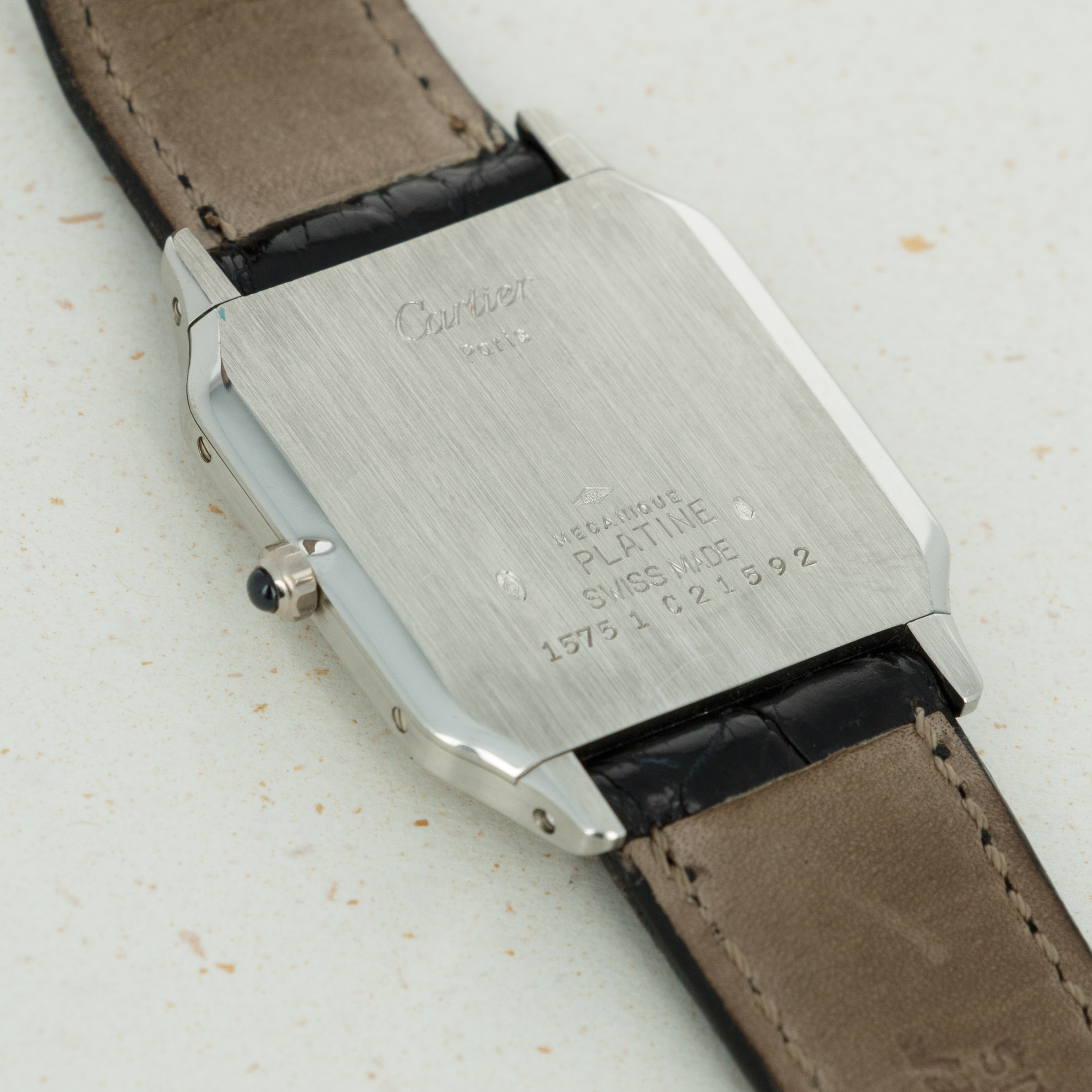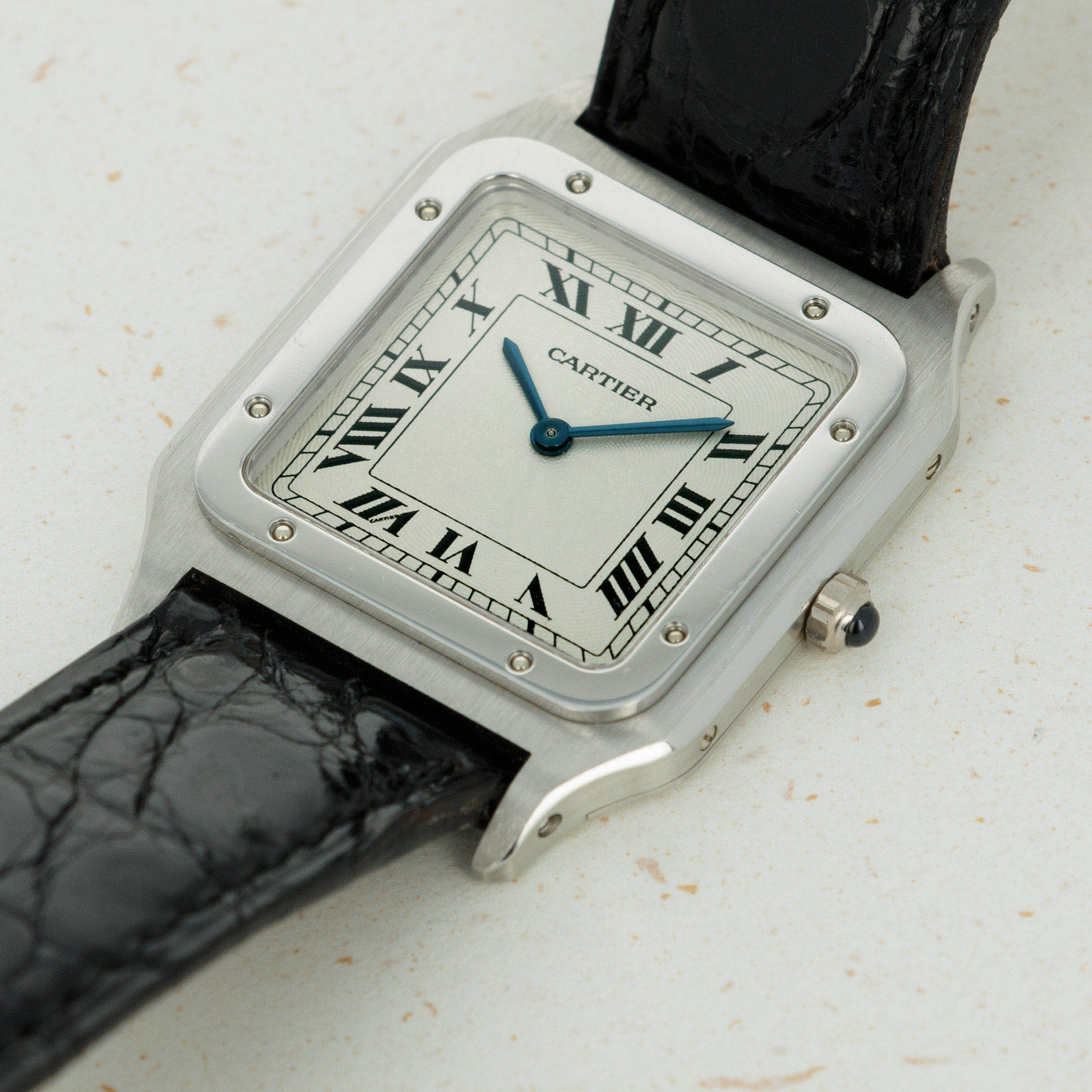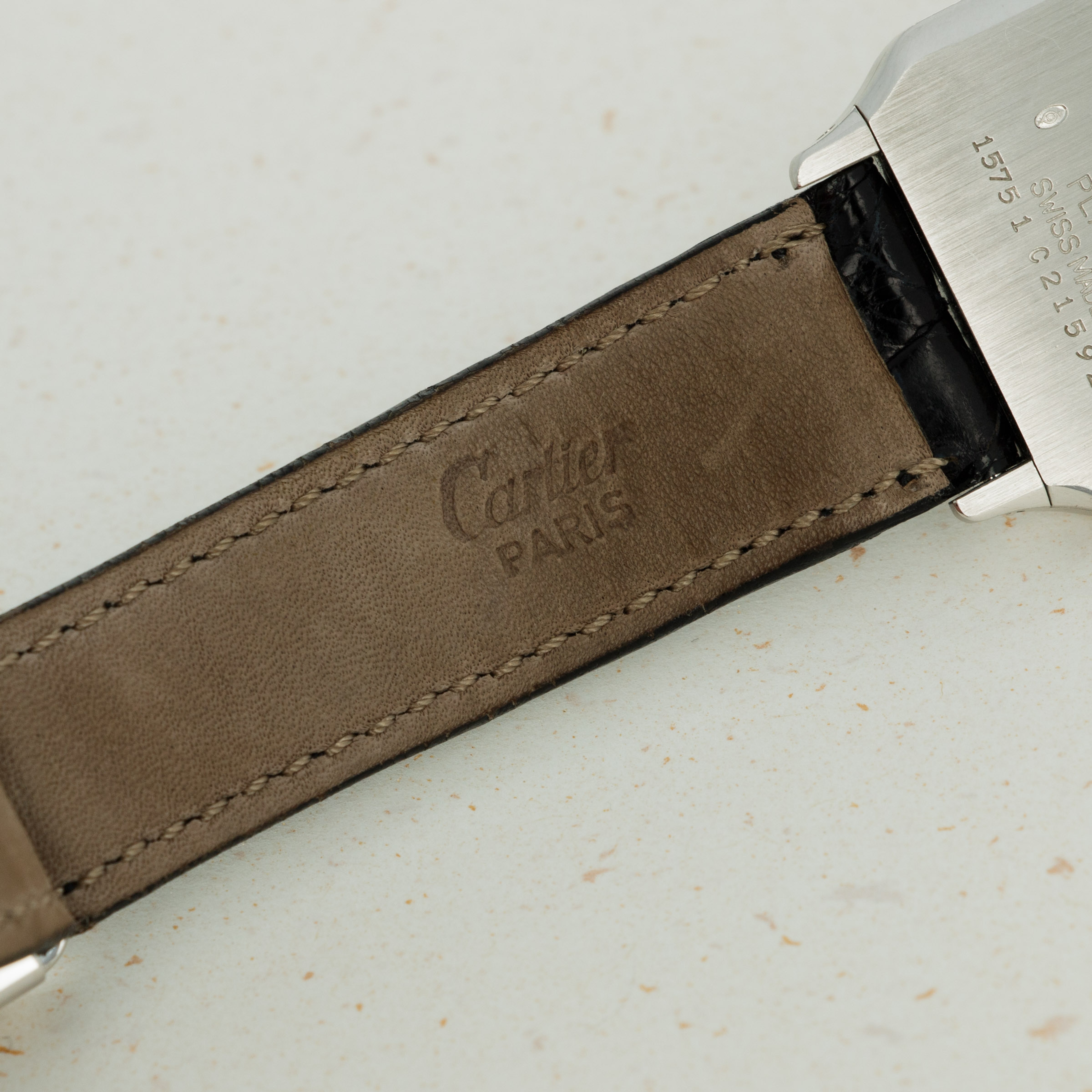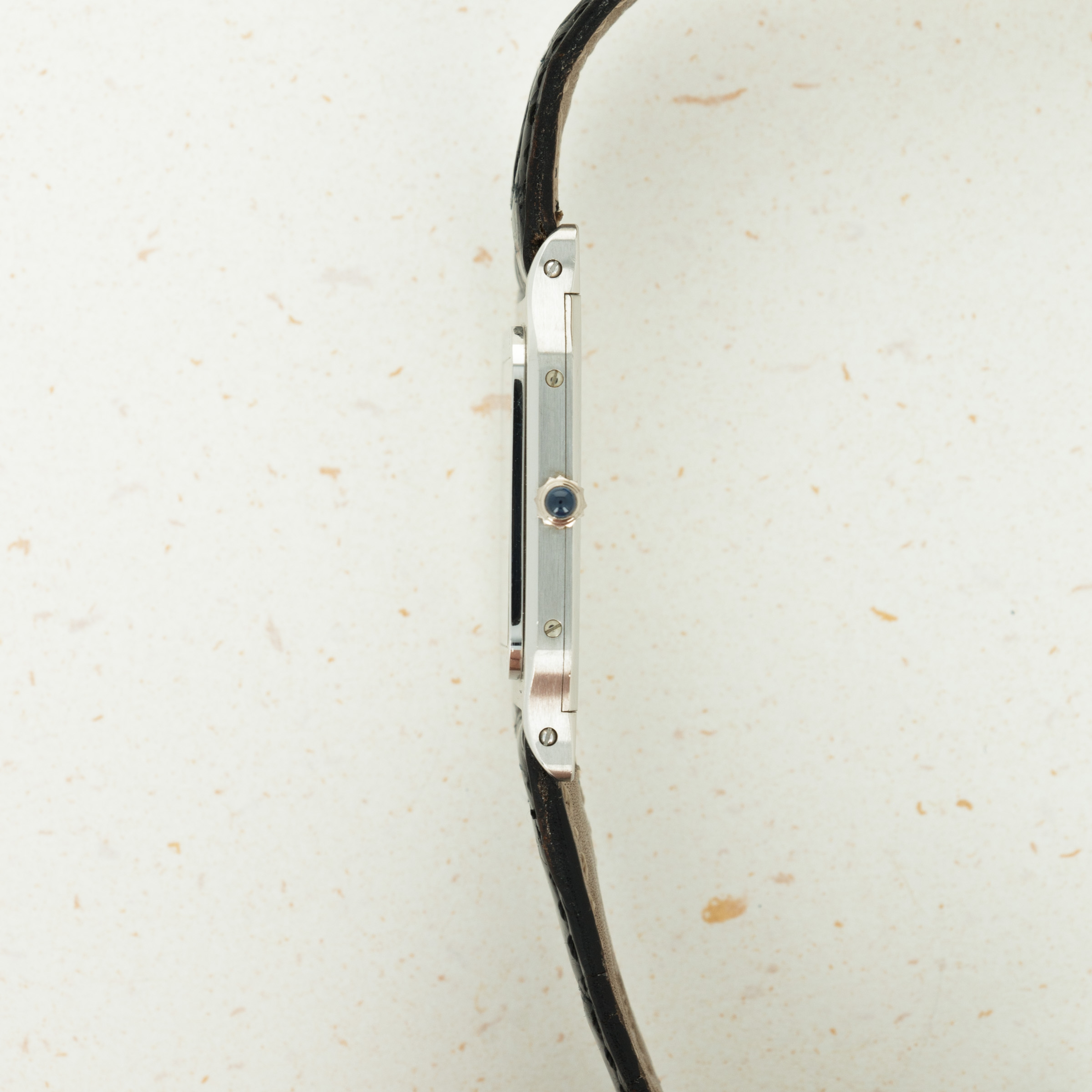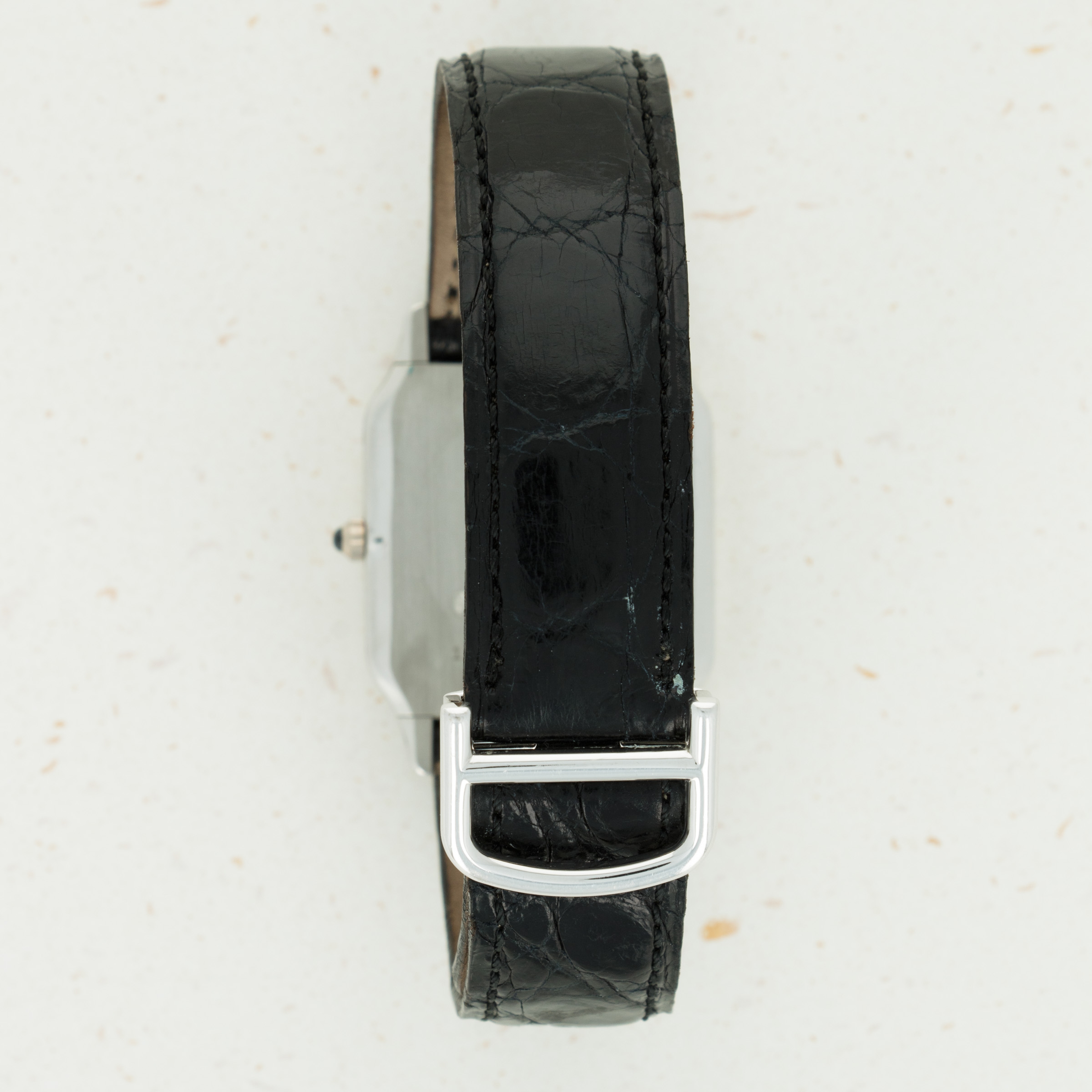 Going down in history as one of the first tool watches ever released, the Cartier Santos was designed by Louis Cartier at the request of famed Brazilian aviator Alberto Santos-Dumont in 1904, as he foresaw checking pocket watches in a cockpit becoming an issue as aviation developed. The very pinnacle of timeless design, the Santos has penetrated just about every corner of horology, as demonstrated by this 1990's-released ladies model, the ref 1575-1. A 27mm variant constructed of platinum, the ref. 1575-1 features a smooth round-edged bezel sitting atop a satin-brushed case with beautifully polished bevelling throughout. A remarkably slim watch, the ref. 1575-1 is powered by the exceptionally thin cal. 021 MC movement, which allows the timepiece to hug the wrist comfortably. Fitted with Cartier's classic silver dial featuring contrasting black Roman numerals within a railroad-style chapter ring and blued steel hands, the ref. 1575-1's dial is exceptionally classy, in keeping with its overall aesthetic of grace and decorum.