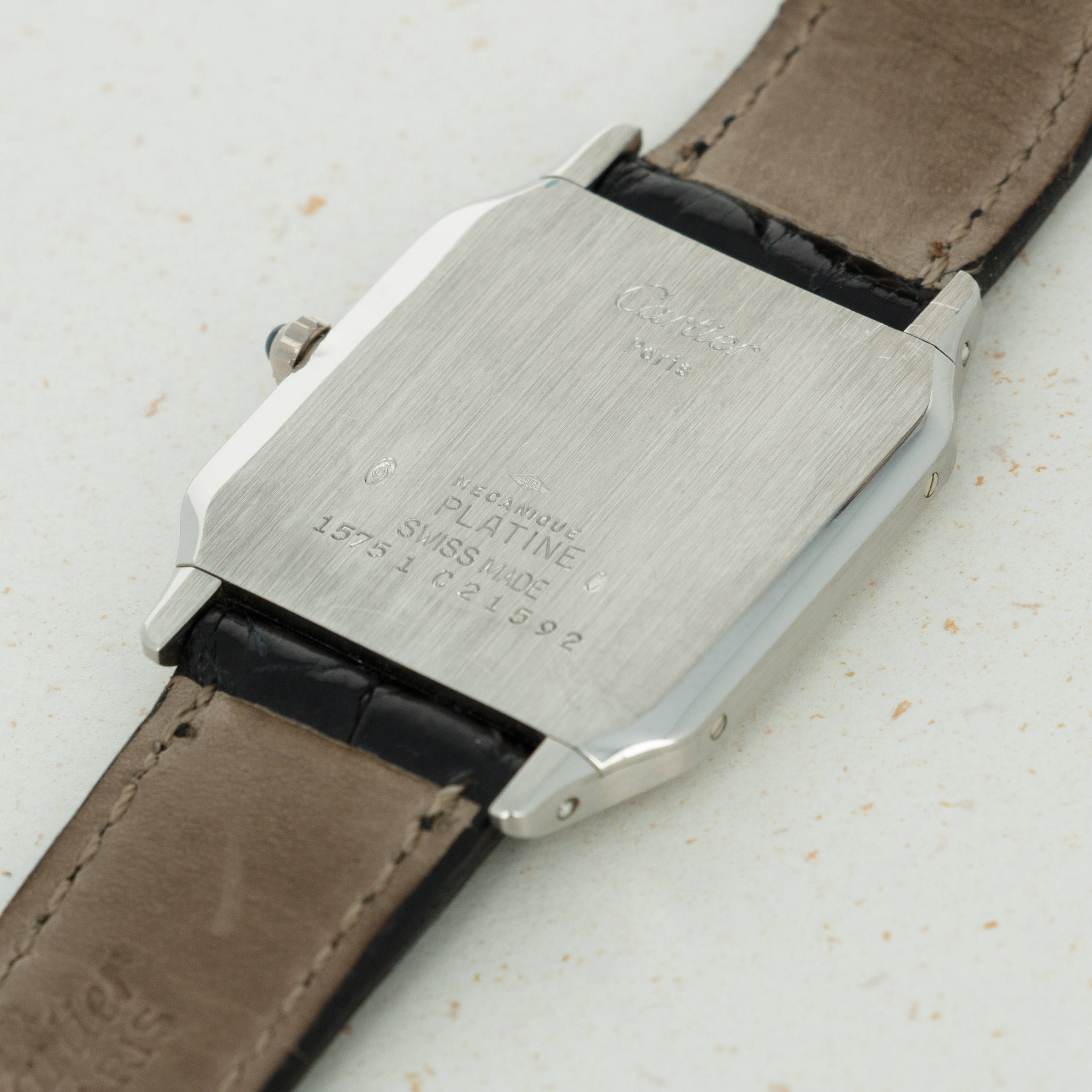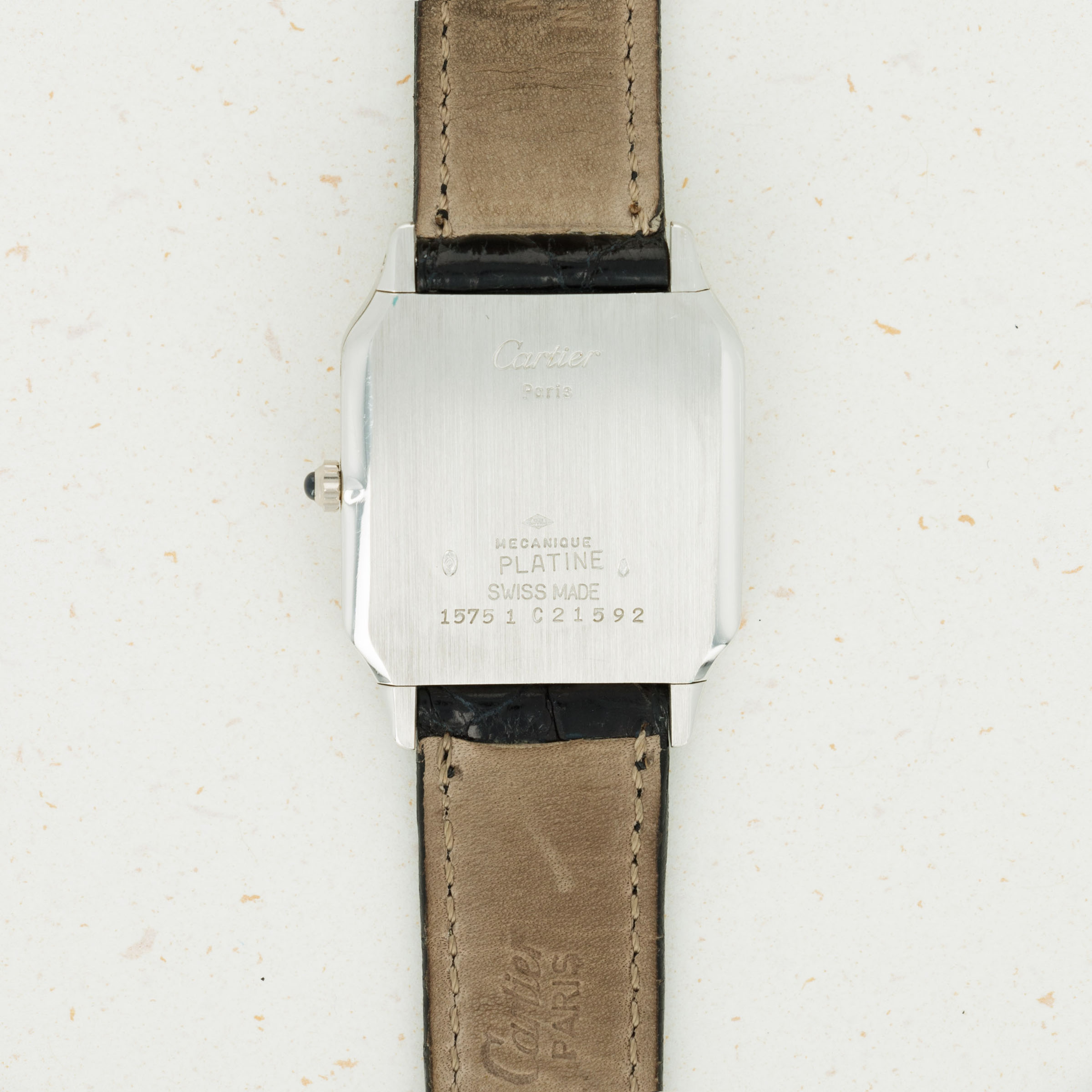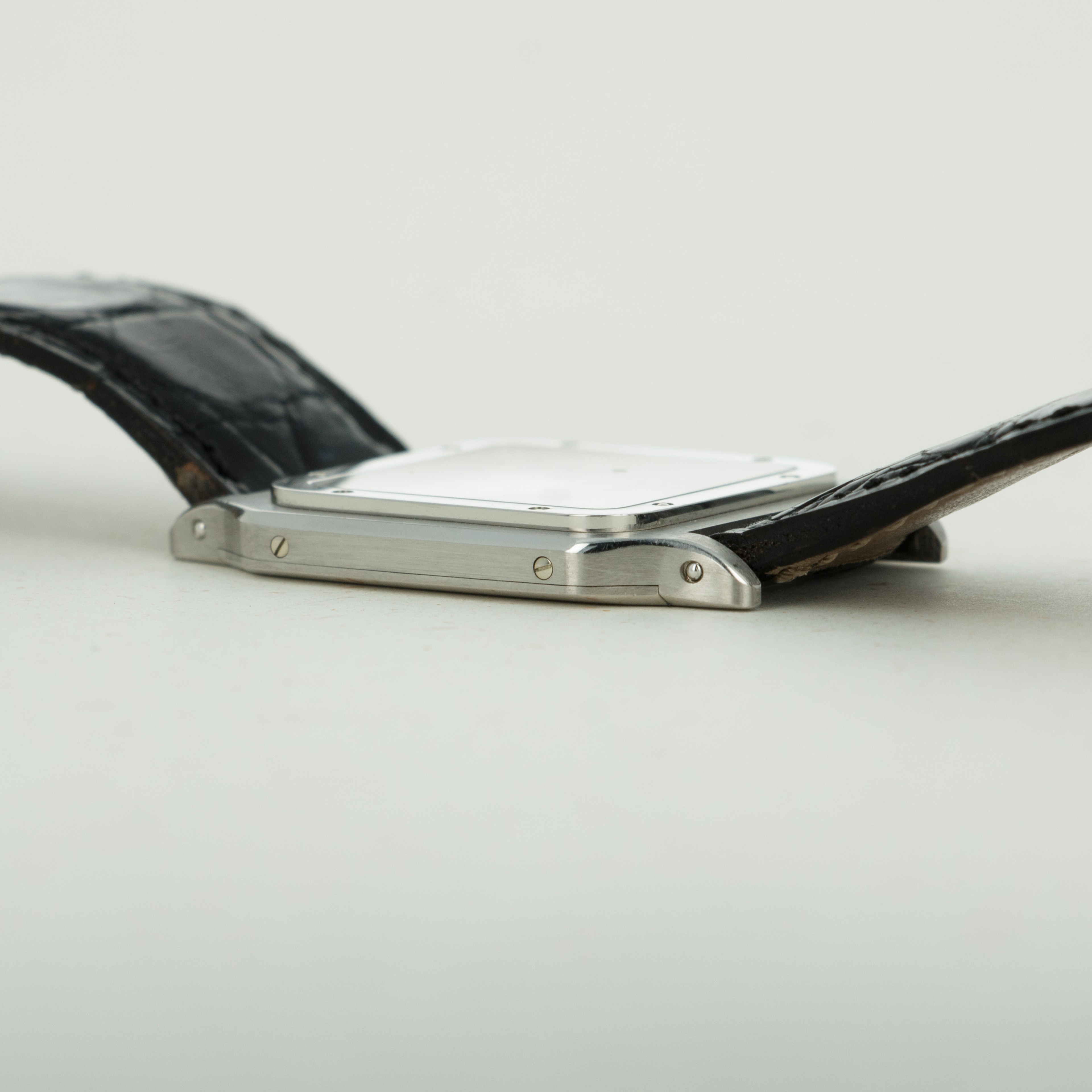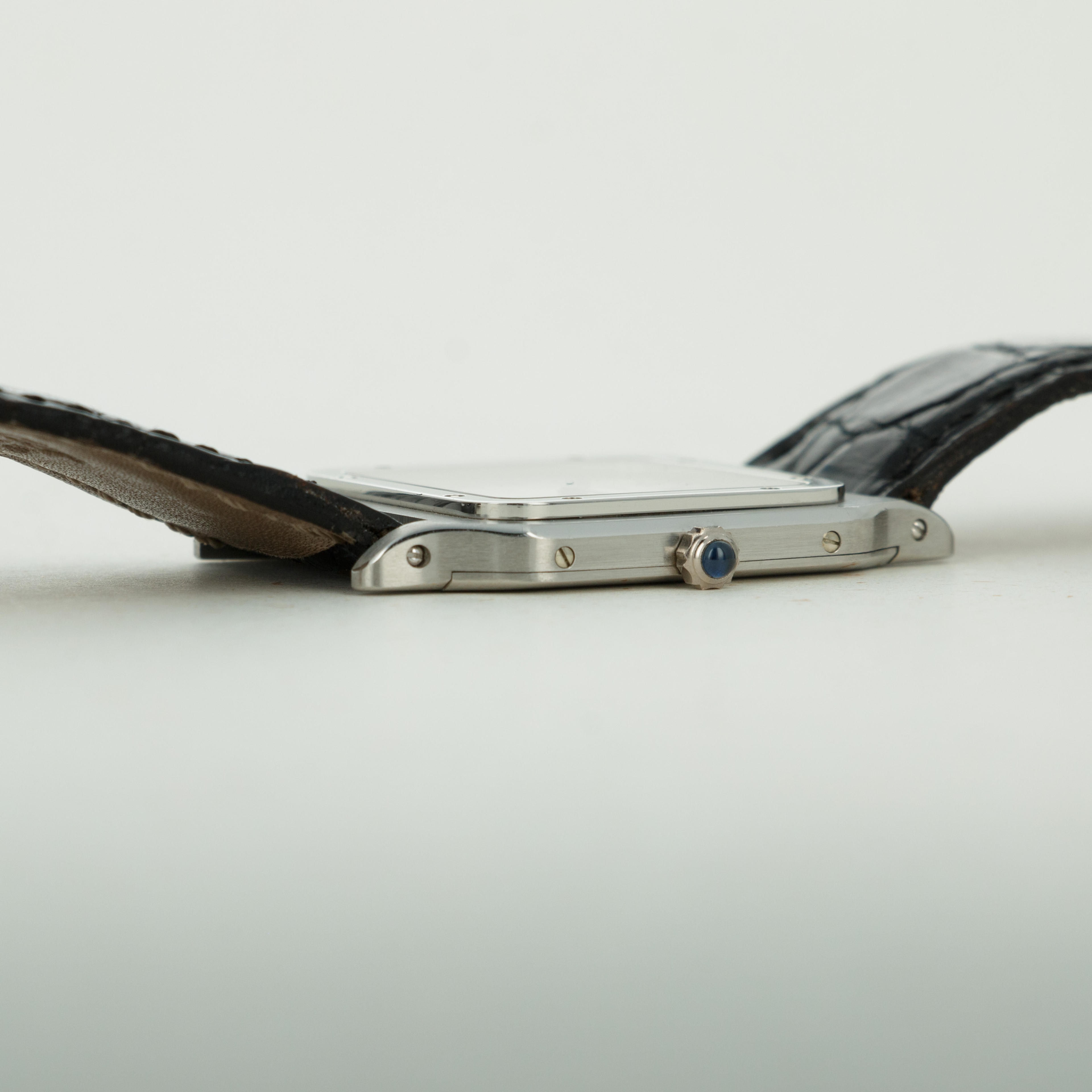 Going down in history as one of the first tool watches ever released, the Cartier Santos was designed by Louis Cartier at the request of famed Brazilian aviator Alberto Santos-Dumont in 1904, as he foresaw checking pocket watches in a cockpit becoming an issue as aviation developed. The very pinnacle of timeless design, the Santos has penetrated just about every corner of horology, as demonstrated by this 1990's-released ladies model, the ref 1575-1. A 27mm variant constructed of platinum, the ref. 1575-1 features a smooth round-edged bezel sitting atop a satin-brushed case with beautifully polished bevelling throughout. A remarkably slim watch, the ref. 1575-1 is powered by the exceptionally thin cal. 021 MC movement, which allows the timepiece to hug the wrist comfortably. Fitted with Cartier's classic silver dial featuring contrasting black Roman numerals within a railroad-style chapter ring and blued steel hands, the ref. 1575-1's dial is exceptionally classy, in keeping with its overall aesthetic of grace and decorum.