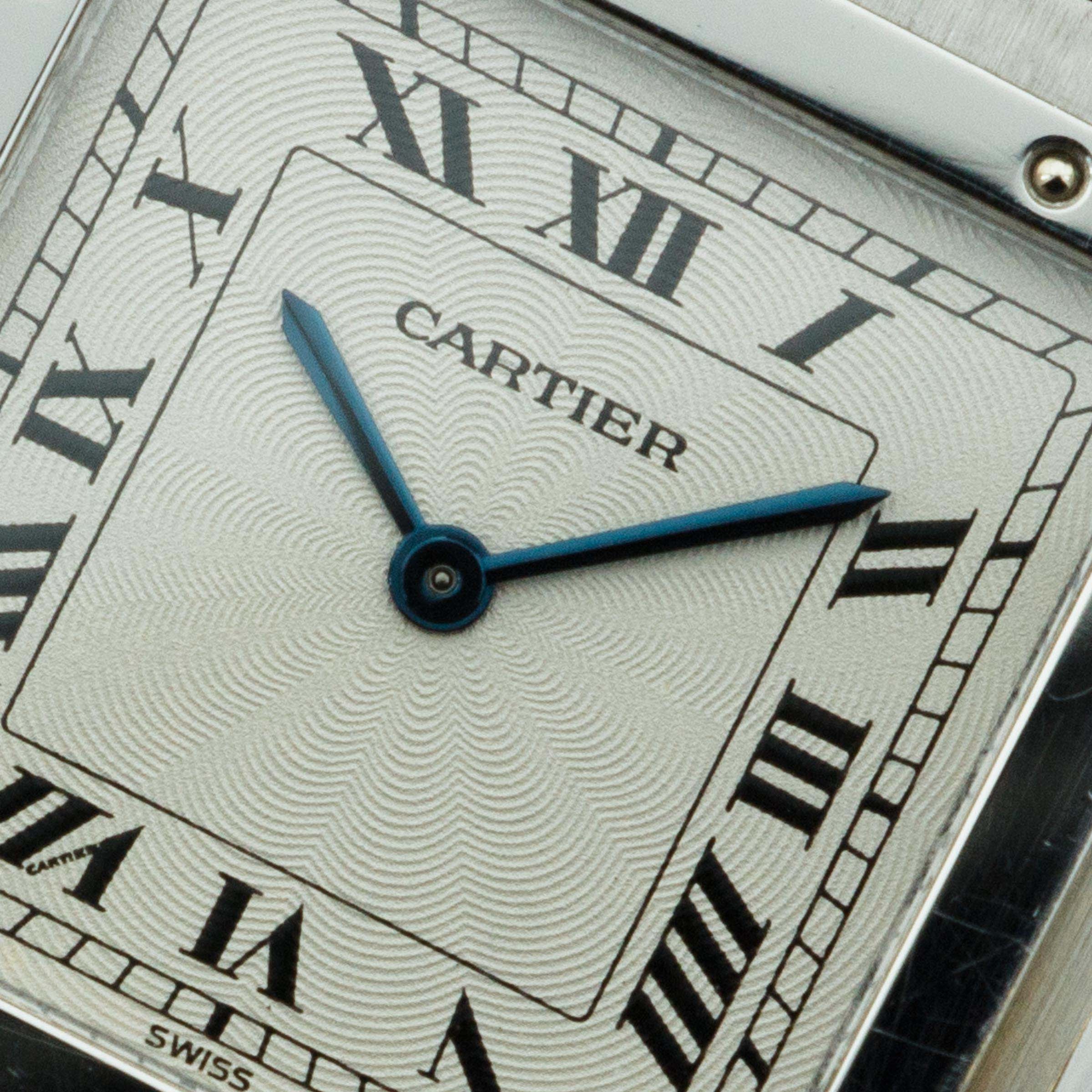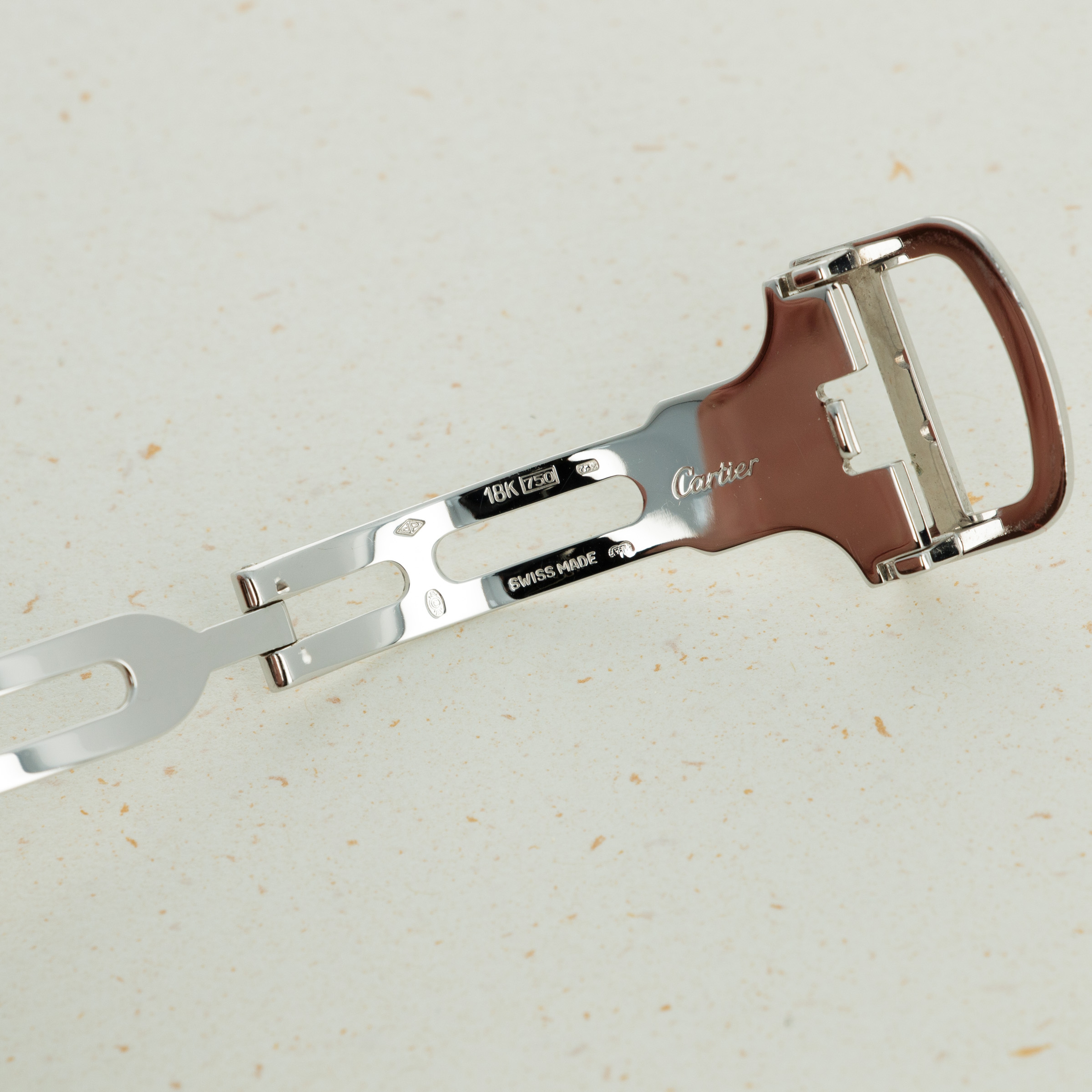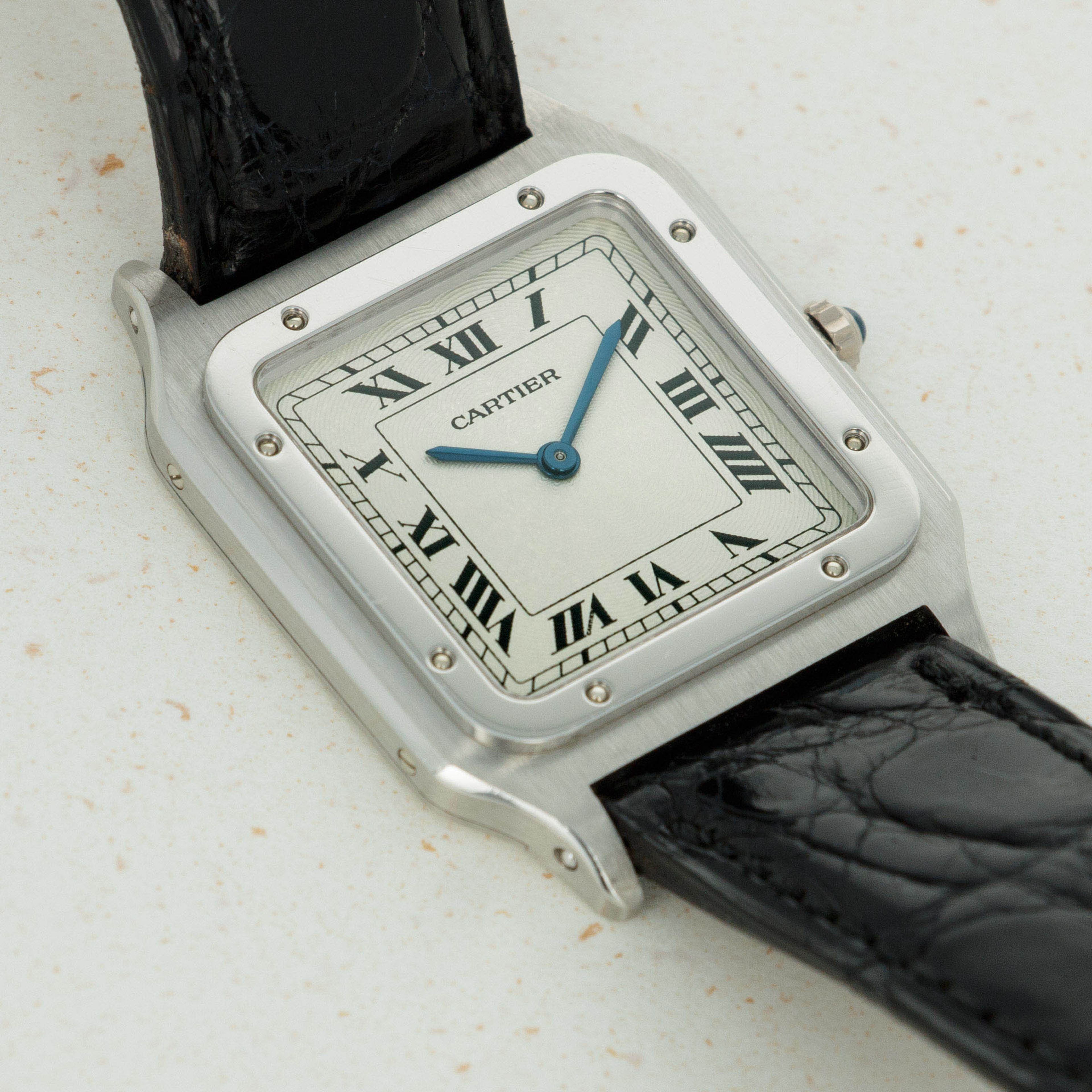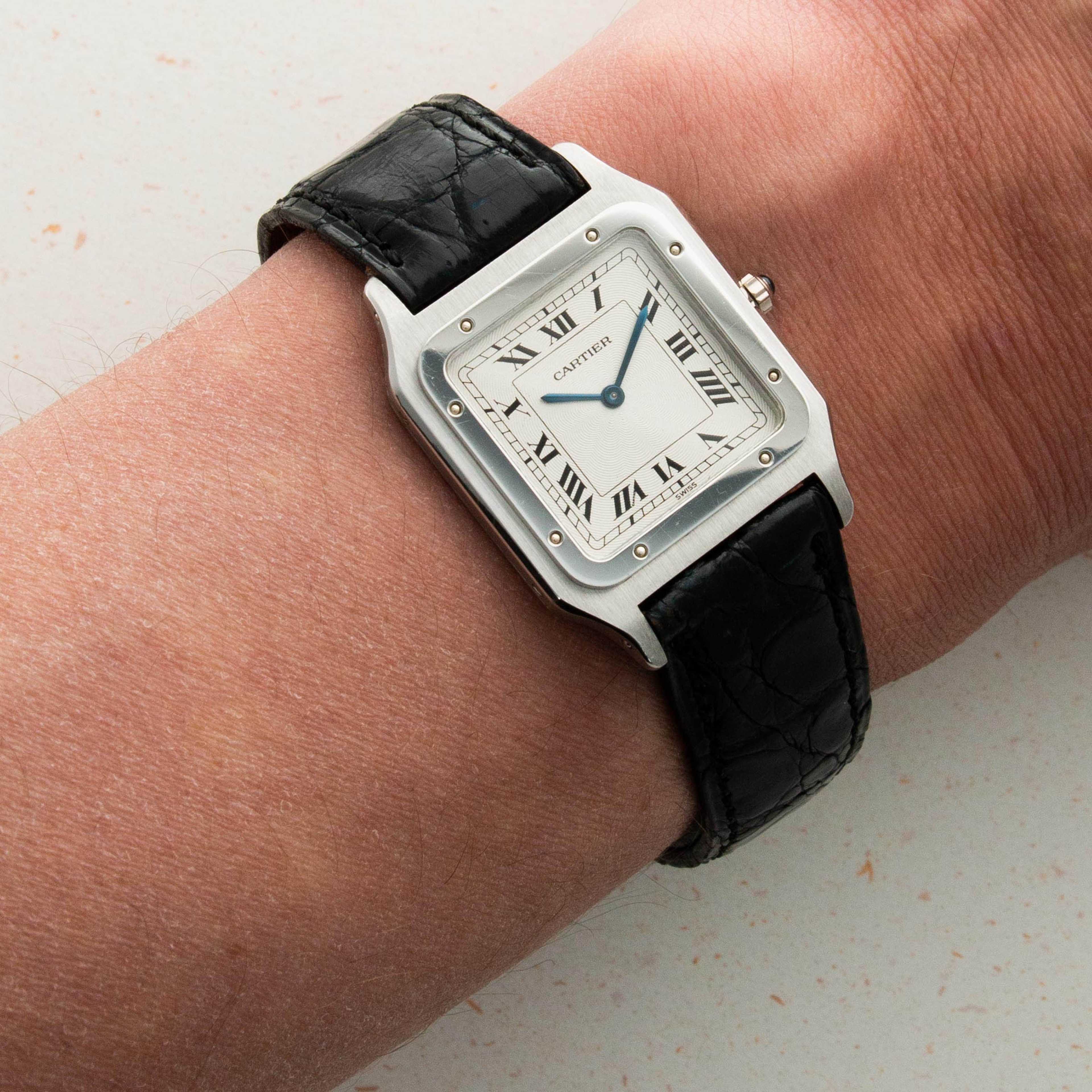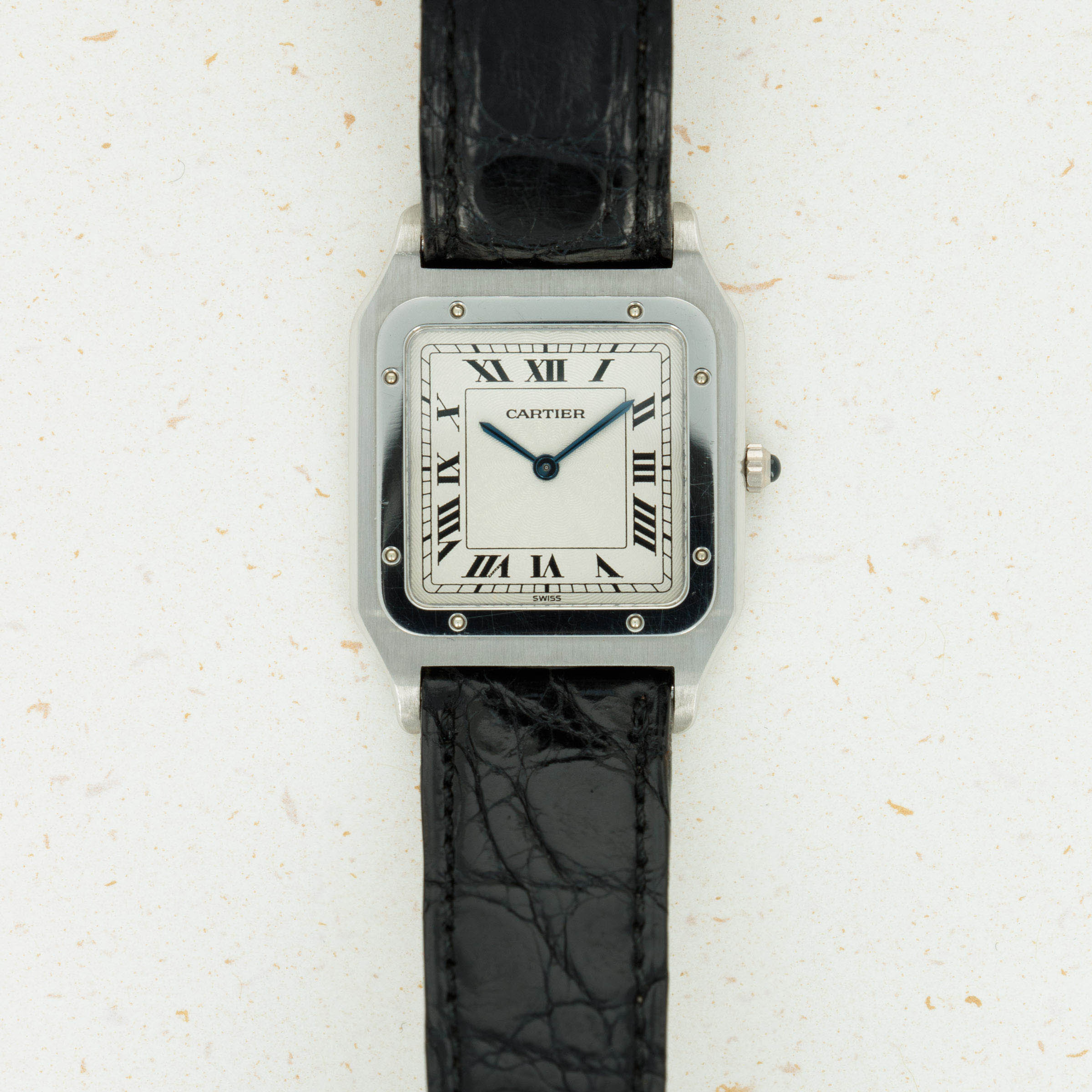 Going down in history as one of the first tool watches ever released, the Cartier Santos was designed by Louis Cartier at the request of famed Brazilian aviator Alberto Santos-Dumont in 1904, as he foresaw checking pocket watches in a cockpit becoming an issue as aviation developed. The very pinnacle of timeless design, the Santos has penetrated just about every corner of horology, as demonstrated by this 1990's-released ladies model, the ref 1575-1. A 27mm variant constructed of platinum, the ref. 1575-1 features a smooth round-edged bezel sitting atop a satin-brushed case with beautifully polished bevelling throughout. A remarkably slim watch, the ref. 1575-1 is powered by the exceptionally thin cal. 021 MC movement, which allows the timepiece to hug the wrist comfortably. Fitted with Cartier's classic silver dial featuring contrasting black Roman numerals within a railroad-style chapter ring and blued steel hands, the ref. 1575-1's dial is exceptionally classy, in keeping with its overall aesthetic of grace and decorum.