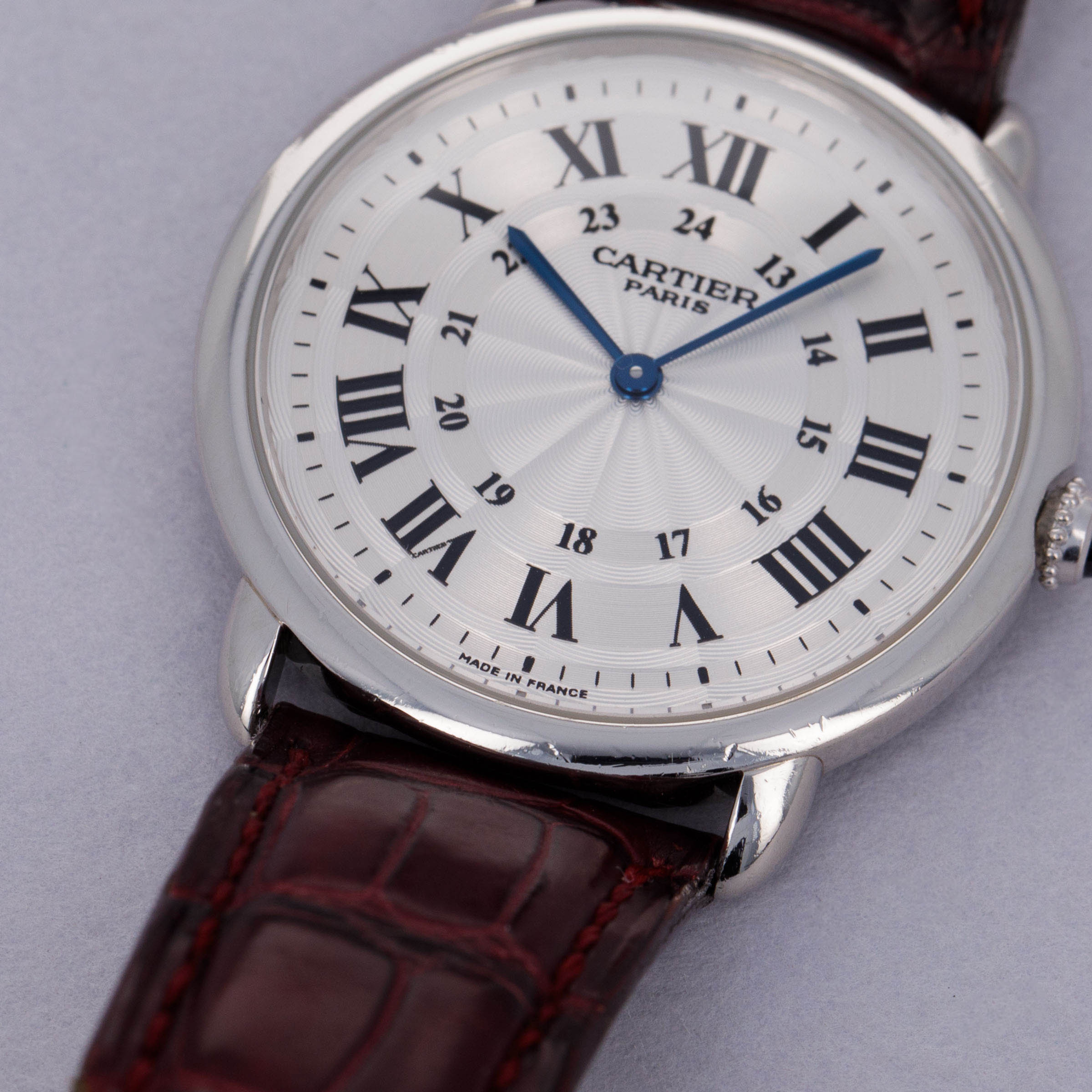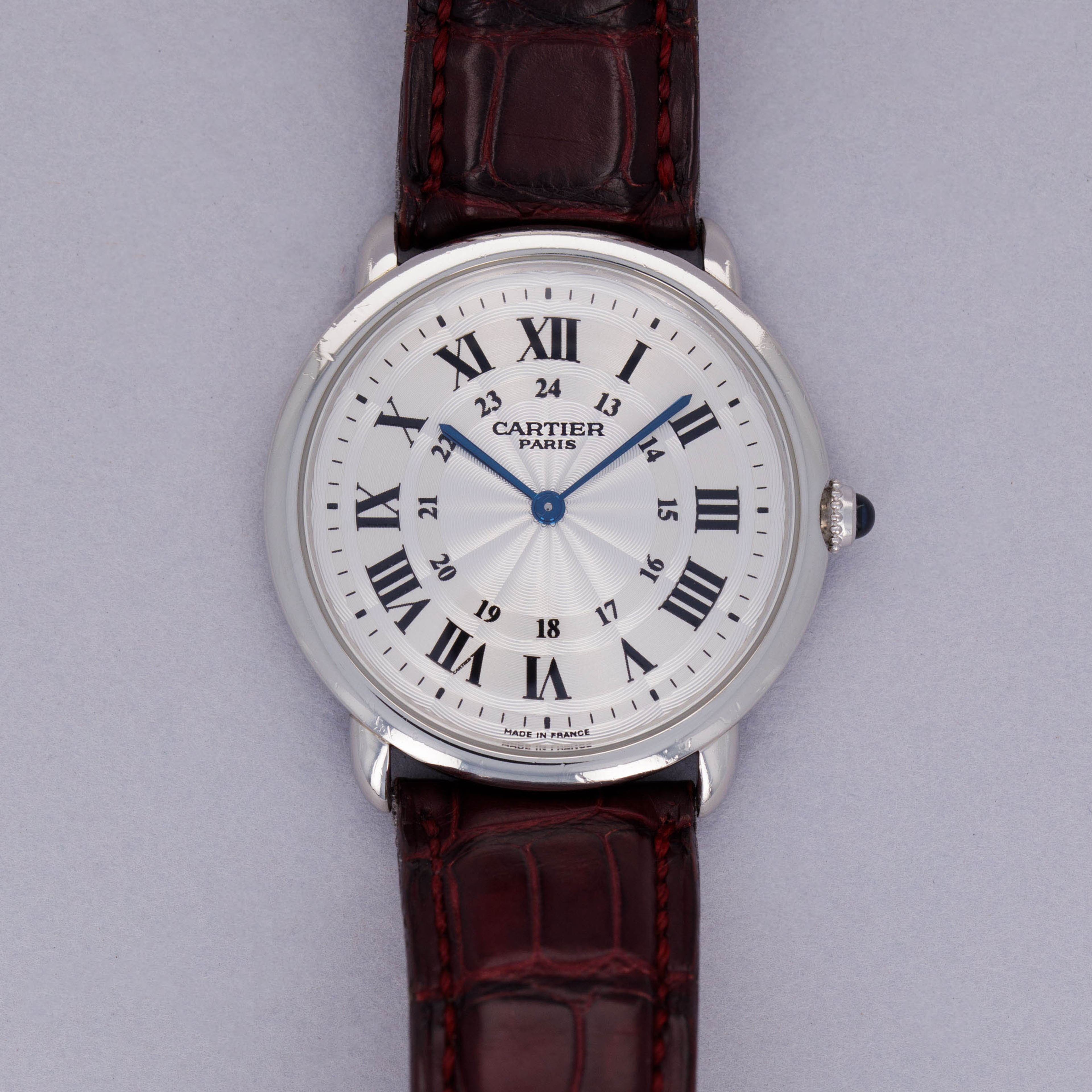 Launched in 1937, the Cartier Ronde Louis Cartier was one of the most elegant and modern timepieces of its generation. Featuring its characteristic round profile, short downturned lugs, and large dial contrasting its thin flat bezel, the Ronde’s design was truly ahead of its time, considering just how modern and timeless its design has remained to this day. Often produced in limited edition runs, it has quickly become a Cartier collector favorite over the decades. Belonging to one of those limited edition runs, this ref. 2542B that we have here hails from Cartier's esteemed high-horology program that began in 1998 and ran until 2008, the Collection Privée Cartier Paris (CPCP). As such, this example features some finer details that examples from outside of the CPCP lack, such as a wonderfully finished manual-wind cal. 430 MC movement on display behind a sapphire crystal caseback and an exquisitely decorated silver rosette guilloche dial with blued steel hands and black Roman numerals encircling a 24-hour scale. Sitting on a leather strap with a platinum Cartier folding clasp, this example is remarkably luxurious and understated as a result of its monochromatic aesthetic – a truly Cartier-esque combination indeed.