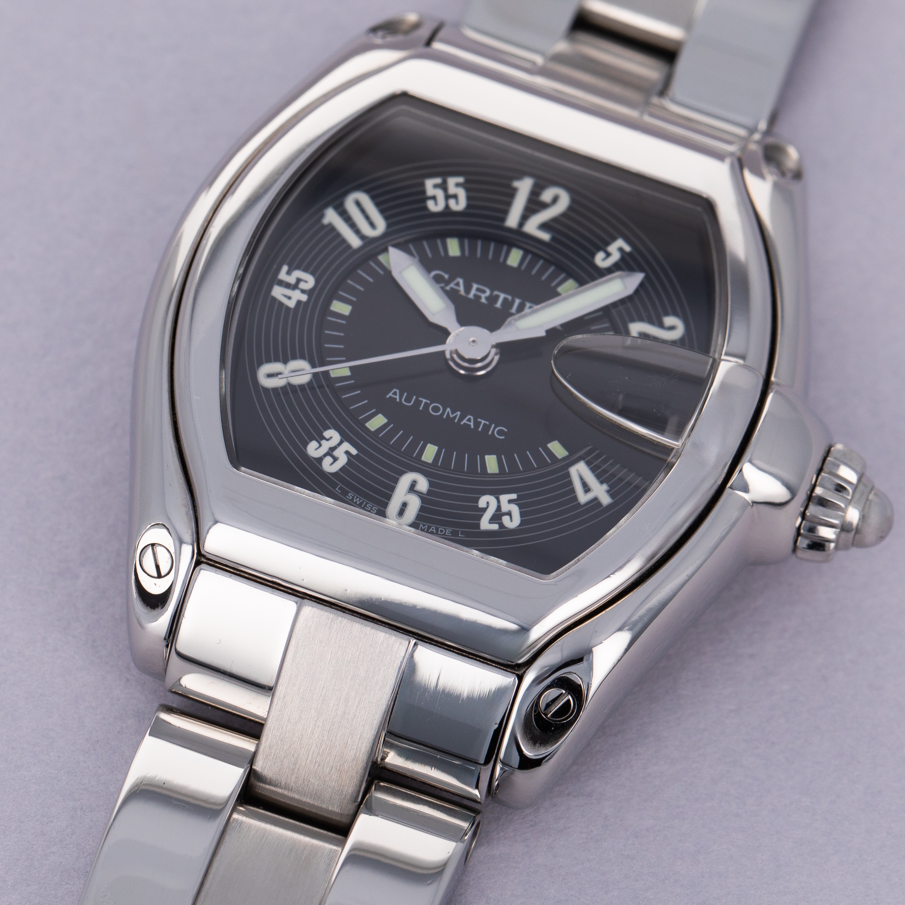 Boasting a black dial with Arabic numerals and a chunky handset, this variant of the Roadster leans out from Cartier's elegantly-inspired design choices and into the model's sportier influences.