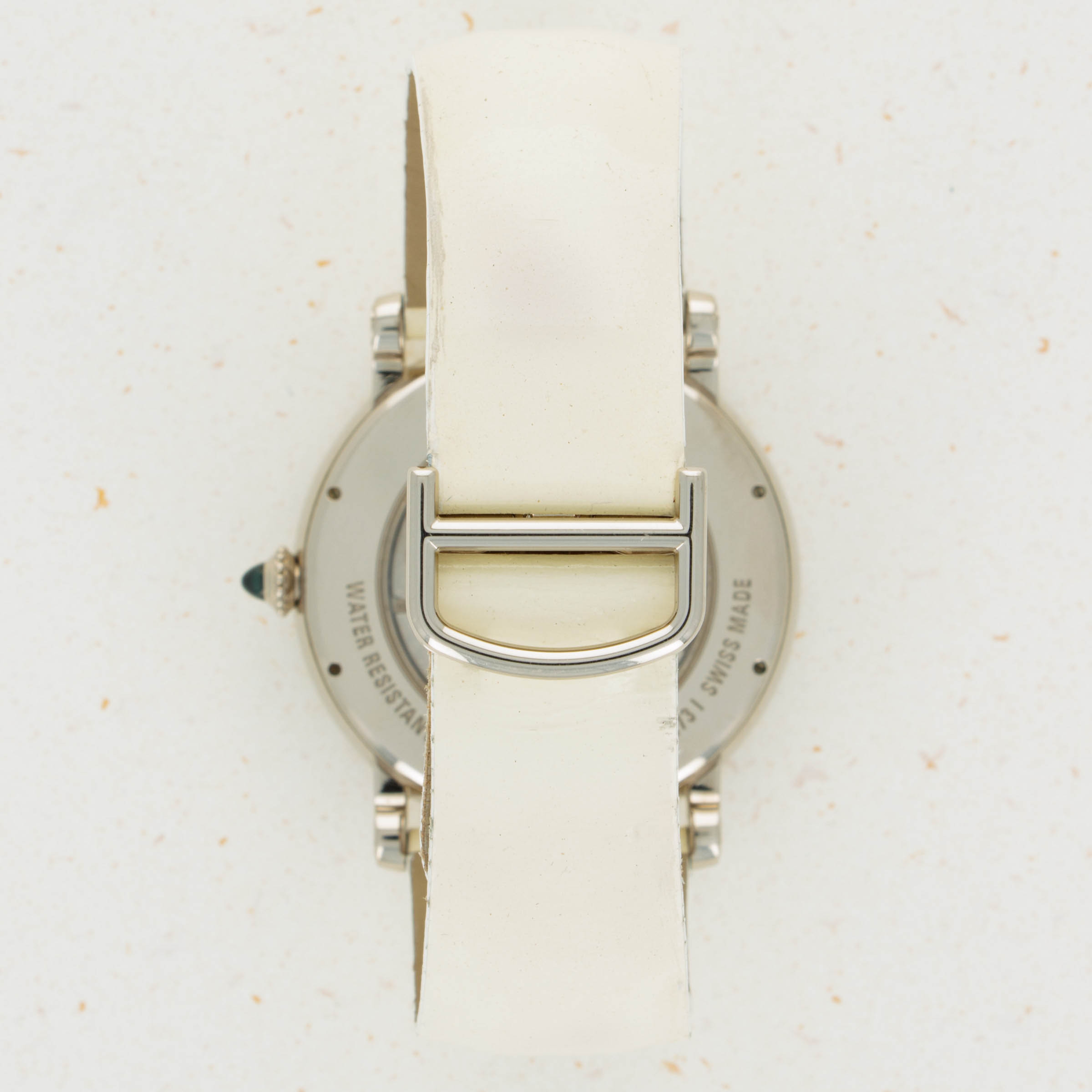 Watch is in near-mint condition, showing only minor signs of wear. There are some surface marks visible on the case and bezel as shown in the images. The white/cream strap is worn and slightly discolored. Hallmarks and engravings on caseback are crisp and well defined.