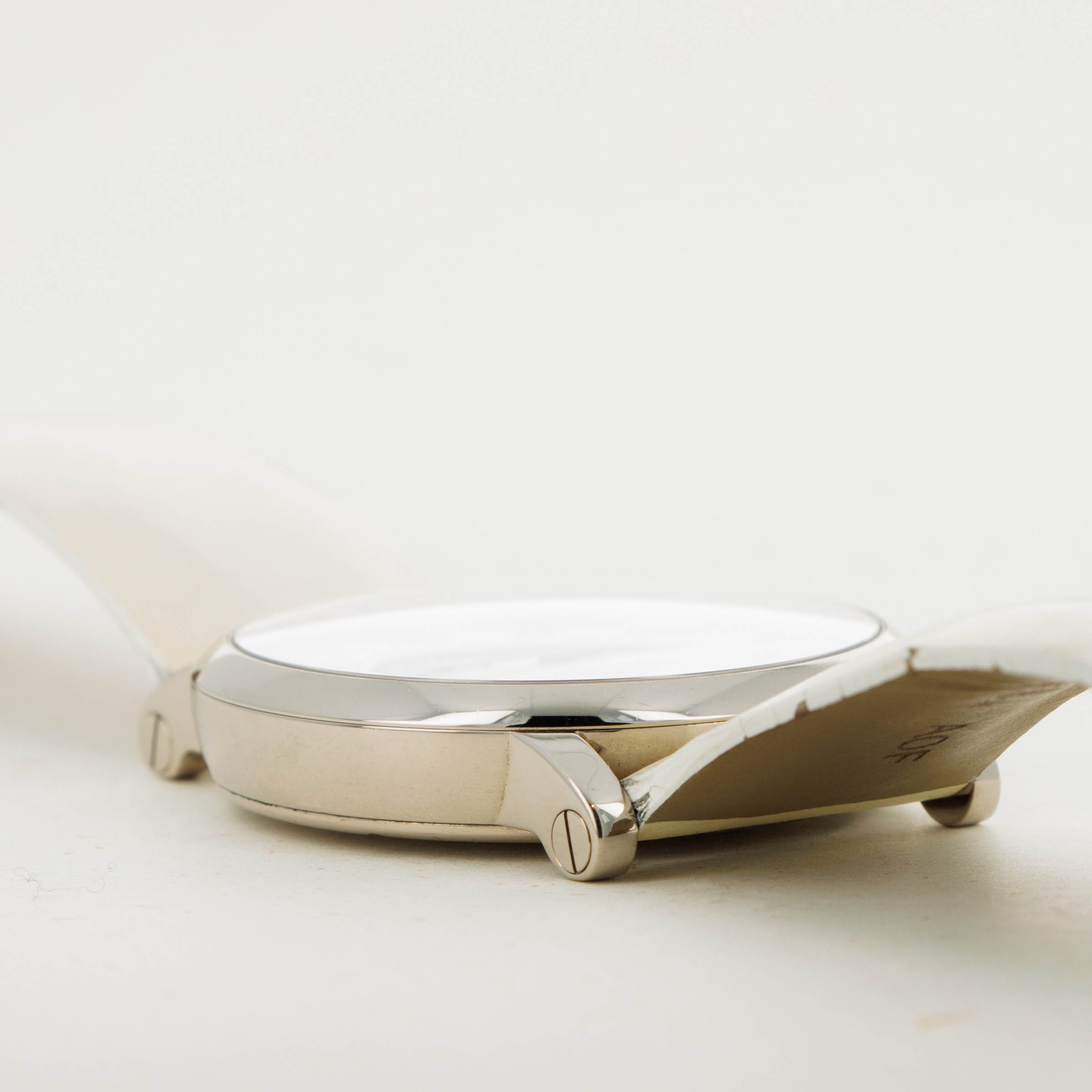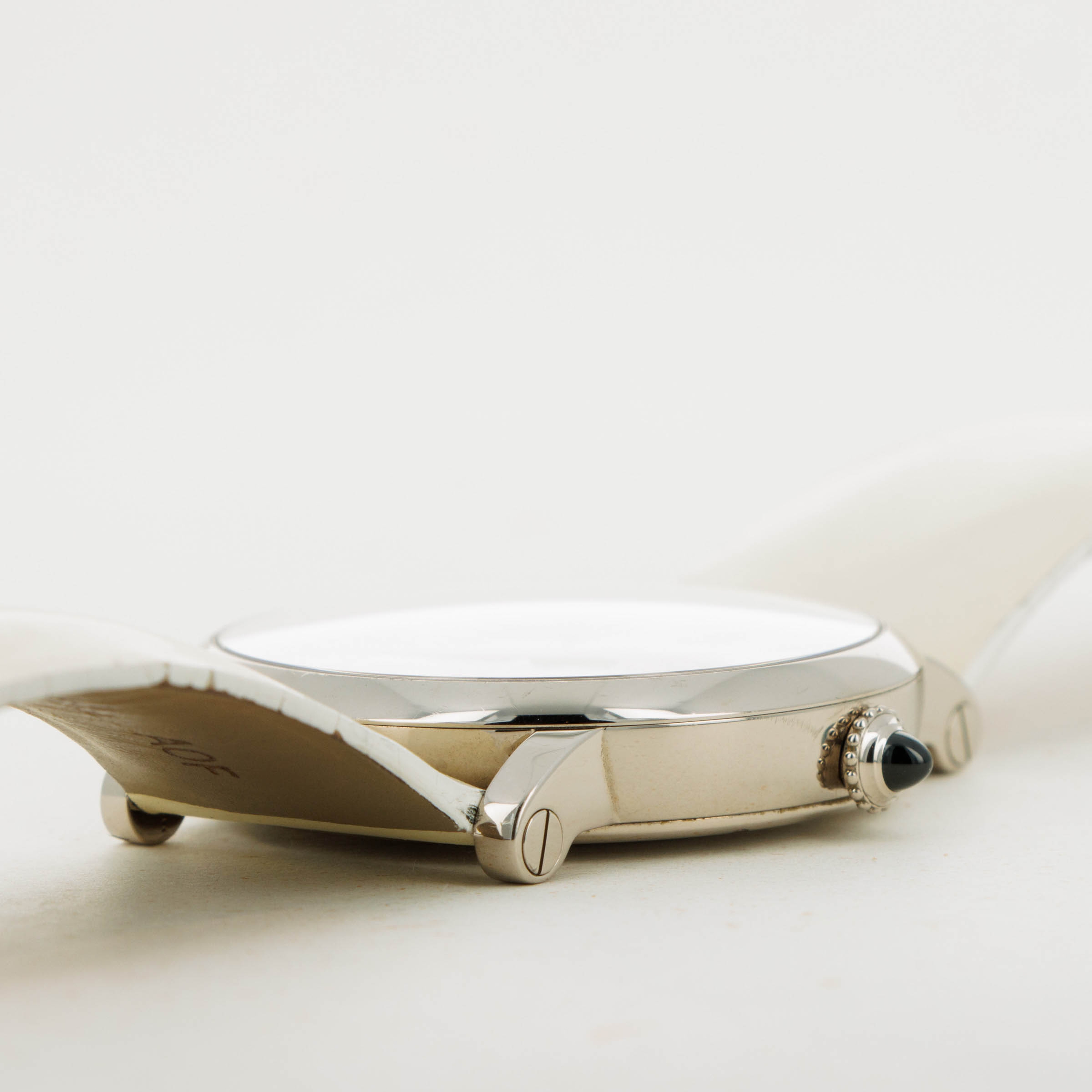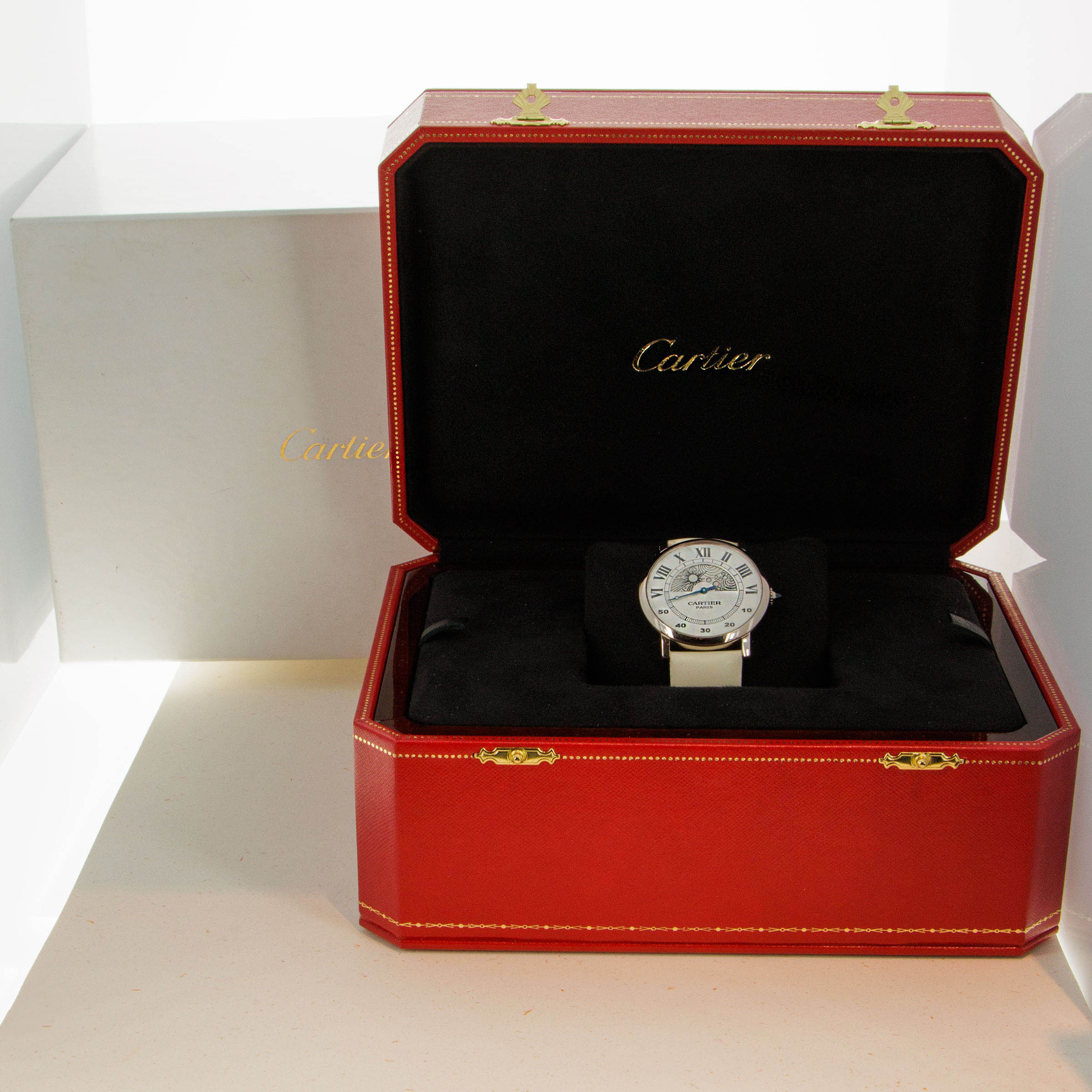 Boasting a monochromatic aesthetic that is matching its dial, the Rotonde de Cartier Jour et Nuit we have here is made of 18kt white gold that sports a perfectly polished surface all the way around its exterior.