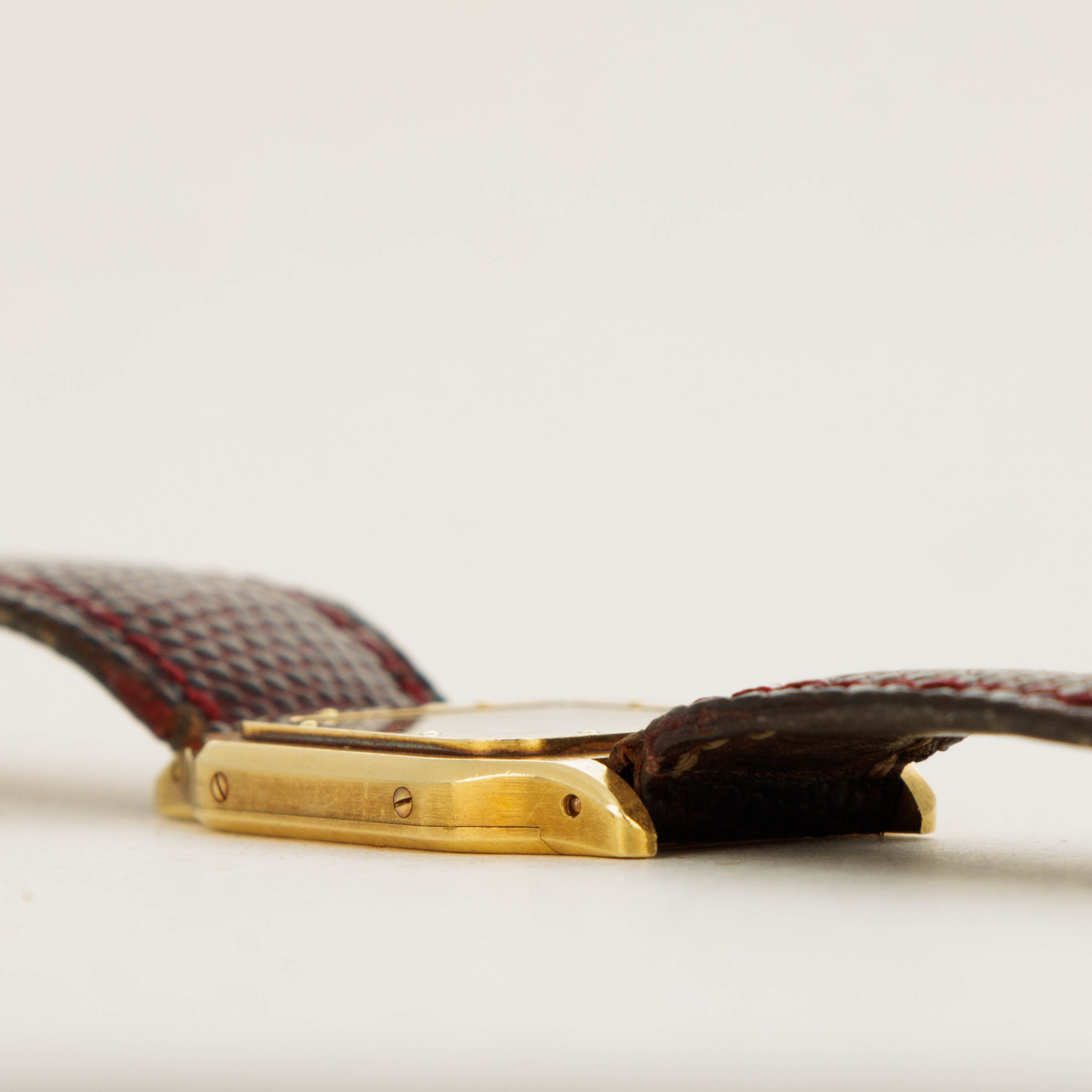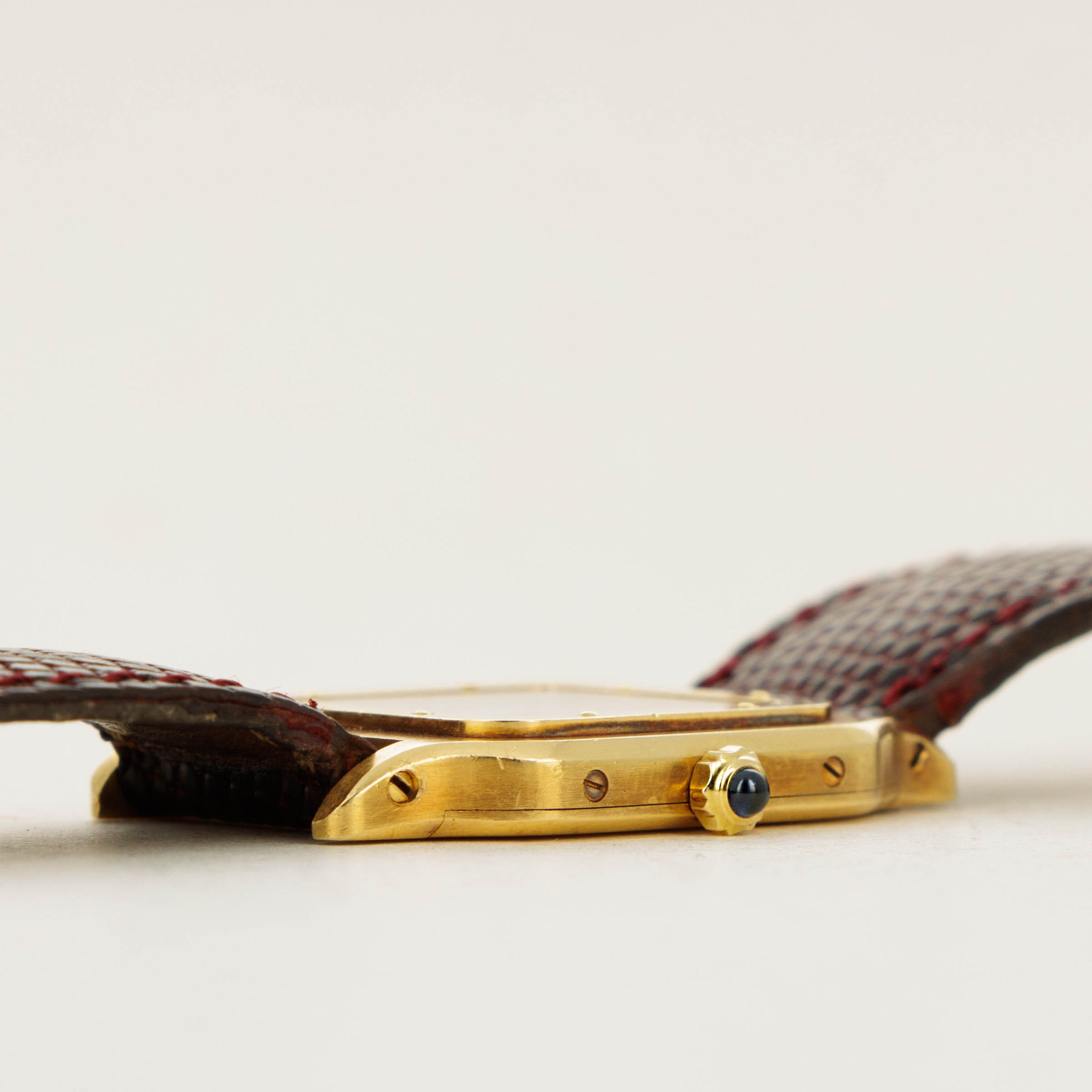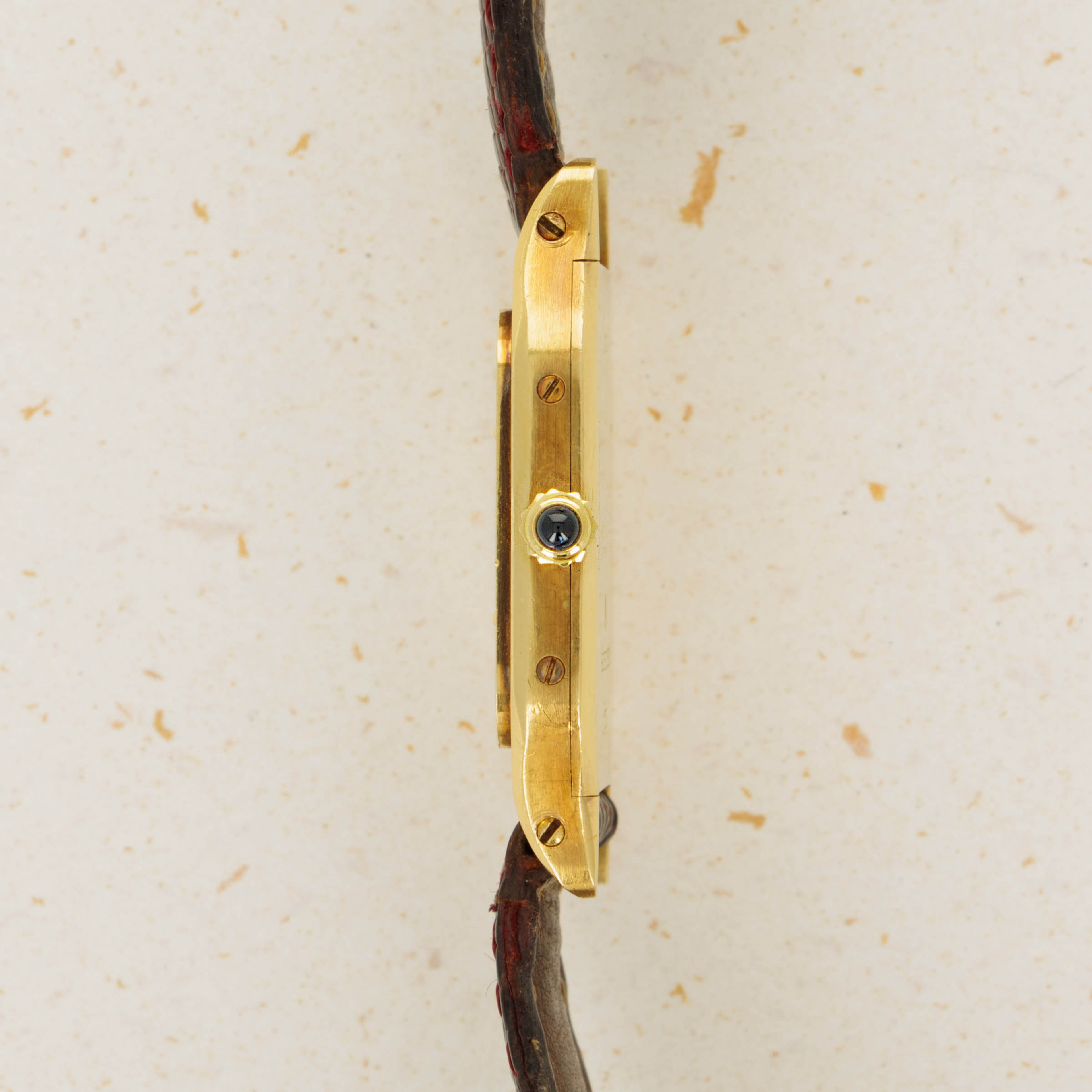 With the early aviation industry growing at unprecedented rates, one pioneering Brazilian aviator saw the need for a particular kind of tool - a pilot’s watch. So, this aviator, Alberto Santos-Dumont, went to Louis Cartier in 1904 and asked him to design a watch fit for flight. This watch became the Cartier Santos Dumont, the very first tool watch. Evolving through time as an extensive array of wonderful models, the Santos Dumont has become one of watchmaking’s most iconic designs, and is famed for creating the humble wristwatch as we know it. Offered here we have a Santos Dumont ref. 9605 from the 1990s that takes the Santos’ iconic design and packages it into a dense 23mm diameter package of 18kt yellow gold. Boasting an angular case with its distinctive bezel and Cartier’s signature dial design, this timepiece showcases Cartier’s impressive ability to create timeless designs, as evidenced by how popular the Santos and all of its subsequent sibling models continue to be in the modern age of watchmaking as we know it.