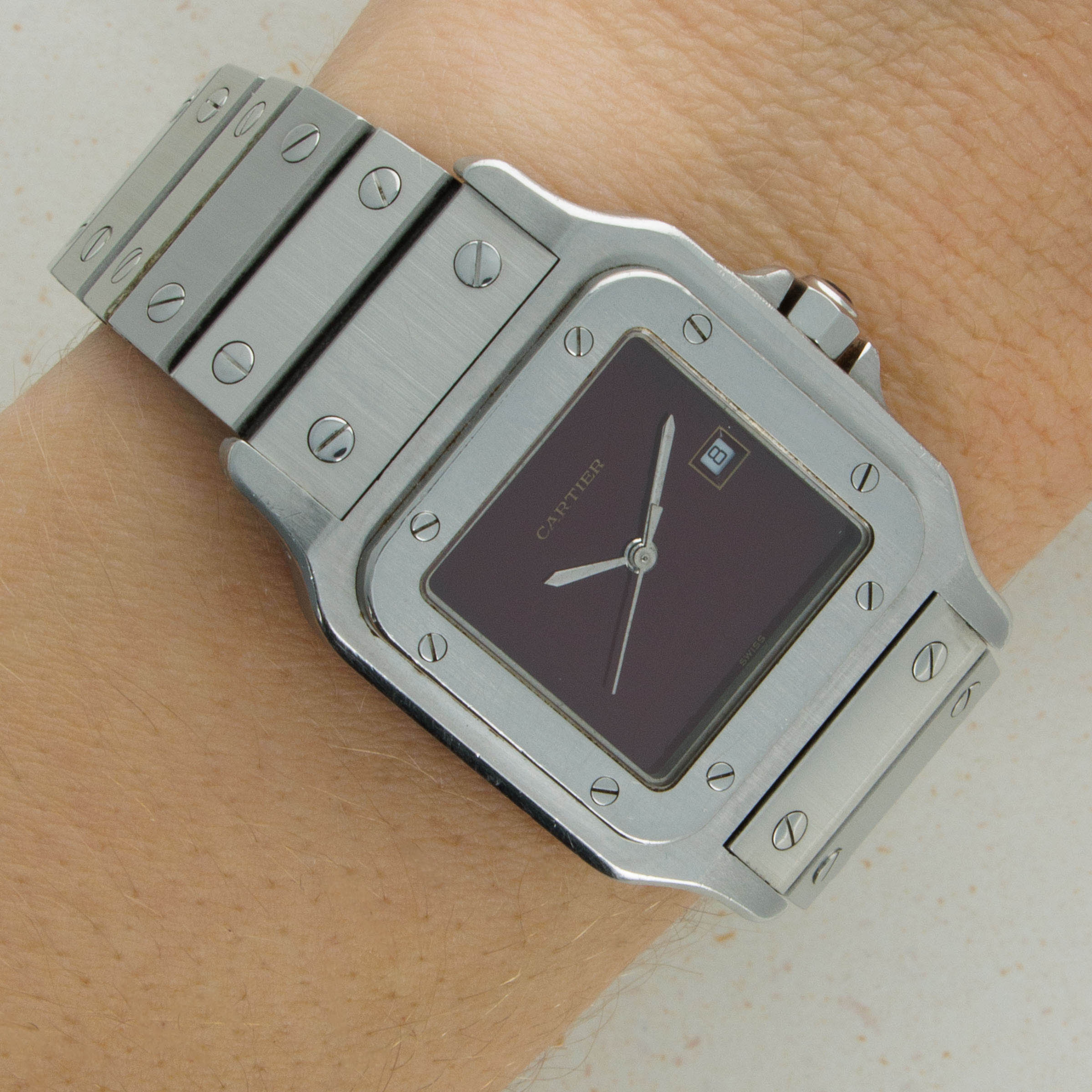 Perhaps one of the most legendary timepieces ever, the Cartier Santos is the watch we must thank for the modern horology industry that we all know and love. Designed in 1904 as the first-ever pilot’s watch and thus the first-ever tool watch, the Cartier Santos has continued to push boundaries ever since it was strapped to the wrist of famous aviator Alberto Santos-Dumont. As the story goes, Alberto asked Louis Cartier for a wristwatch that he could wear while flying as it would be so much more practical than his using his usual pocket watch while also trying to control his plane. Evolving through time like most pieces of design, the Cartier Santos has been characteristically fluid in its unique ability to encapsulate the aesthetic zeitgeist of whatever era it finds itself in. As such, Cartier released the Cartier Santos in 1978 to capitalize on the growing market for angular integrated bracelet watches thanks to the popularity of the Royal Oak, Nautilus and other such watches. With its integrated bracelet, exposed screws, angular design, raised polished bezel, distinctive bracelet and classical Cartier dial, the Santos was a success and since then has continued to grow as a collection. The Santos Galbee ref. 2961 that we have here features a beautiful stainless construction alongside a rare burgundy red lacquer dial. With its svelte proportions and a tasteful balance between polished and brushed surfaces, this variant demonstrates Cartier’s strengths as a design institution. Offered as the “Jumbo” edition, the Santos ref. 2961 was known for its larger 29mm diameter and 40mm lug-to-lug case design, which now wears in a beautifully understated manner thanks to the increase in watch sizes over the decades.