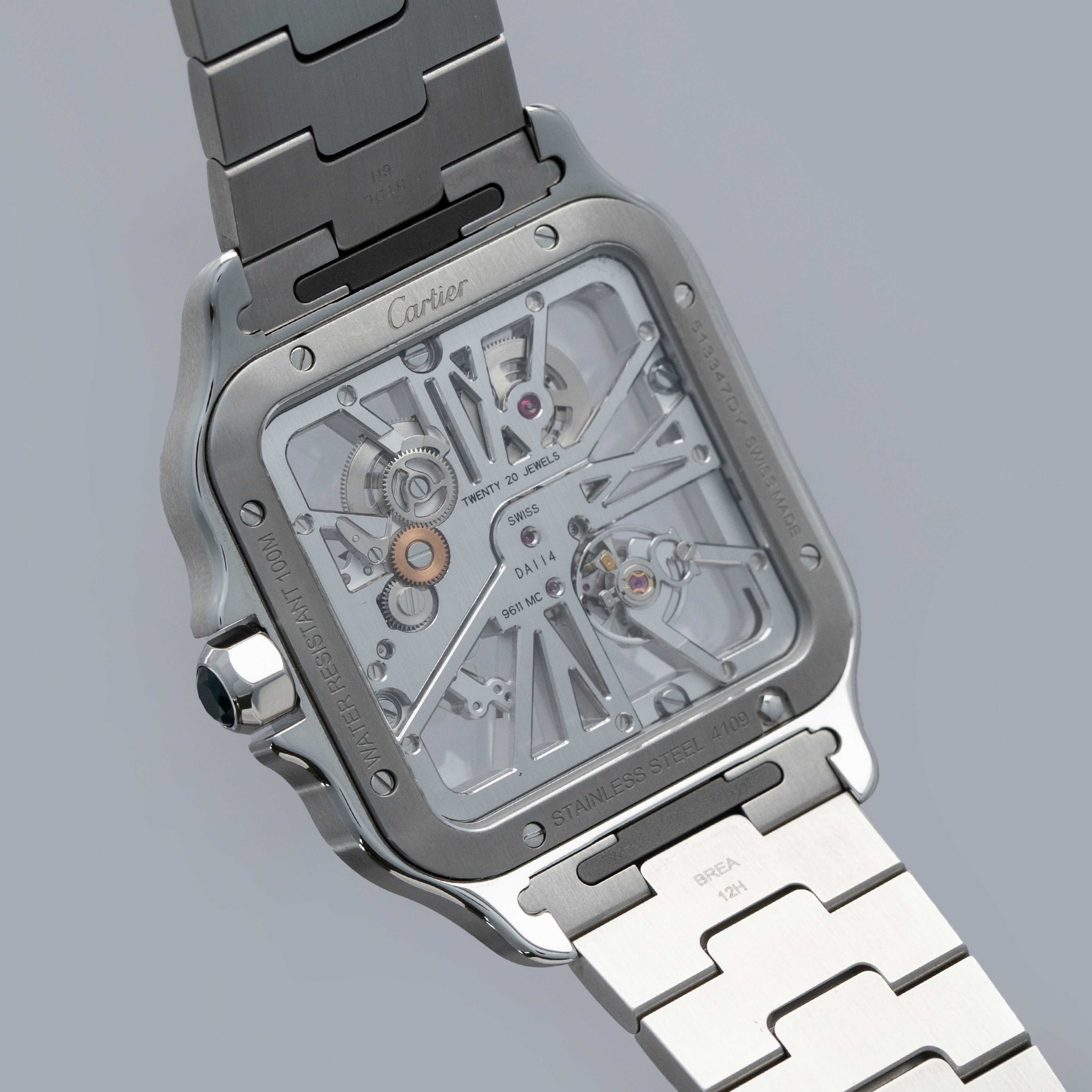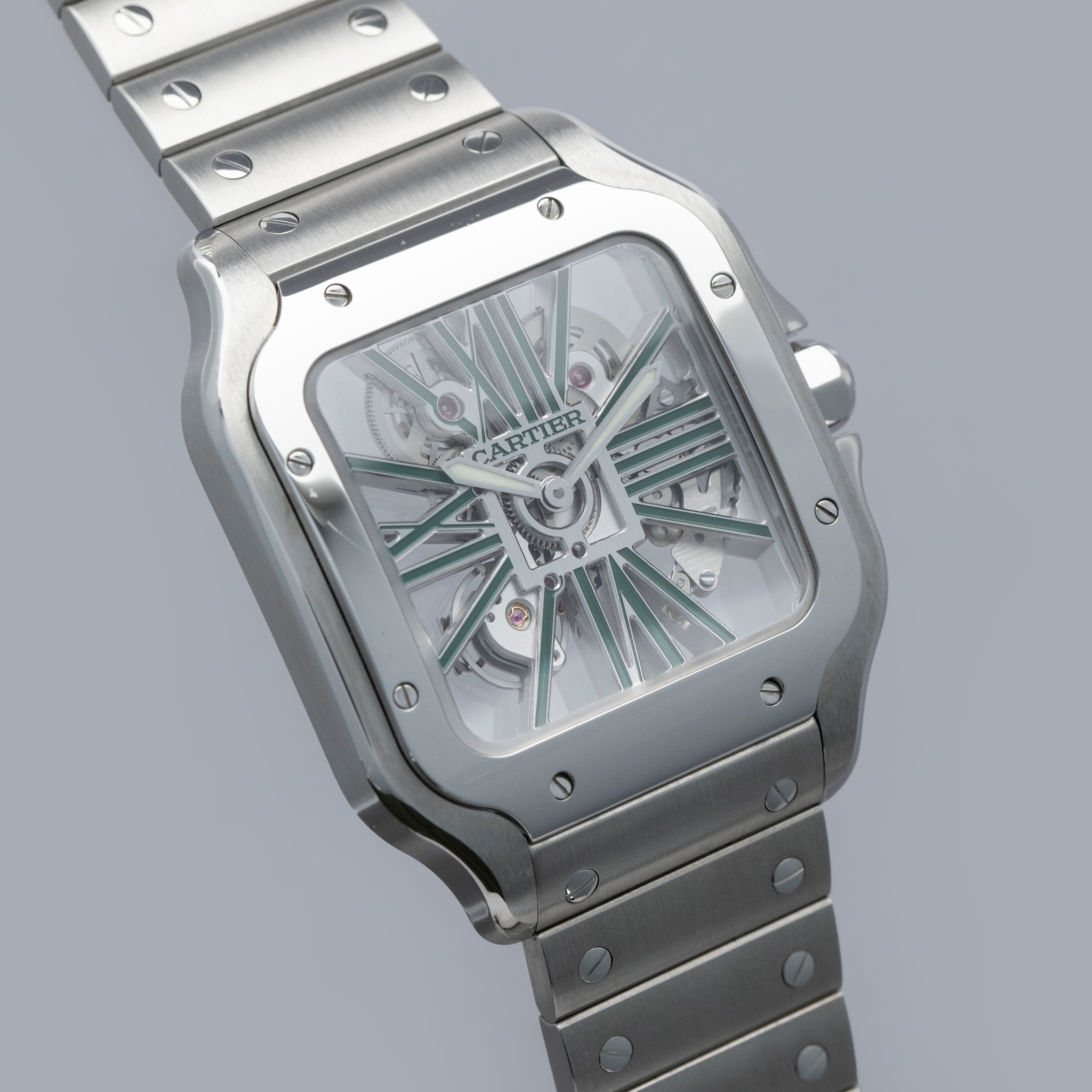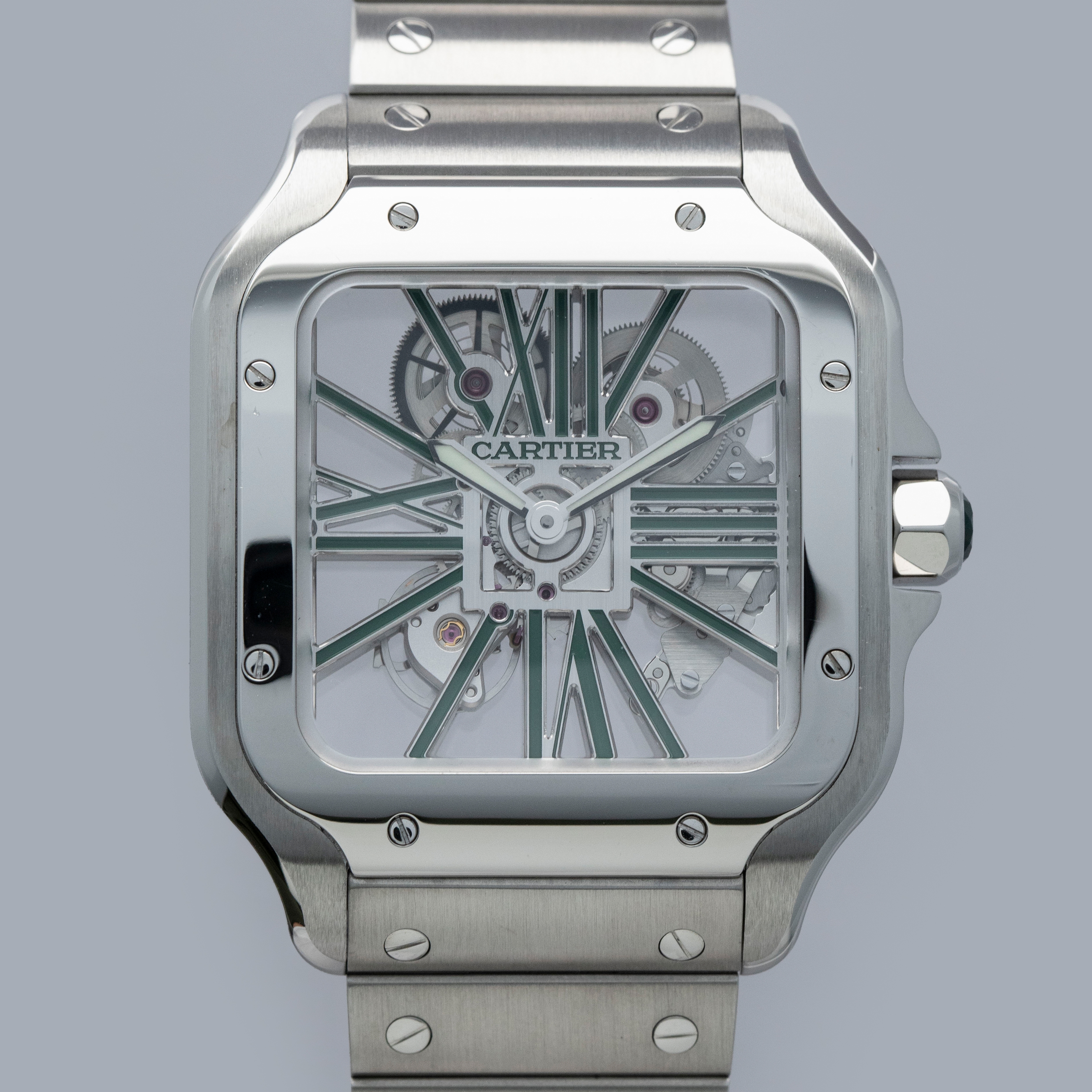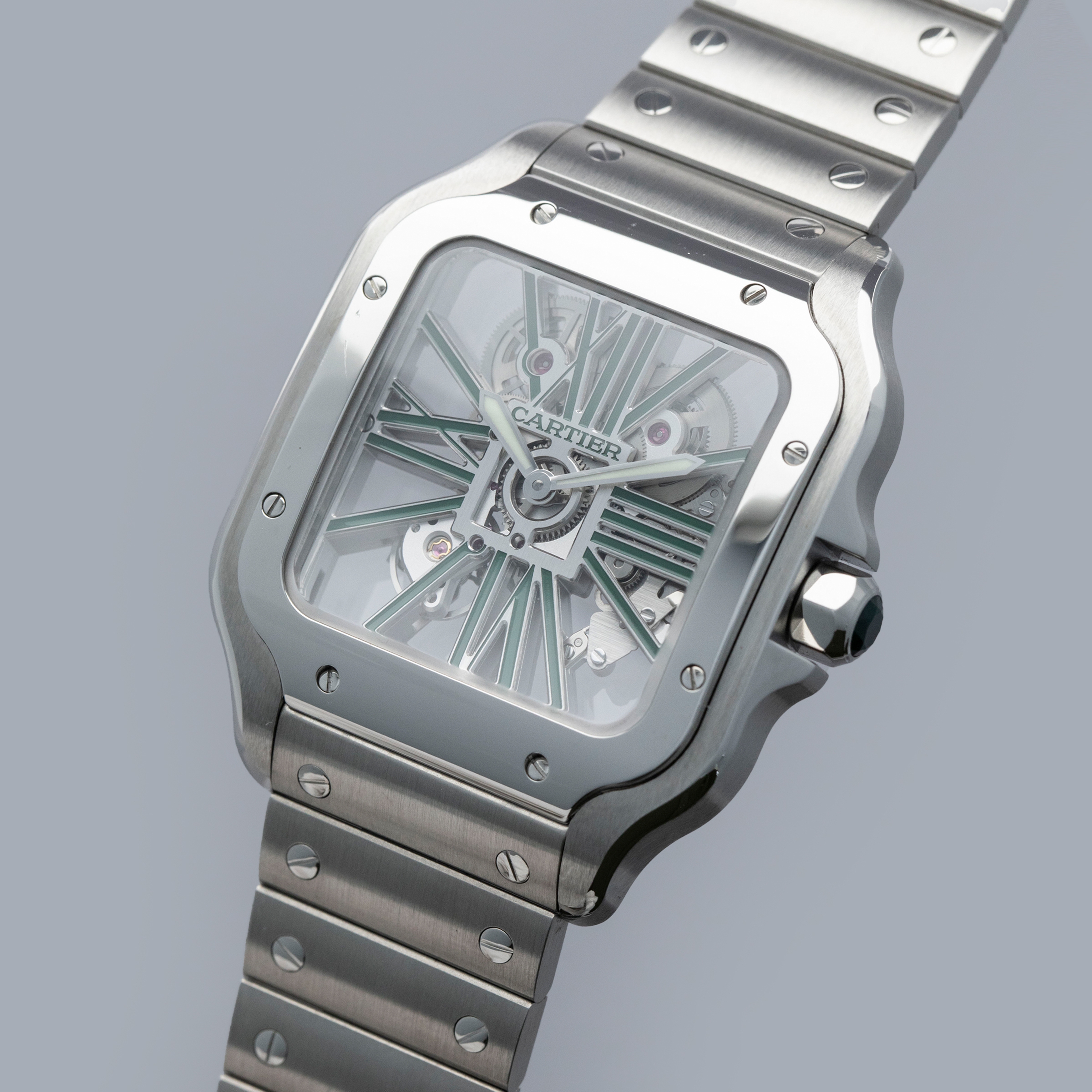 Using one of their most famed design tenets as the foundation of its movement architecture and dial, the Santos de Cartier Skeleton boasts openworked green lacquer-filled Roman numerals that showcase Cartier's skill as a watchmaker in tandem with their skills as a watch designer.