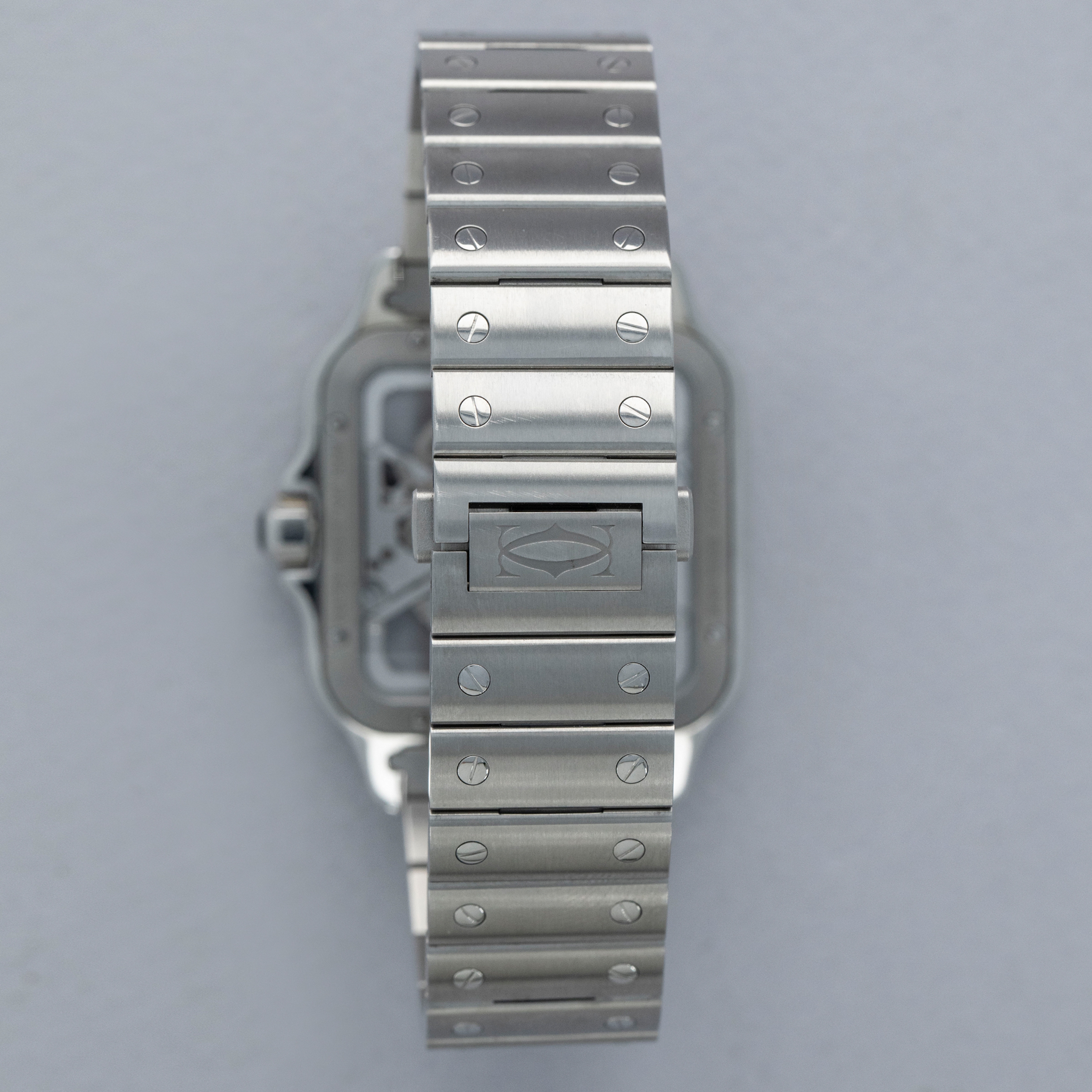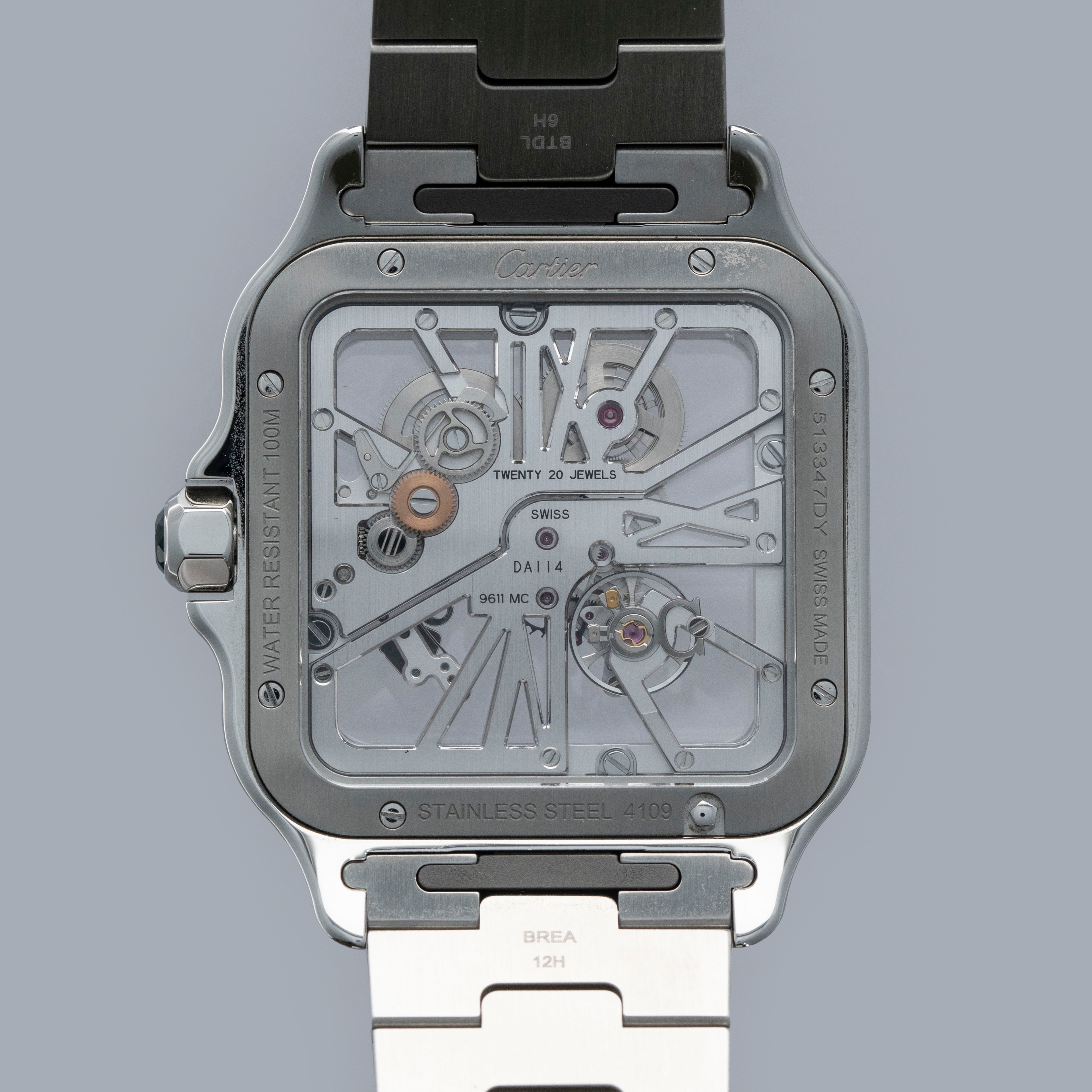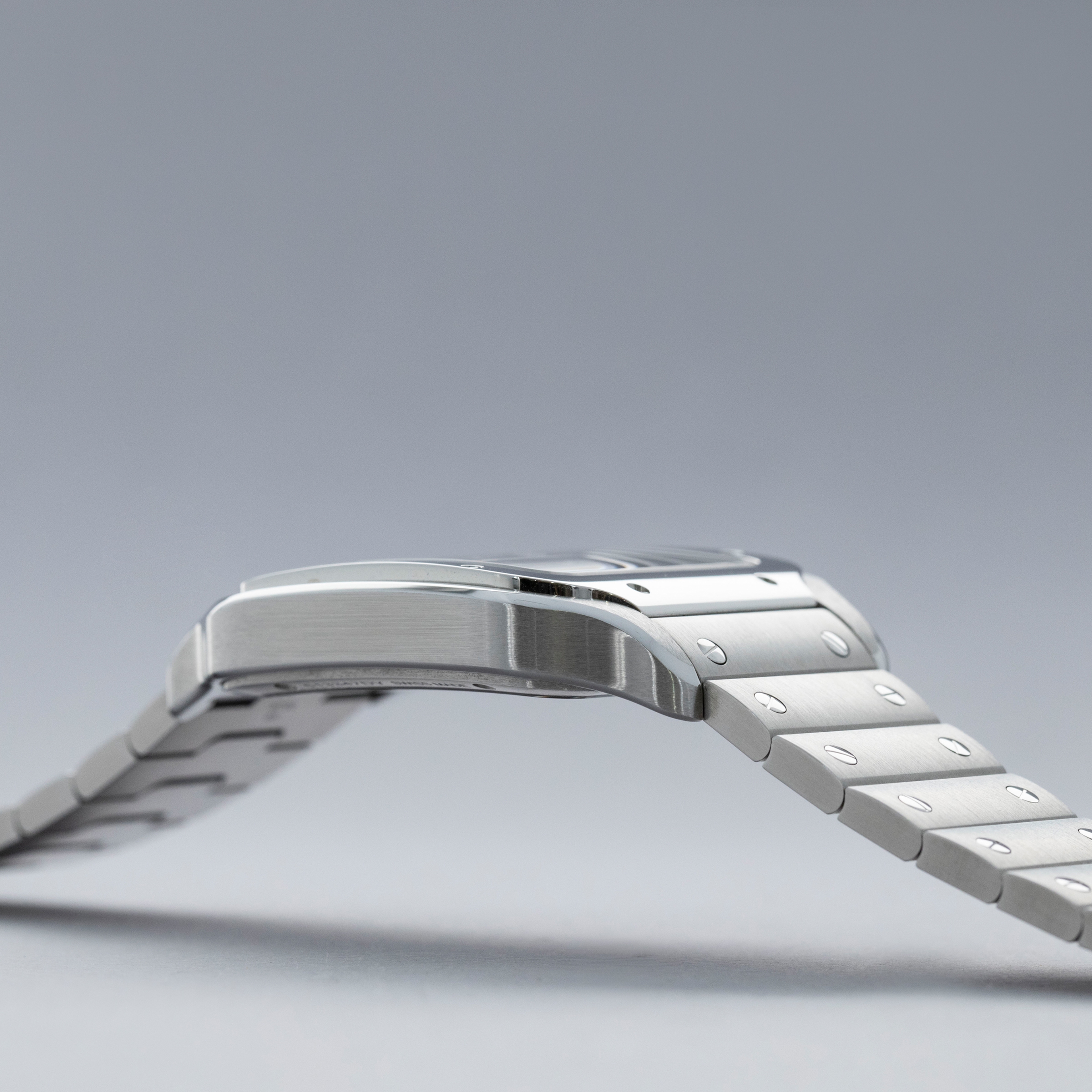 Offered in stainless steel, the Santos de Cartier showcases the Santos' iconic square case and integrated bracelet that are both adorned with exposed screws.