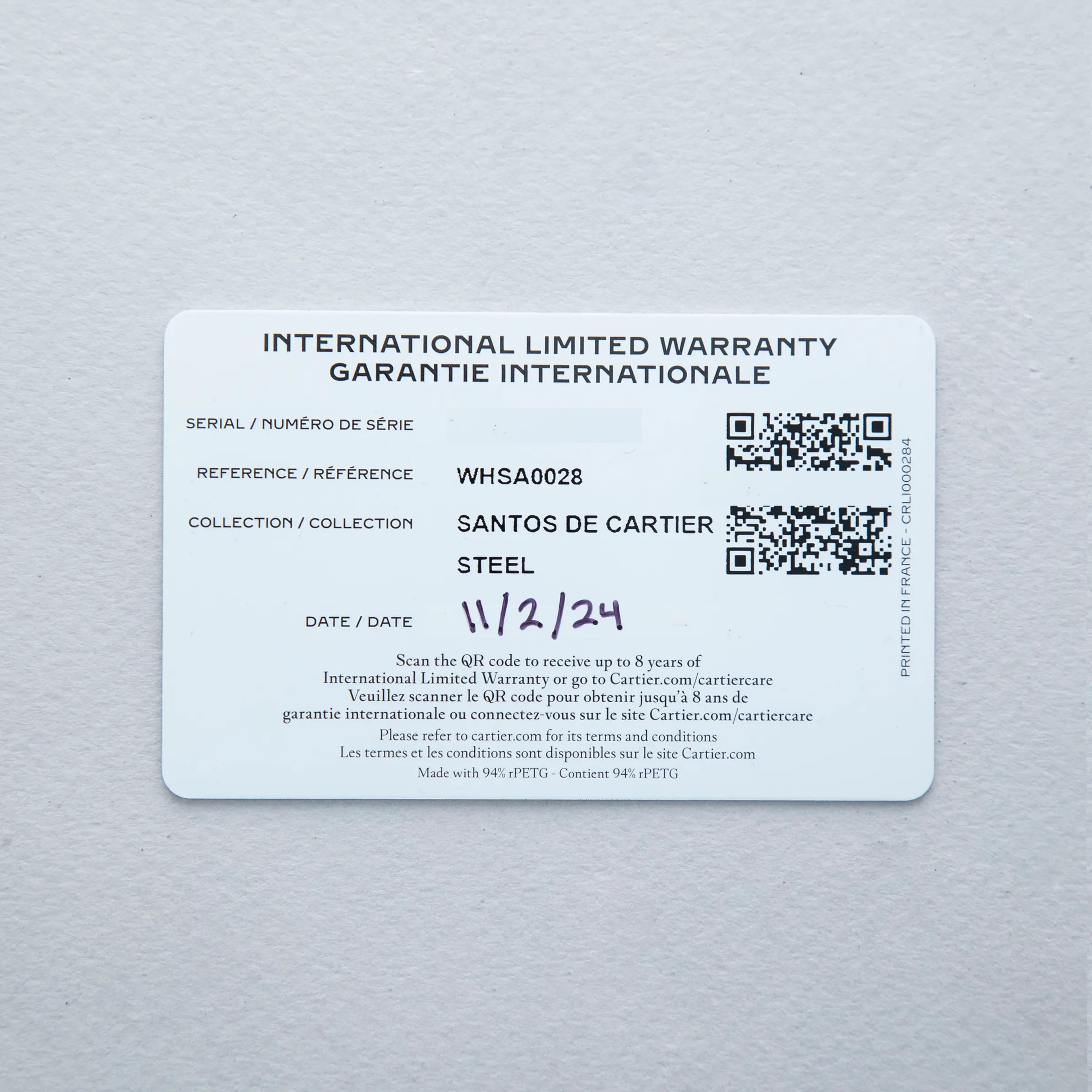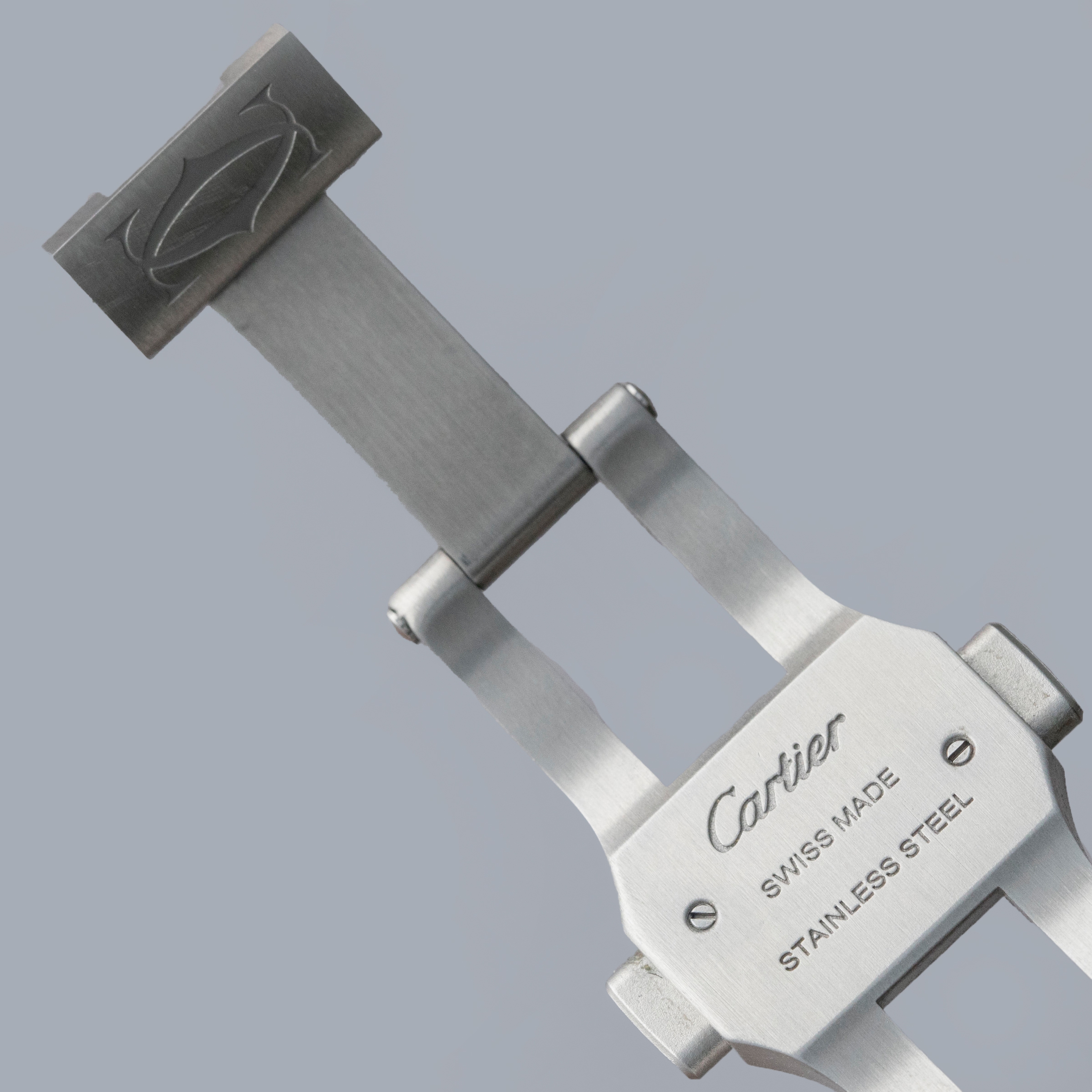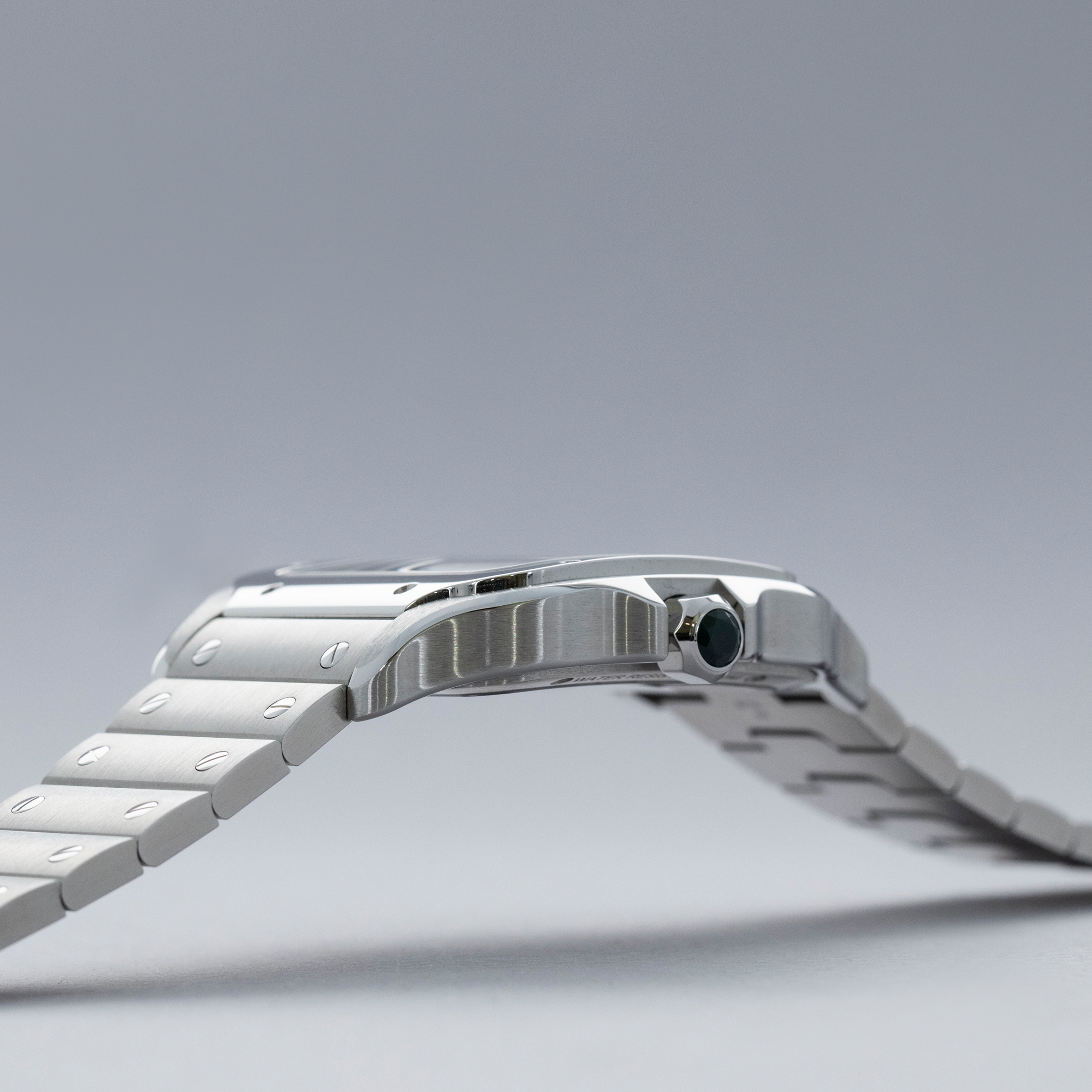 Offered in stainless steel, the Santos de Cartier showcases the Santos' iconic square case and integrated bracelet that are both adorned with exposed screws.
