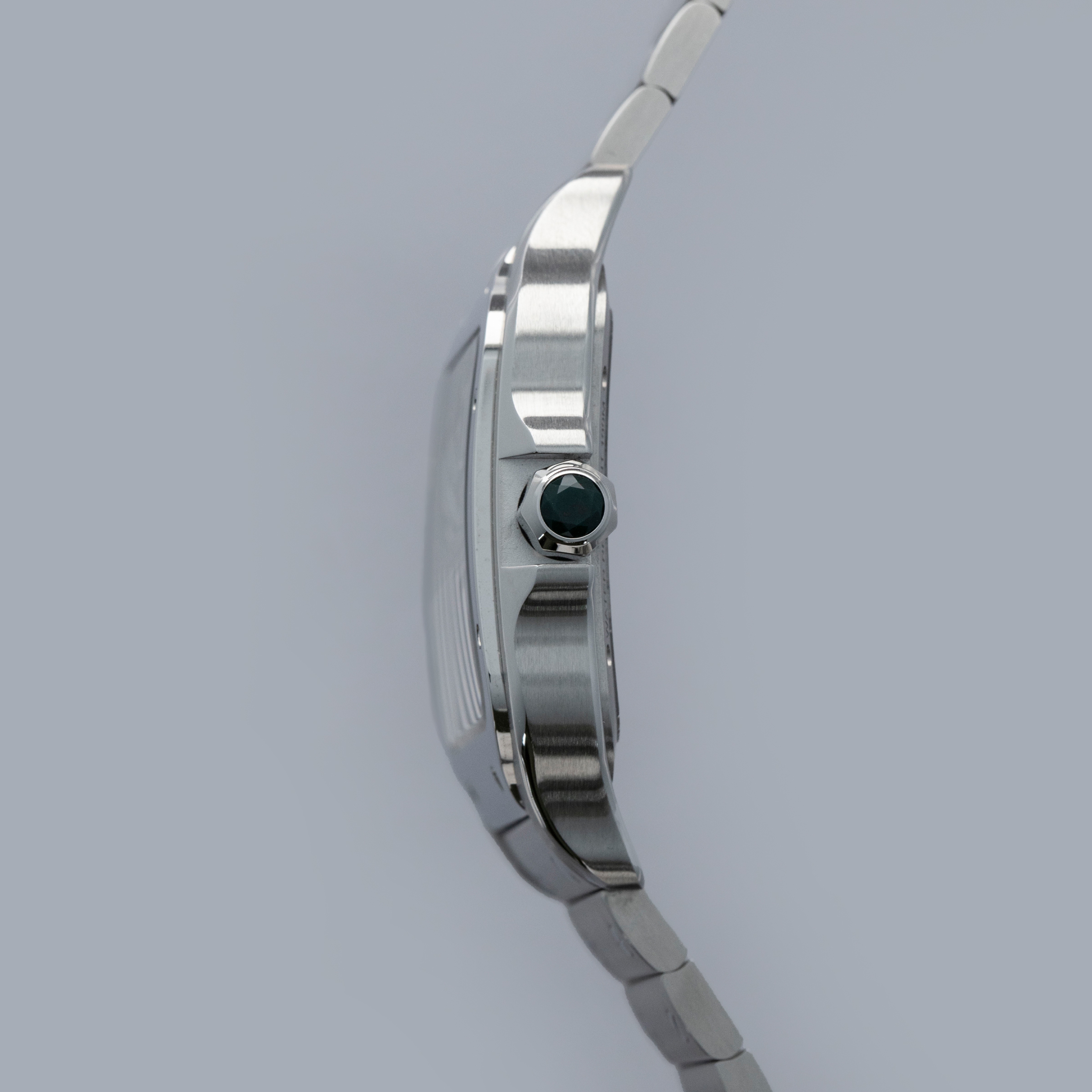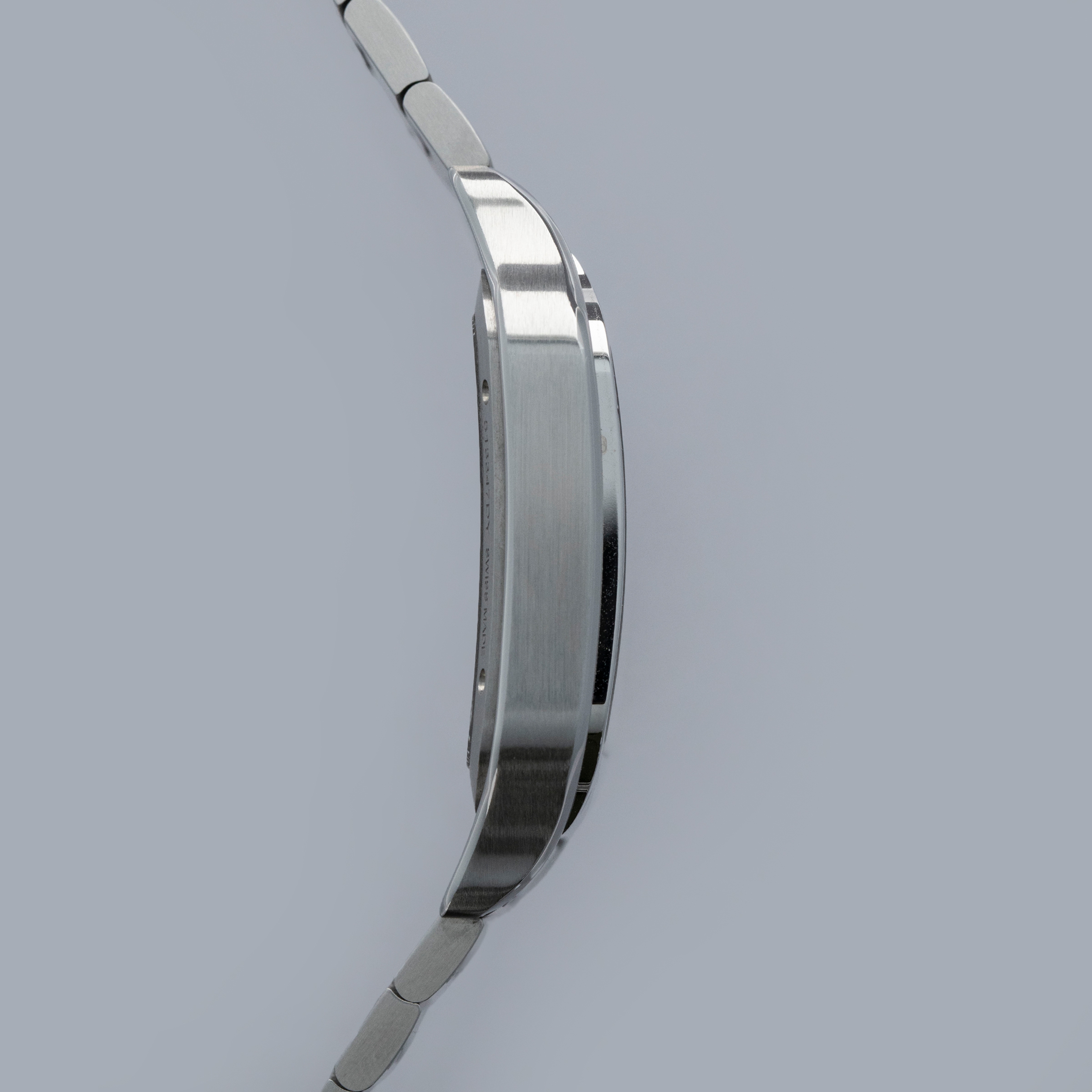 The watch is in overall excellent condition. The steel case is very well defined, with some scratches and light nicks, particularly on the polished sections. The case back has crisp engravings around the edge. The green enamel numerals that form the dial are like new. The bracelet has some light marks and scuffs. The bracelet currently fits a 7 3/4” wrist, and is fitted with 22 links, 8 of which are removable. Comes as a complete set with boxes, warranty, booklets, cloth, loupe, tool, and numbered tag.