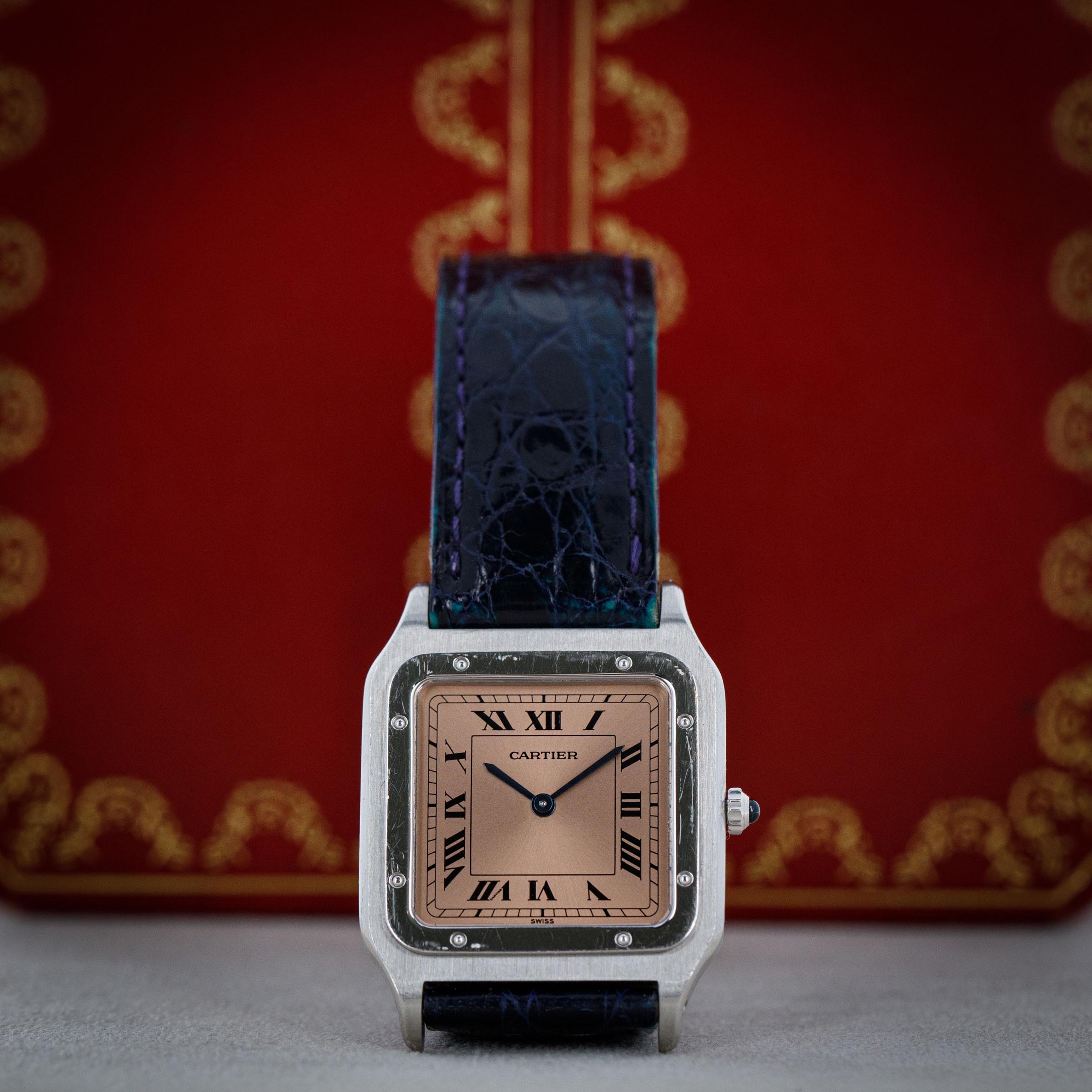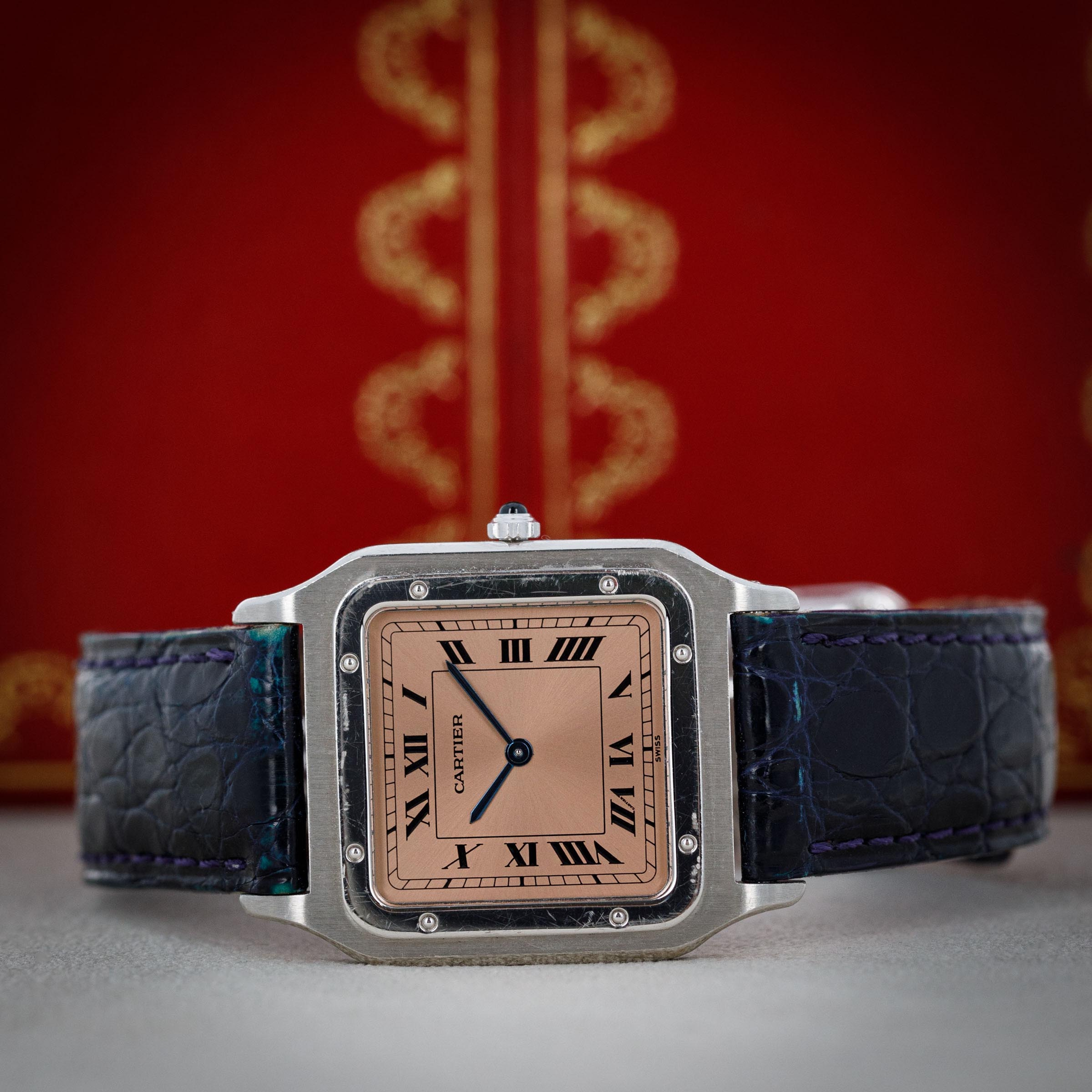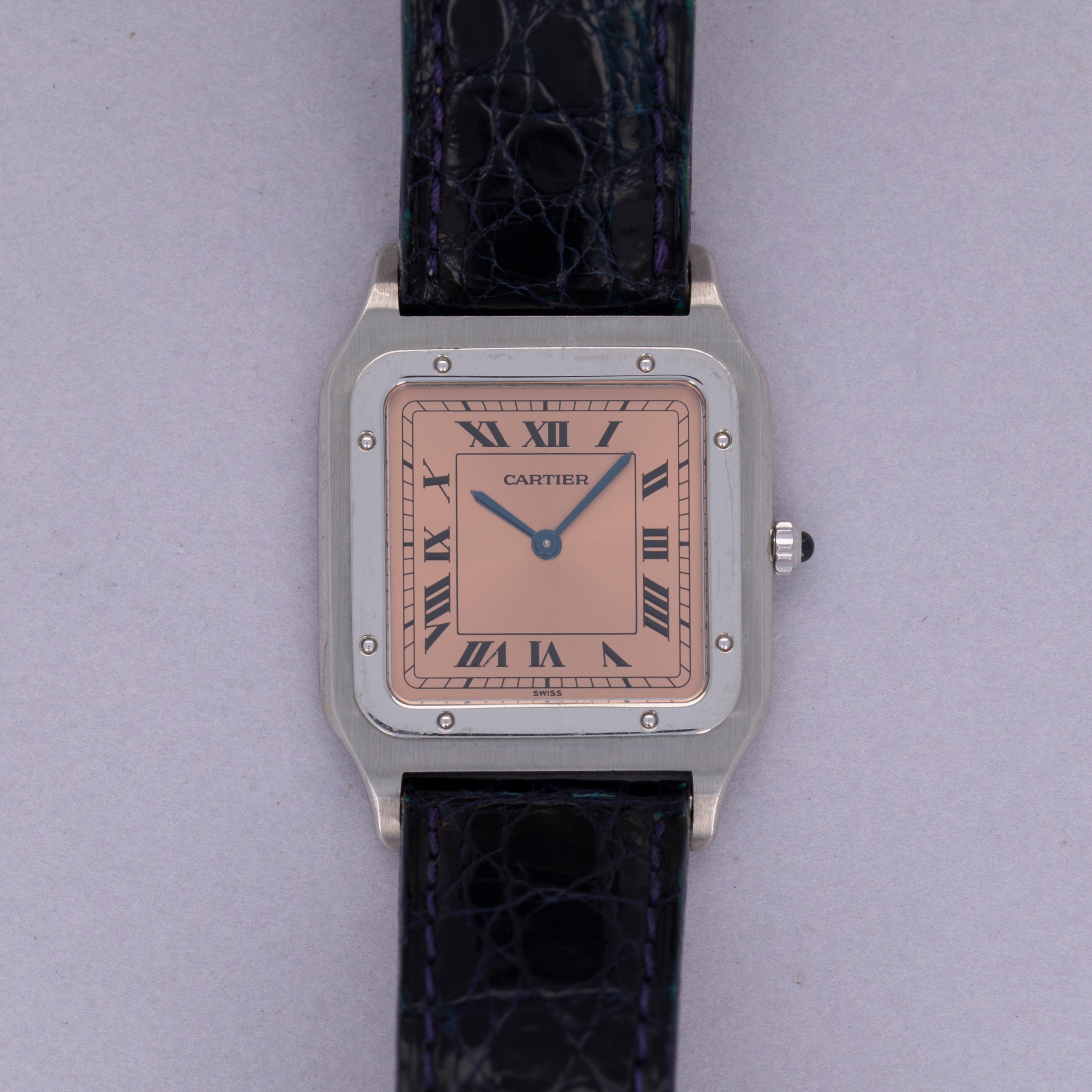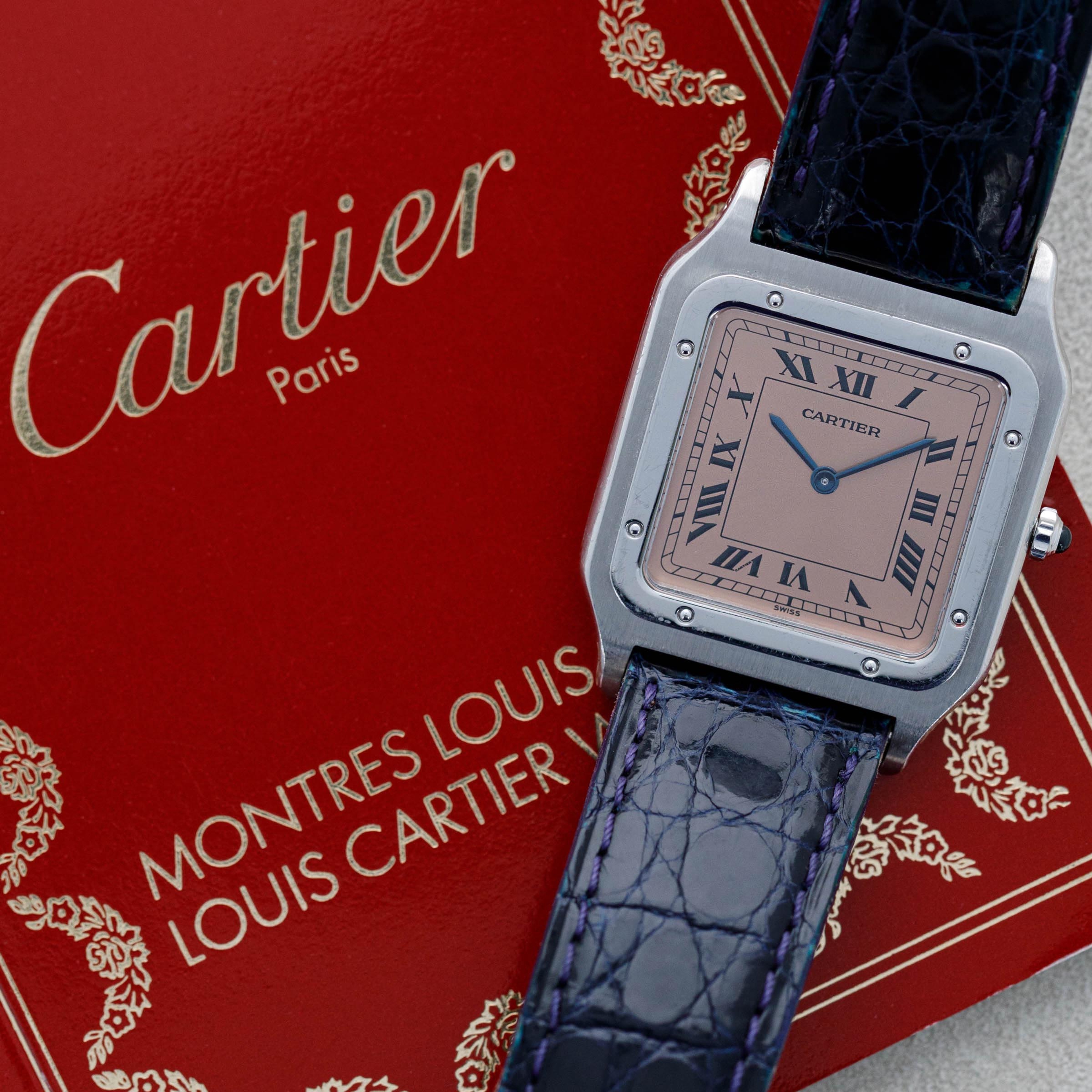 With Cartier's signature design details such as black roman numerals and blued steel hands, the Santos Dumont speaks to the refined design that has enabled the French jeweler to become such an icon within the world of design. Salmon in color, this example's display is all the more special thanks to its status as an anniversary model.