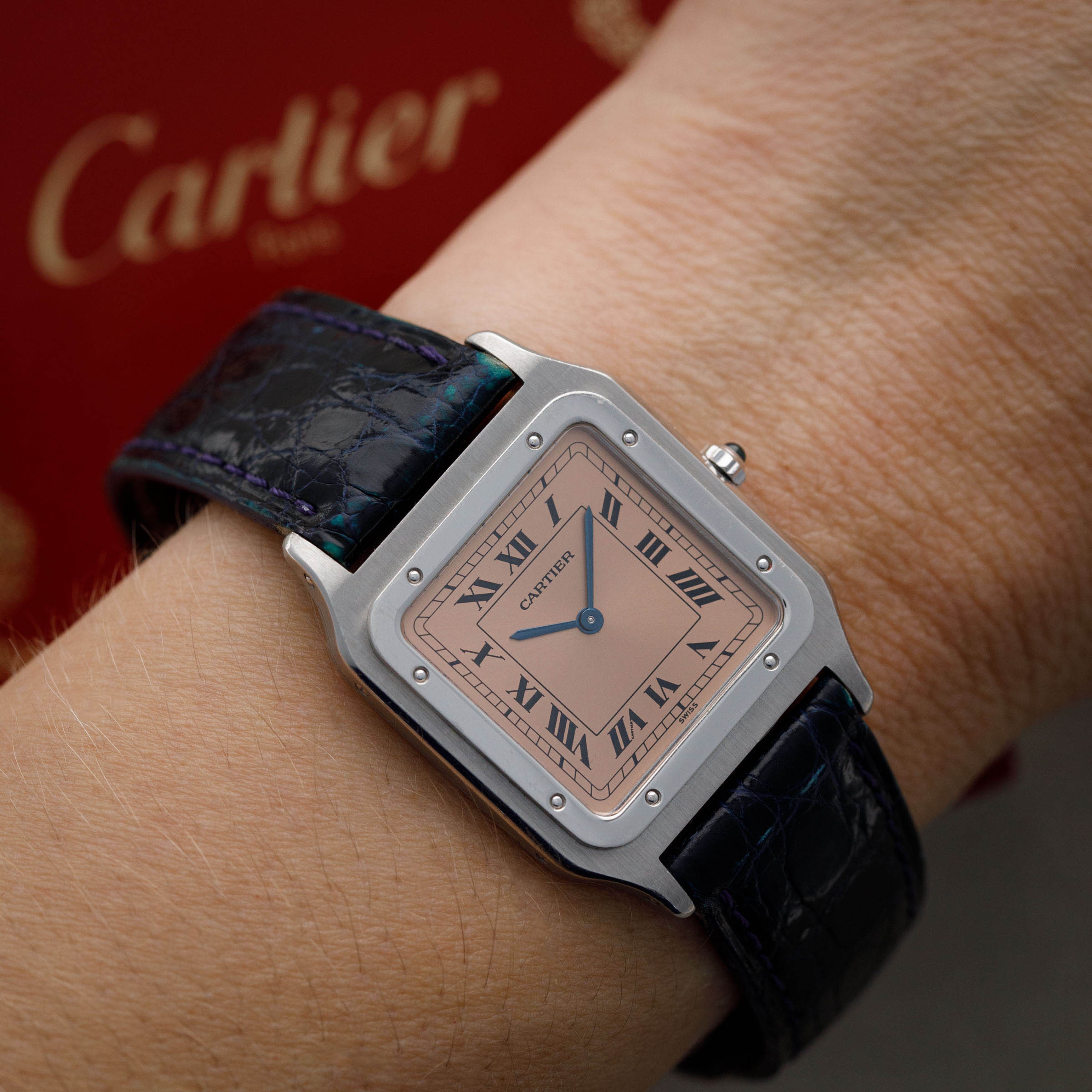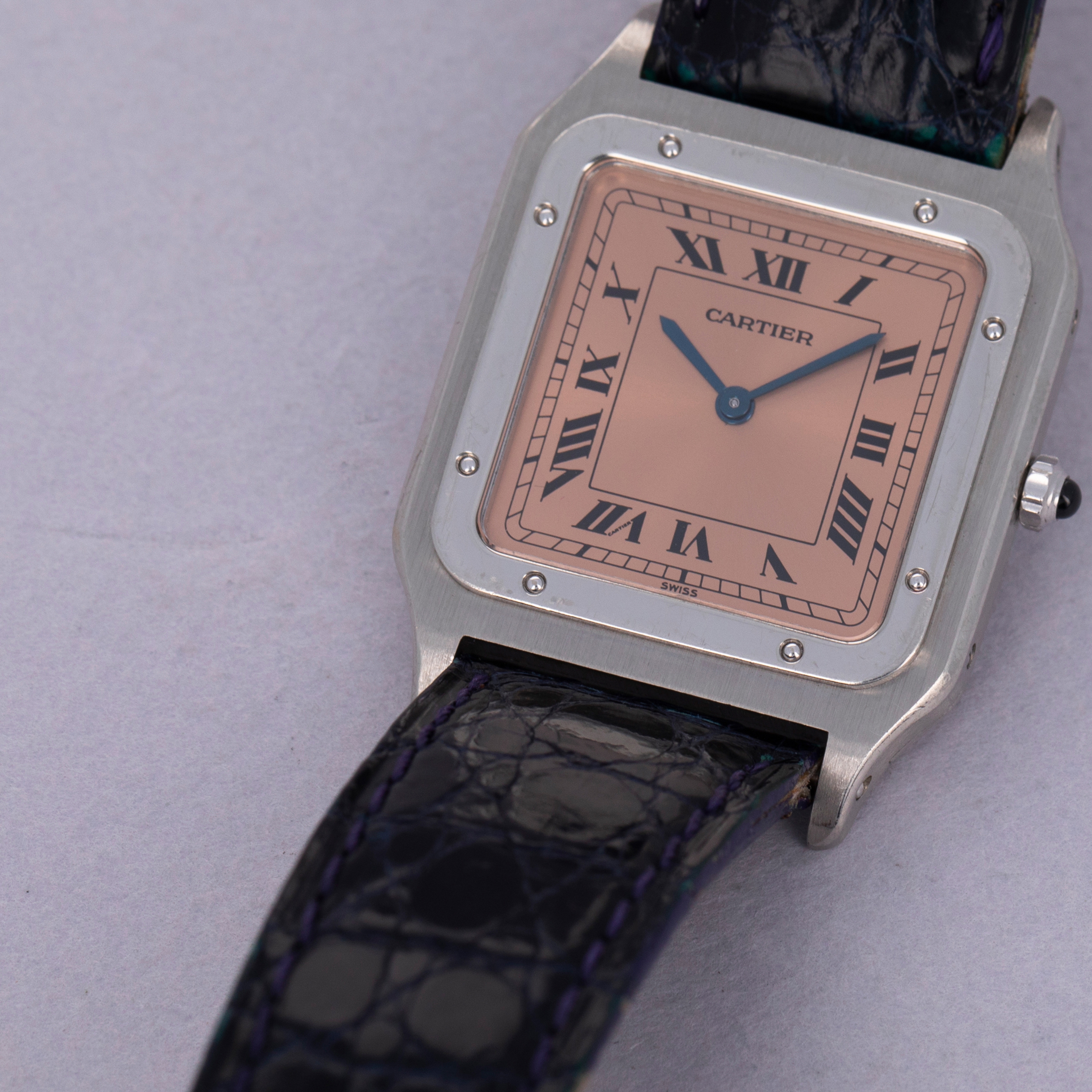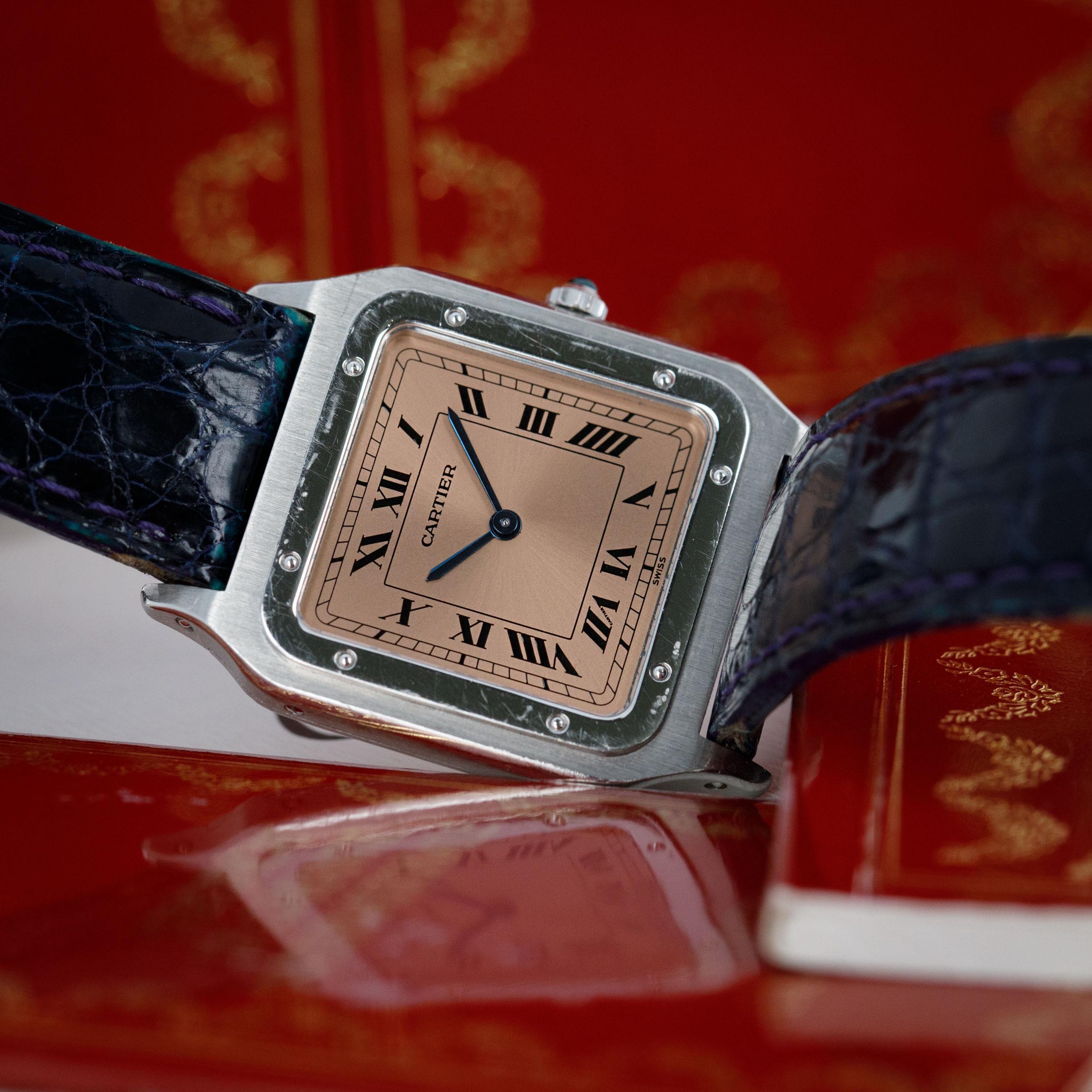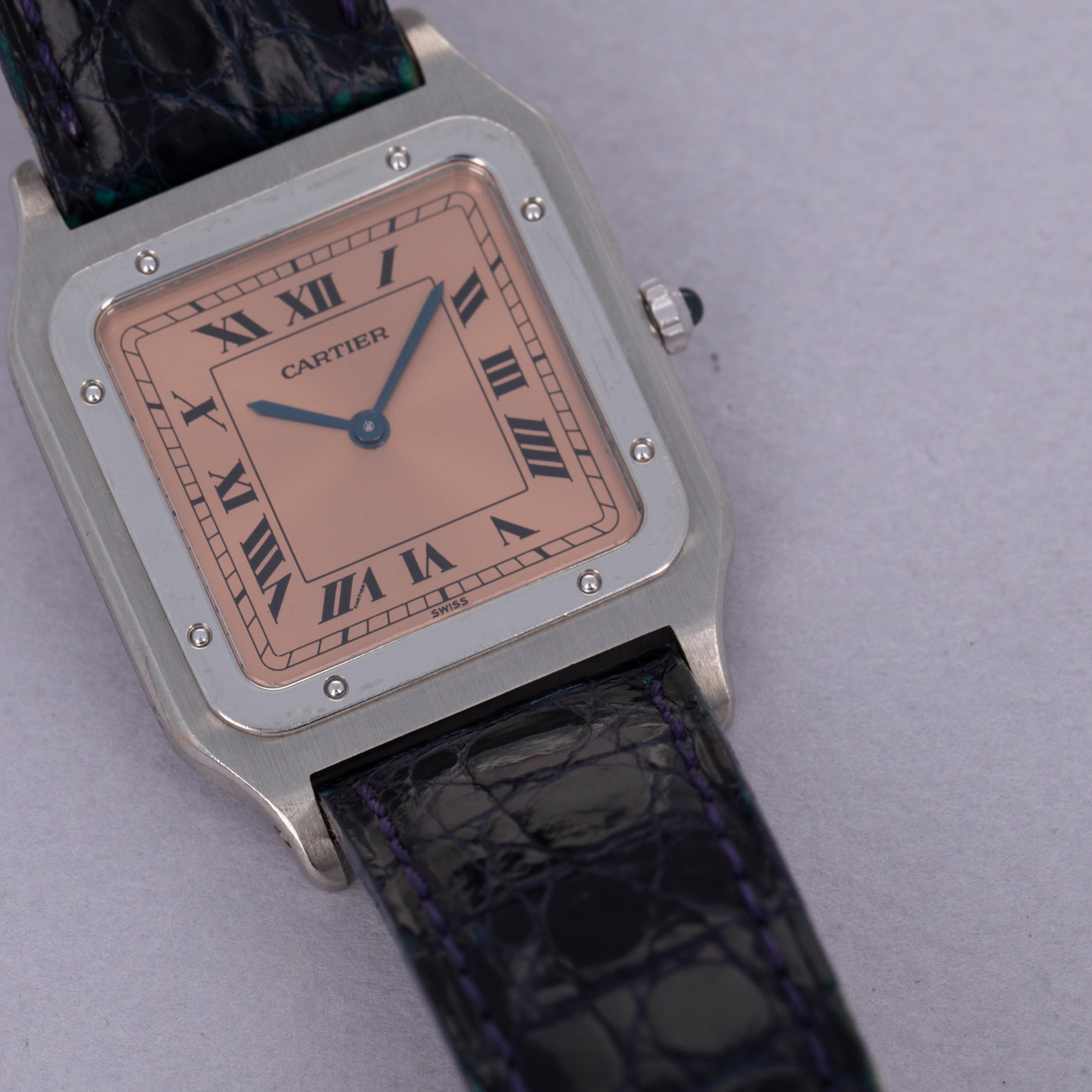 With Cartier's signature design details such as black roman numerals and blued steel hands, the Santos Dumont speaks to the refined design that has enabled the French jeweler to become such an icon within the world of design. Salmon in color, this example's display is all the more special thanks to its status as an anniversary model.
