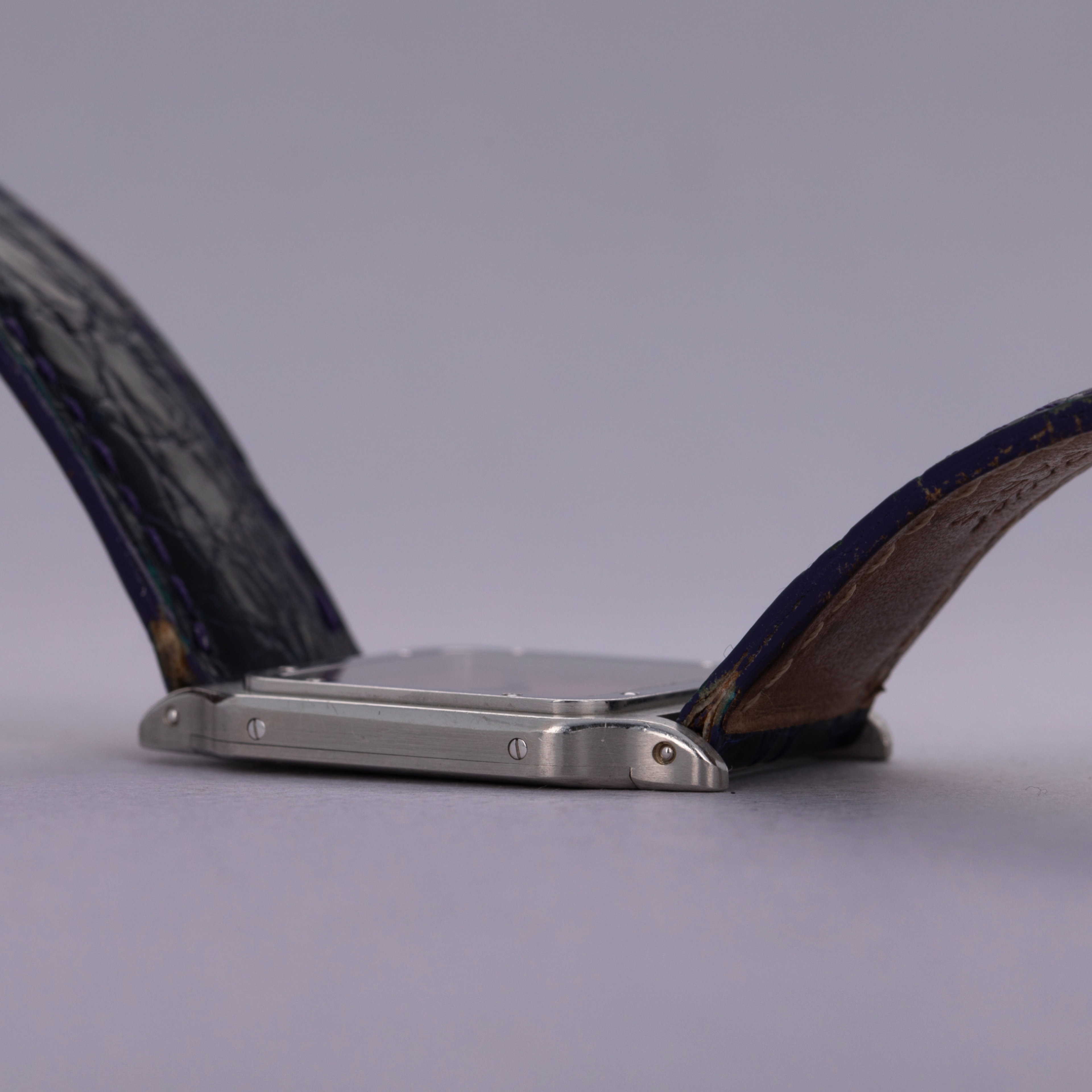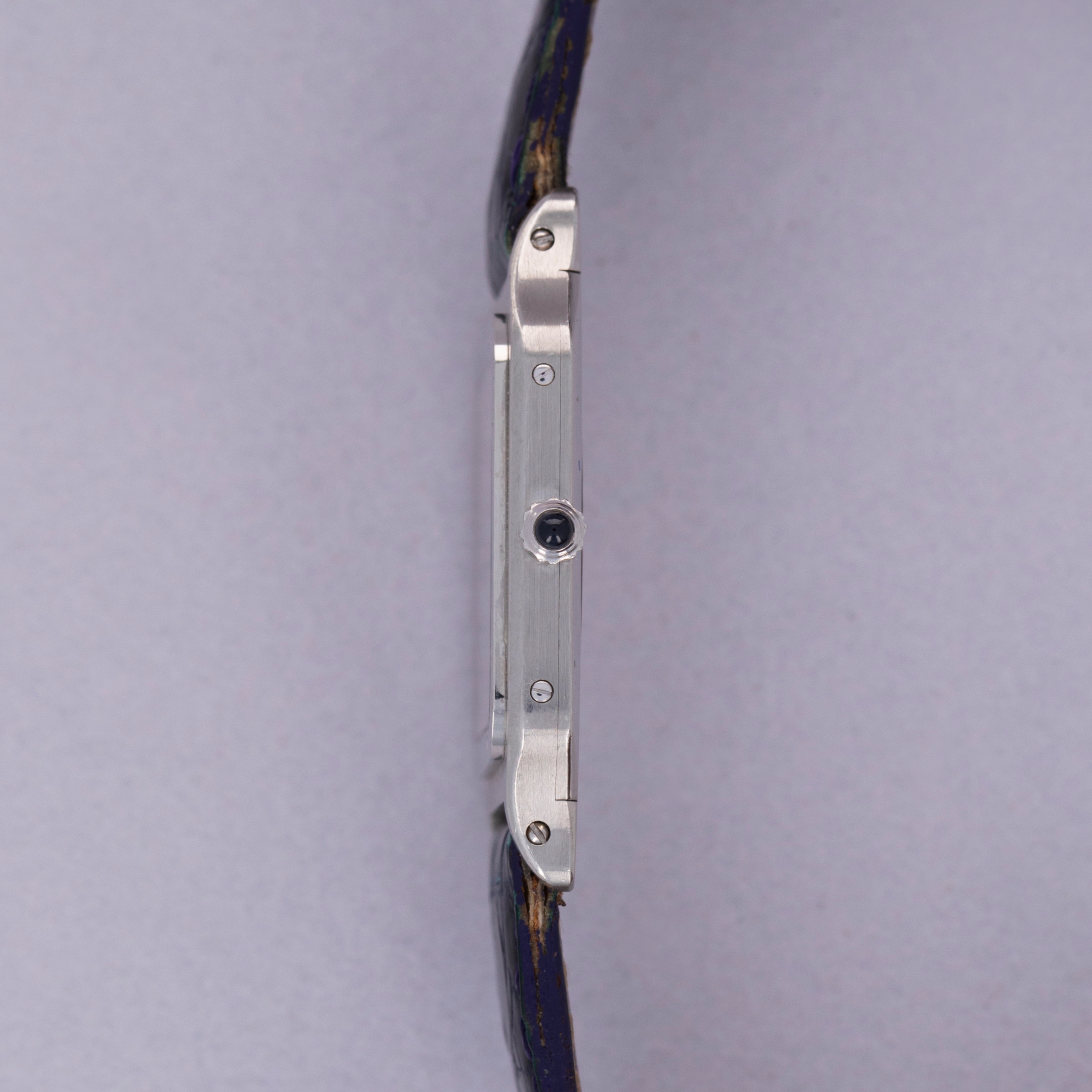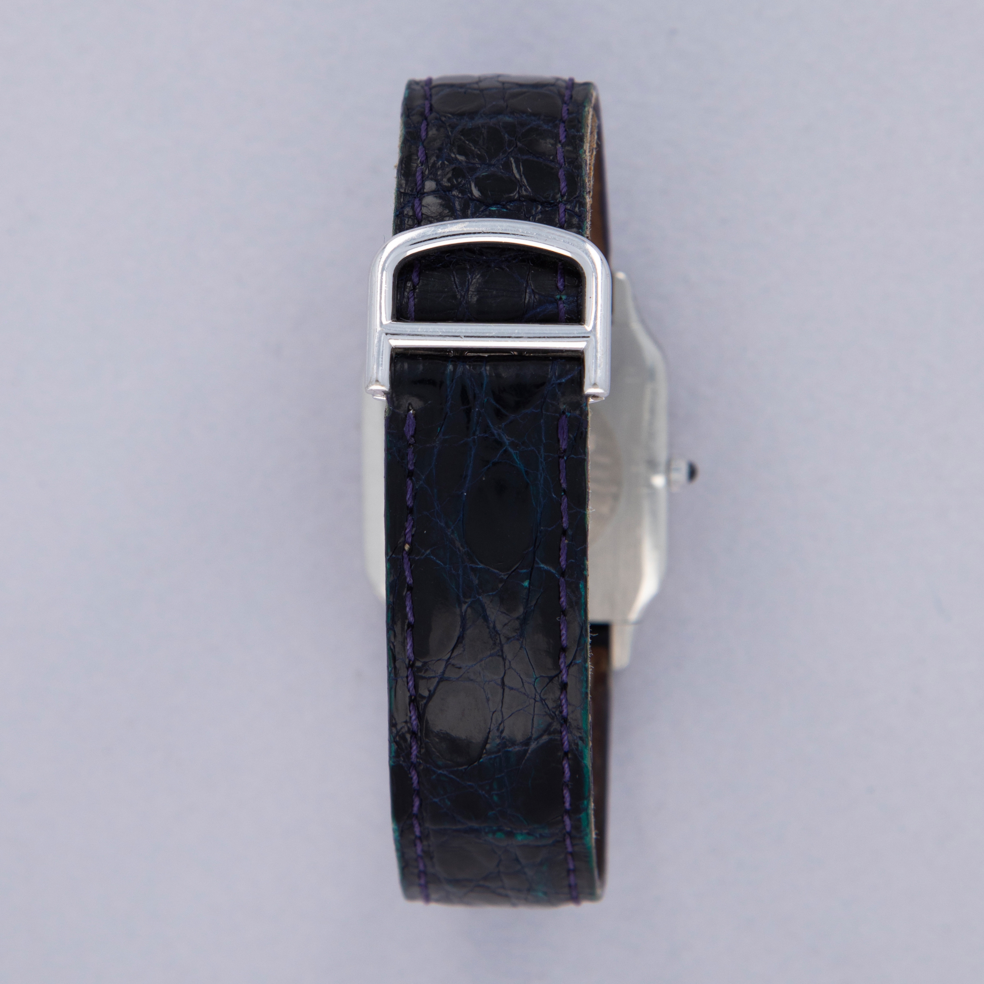 Featuring its iconic square shape, screw-studded bezel, and angular cabochon-capped crown, the Santos Dumont's construction is among the most distinctive in the industry. The majority of these 1575-1's were made in yellow gold, and so very few platinum examples like this make it to market.