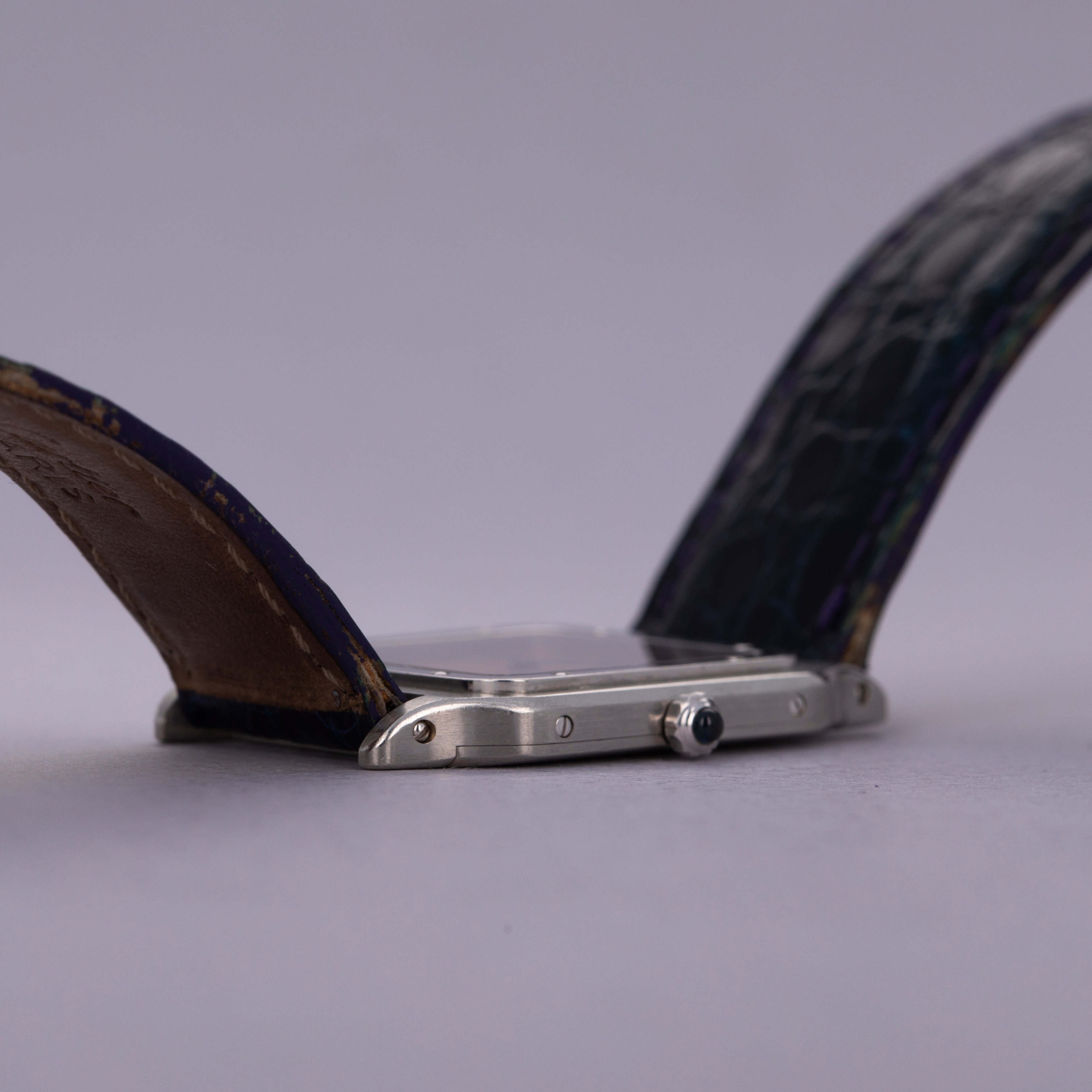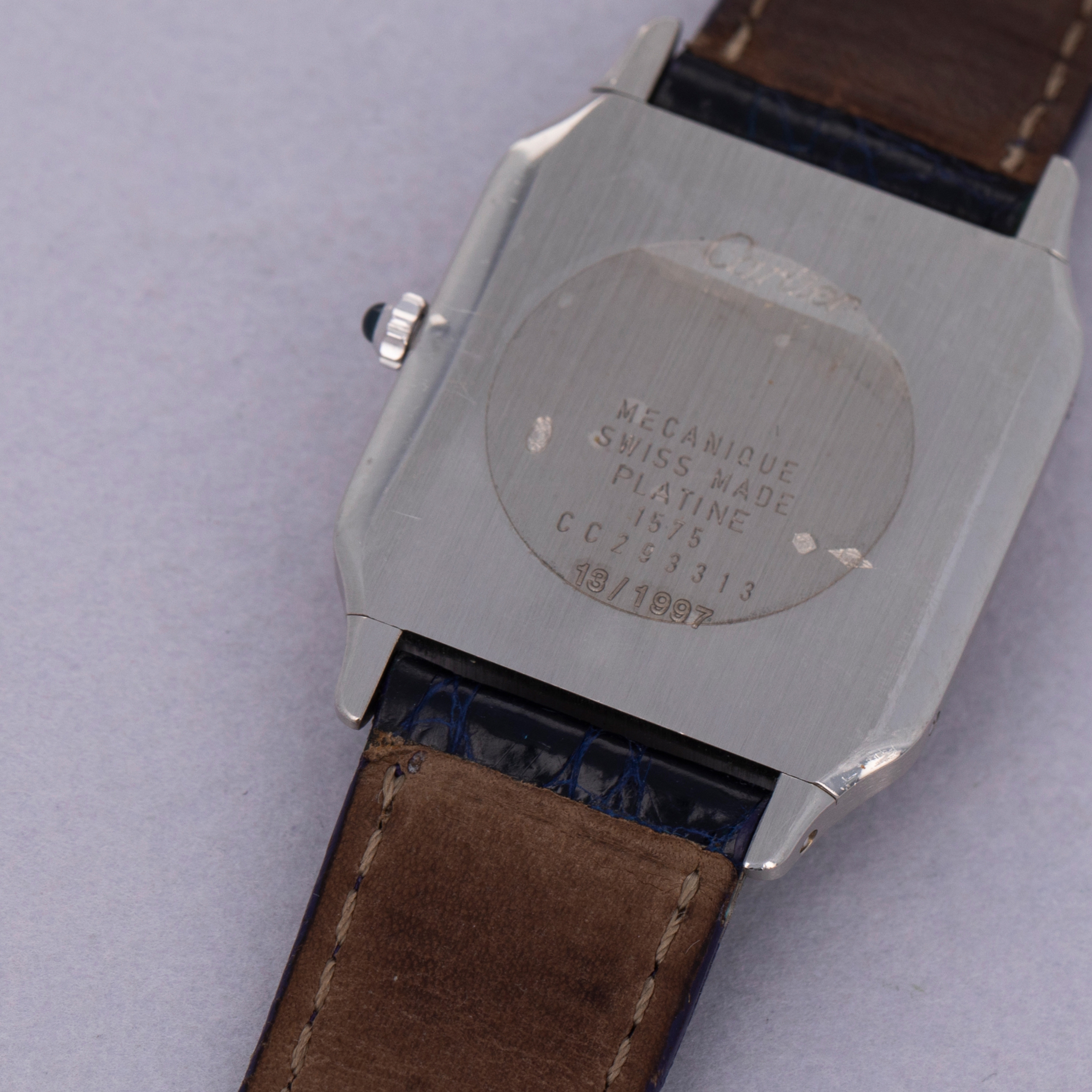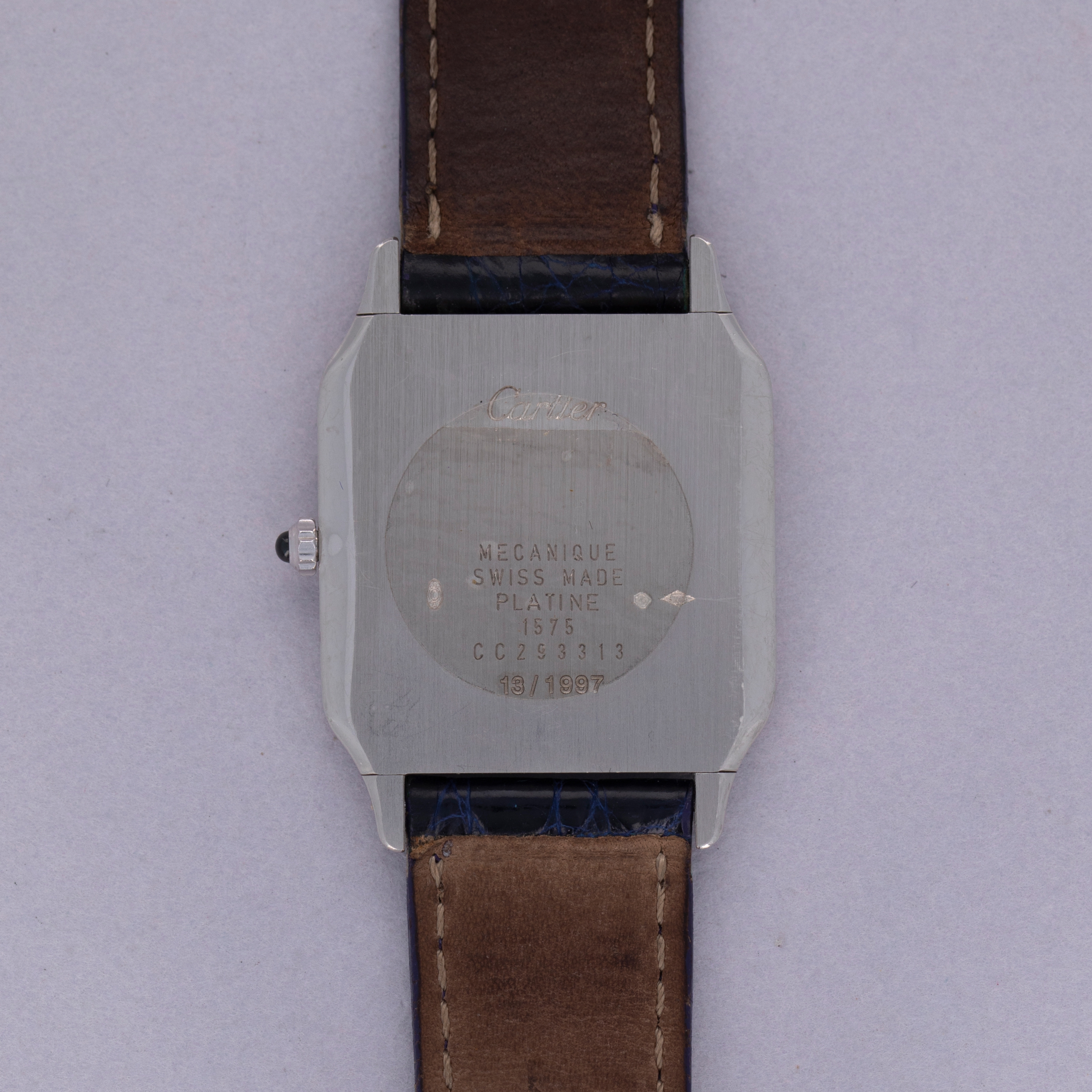 Featuring its iconic square shape, screw-studded bezel, and angular cabochon-capped crown, the Santos Dumont's construction is among the most distinctive in the industry. The majority of these 1575-1's were made in yellow gold, and so very few platinum examples like this make it to market.