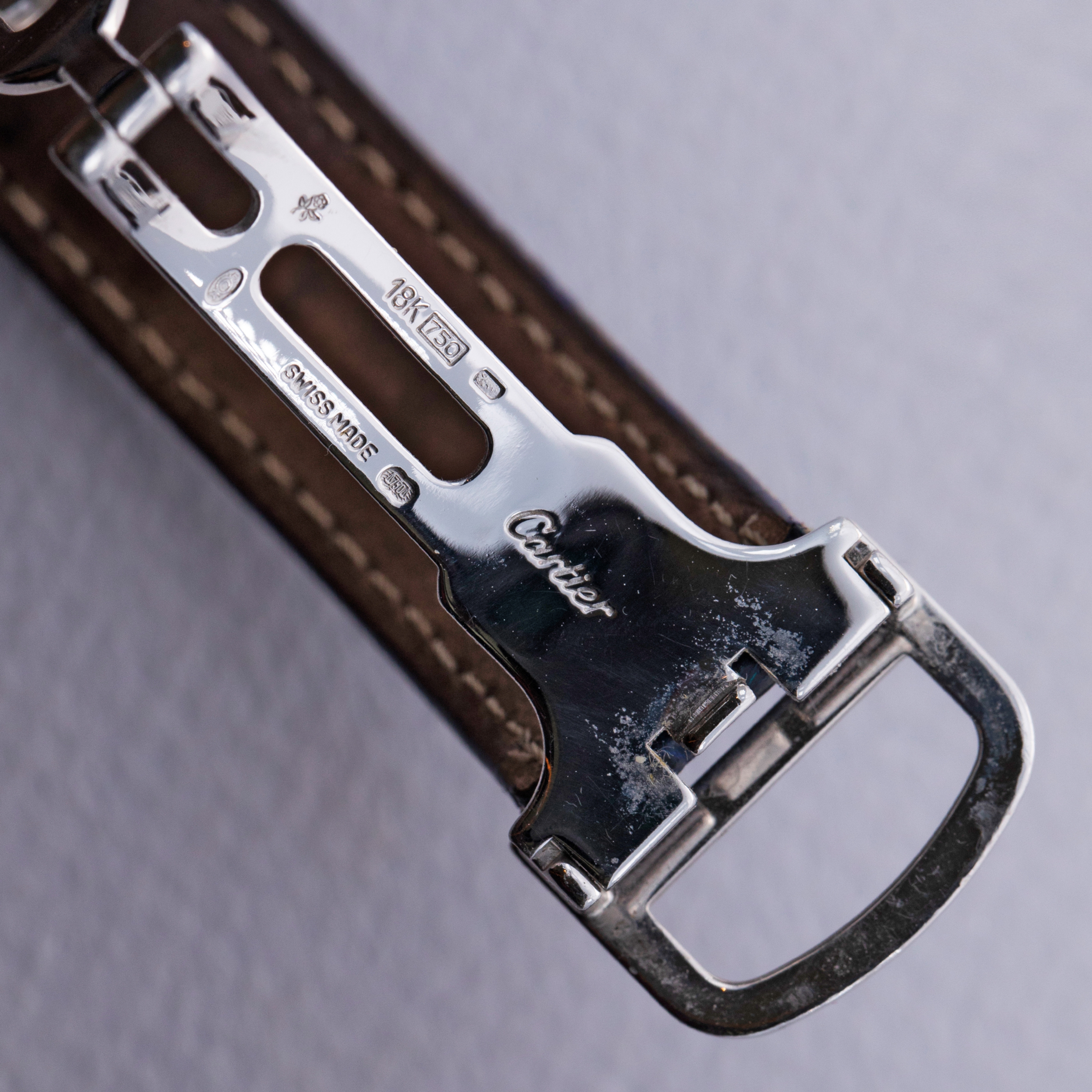 Going down in history as one of the first tool watches ever released, the Cartier Santos was designed by Louis Cartier at the request of famed Brazilian aviator Alberto Santos-Dumont in 1904, as he foresaw checking pocket watches in a cockpit becoming an issue as aviation developed. The very pinnacle of timeless design, the Santos has penetrated just about every corner of horology, as demonstrated by this 1990's-released unisex model, the ref 1575. A 27mm wide variant constructed of platinum, the ref. 1575 features a smooth round-edged bezel sitting atop a satin-brushed case with beautifully polished bevelling throughout. A remarkably slim watch, the ref. 1575 is powered by the exceptionally thin cal. 021 MC movement, which allows the timepiece to hug the wrist comfortably. Launched in 1997 and offered as a limited edition of 1997 pieces, this Santos Dumont features Cartier's signature design details like contrasting black Roman numerals within a railroad-style chapter ring and blued steel hands. The 1575's dial is exceptionally classy, in keeping with its overall aesthetic of grace, decorum and celebratory nature.