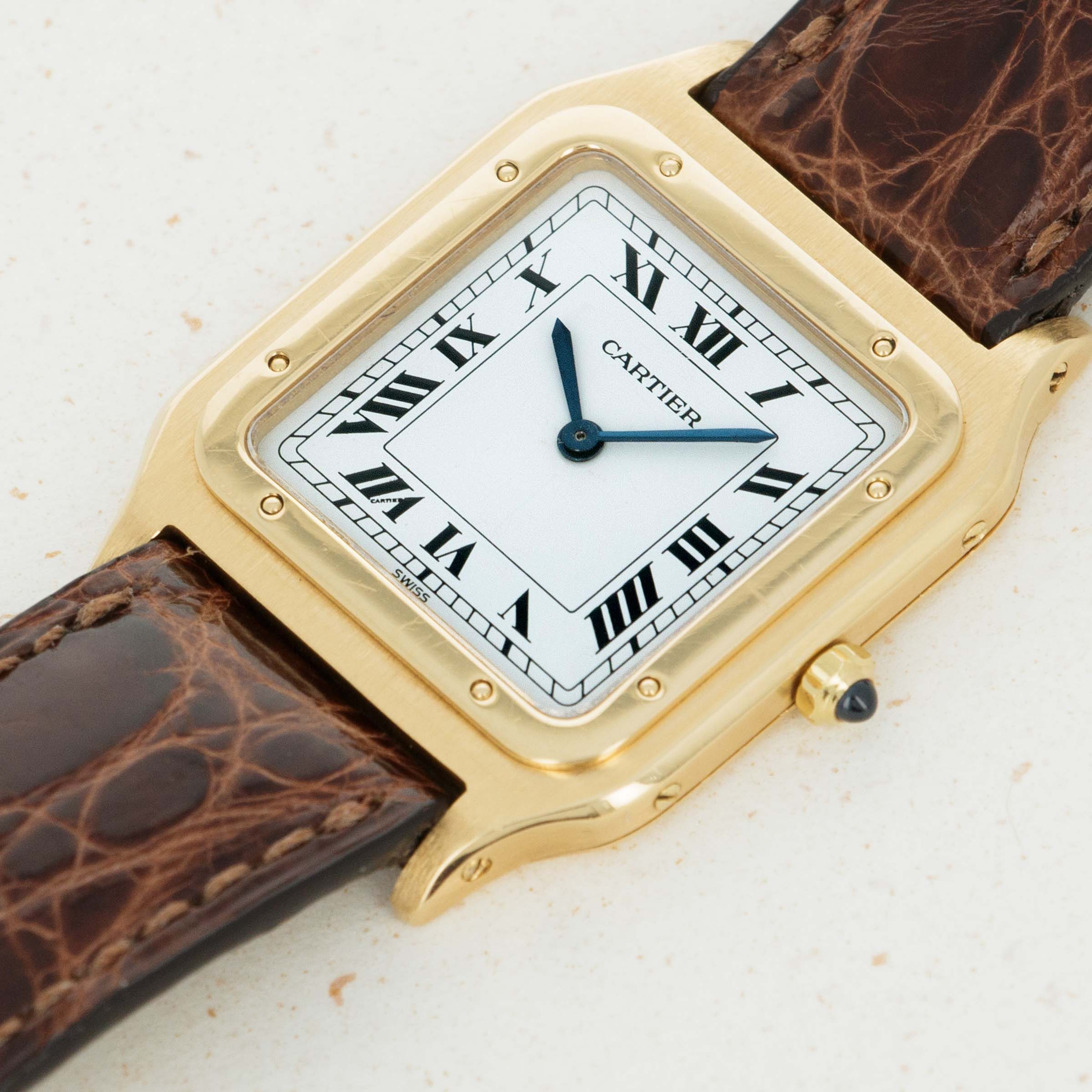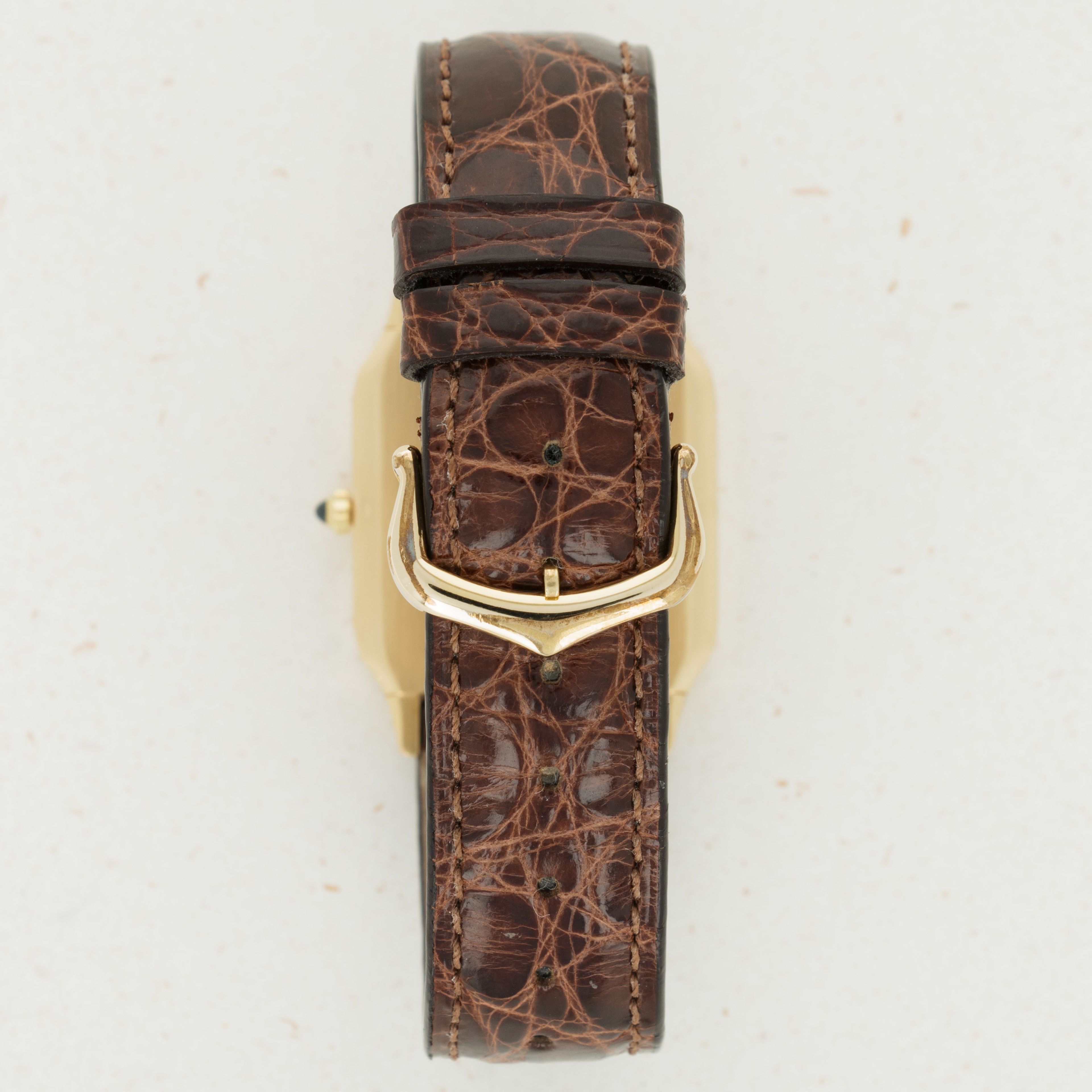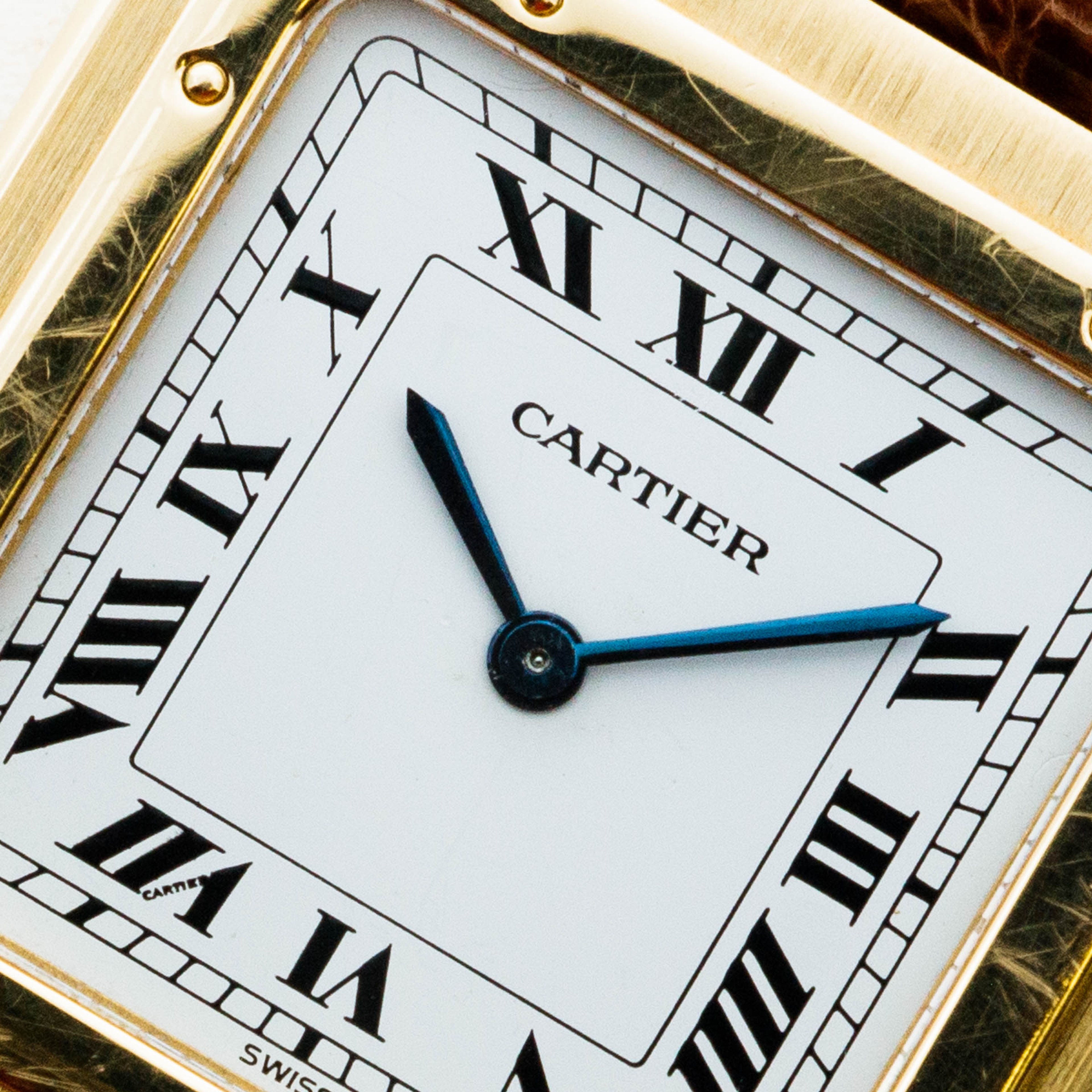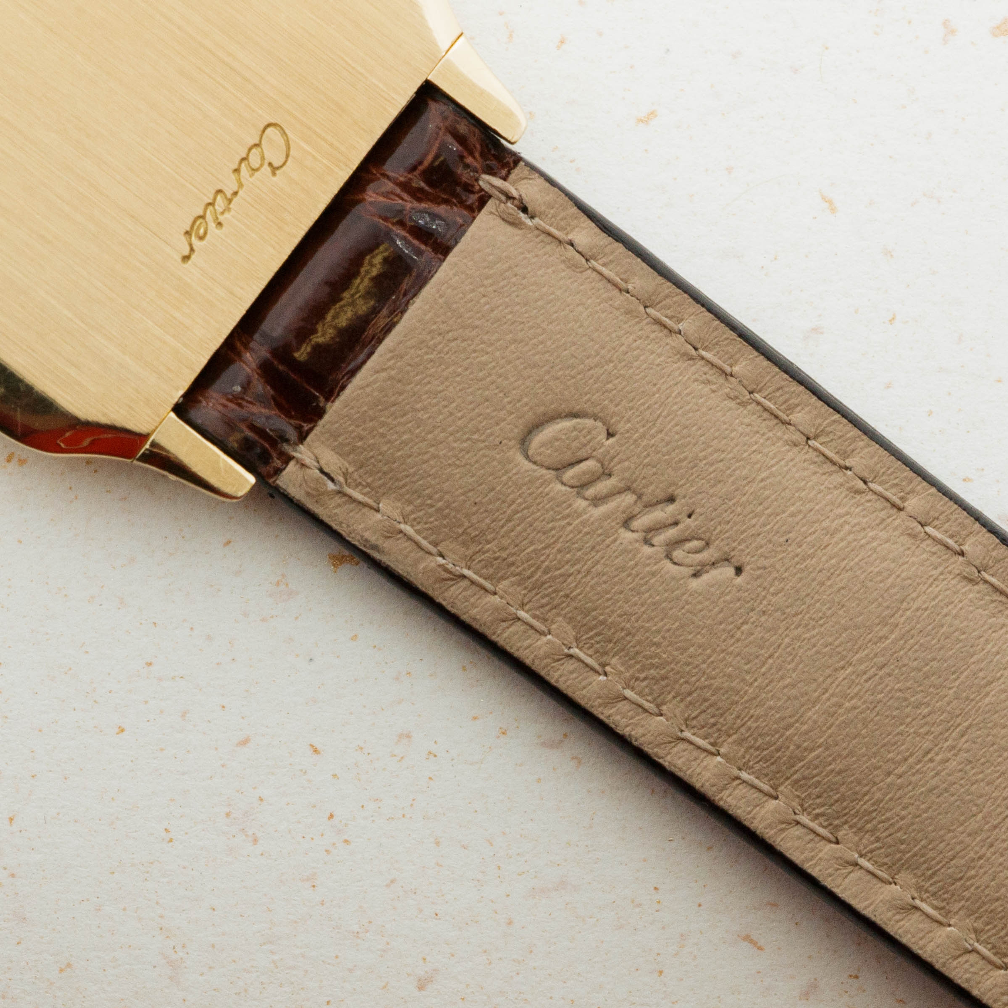 Overall condition of the watch is very good. Dial is near mint with little to no signs of wear. Please note, the “Swiss Made” dial is likely a service dial as the case bears French hallmarks. Bezel has some light needlelike scratches. Case and caseback have extremely fine surface abrasions, consistant with minimal use. The watch presents very well with no major dings or dents visible, save for the light wear on the bezel. Strap and gold buckle are both Cartier.