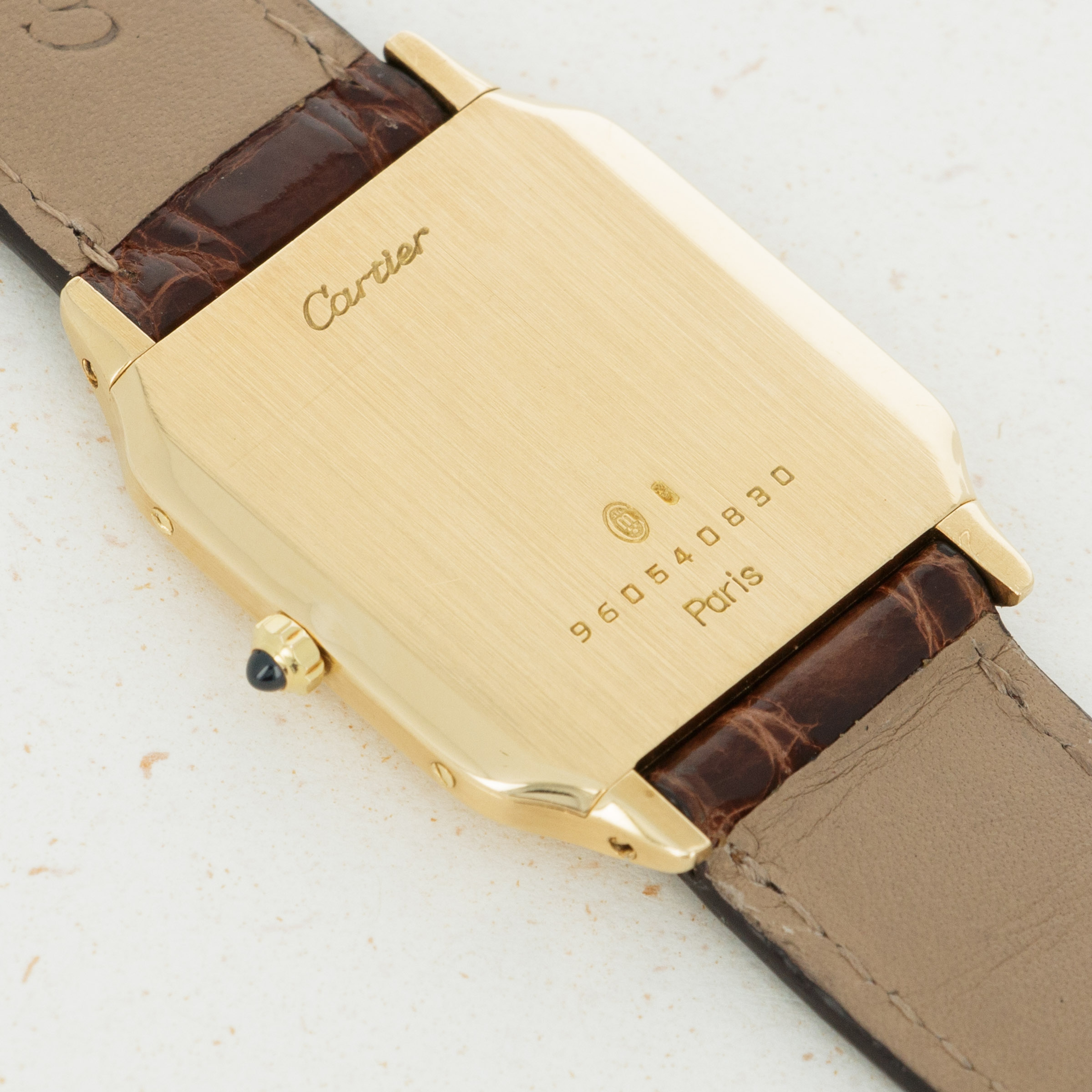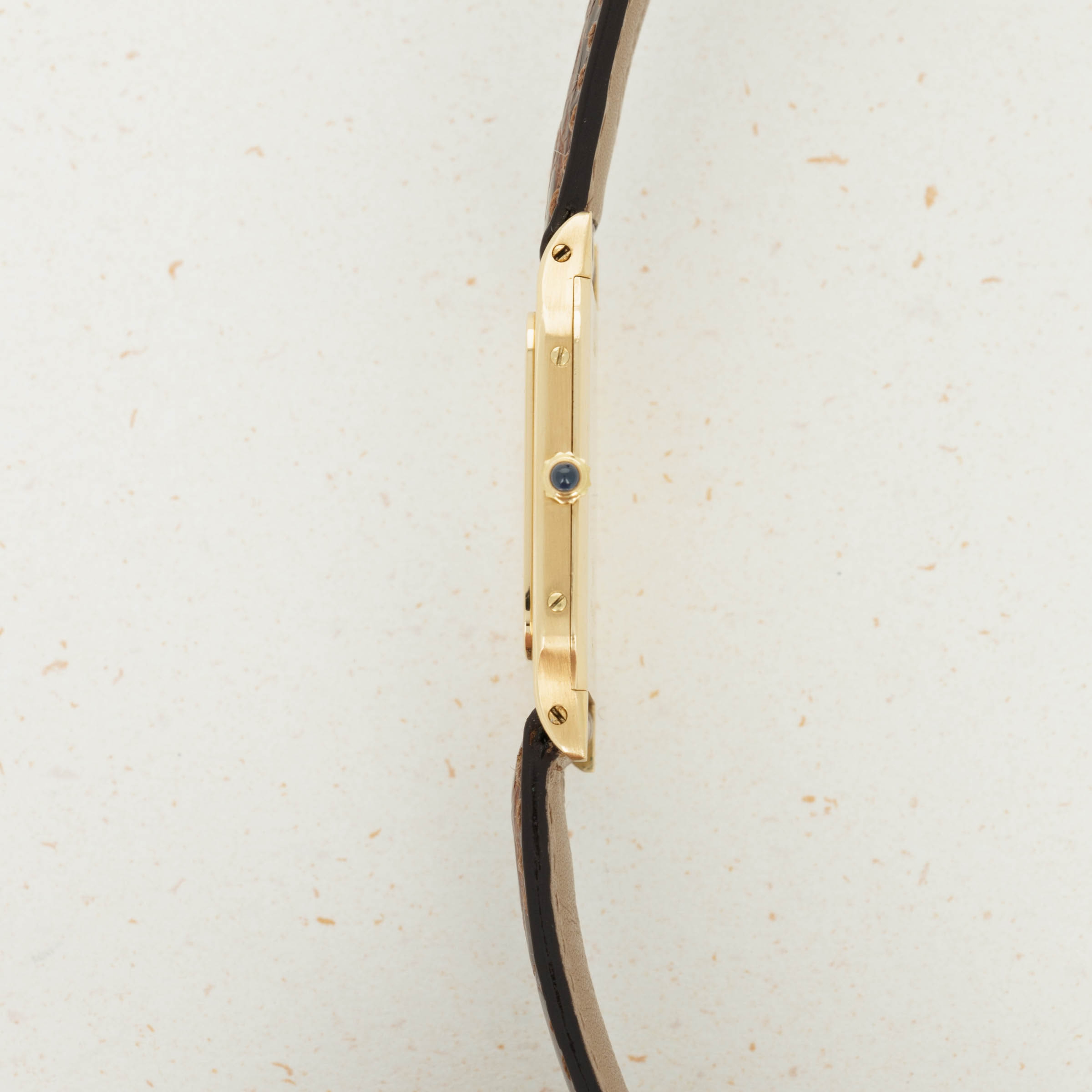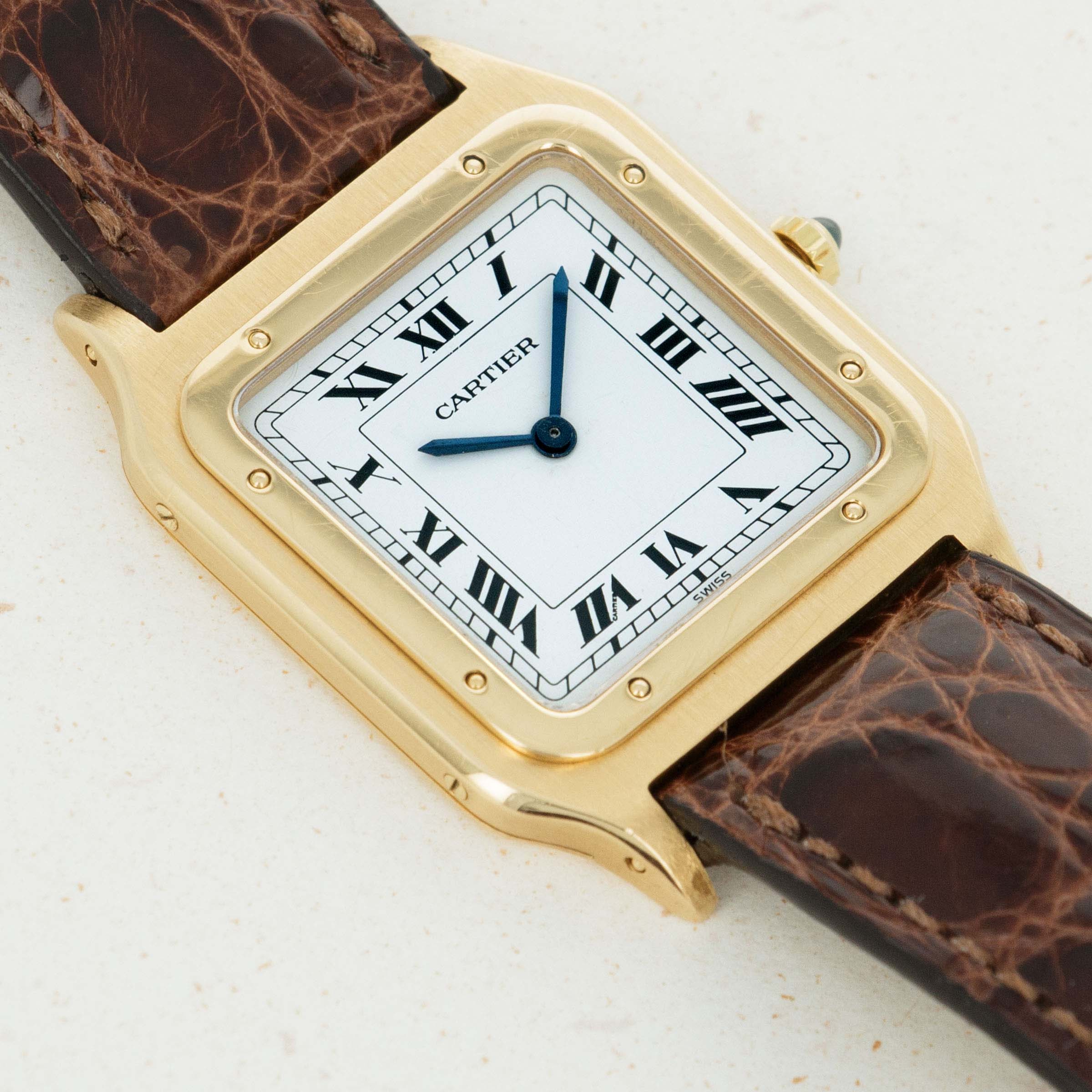 Overall condition of the watch is very good. Dial is near mint with little to no signs of wear. Please note, the “Swiss Made” dial is likely a service dial as the case bears French hallmarks. Bezel has some light needlelike scratches. Case and caseback have extremely fine surface abrasions, consistant with minimal use. The watch presents very well with no major dings or dents visible, save for the light wear on the bezel. Strap and gold buckle are both Cartier.