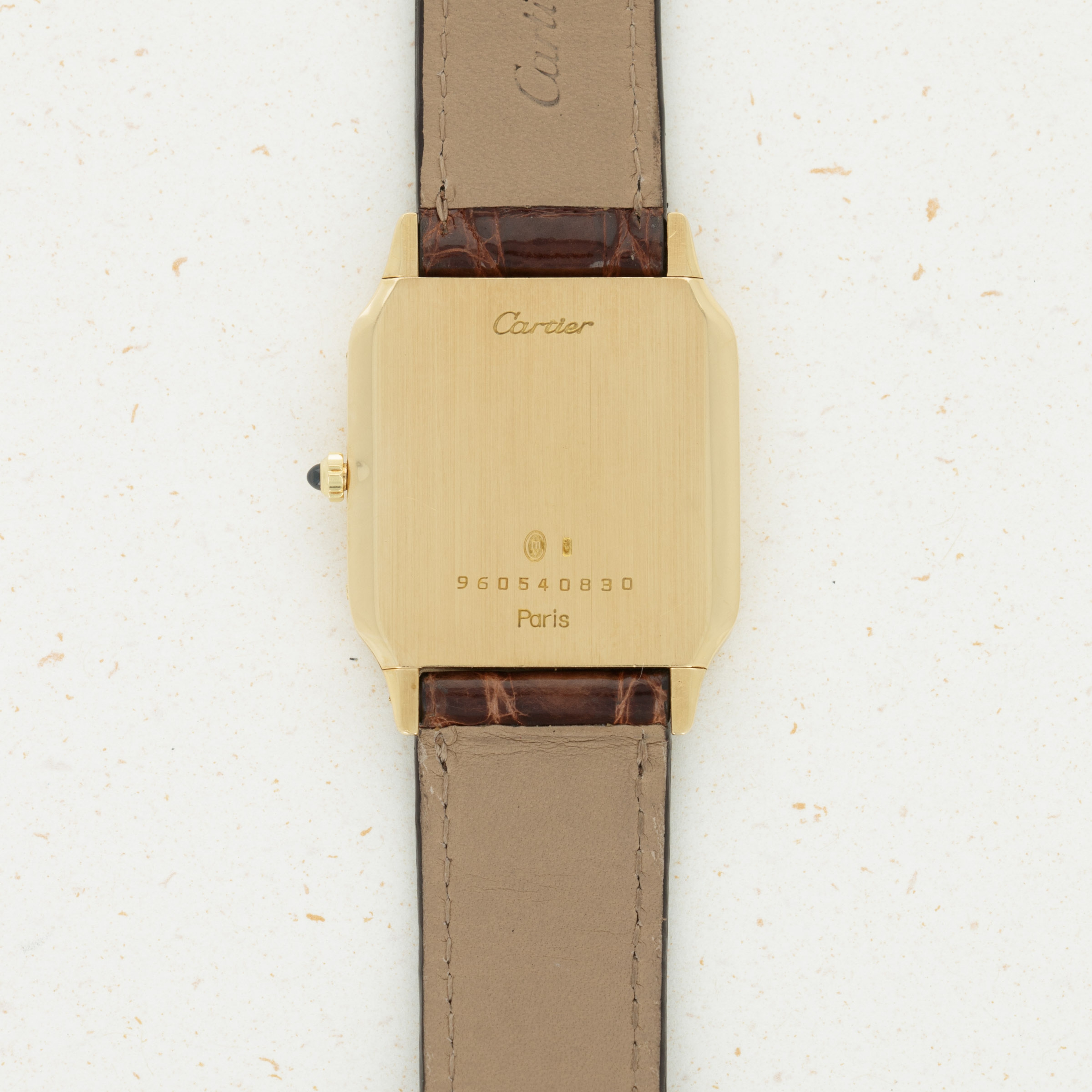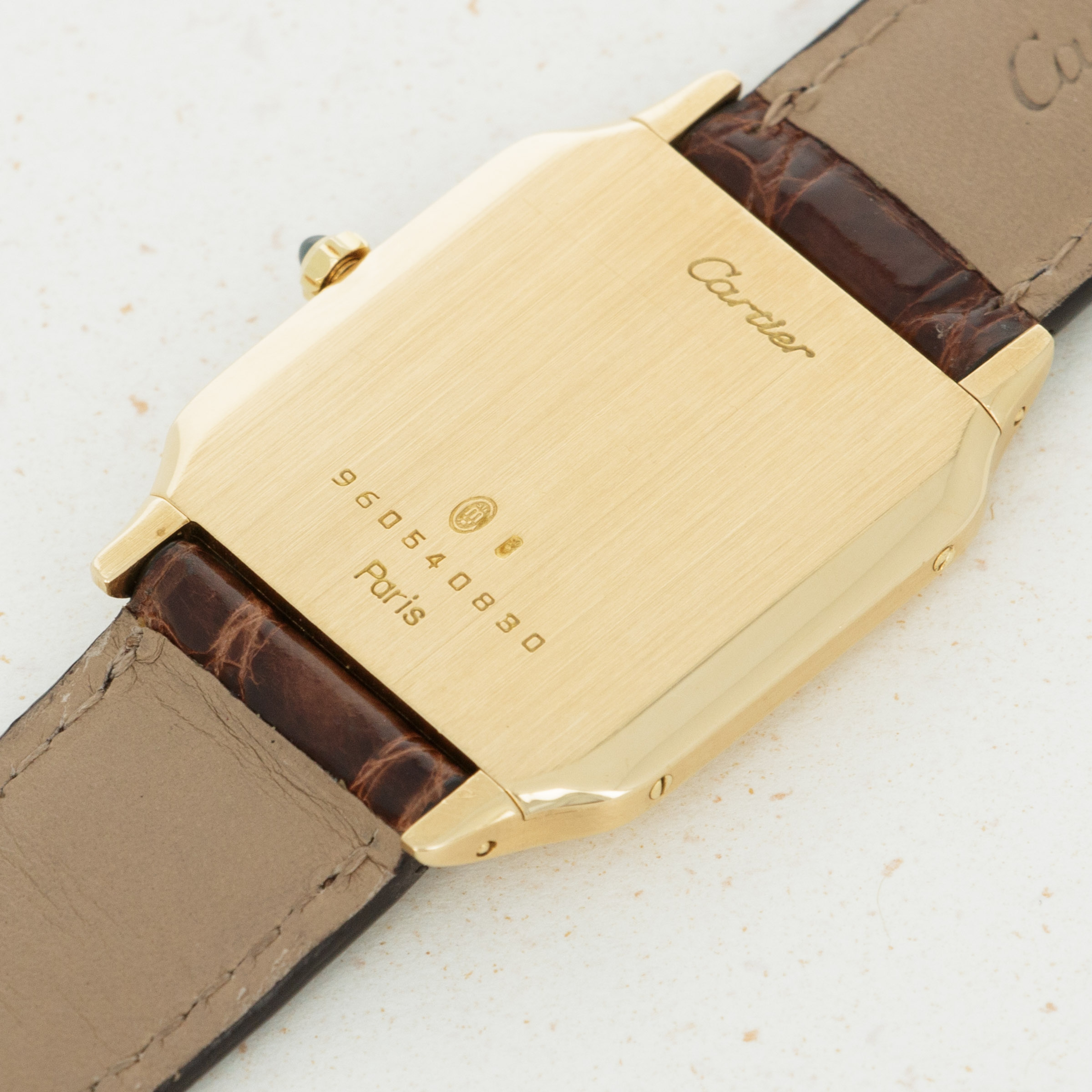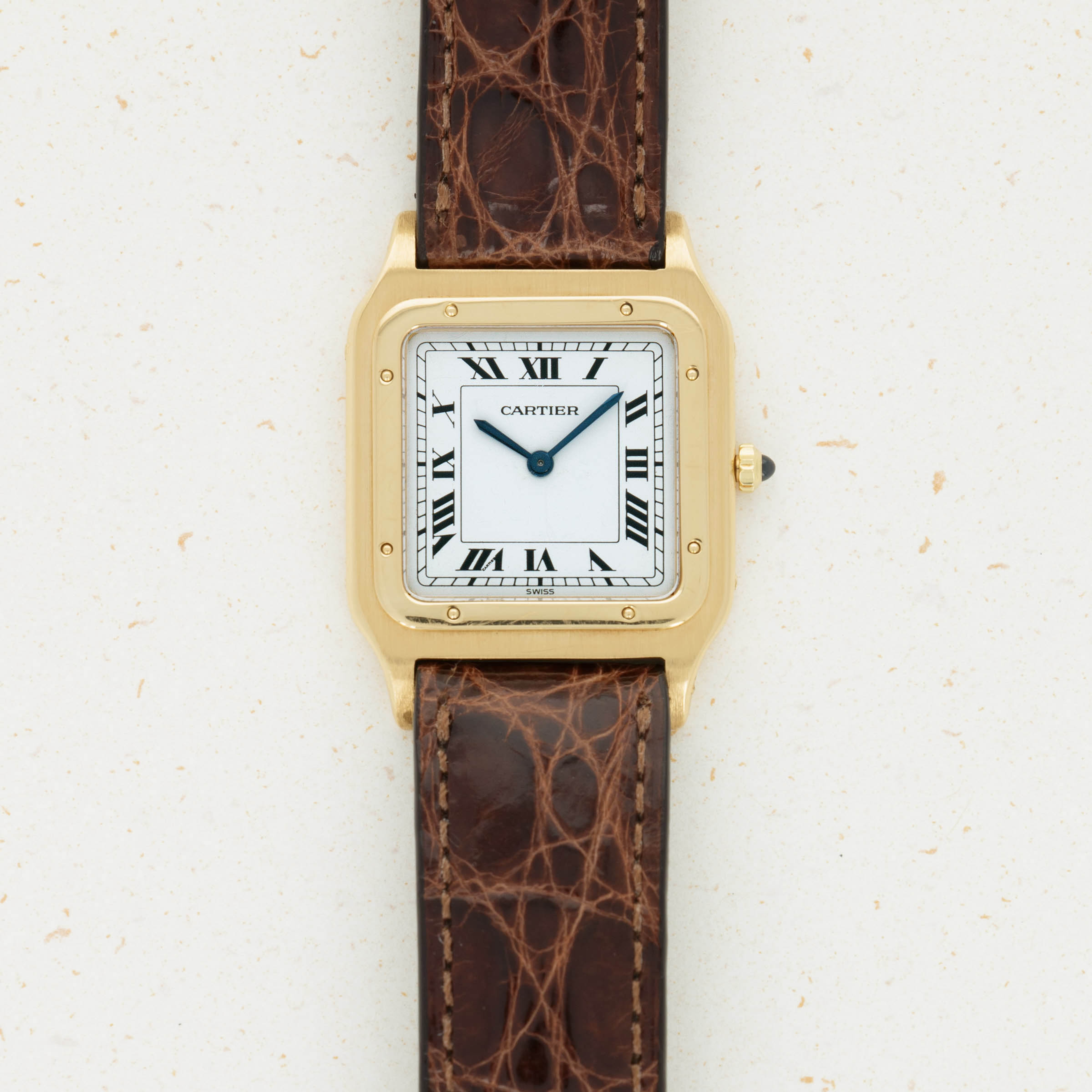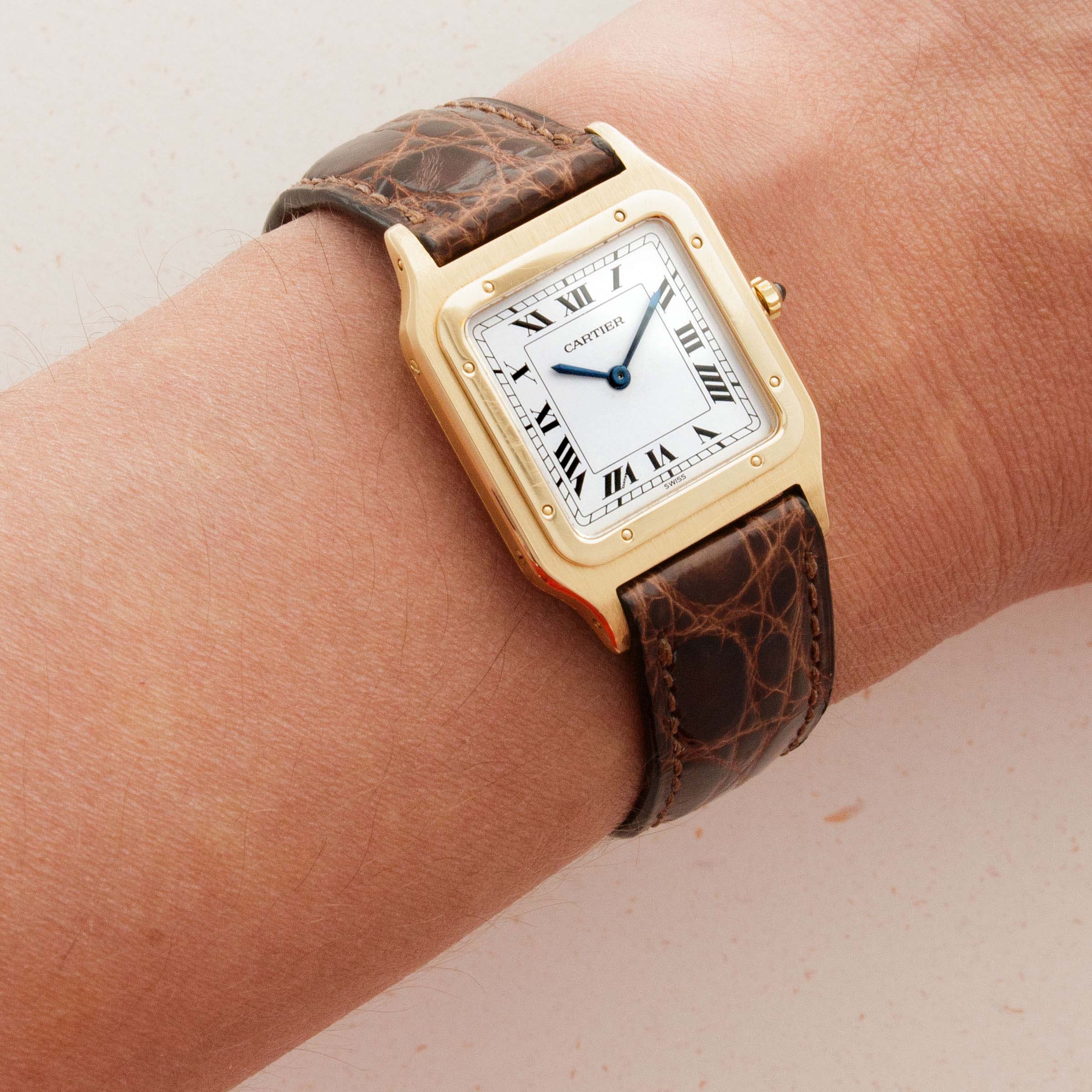 Overall condition of the watch is very good. Dial is near mint with little to no signs of wear. Please note, the “Swiss Made” dial is likely a service dial as the case bears French hallmarks. Bezel has some light needlelike scratches. Case and caseback have extremely fine surface abrasions, consistant with minimal use. The watch presents very well with no major dings or dents visible, save for the light wear on the bezel. Strap and gold buckle are both Cartier.